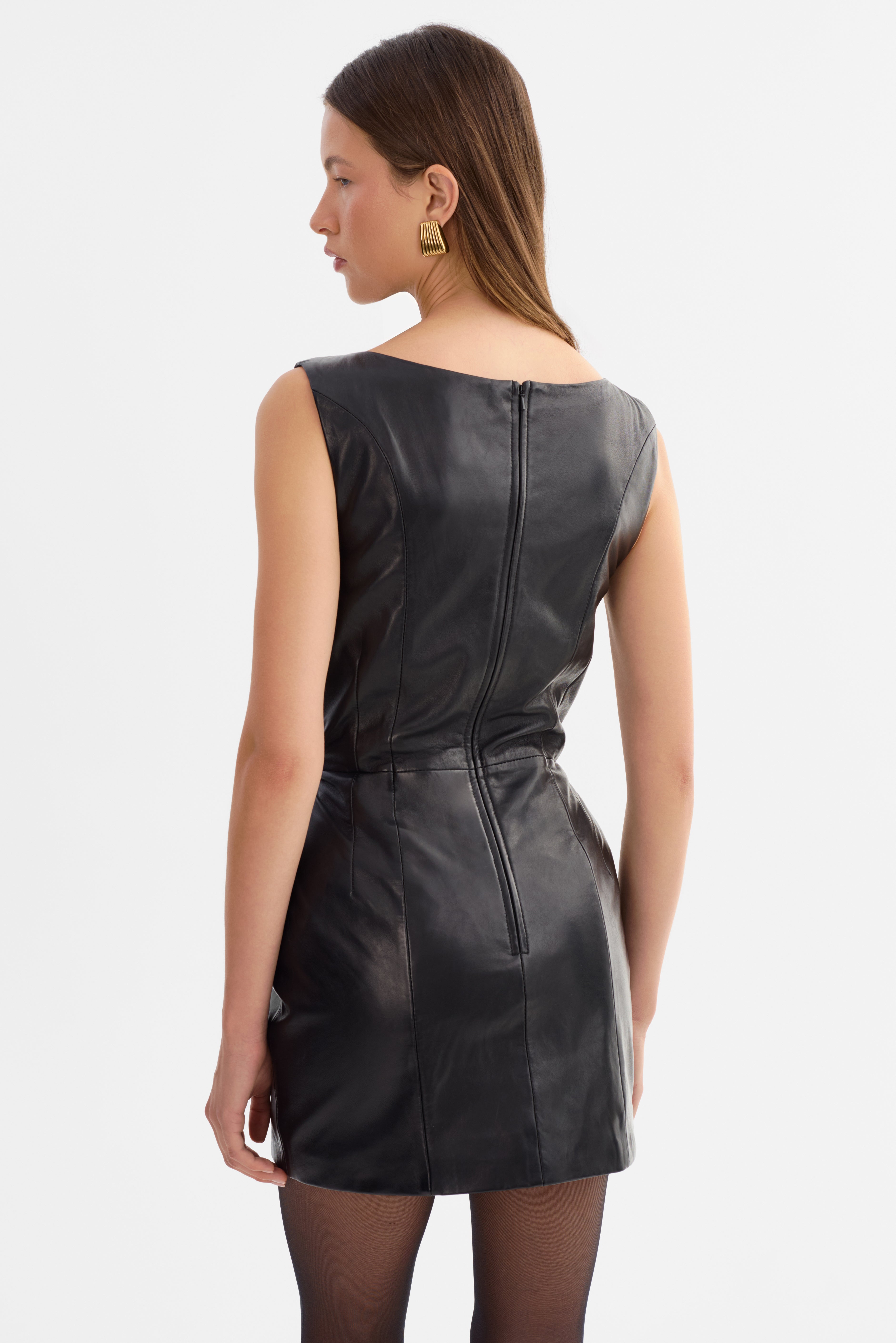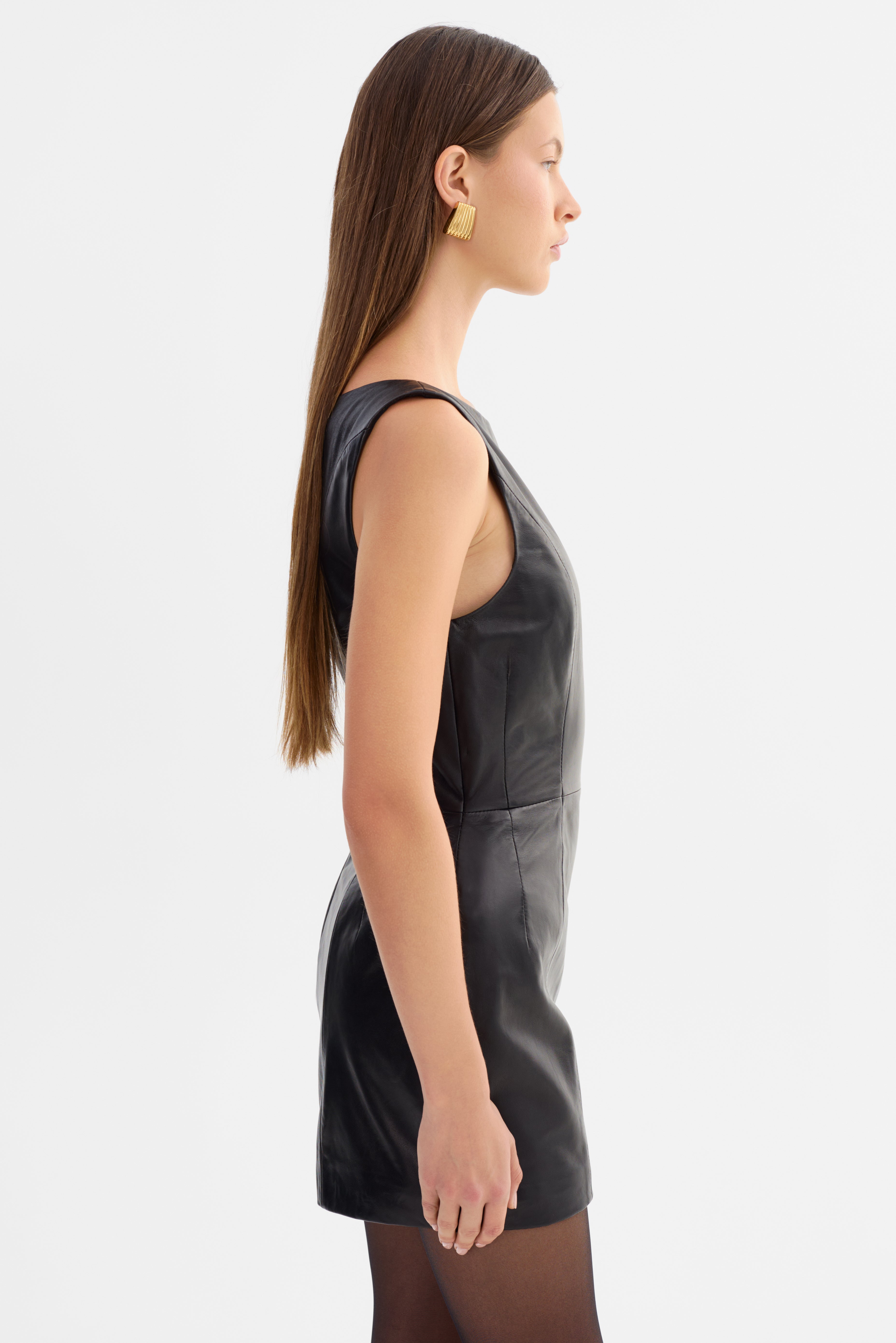 La mini-robe en cuir CASSANDRA, à la silhouette sculpturale et à l'encolure bateau raffinée, incarne la féminité moderne. Confectionnée en cuir d'agneau souple, elle est taillée pour souligner la taille grâce à des coutures et des baleines précises, offrant à la fois structure et élégance. Idéale pour les soirées, cette mini-robe affirme une allure audacieuse et intemporelle.