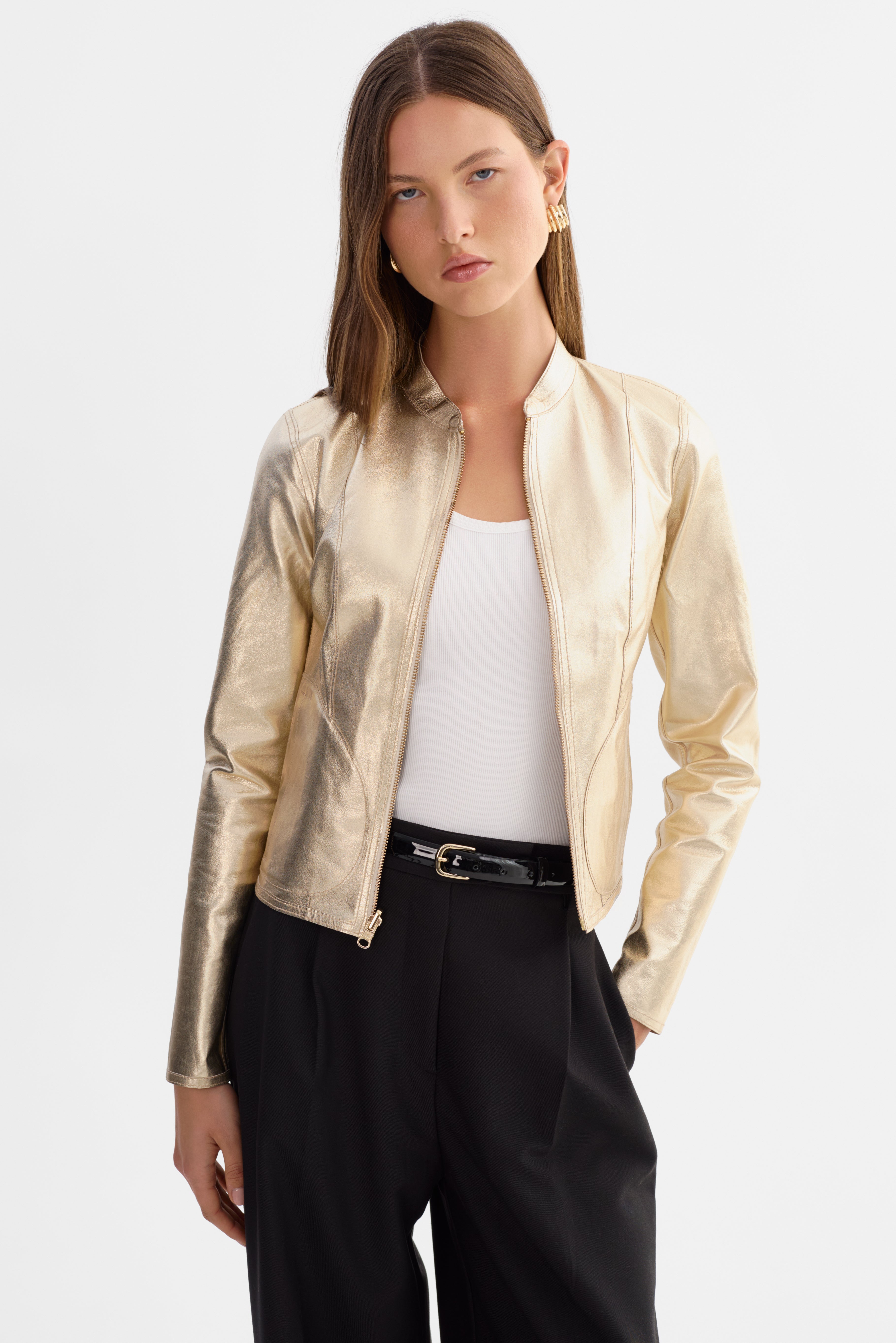 Réinventant la veste traditionnelle au goût du jour avec des textures rafraîchissantes et une silhouette plus fine, le Chapin est à la fois luxueux et versatile. Conçu en cuir d'agneau, sa couleur crème apporte un look classique, et sa doublure doréee est réversible pour un tout nouveau style brillant qui attirera tous les regards.