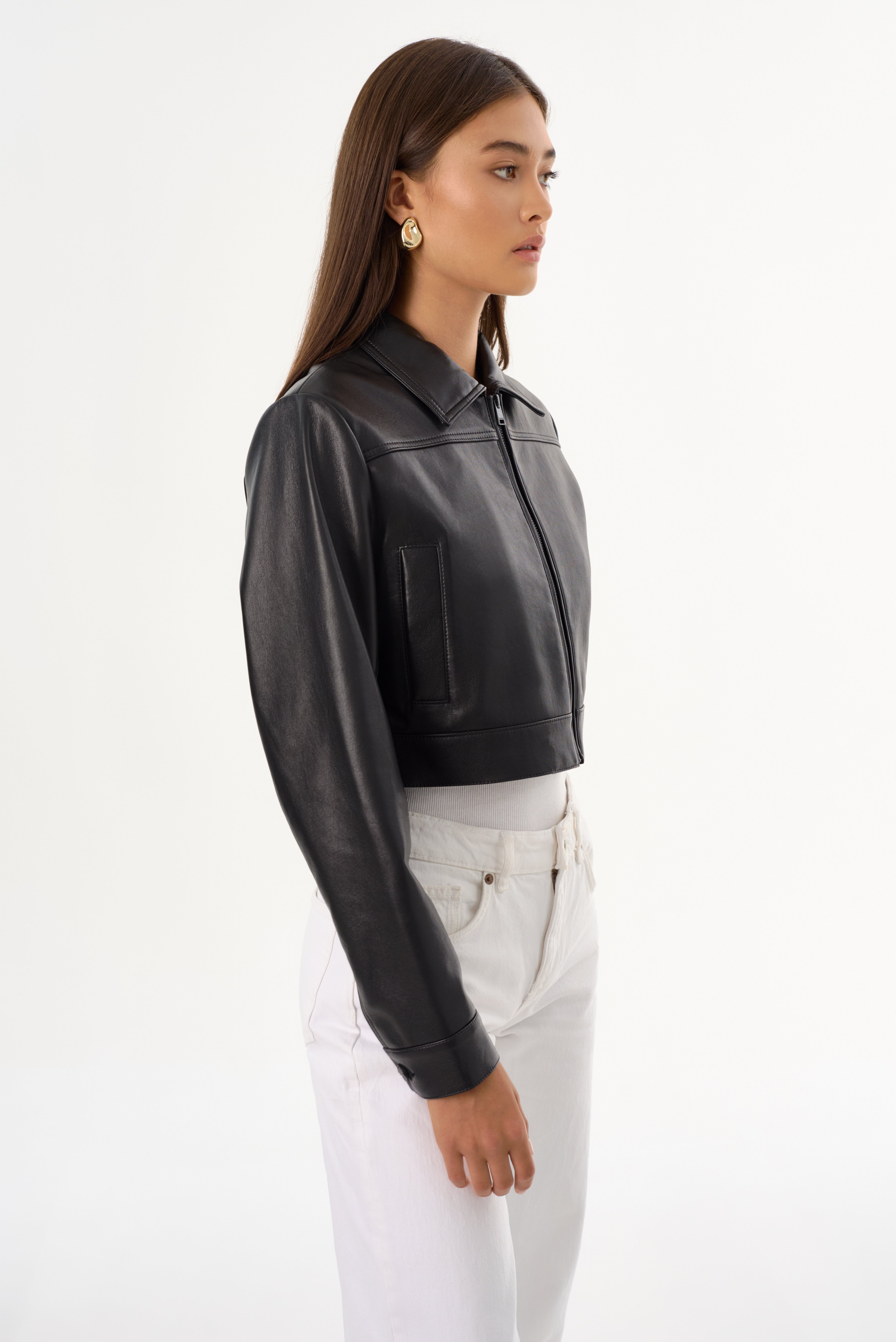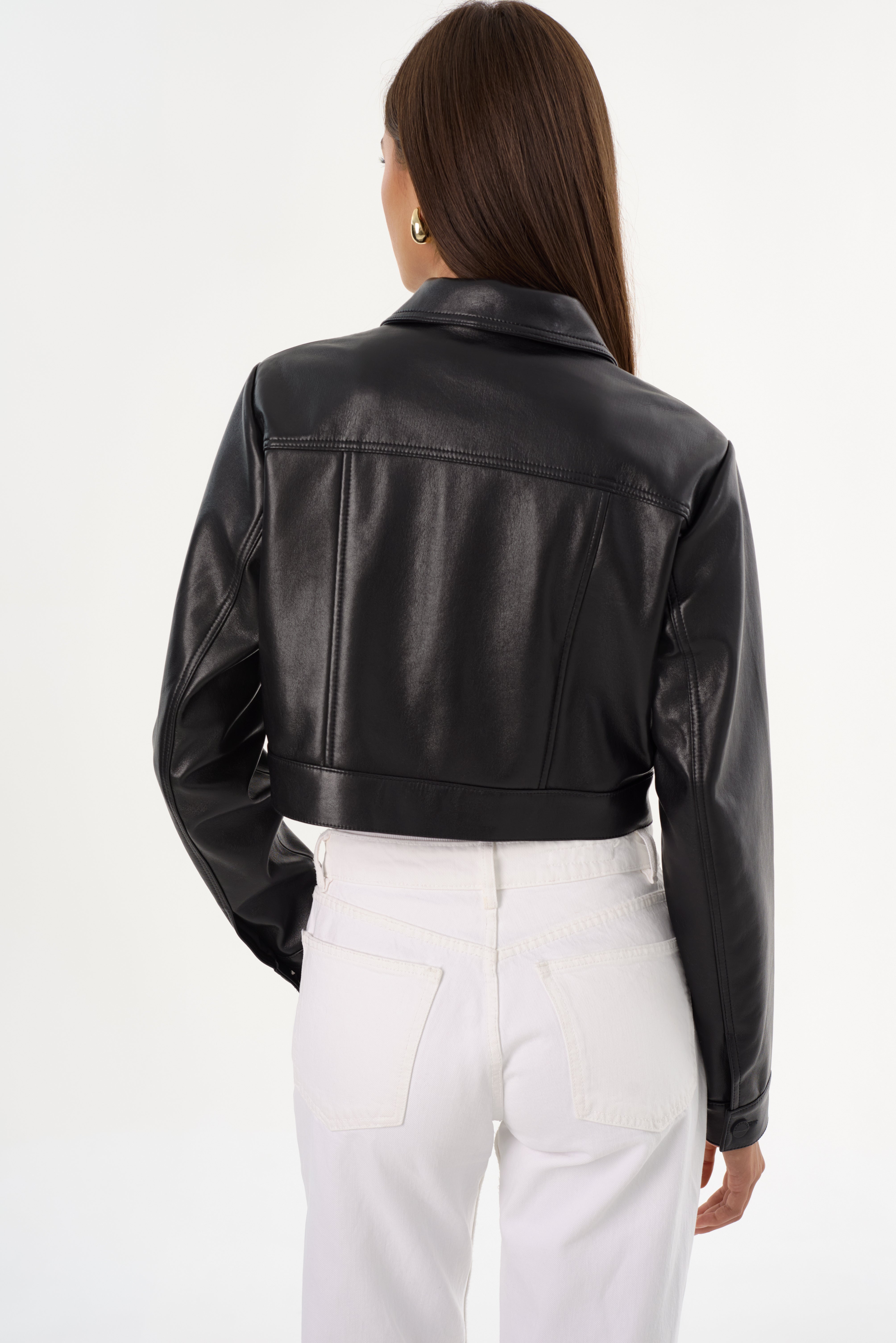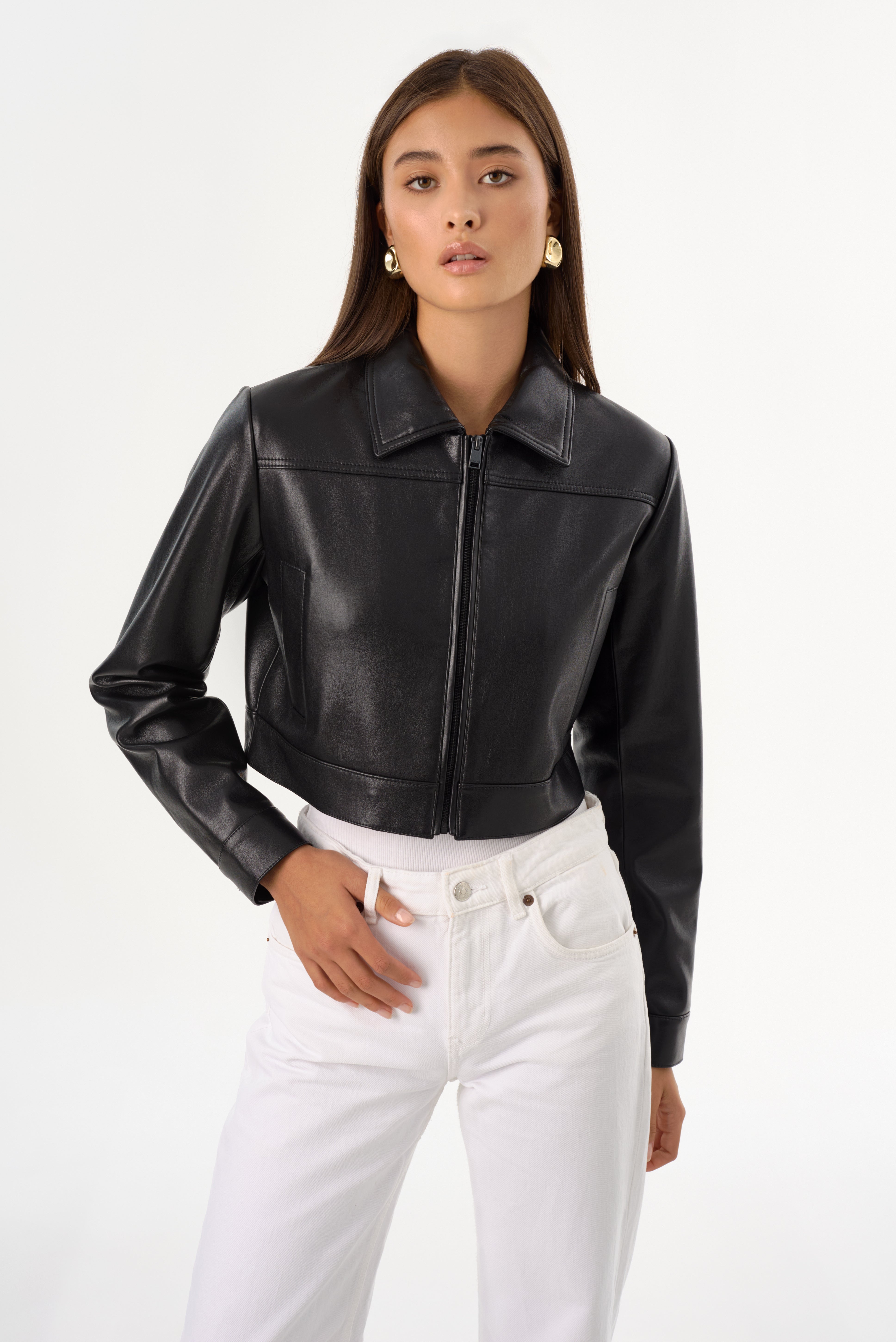La veste courte en cuir recyclé DAMIANA offre une coupe élégante et structurée avec une touche de sophistication moderne. Dotée d'un col chemise classique, d'une fermeture zippée sur le devant et de manches à revers, cette veste allie un design intemporel à une touche contemporaine. Portez-la avec un pantalon tailleur pour un look soigné ou sur une robe nuisette pour une tenue de soirée raffinée.