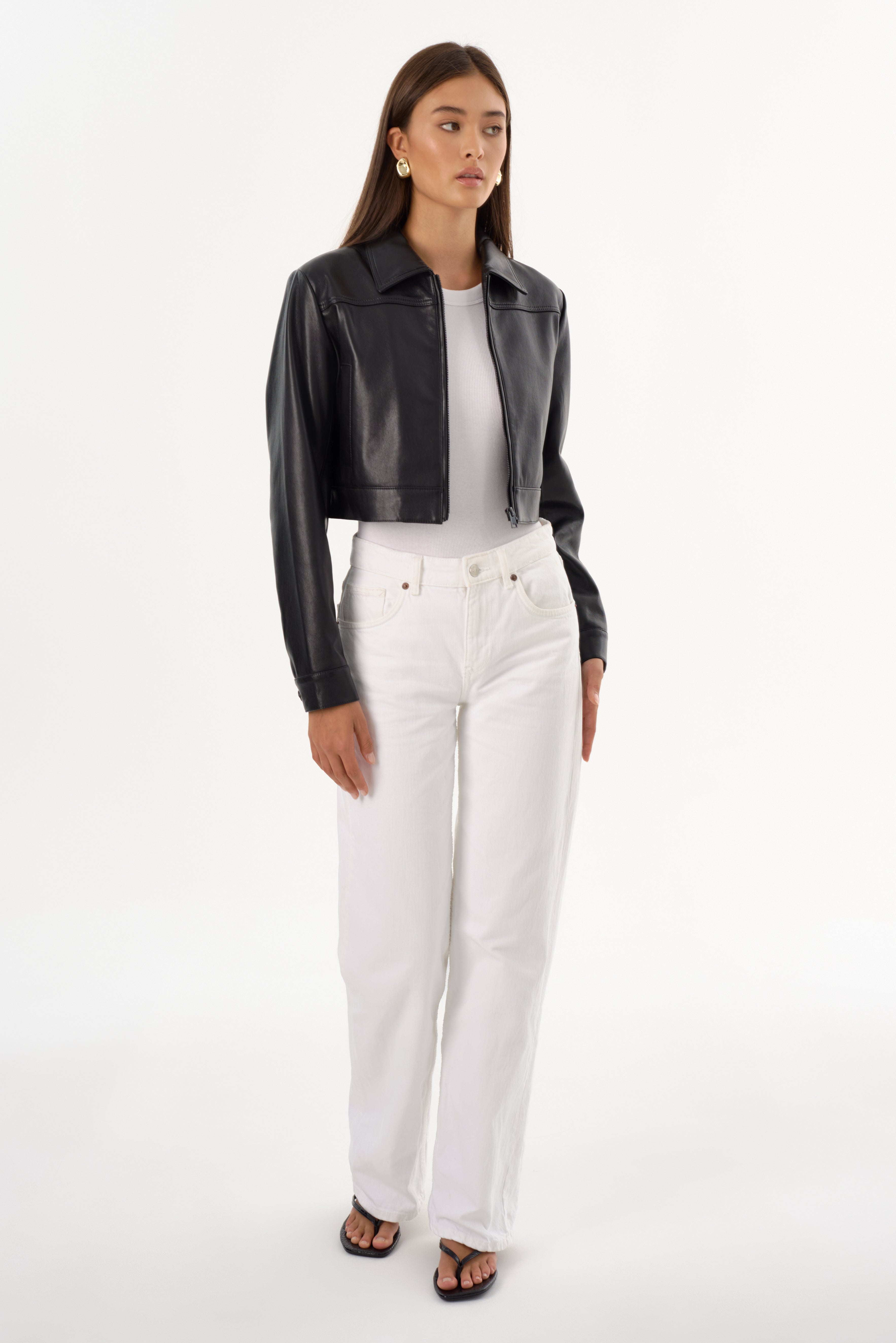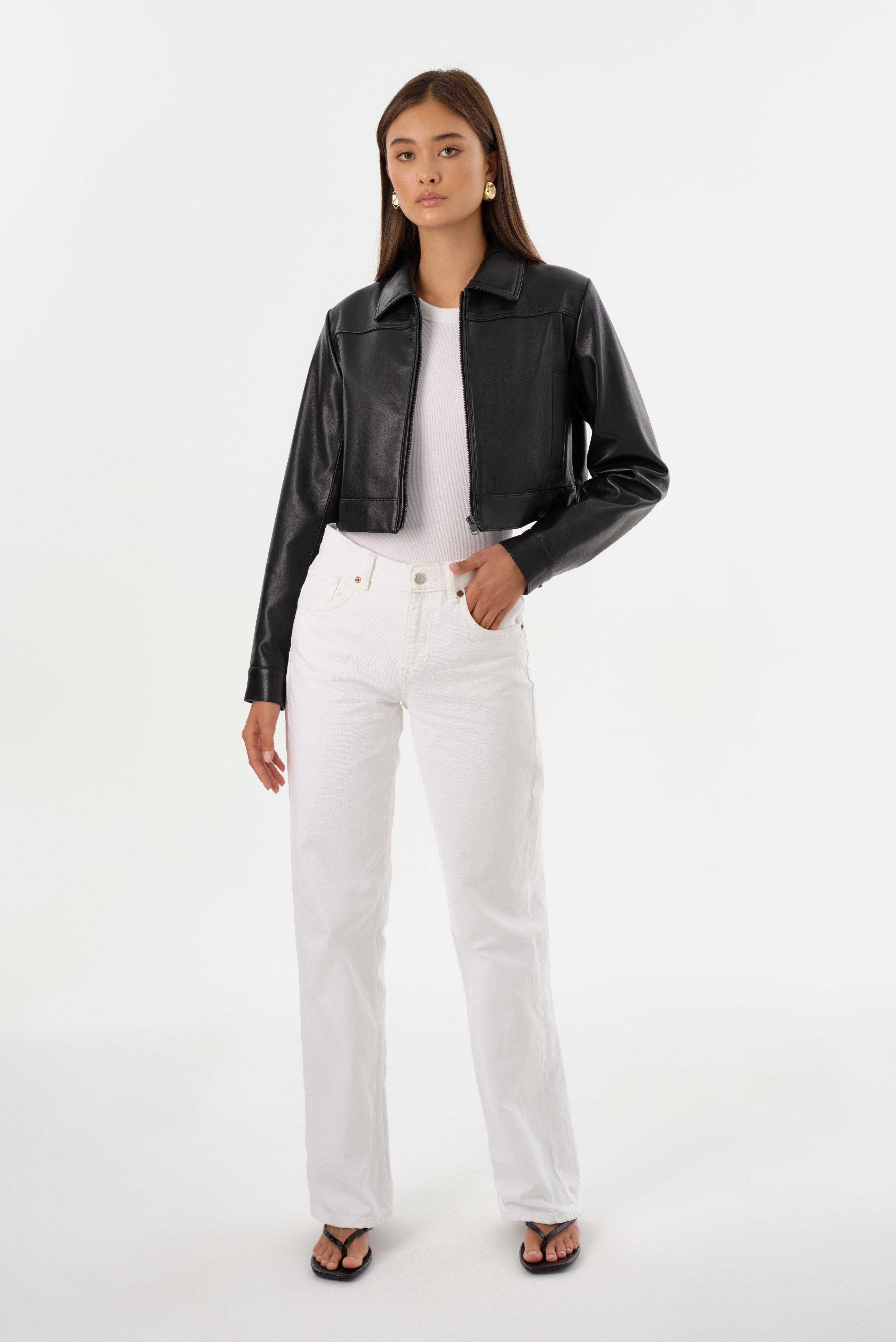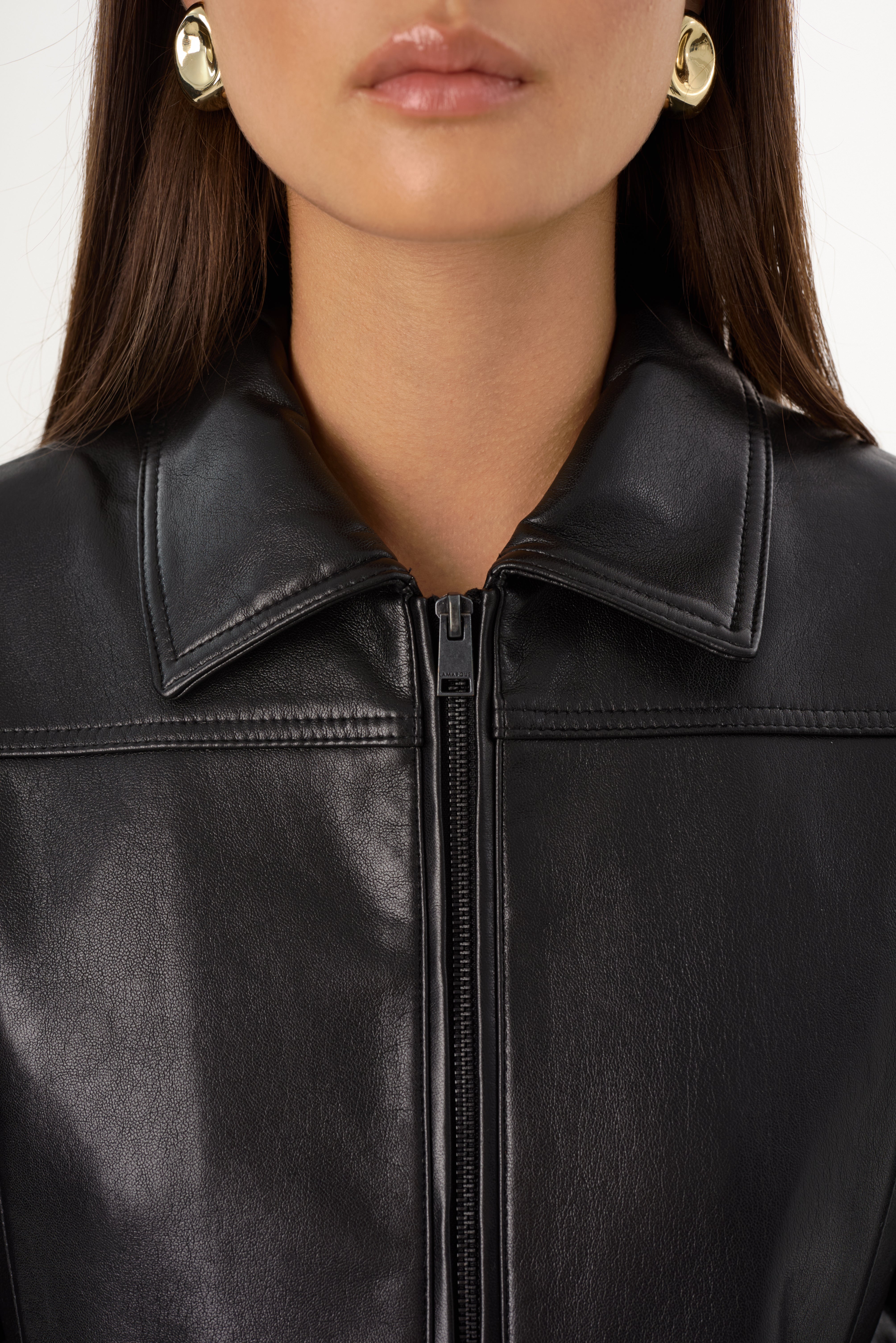 La veste courte en cuir recyclé DAMIANA offre une coupe élégante et structurée avec une touche de sophistication moderne. Dotée d'un col chemise classique, d'une fermeture zippée sur le devant et de manches à revers, cette veste allie un design intemporel à une touche contemporaine. Portez-la avec un pantalon tailleur pour un look soigné ou sur une robe nuisette pour une tenue de soirée raffinée.
