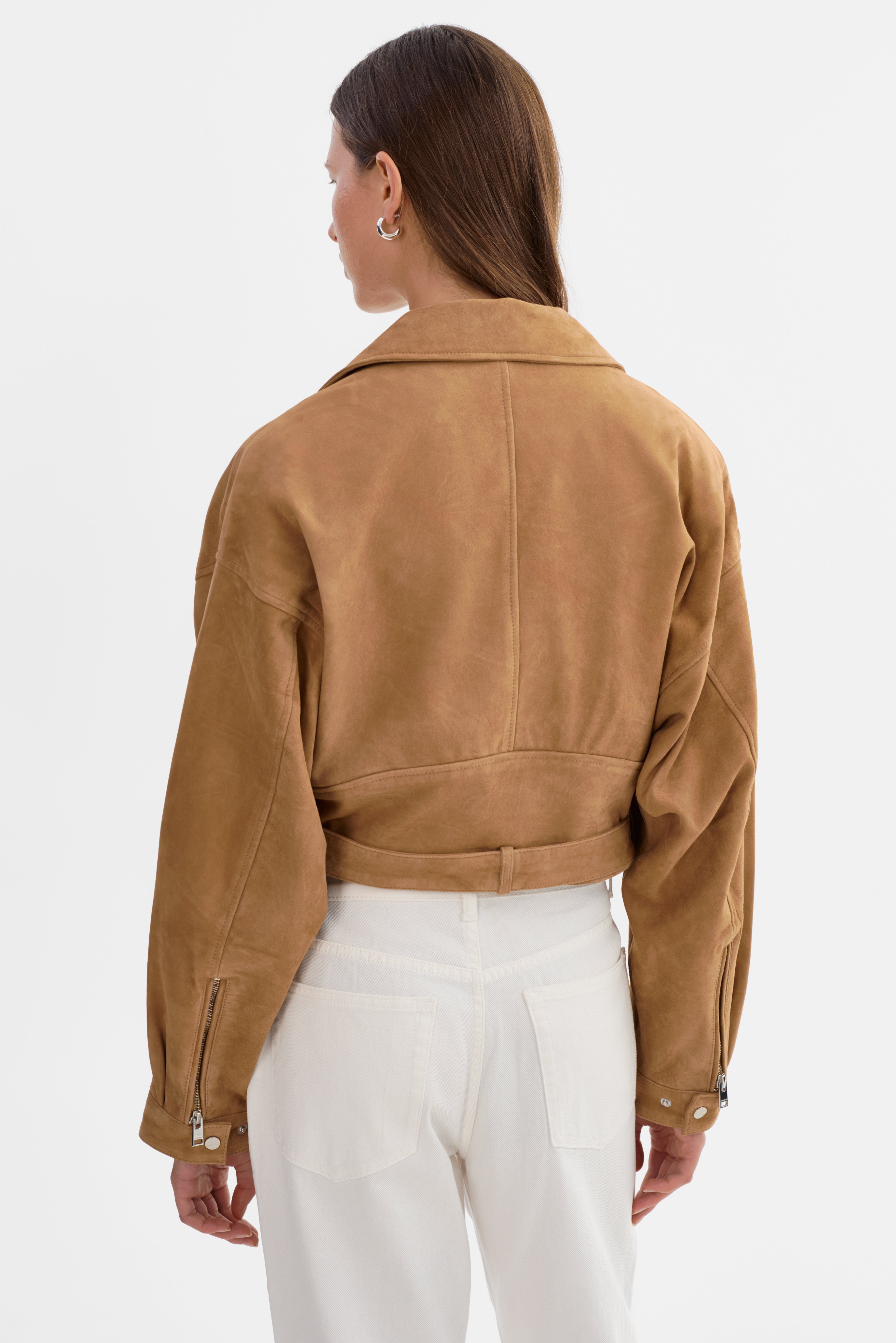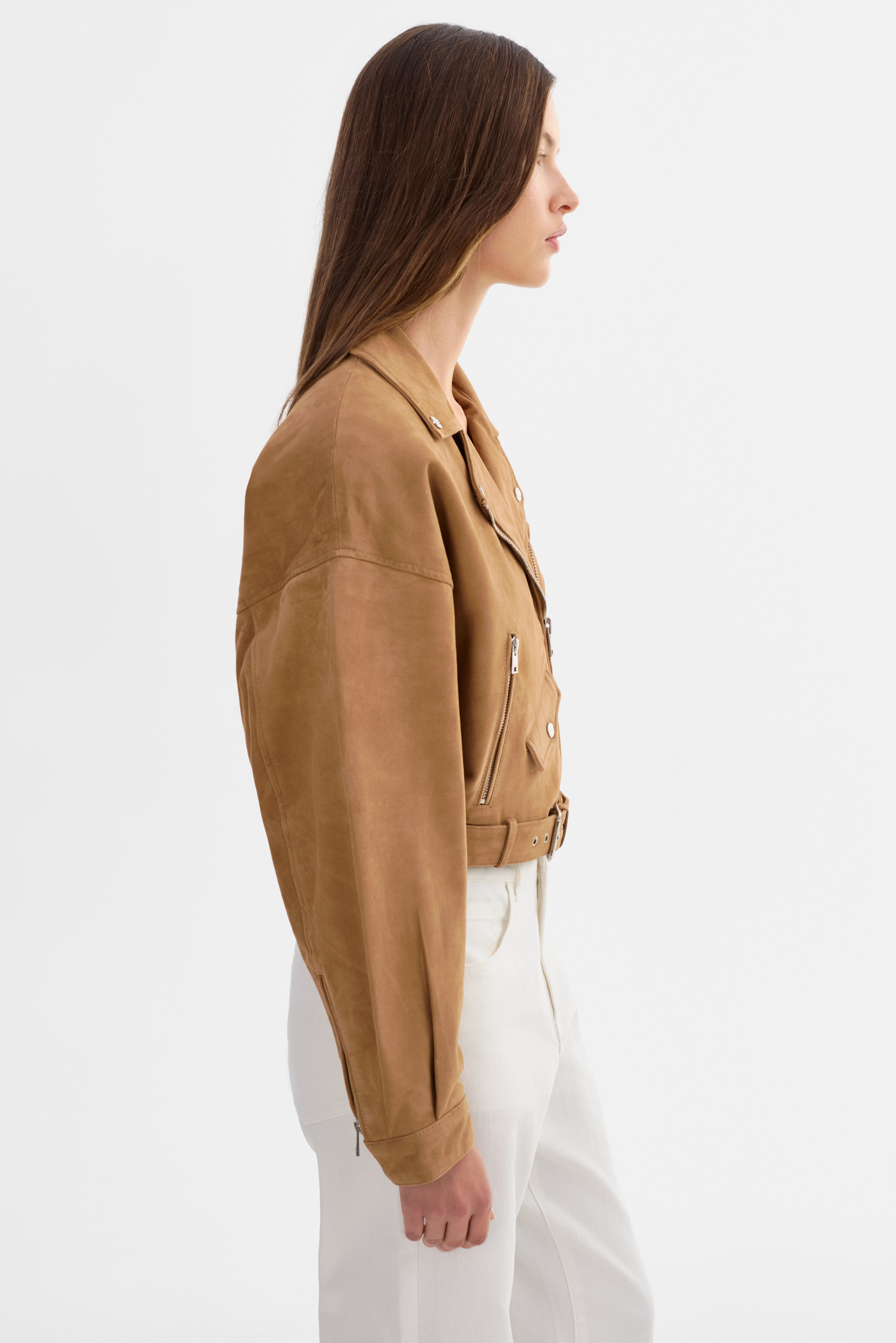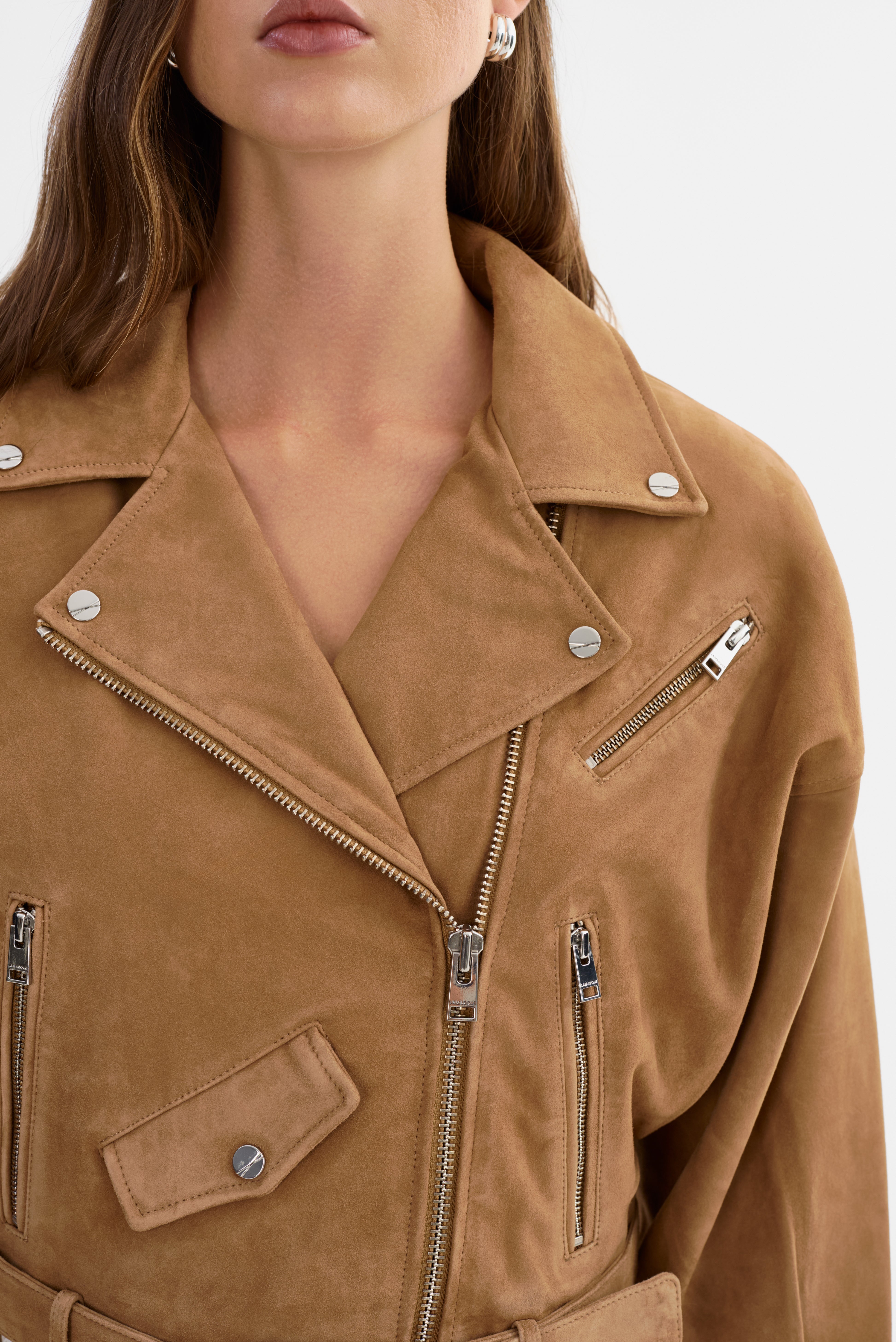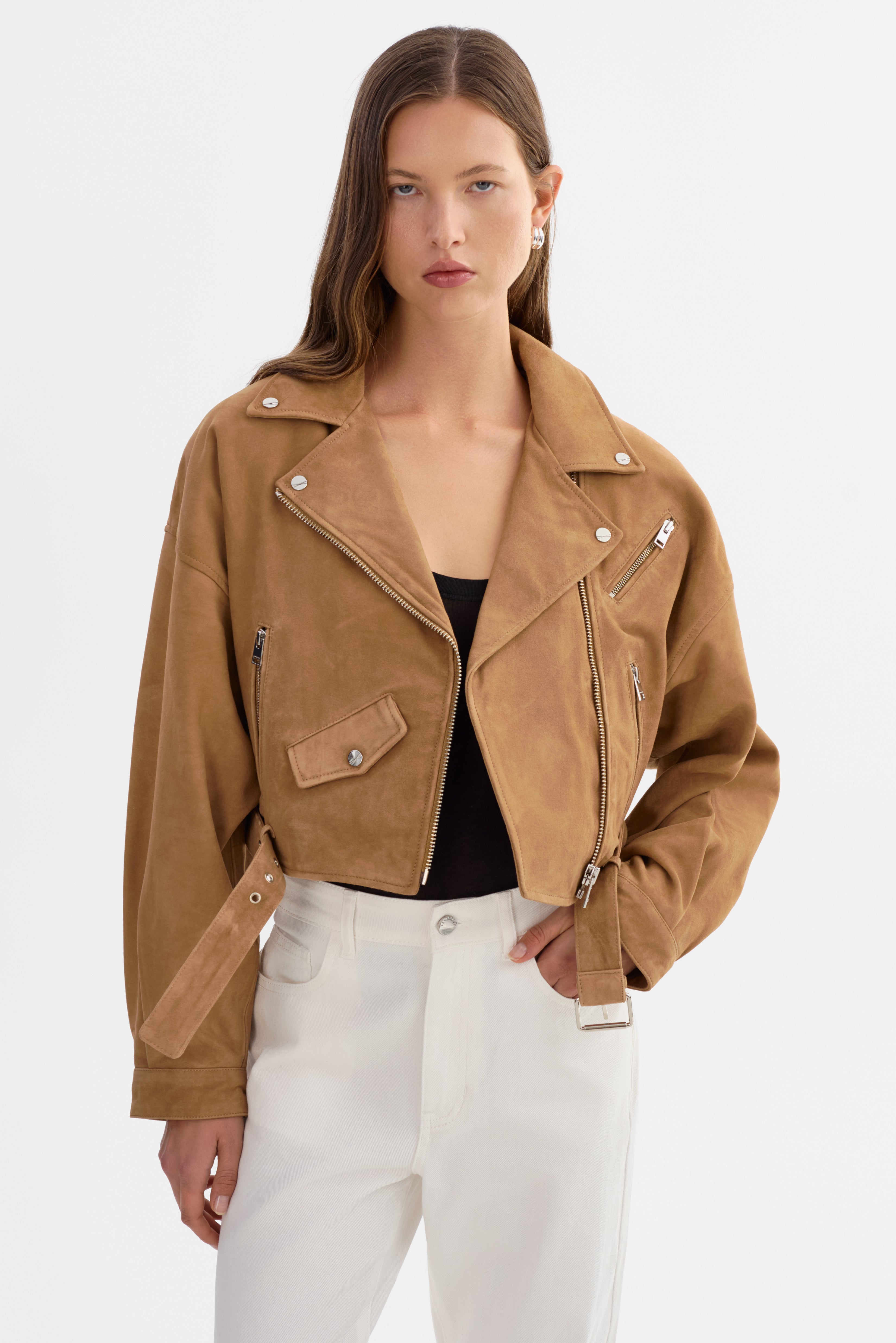 Parfois, il n'y a pas de meilleur sentiment que de sentir tous les regards rivés sur soi. Revivez le meilleur des années 80 grâce à cette veste en suède raccourcie d'inspiration vintage. Ornée d'éléments classiques de style « motard » et d'accents inattendus comme ses épaulettes et ses manches bouffantes à fronces, la Dylan vous fera de toute évidence sortir du lot. De plus, une poche à monnaie avec rabat et une ceinture amovible au niveau de la taille confèrent de petites touches uniques à cette magnifique veste en suède de chèvre. Faites-vous remarquer grâce à ce chef-d'œuvre inspiré des années 80; il ne manquera pas de faire tourner toutes les têtes sur son passage.