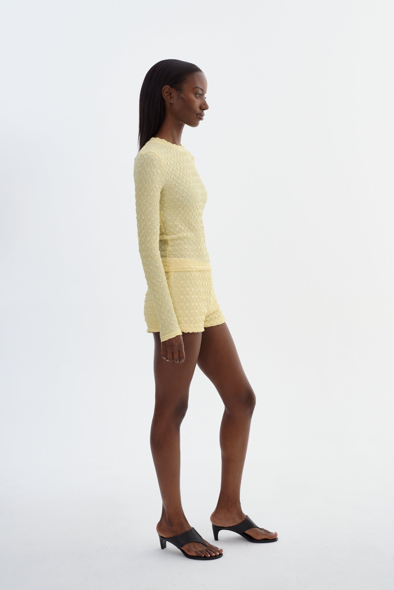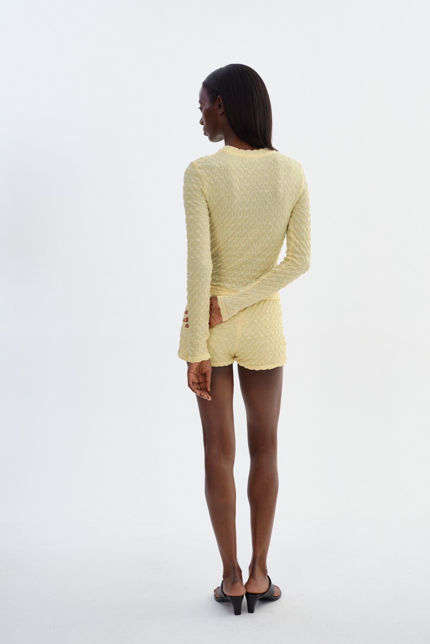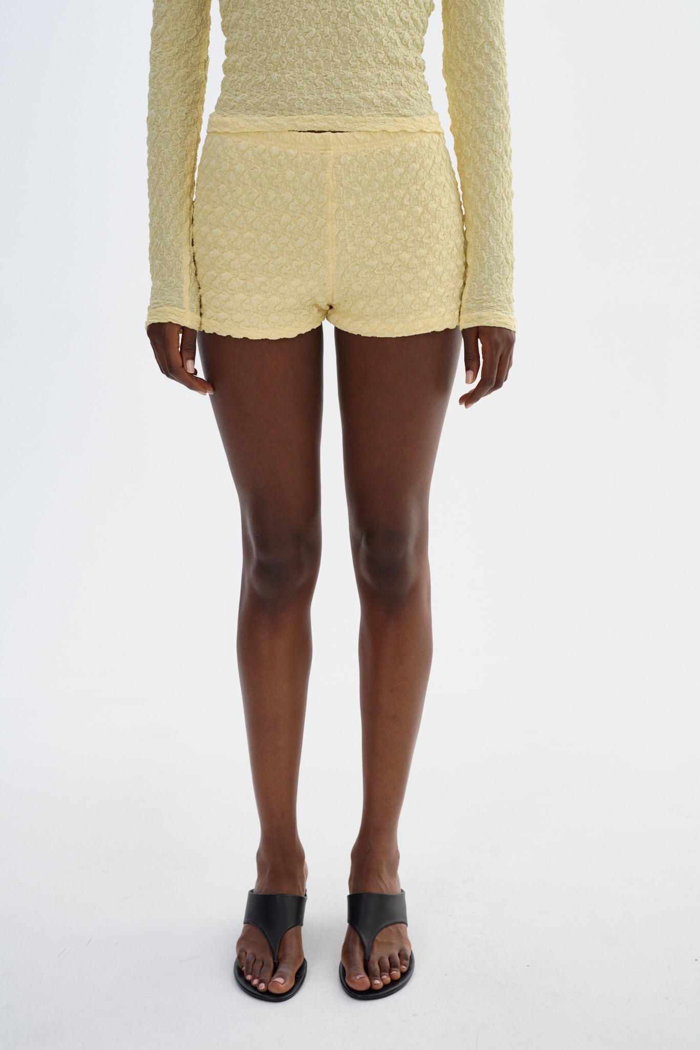 The ANGELICA shorts embody effortless sophistication with a streamlined, sculpted fit. Cut from a textured stretch fabric, they sit high on the waist to elongate the silhouette while offering a secure, flattering hold. Worn with the coordinating top OANA or styled on their own, they're a refined choice for resort moments or elevated everyday dressing.