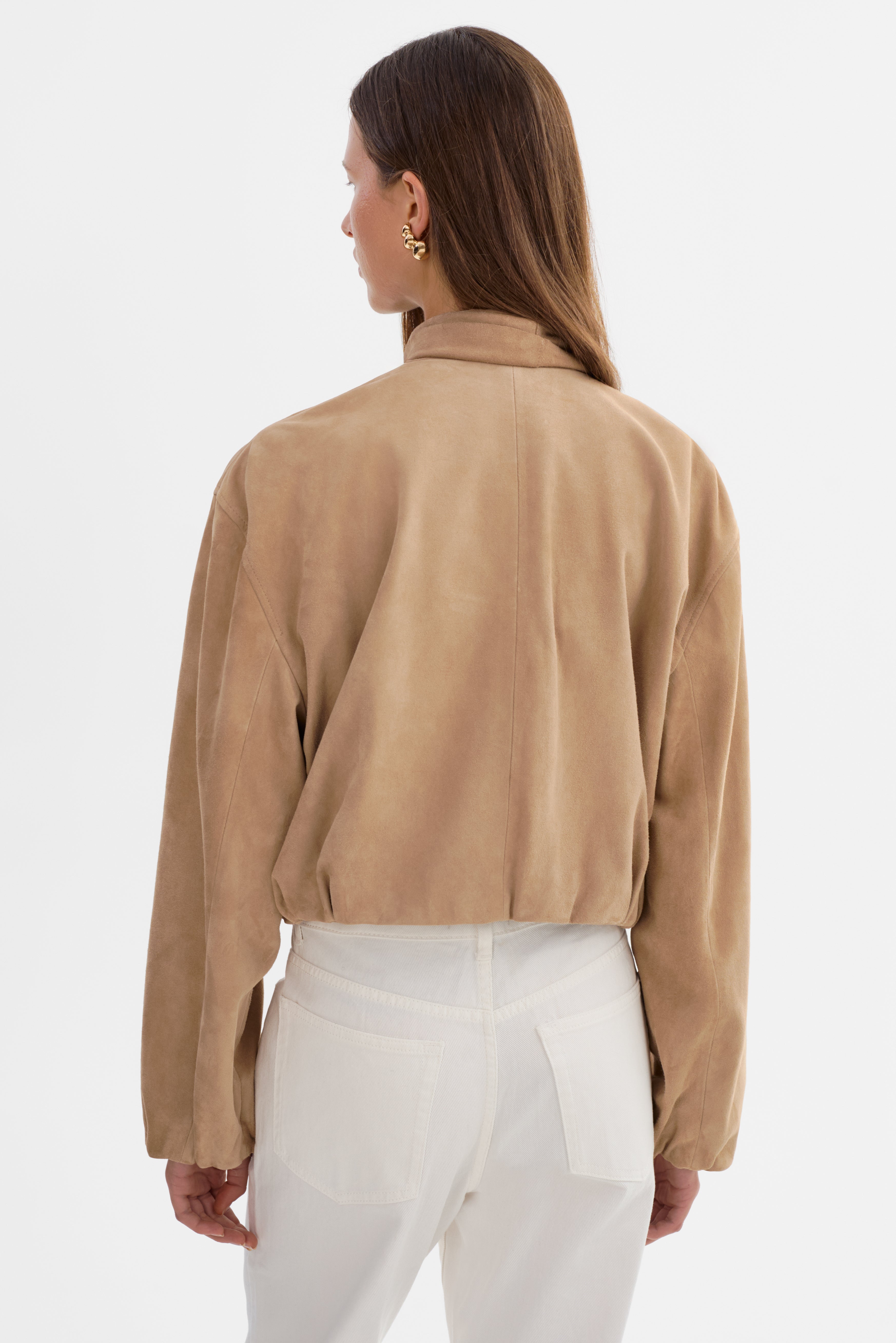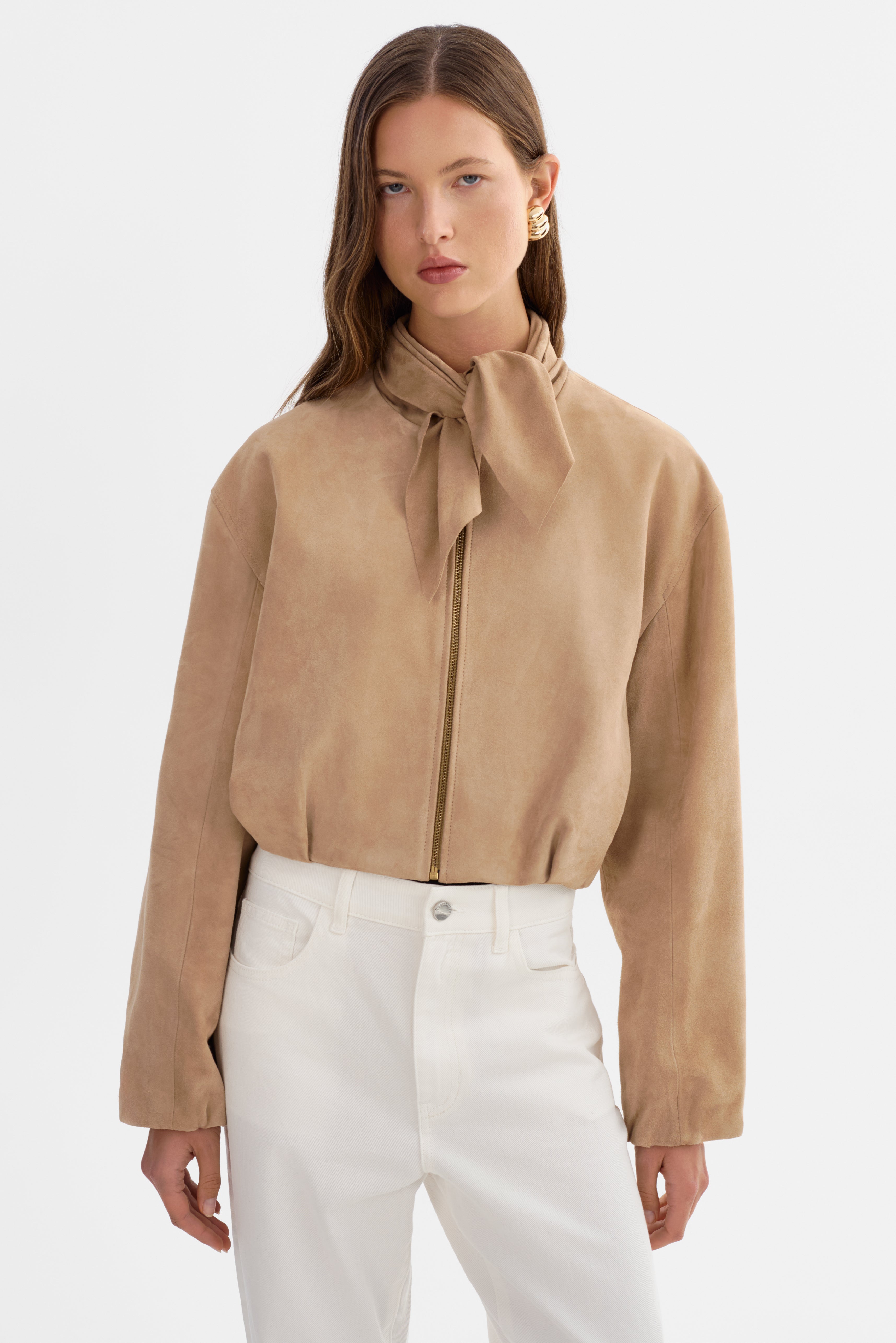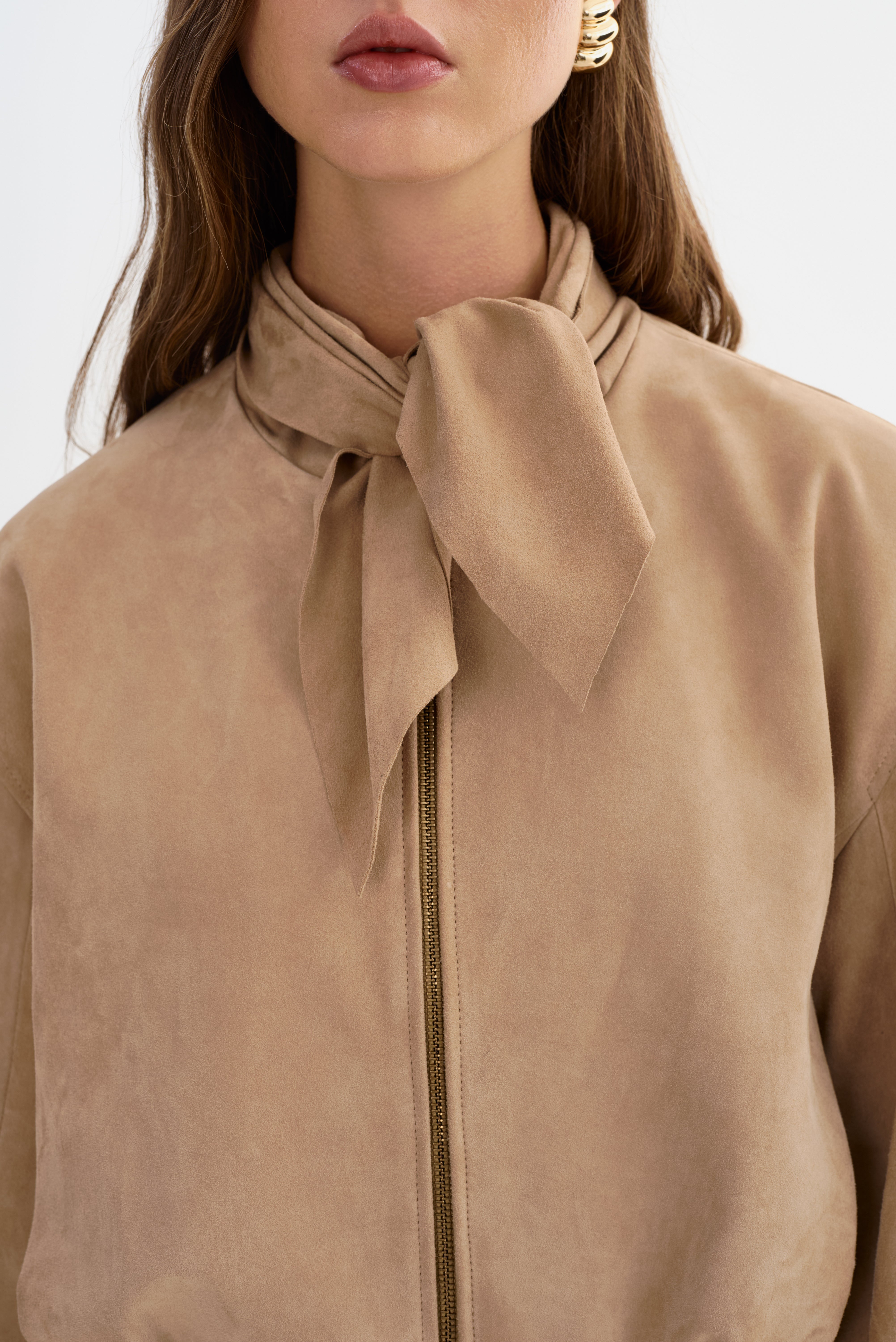 The ANITA Bomber Jacket redefines casual sophistication. Made from supple goat suede, it features a wide collar that ties into a soft neck scarf for a feminine twist on a classic silhouette. Cropped with elasticized hems, this timeless piece adds effortless polish to both tailored and off-duty looks.
