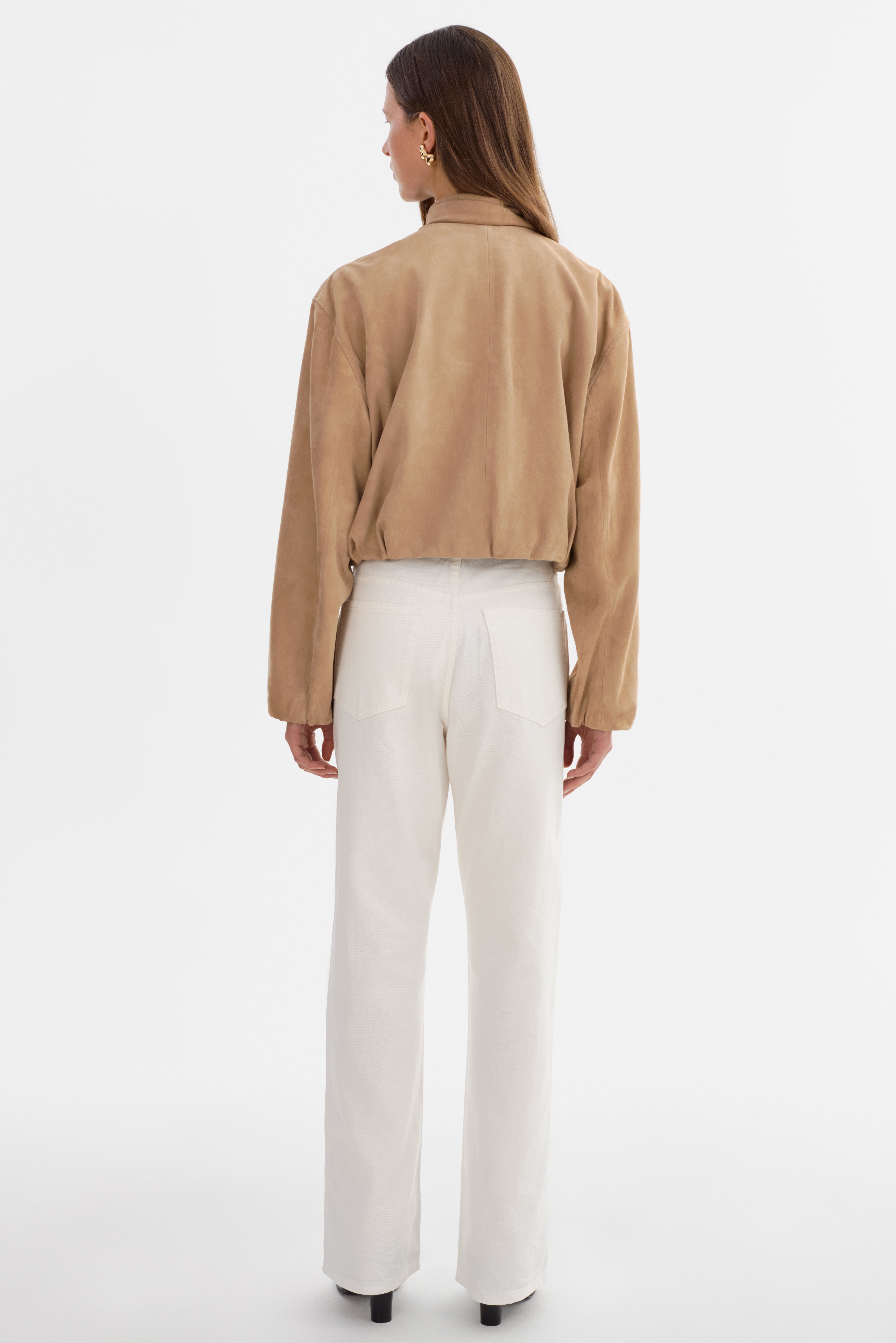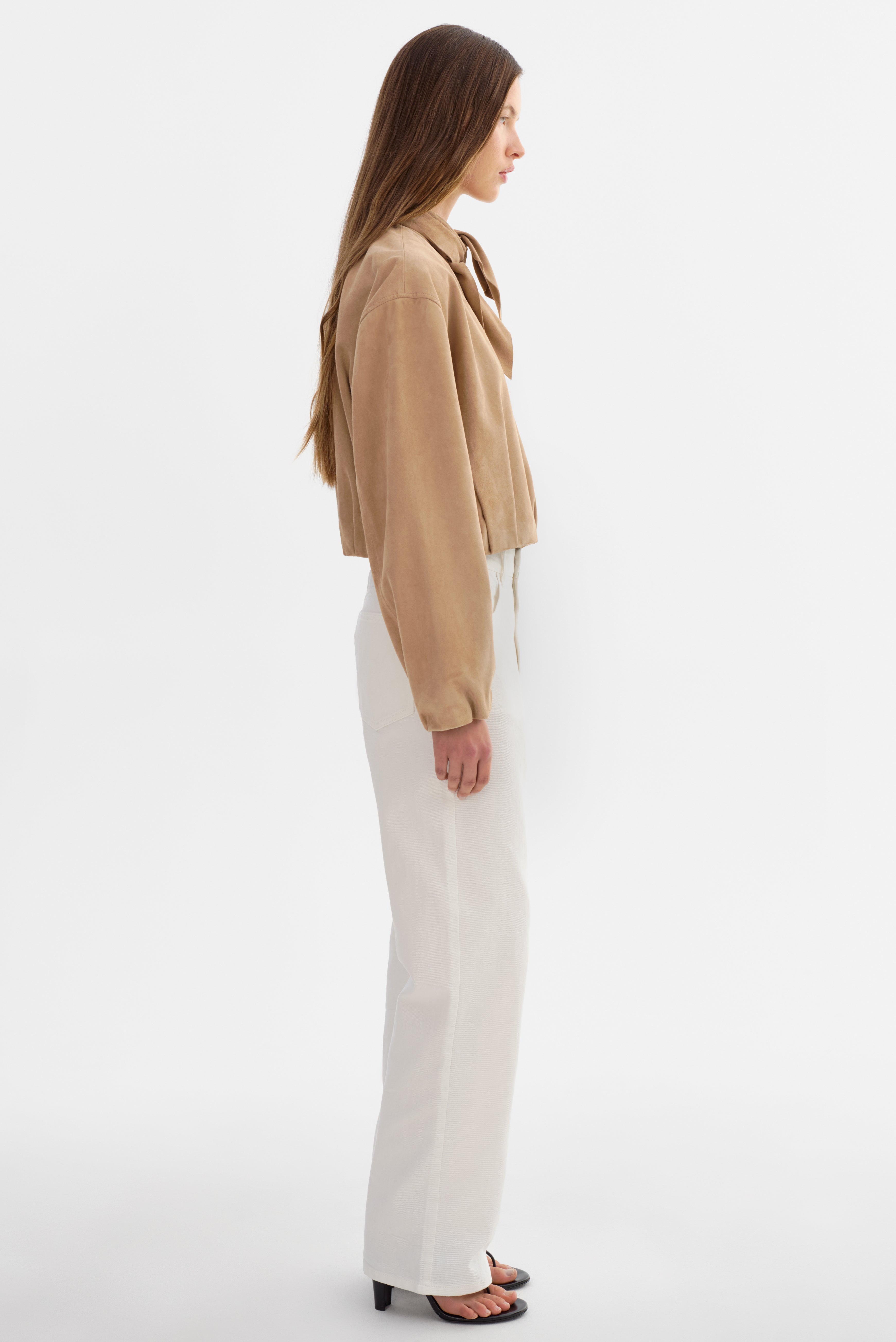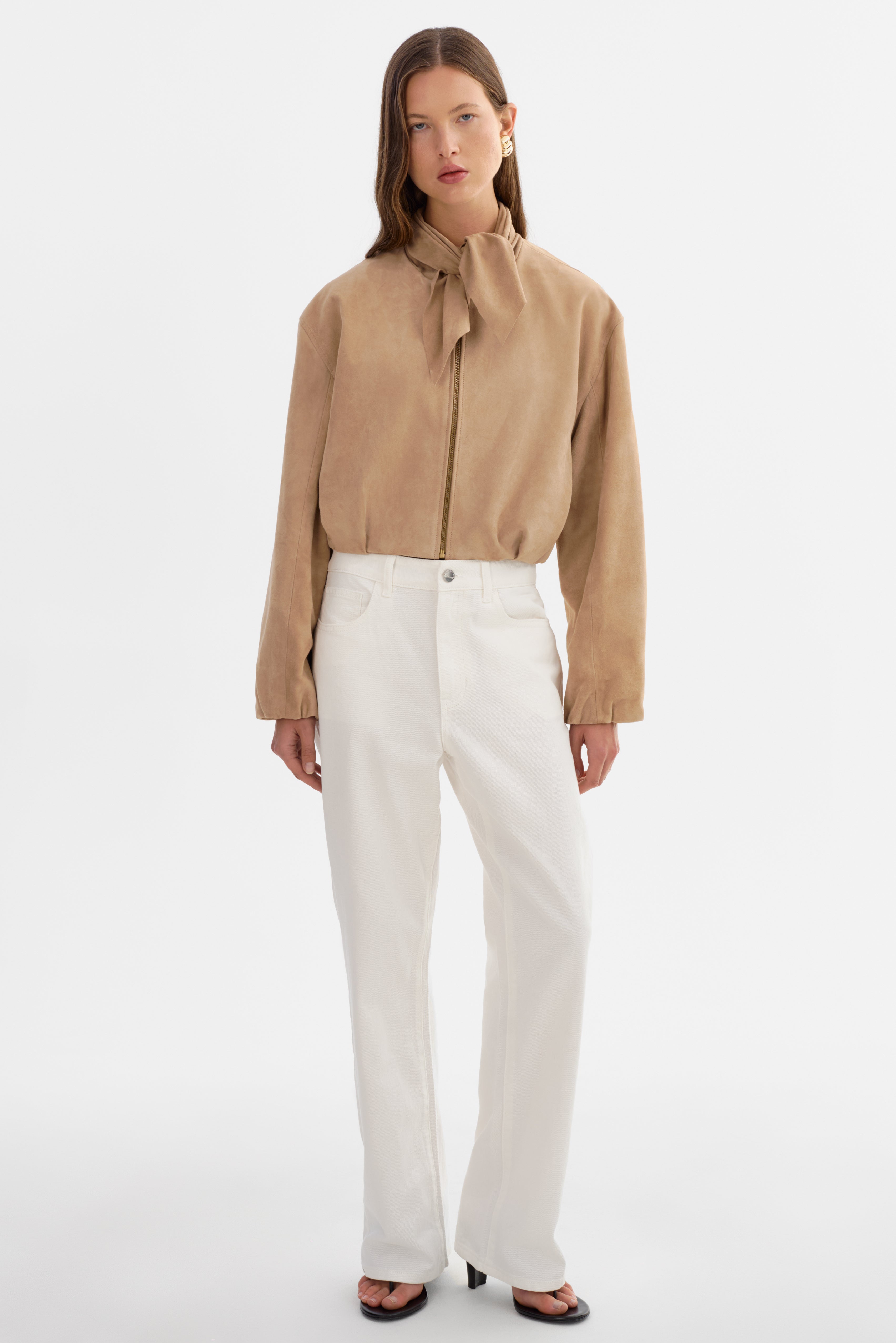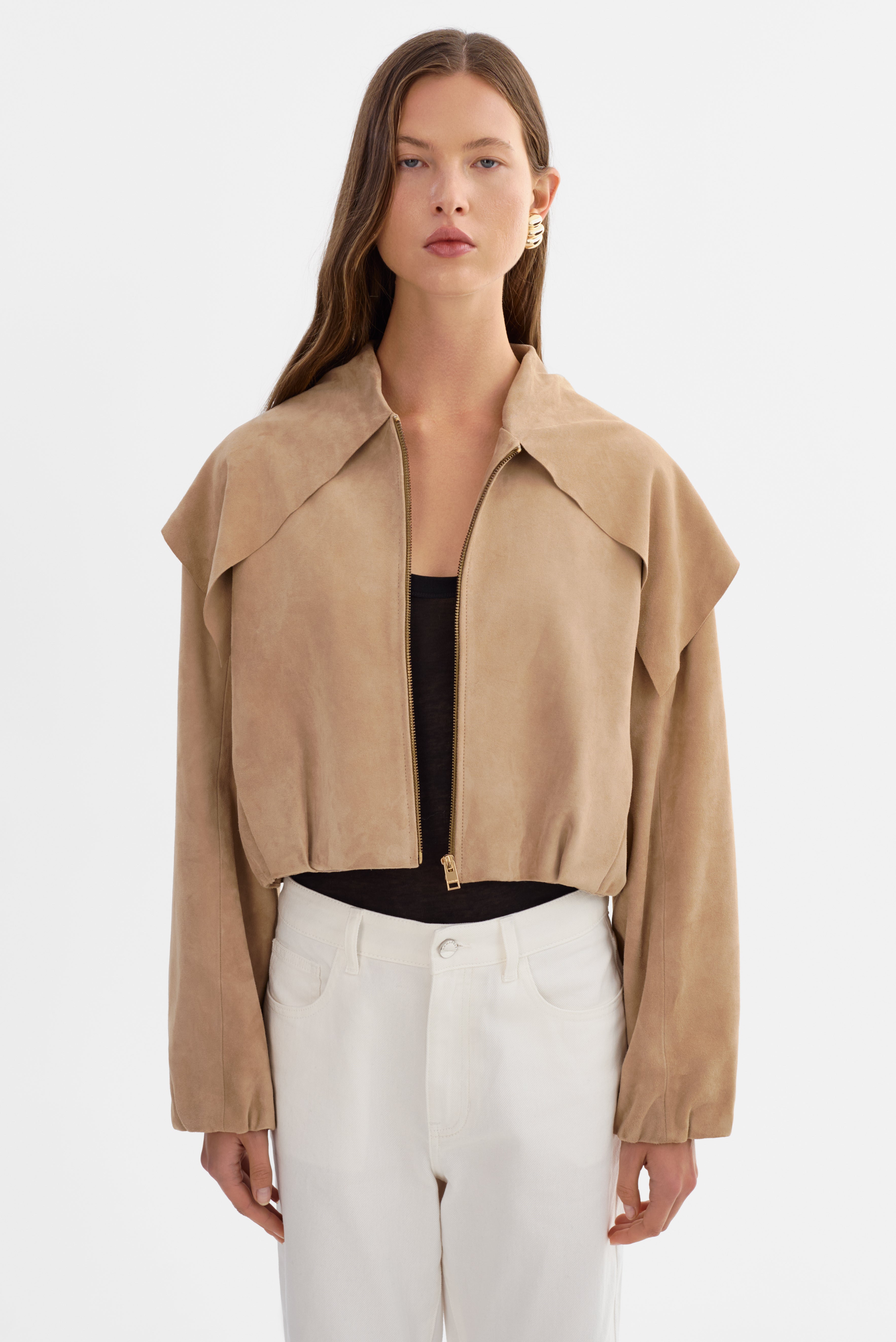 The ANITA Bomber Jacket redefines casual sophistication. Made from supple goat suede, it features a wide collar that ties into a soft neck scarf for a feminine twist on a classic silhouette. Cropped with elasticized hems, this timeless piece adds effortless polish to both tailored and off-duty looks.