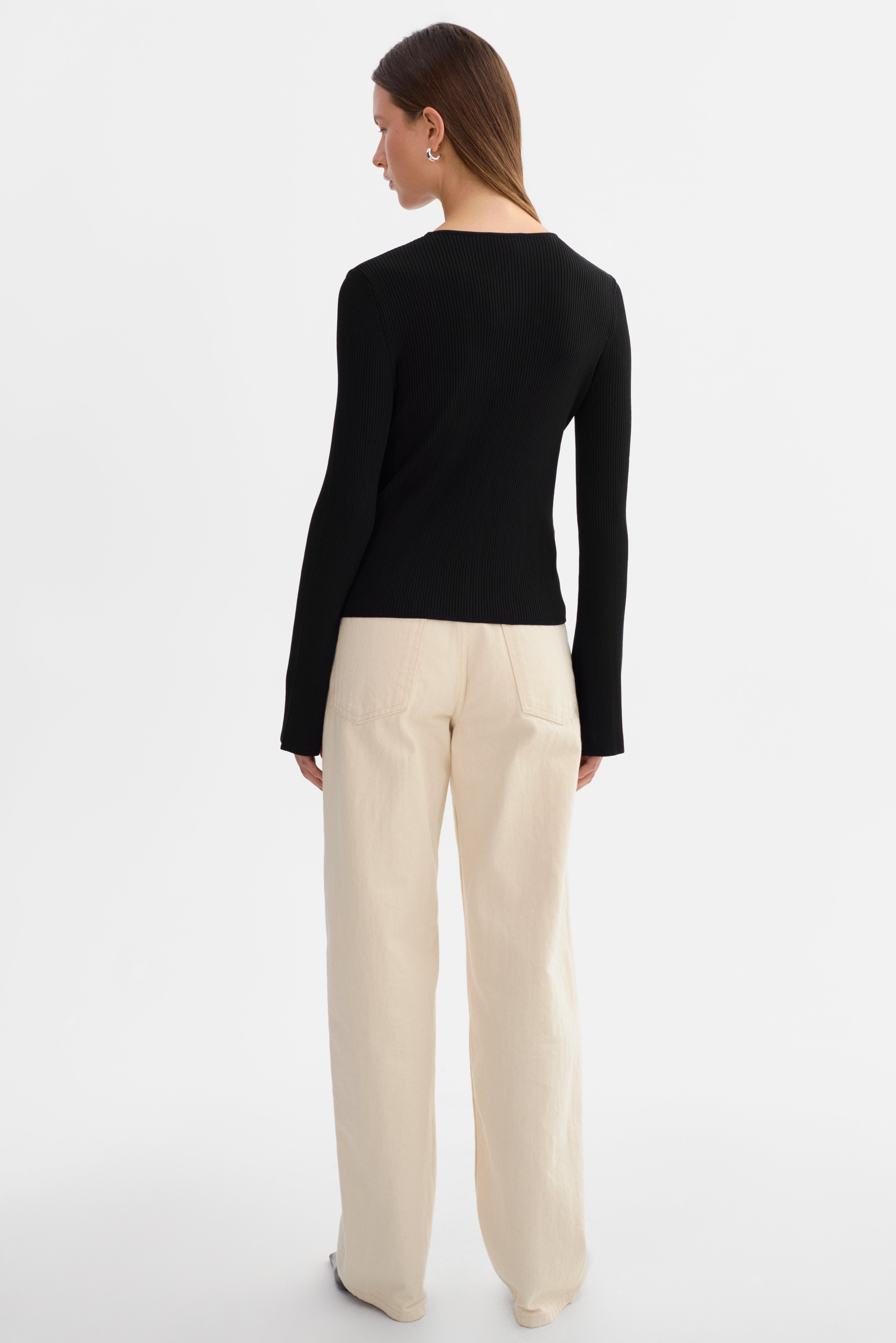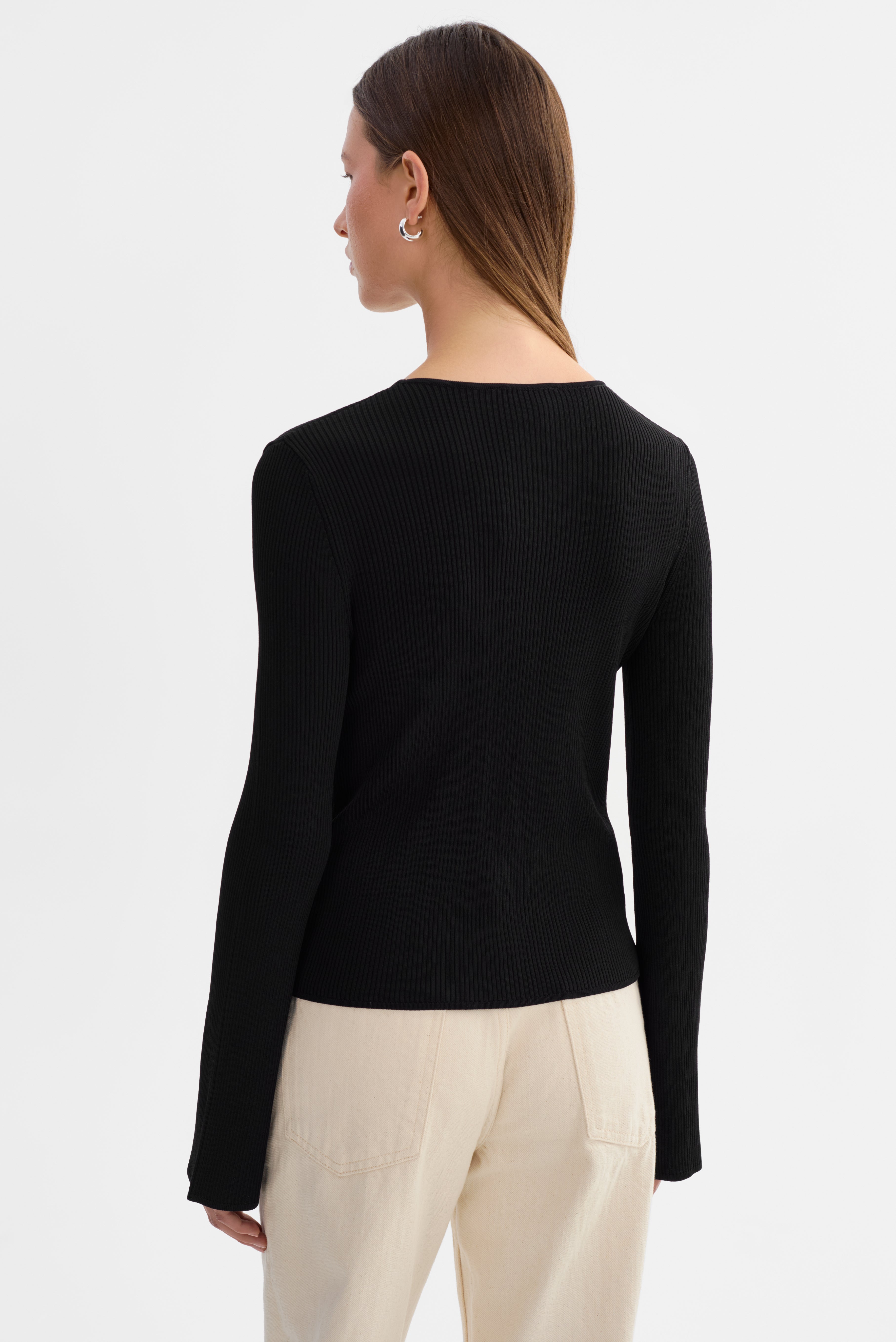 A bold twist on a classic silhouette. The ARACELLI Ribbed Knit Top is crafted from a stretch rib knit that flatters the body with a sleek, form-fitting shape. The deep V neckline meets a sharp front slit for an unexpected edge, while elongated sleeves add a refined finish. It's the kind of piece that turns minimalism into a statement.
