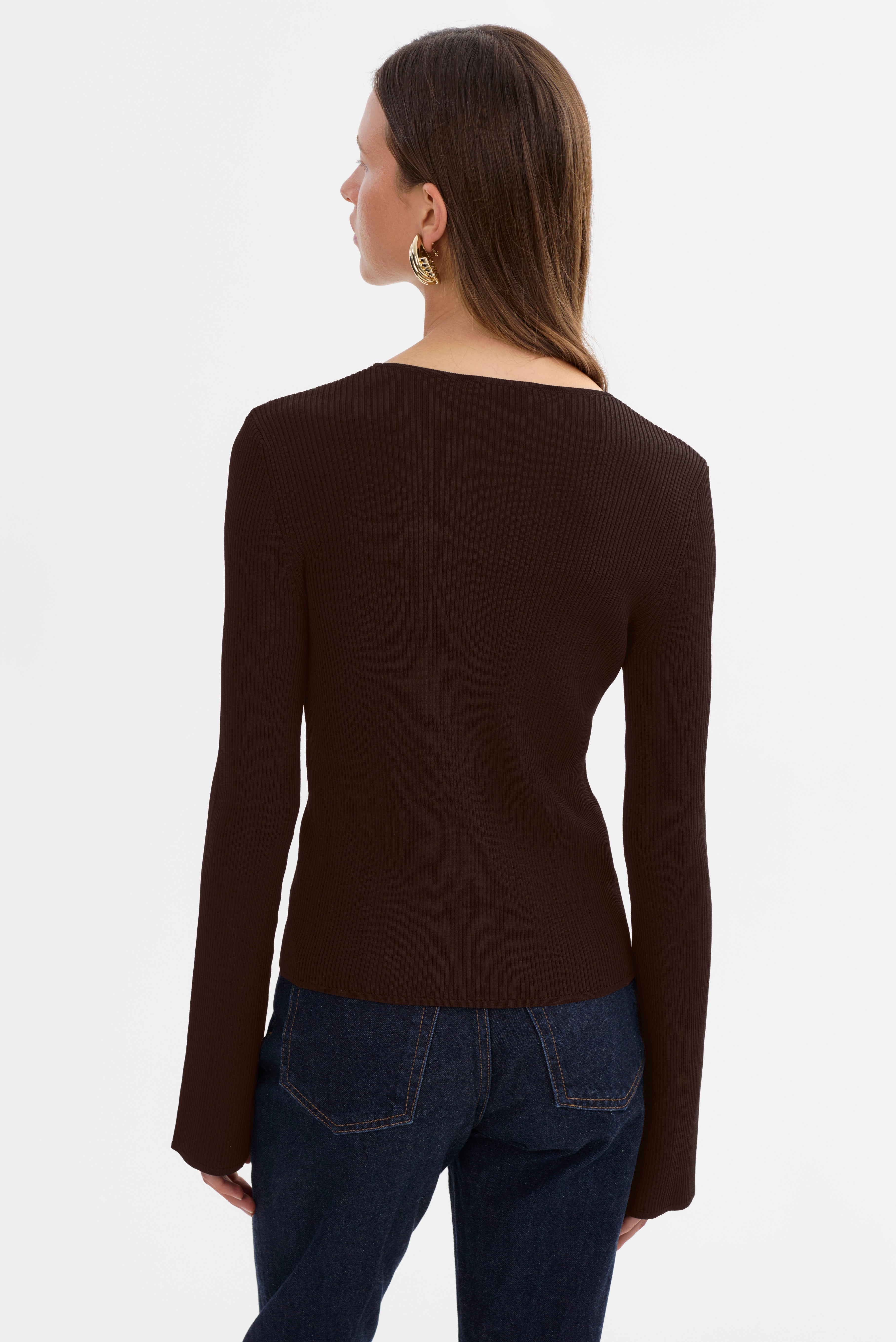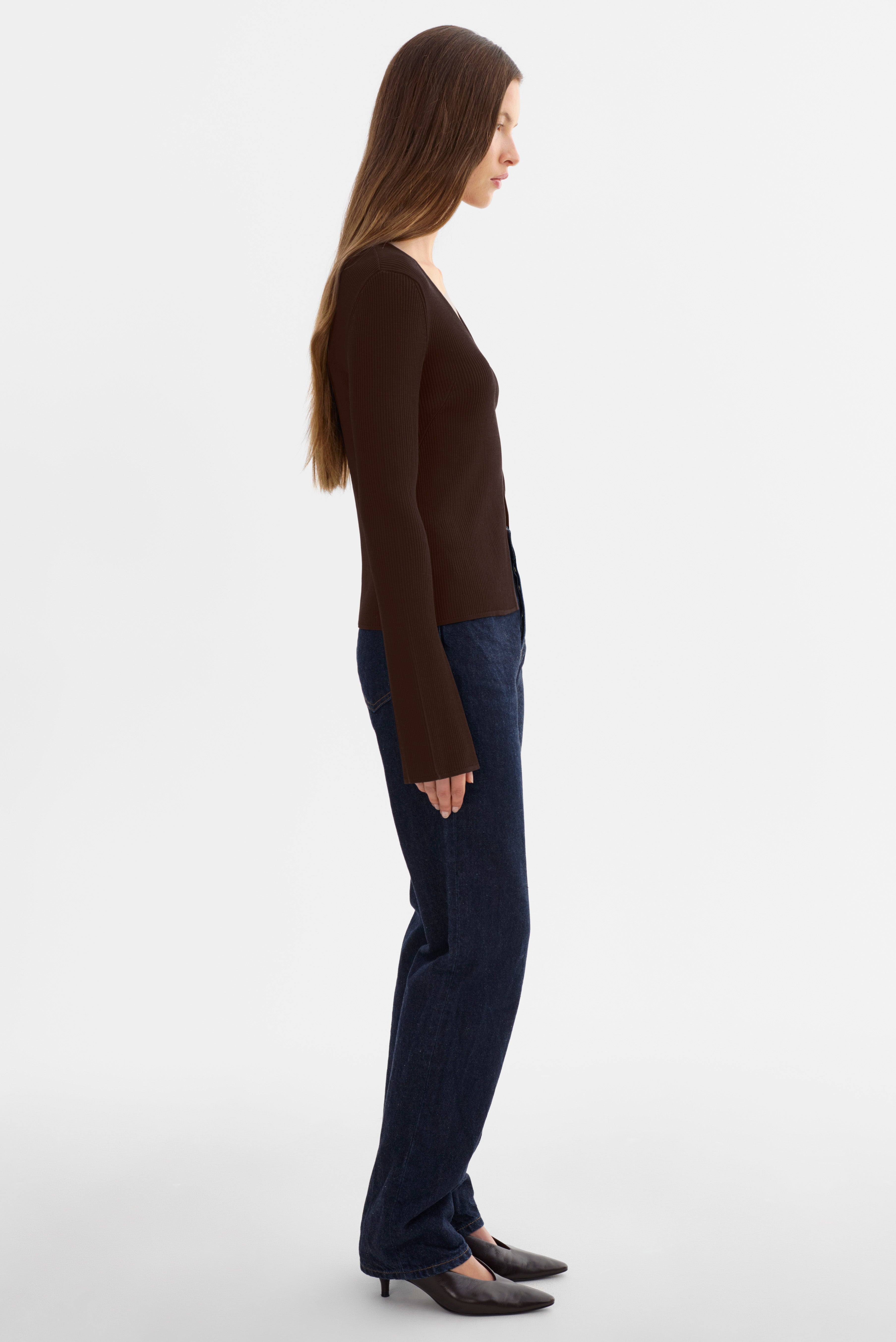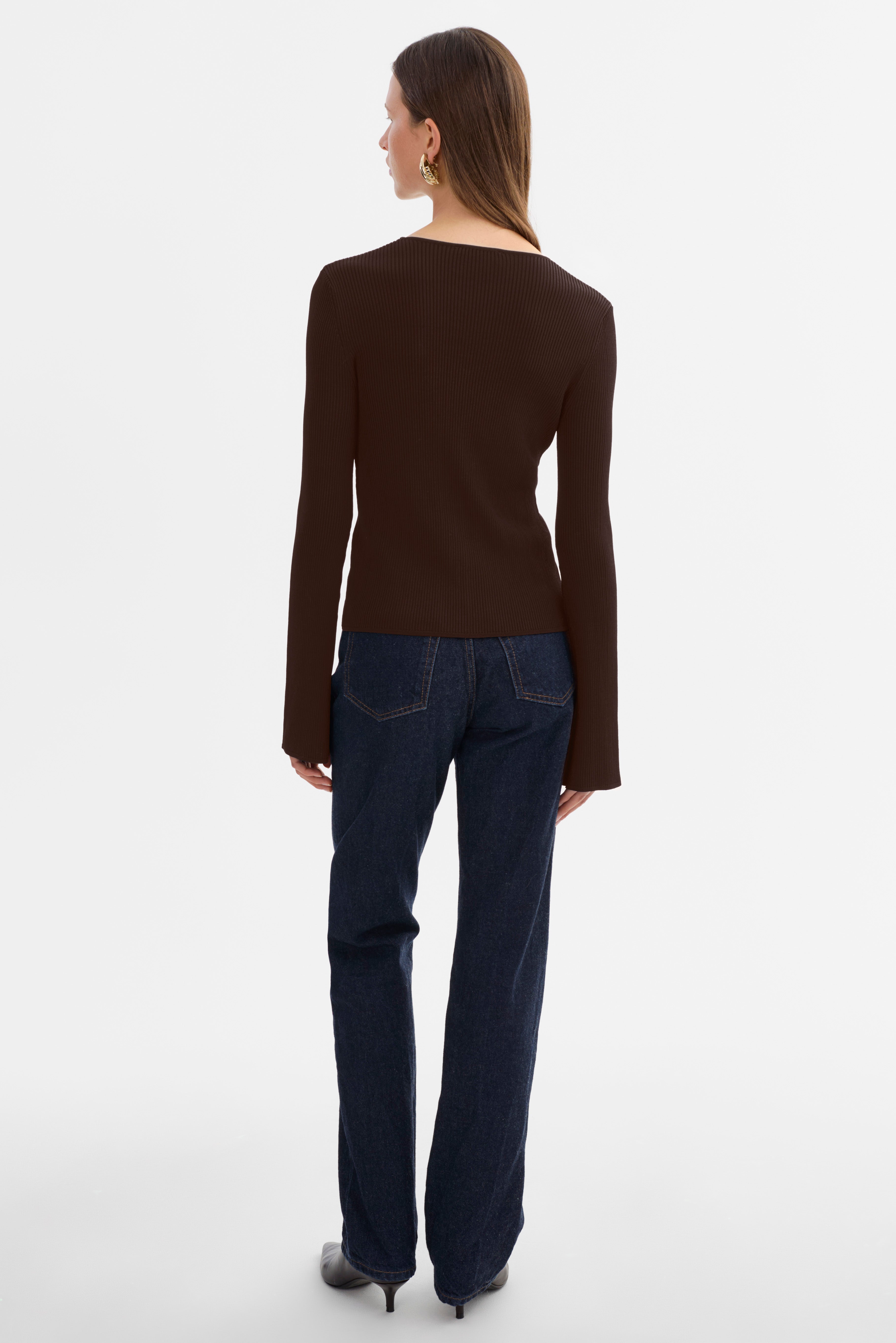 A bold twist on a classic silhouette. The ARACELLI Ribbed Knit Top is crafted from a stretch rib knit that flatters the body with a sleek, form-fitting shape. The deep V neckline meets a sharp front slit for an unexpected edge, while elongated sleeves add a refined finish. It's the kind of piece that turns minimalism into a statement.