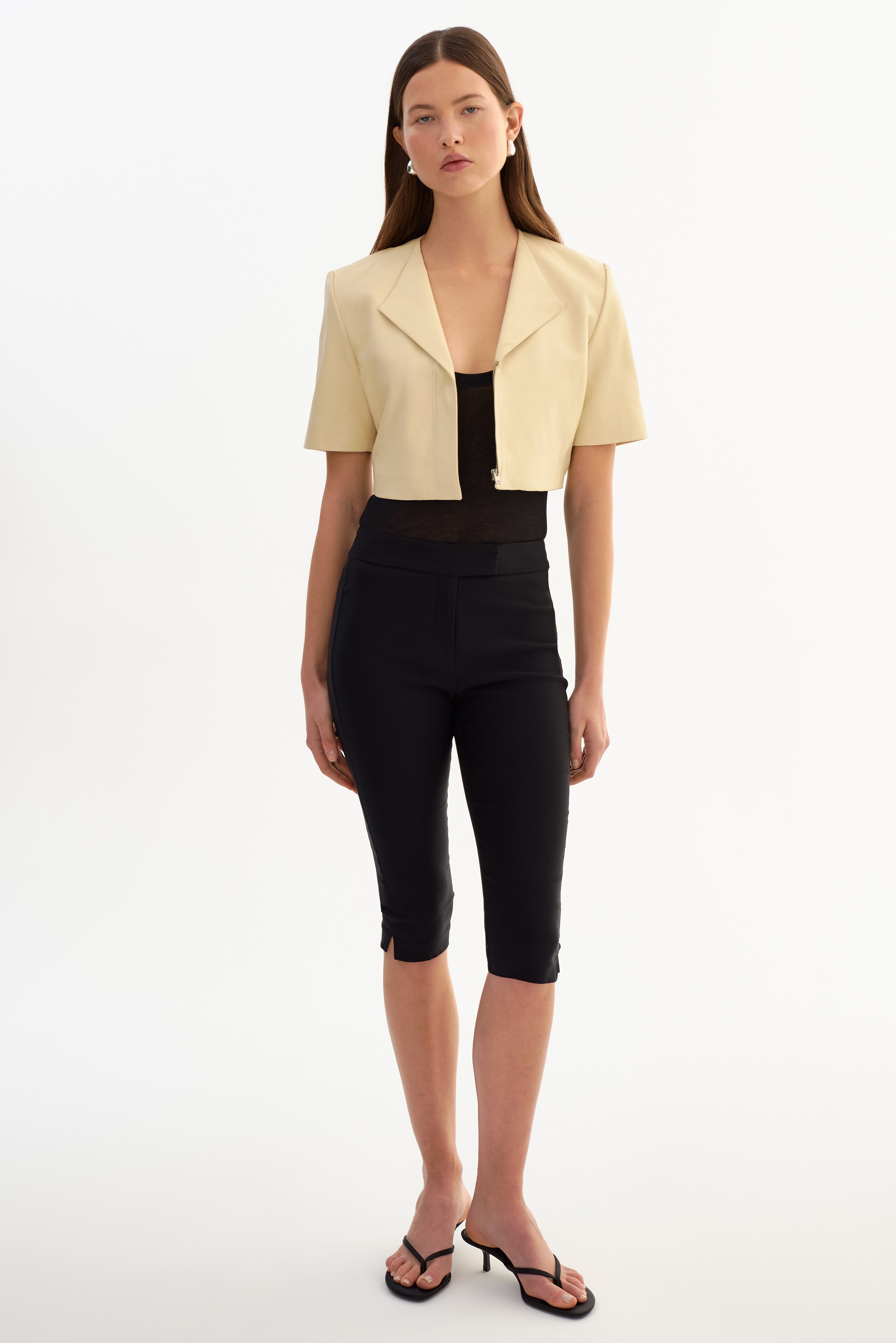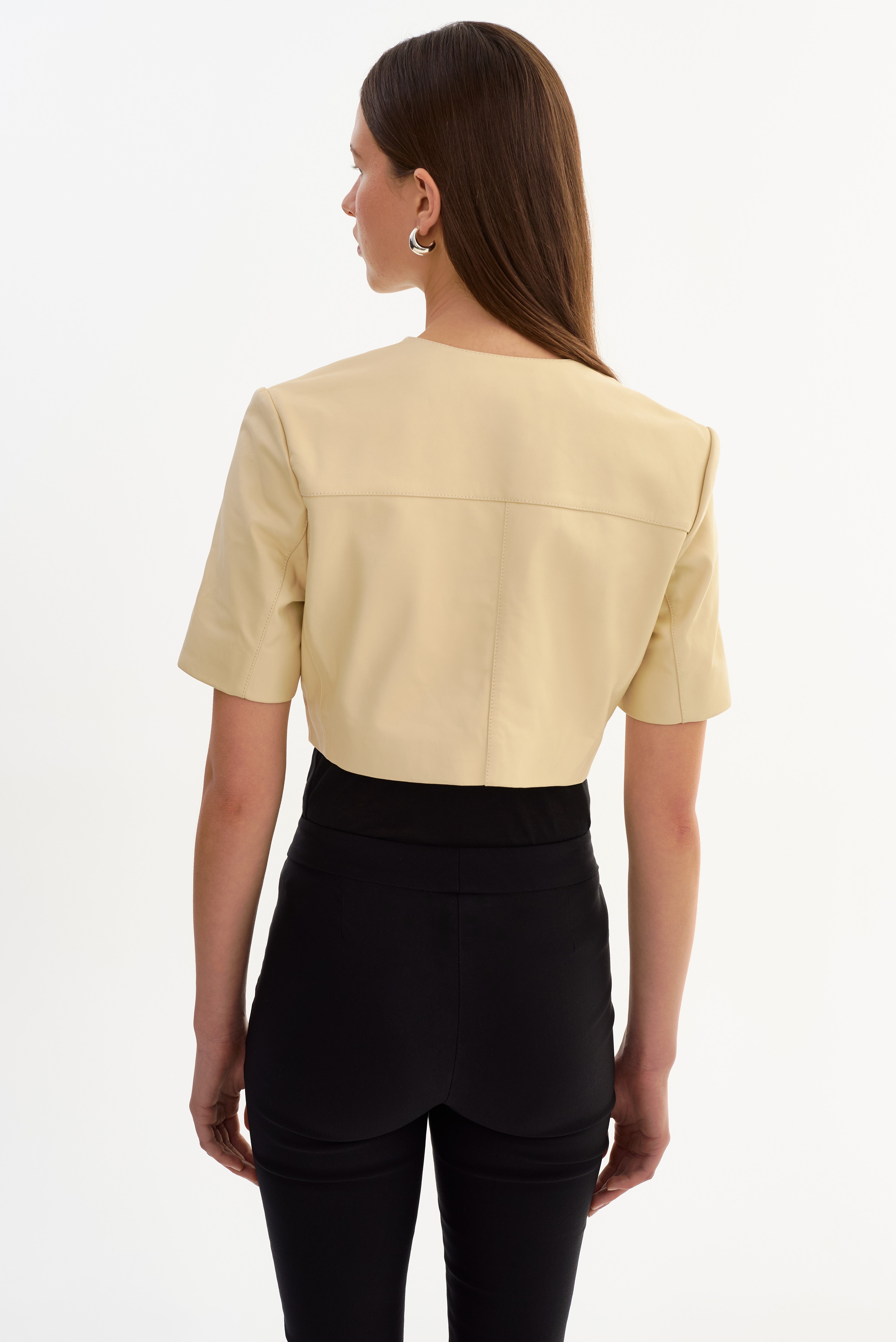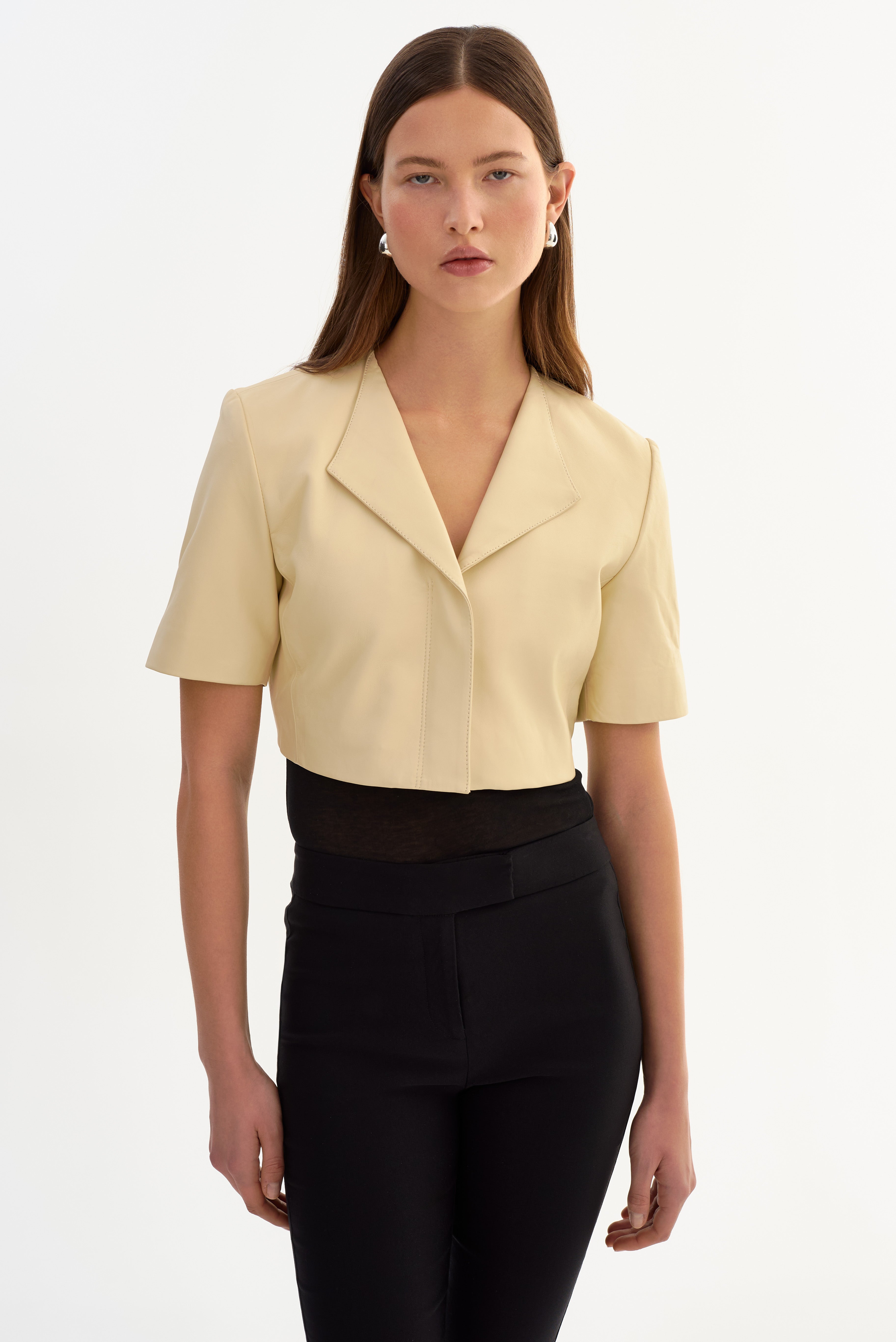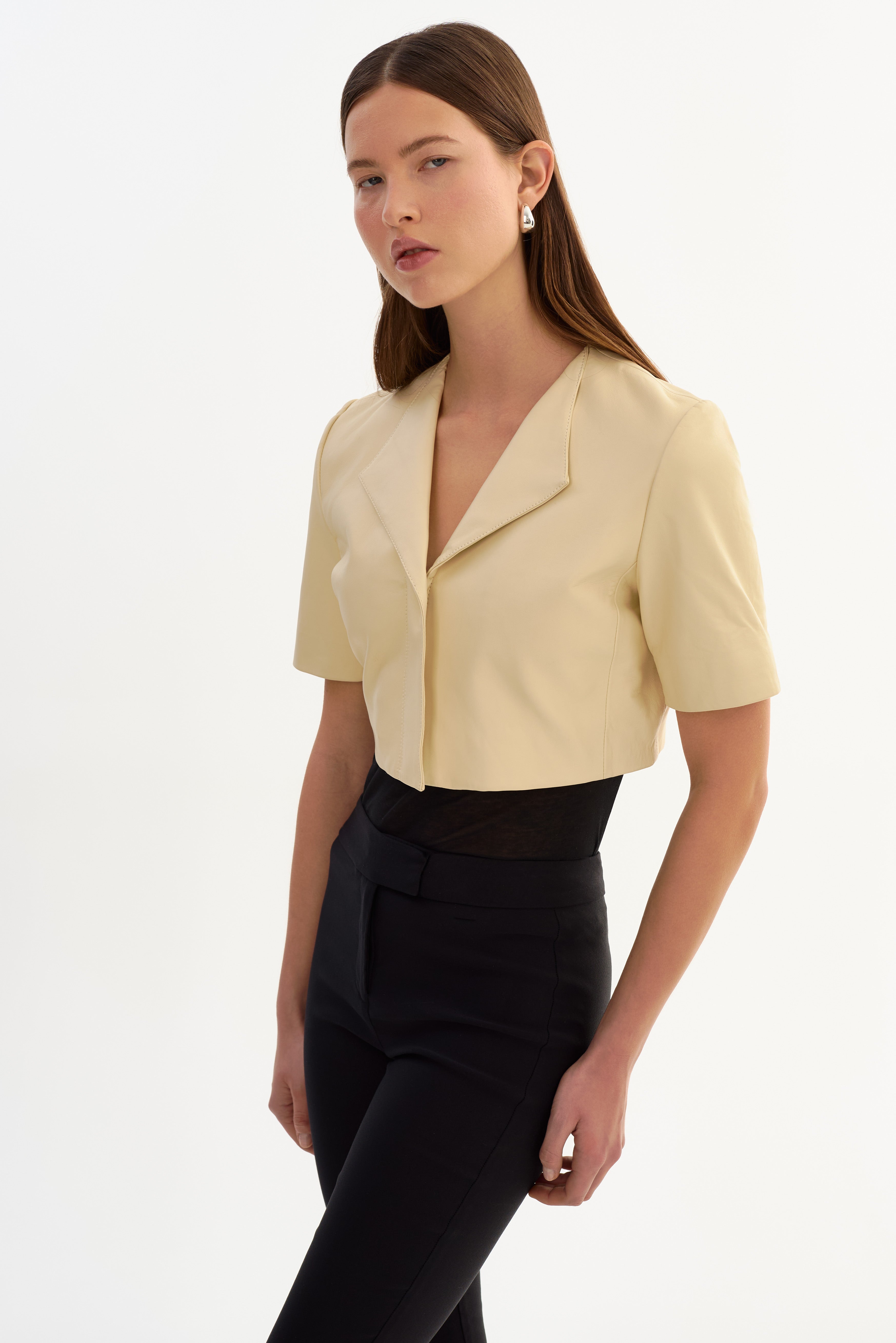 The AVIANA Collarless Leather Jacket offers a relaxed, modern take on leather outerwear. Designed with a collarless neckline and an easy, boxy fit, it feels effortless yet intentional. Short sleeves and an open lapel give it a lighter feel, making it an ideal layering piece for warmer days or transitional styling.