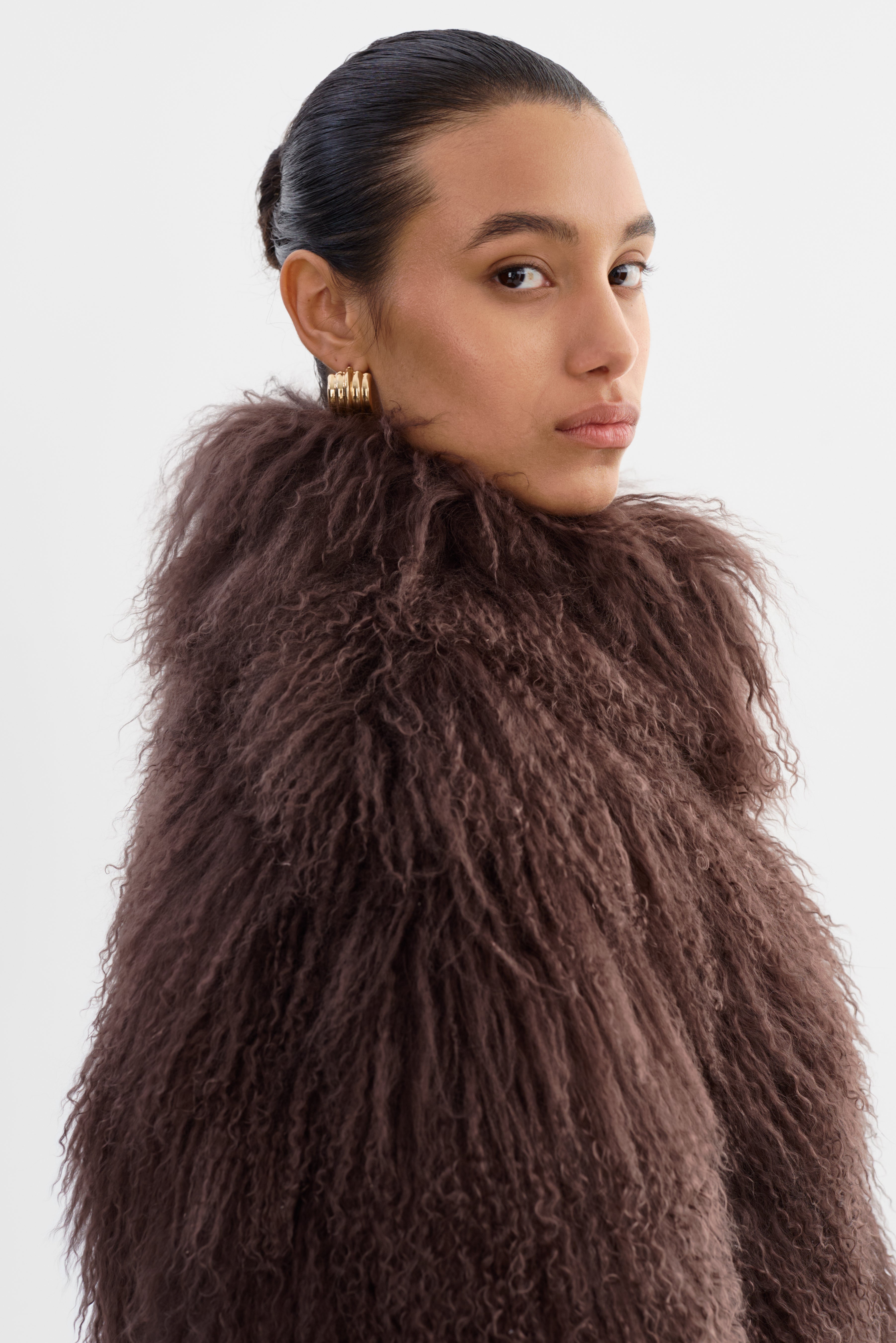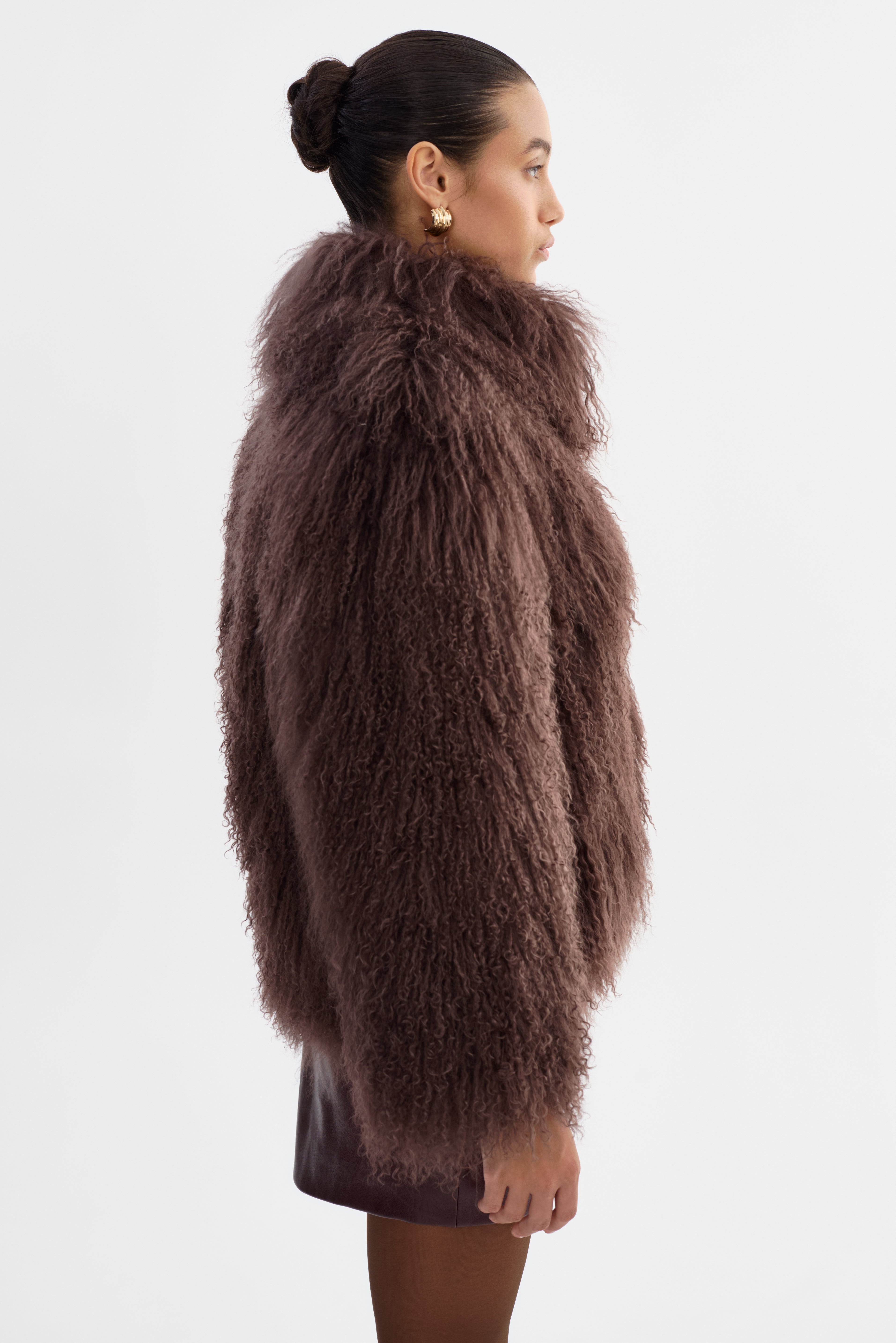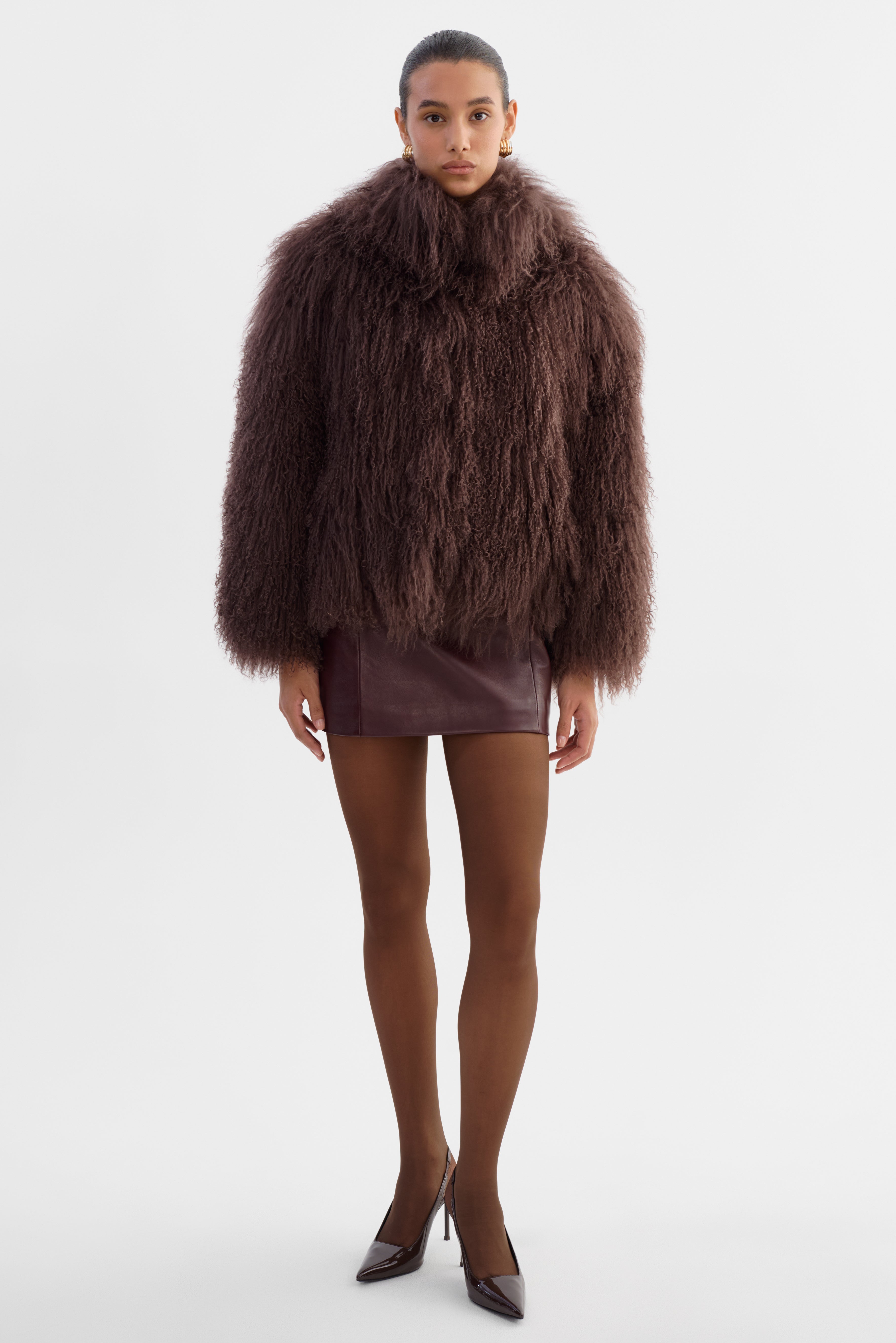 The BIANCA Mongolian Sheep Fur Jacket brings bold texture with its plush Mongolian shearling and relaxed fit. Featuring a mock neck collar, side front seam pockets, and a subtle hi-low hem, this jacket offers both warmth and elevated edge. Finished with front hook-and-eye closures, it makes a striking layer for statement dressing.