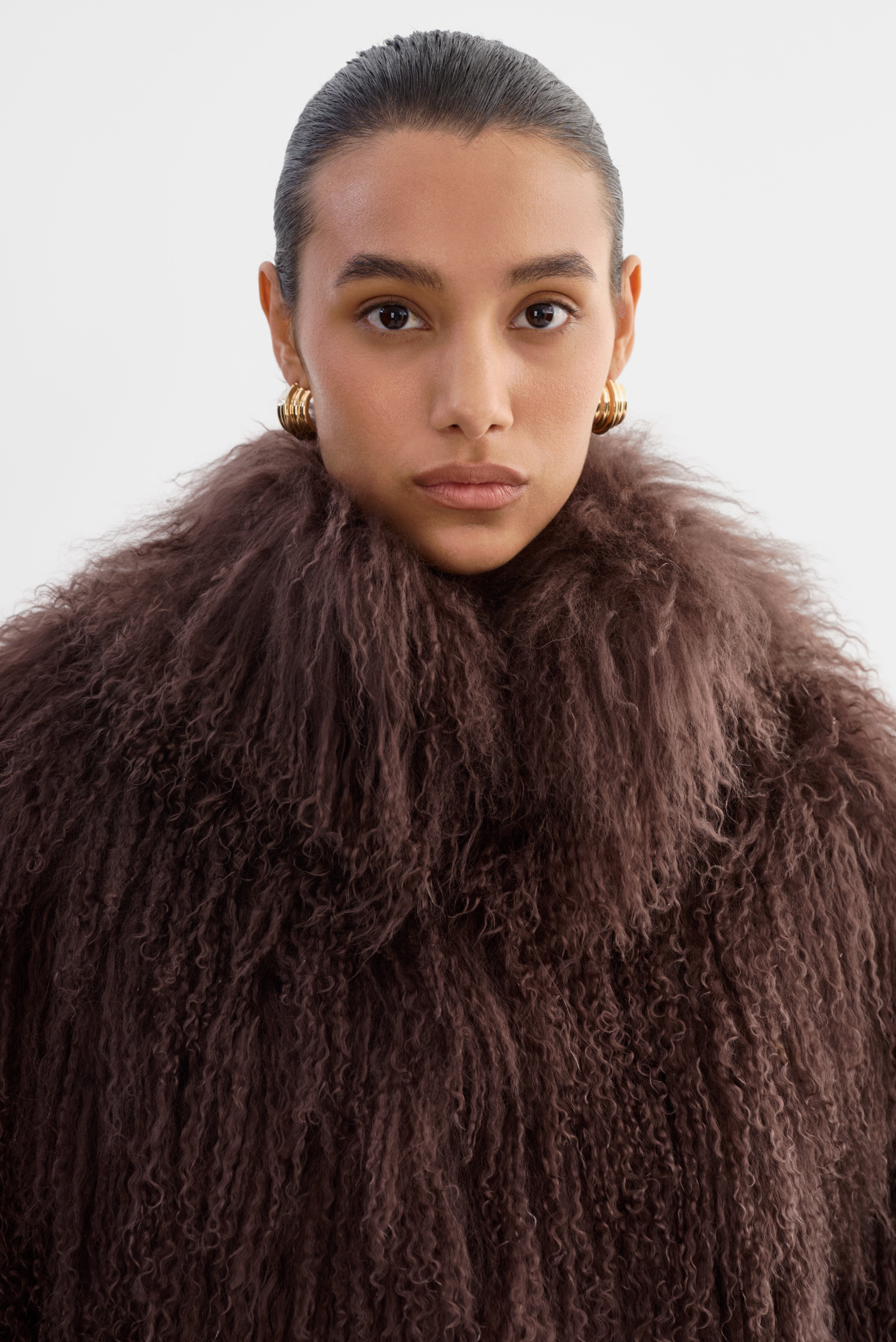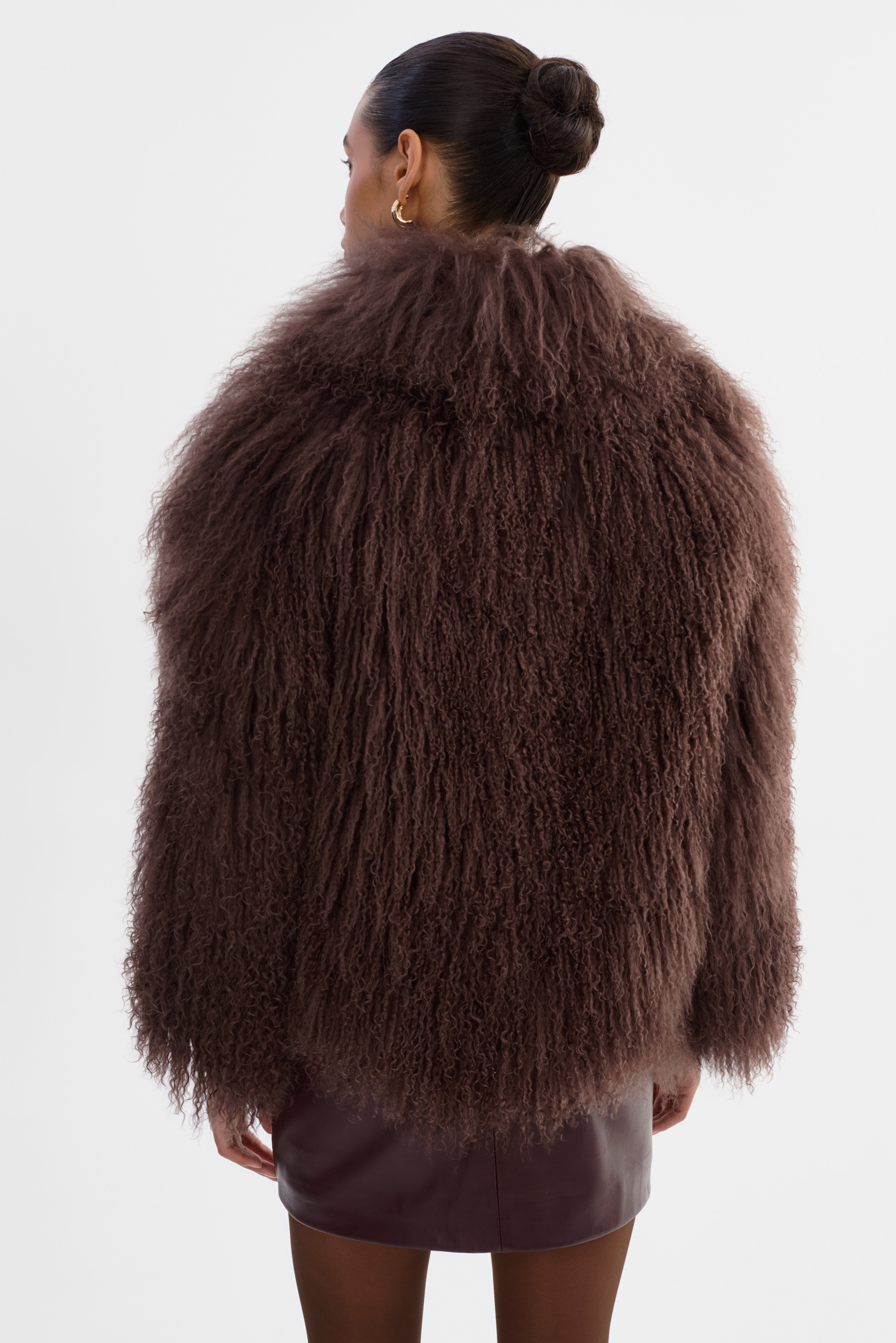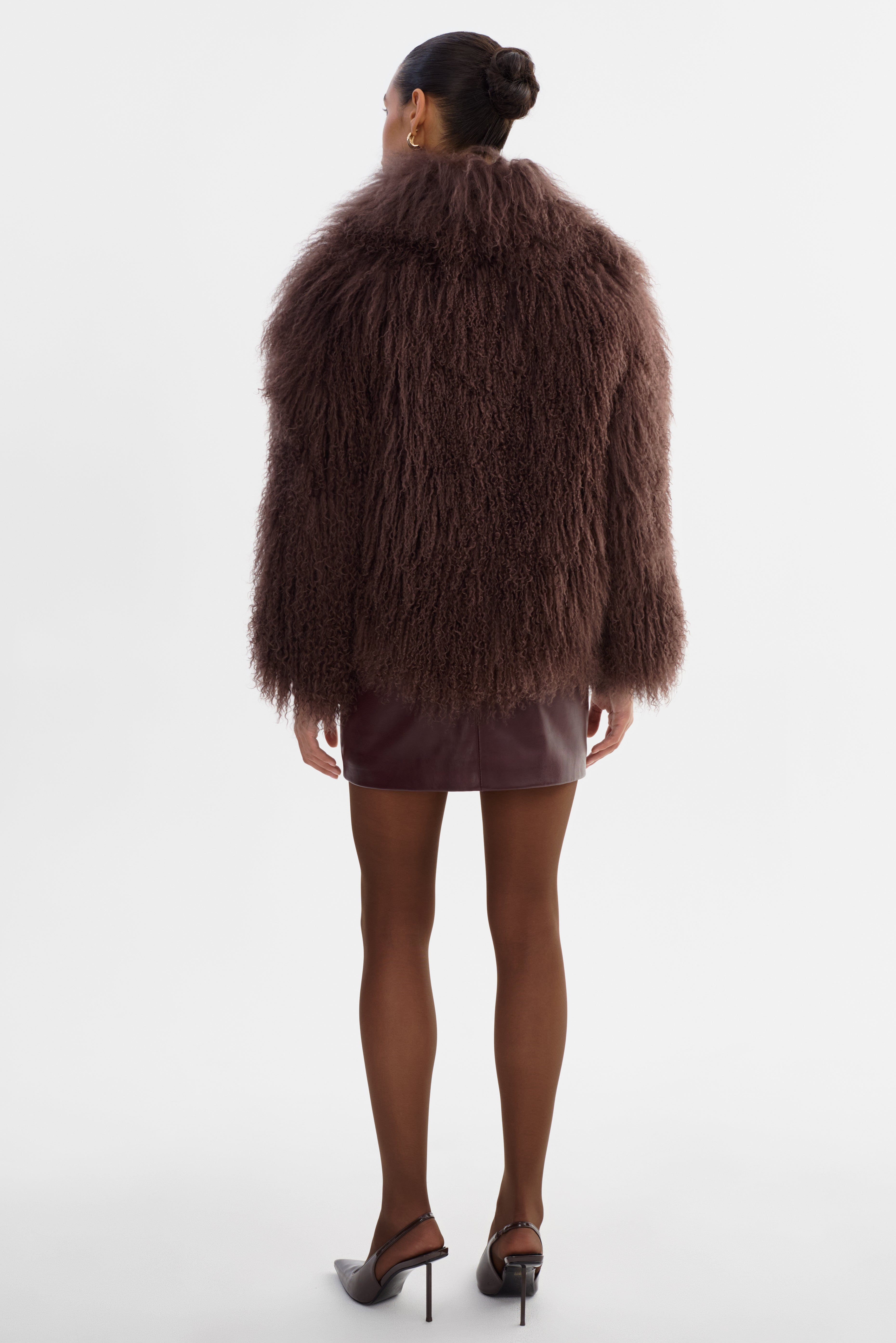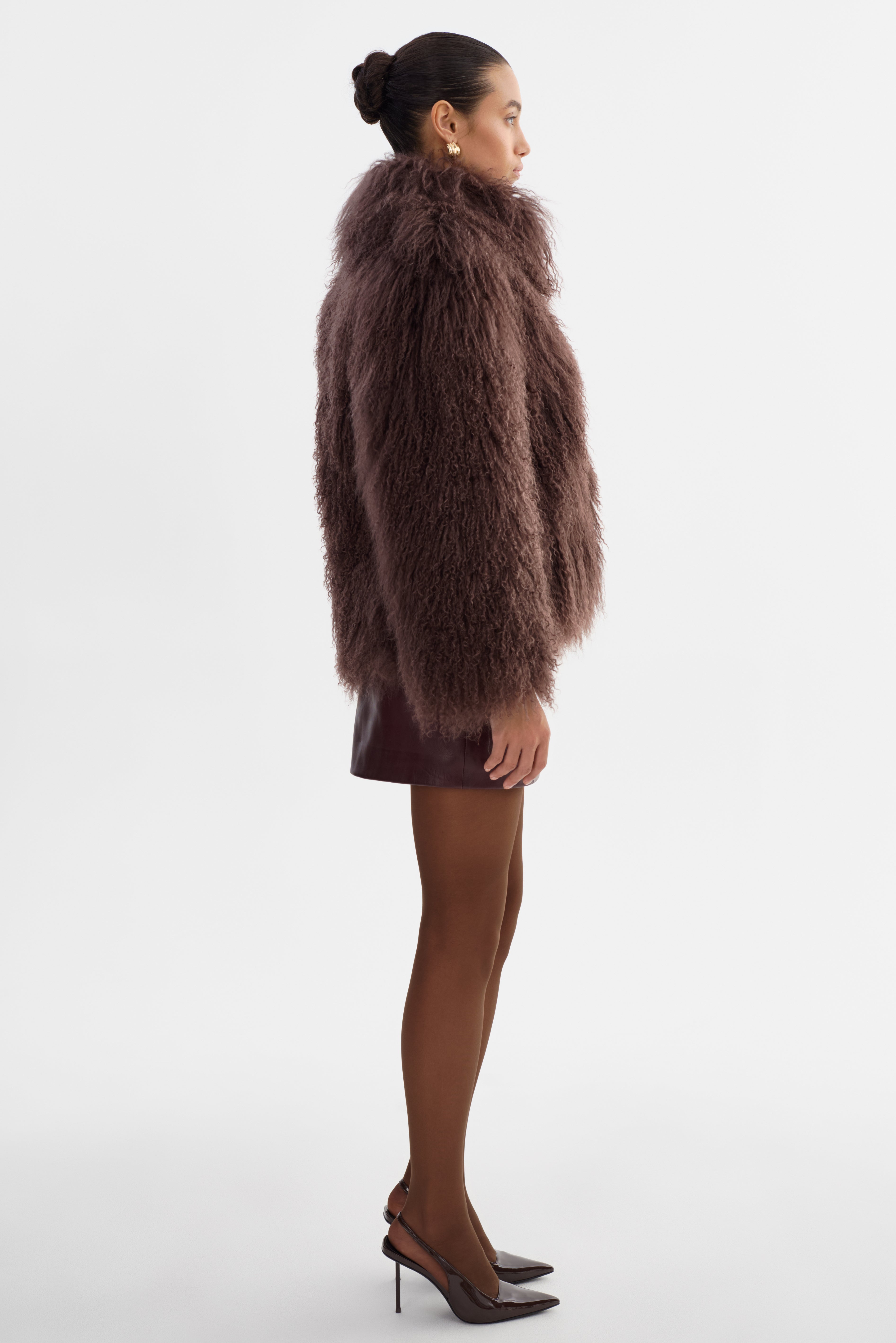The BIANCA Mongolian Sheep Fur Jacket brings bold texture with its plush Mongolian shearling and relaxed fit. Featuring a mock neck collar, side front seam pockets, and a subtle hi-low hem, this jacket offers both warmth and elevated edge. Finished with front hook-and-eye closures, it makes a striking layer for statement dressing.