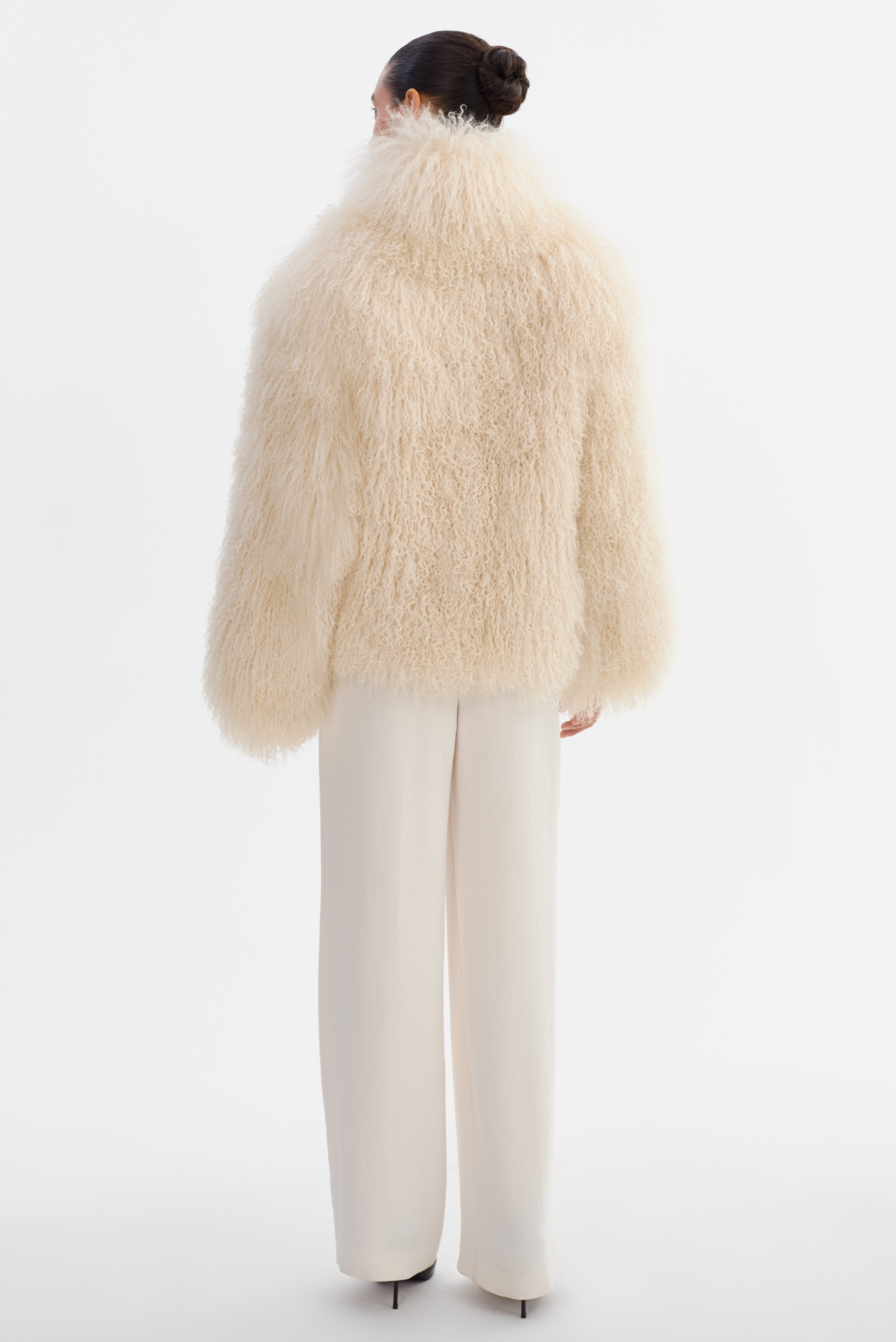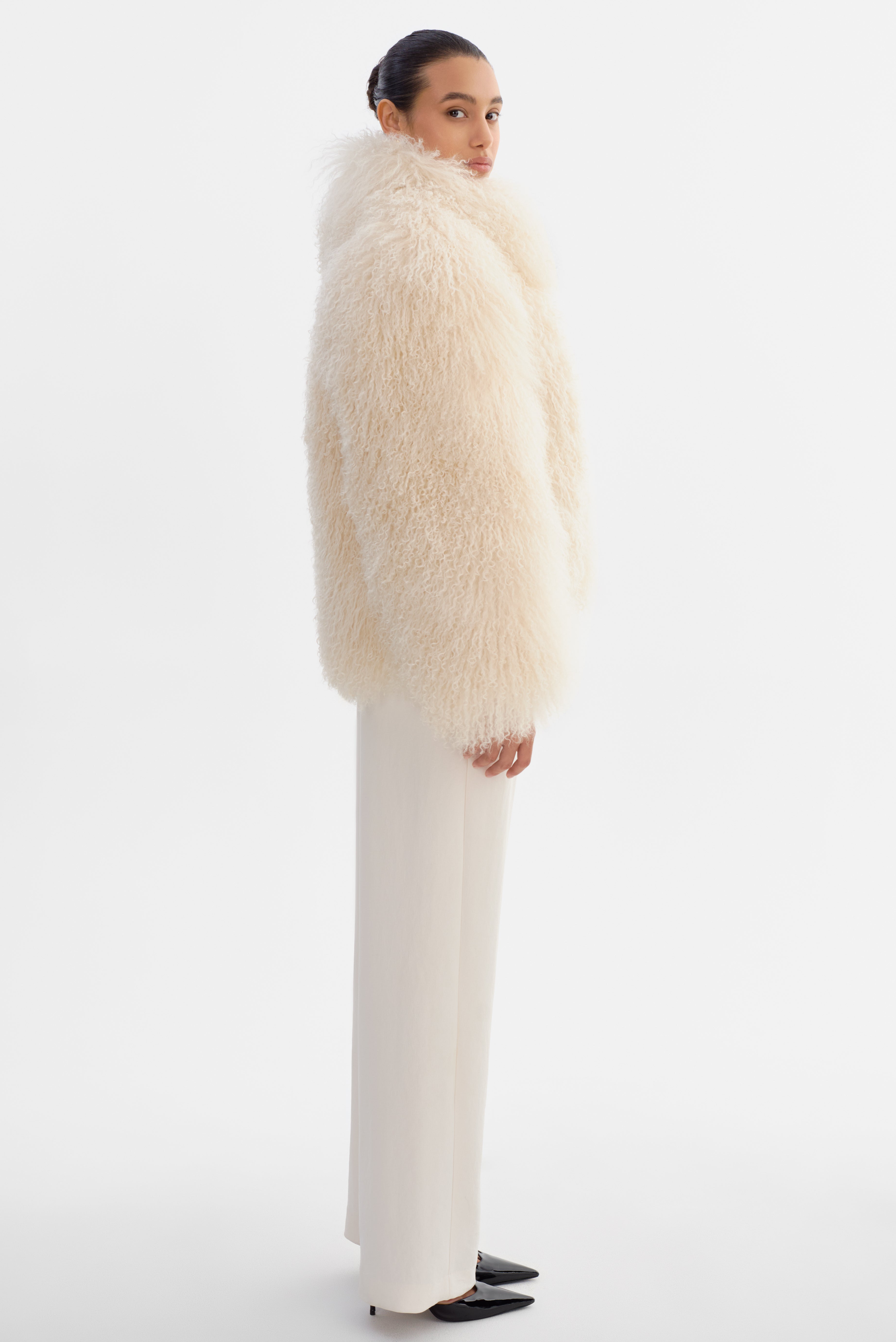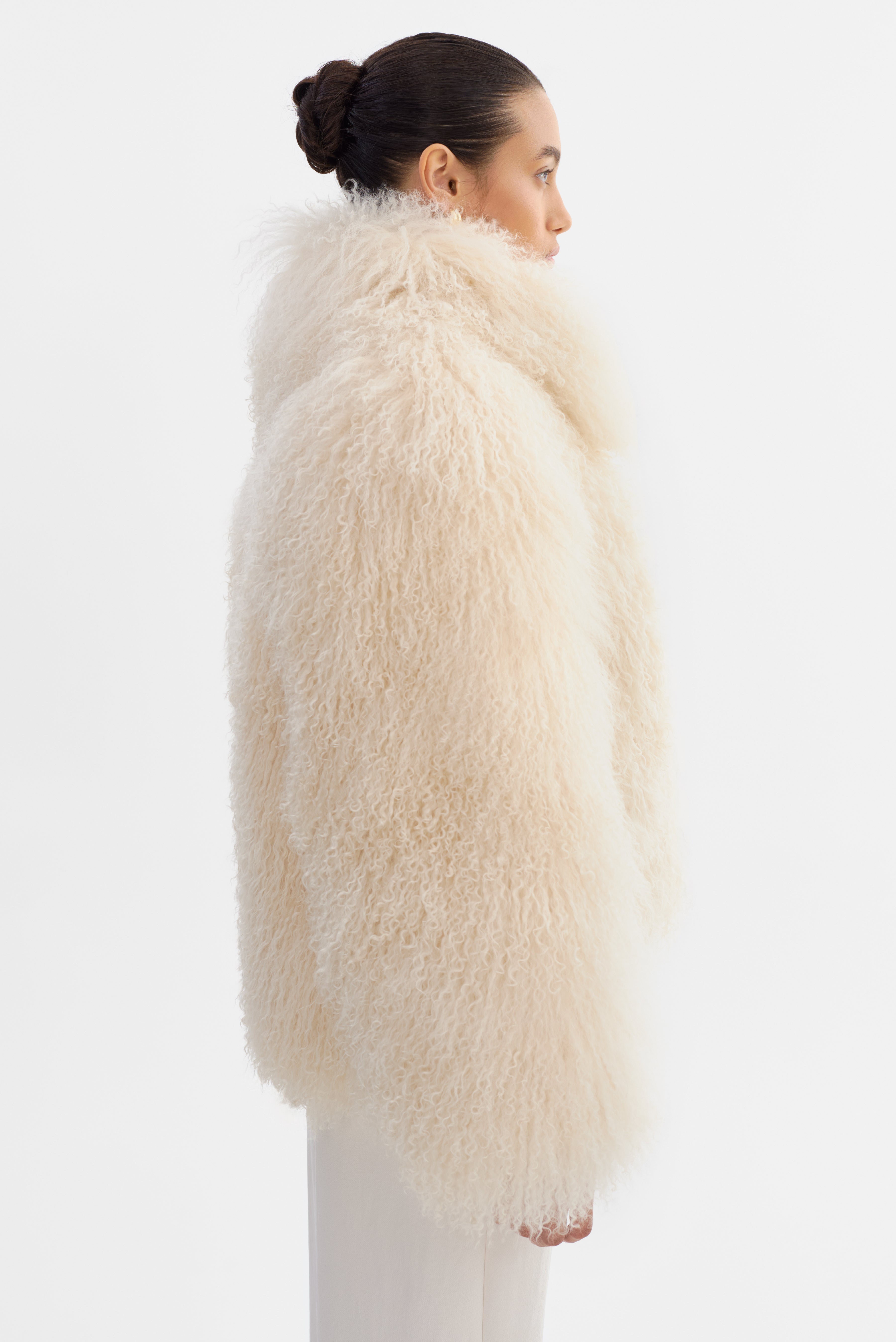 The BIANCA Mongolian Sheep Fur Jacket brings bold texture with its plush Mongolian shearling and relaxed fit. Featuring a mock neck collar, side front seam pockets, and a subtle hi-low hem, this jacket offers both warmth and elevated edge. Finished with front hook-and-eye closures, it makes a striking layer for statement dressing.