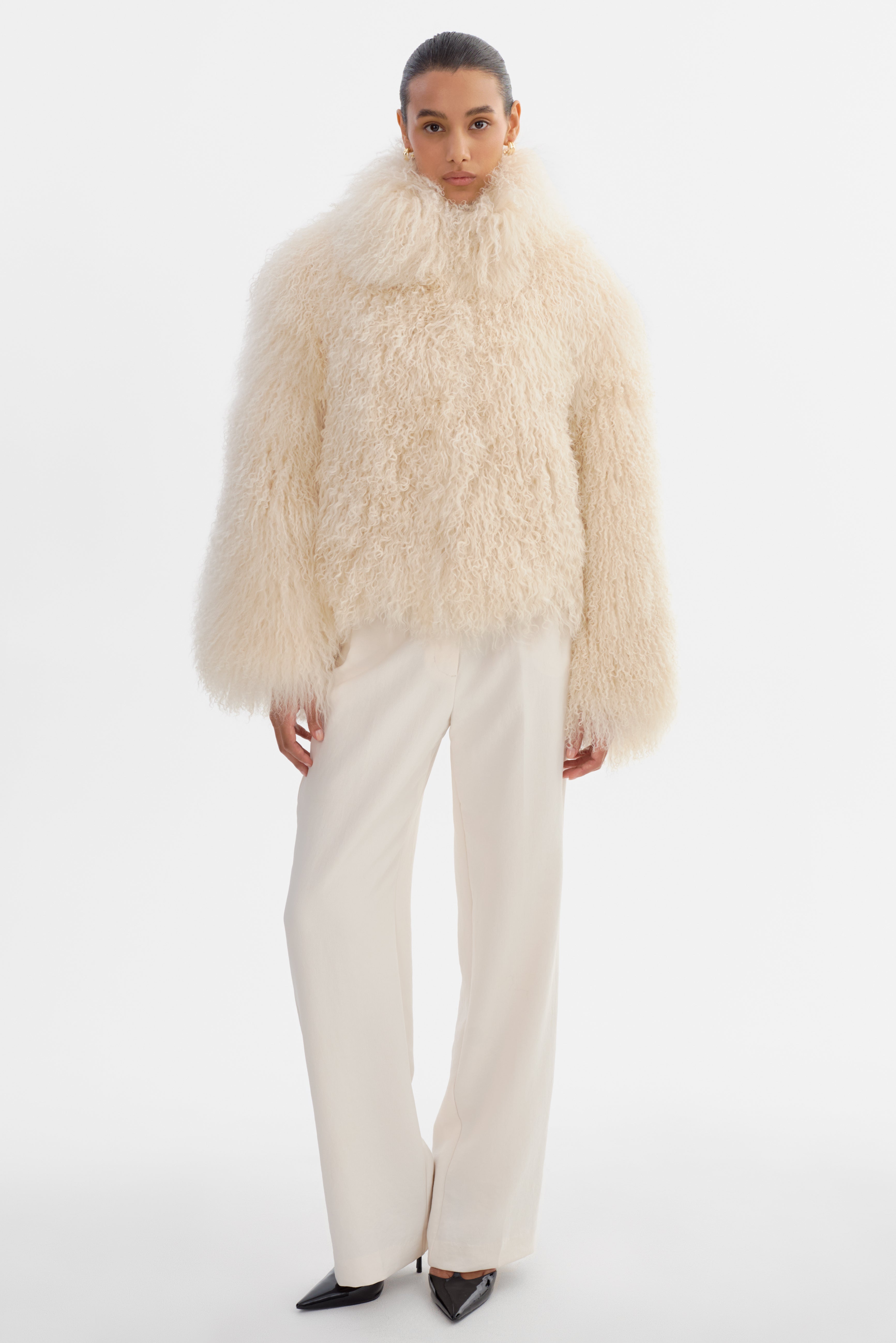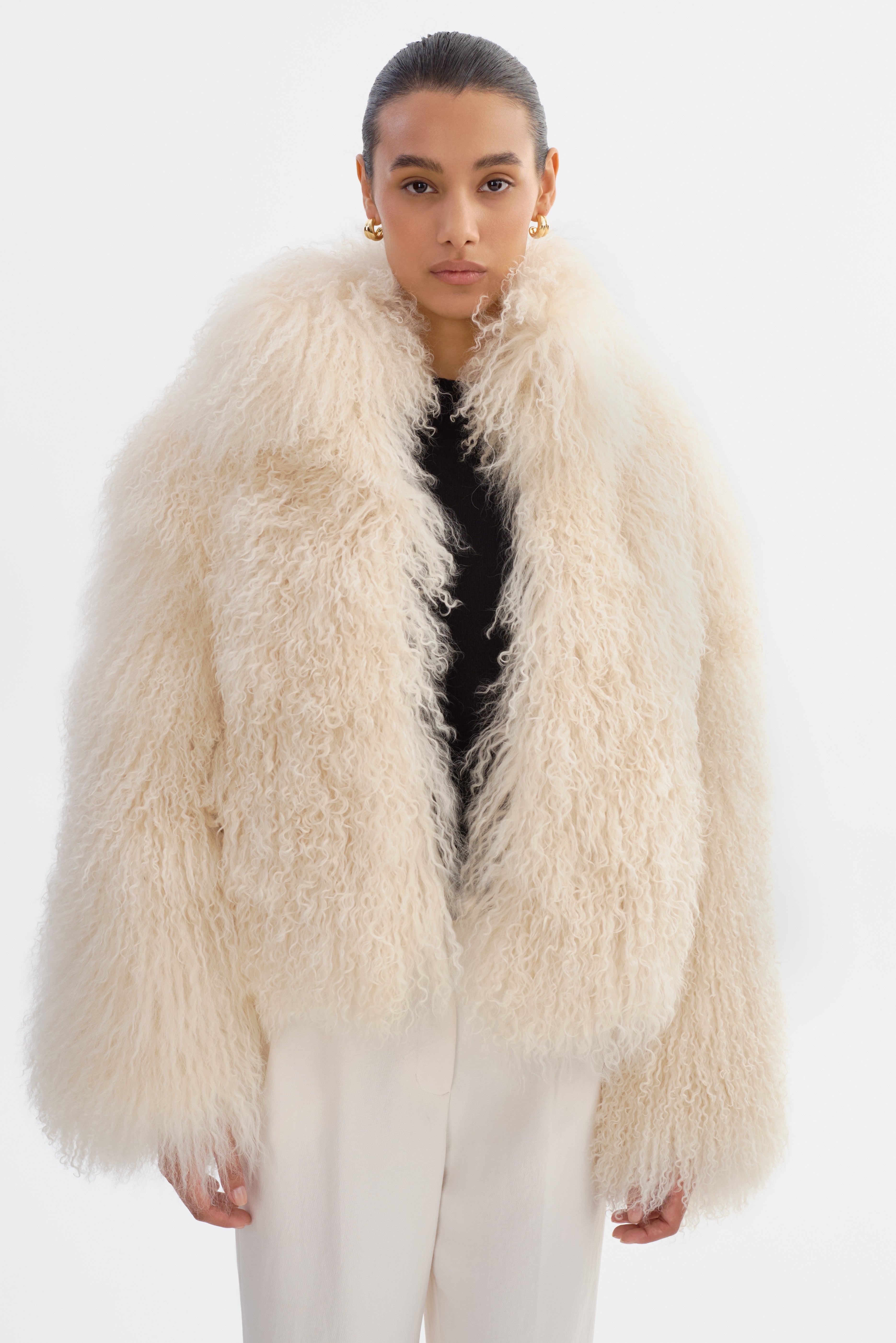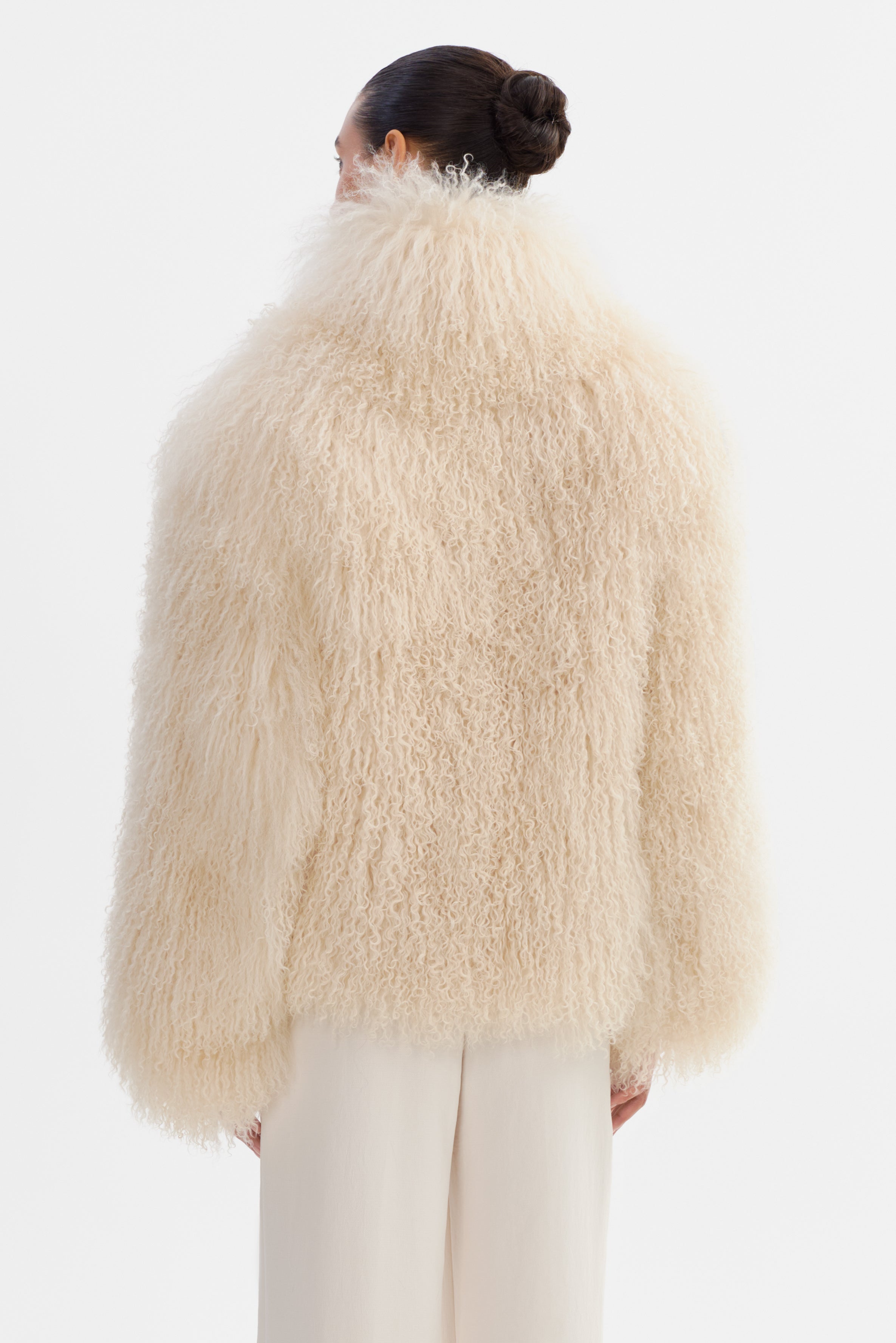 The BIANCA Mongolian Sheep Fur Jacket brings bold texture with its plush Mongolian shearling and relaxed fit. Featuring a mock neck collar, side front seam pockets, and a subtle hi-low hem, this jacket offers both warmth and elevated edge. Finished with front hook-and-eye closures, it makes a striking layer for statement dressing.