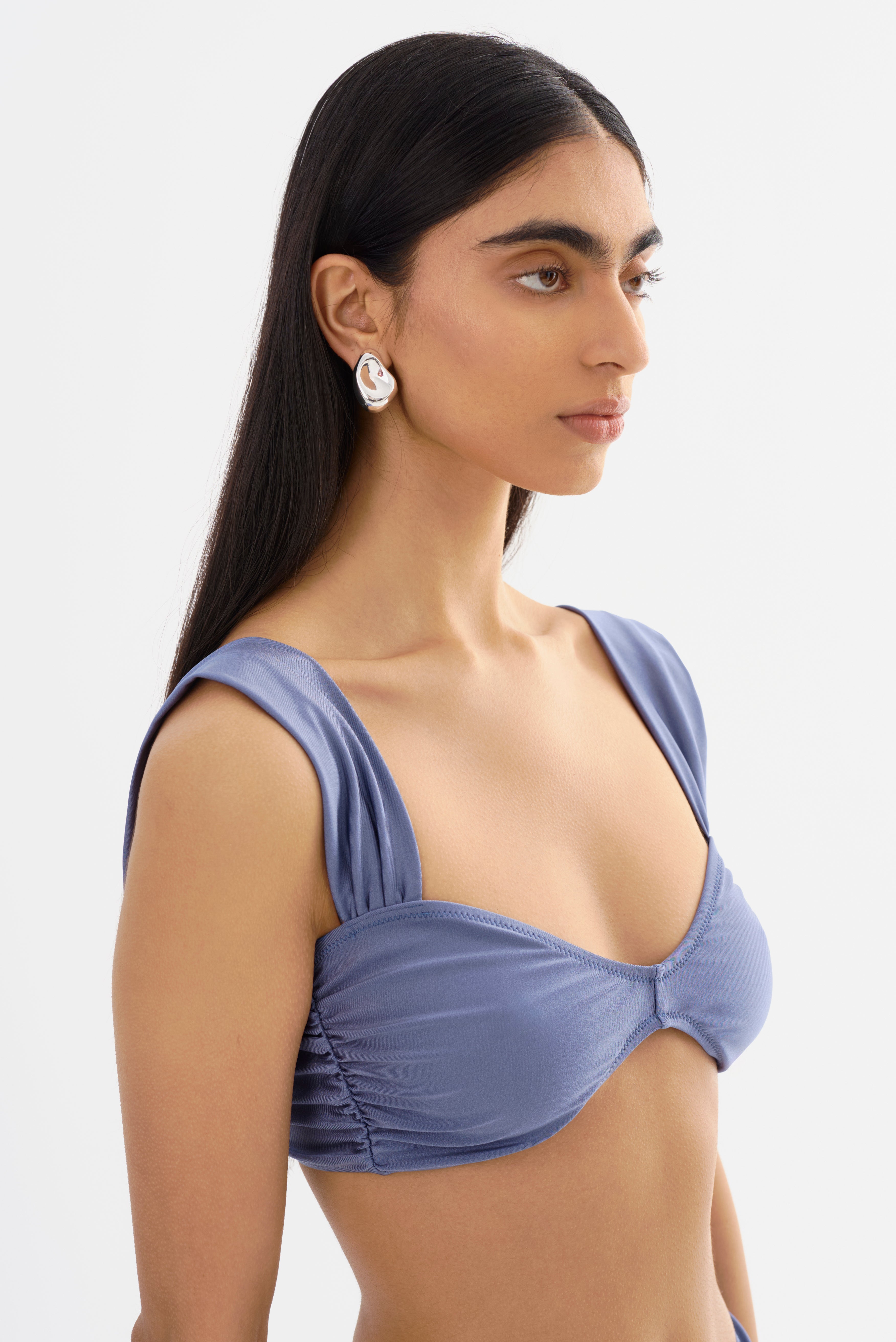 The CARINA Bikini Top is a glamorous take on the balconette silhouette. Crafted from shiny jersey fabric, this draped bikini top features ruched side seams with clear elastic for a sculpted fit. Double-layered fabric straps and a metallic hook closure add a refined touch, making it a standout swimwear piece.