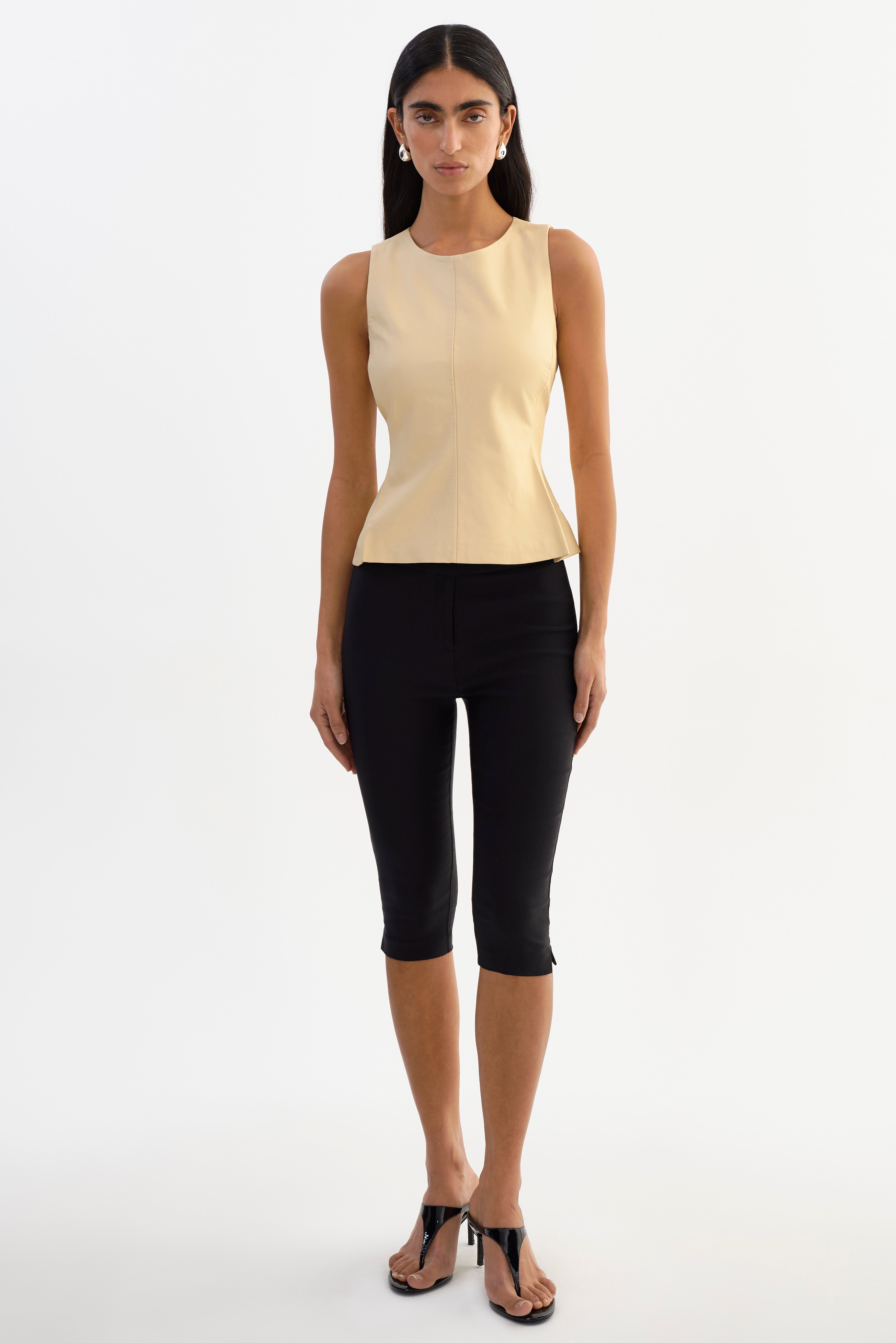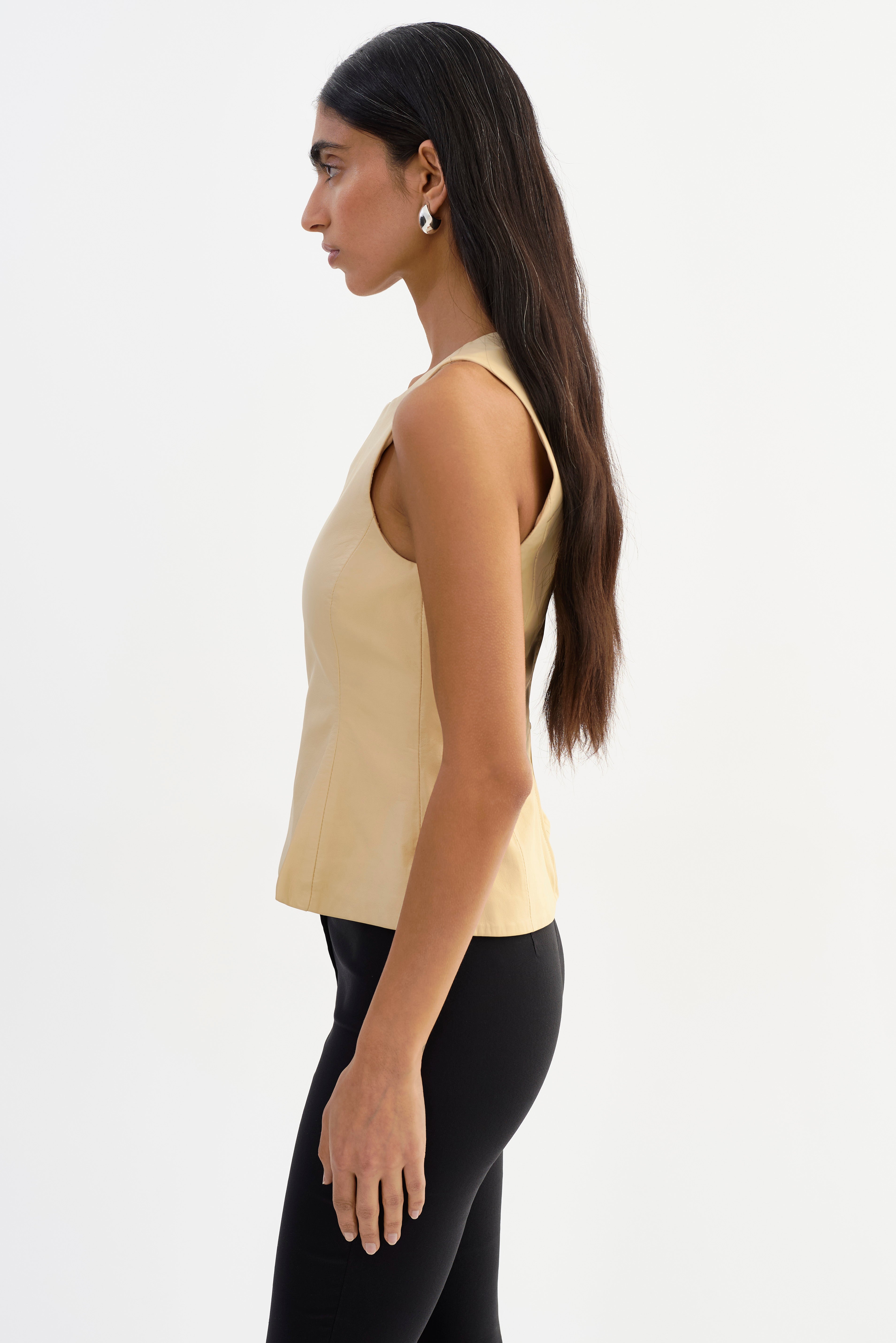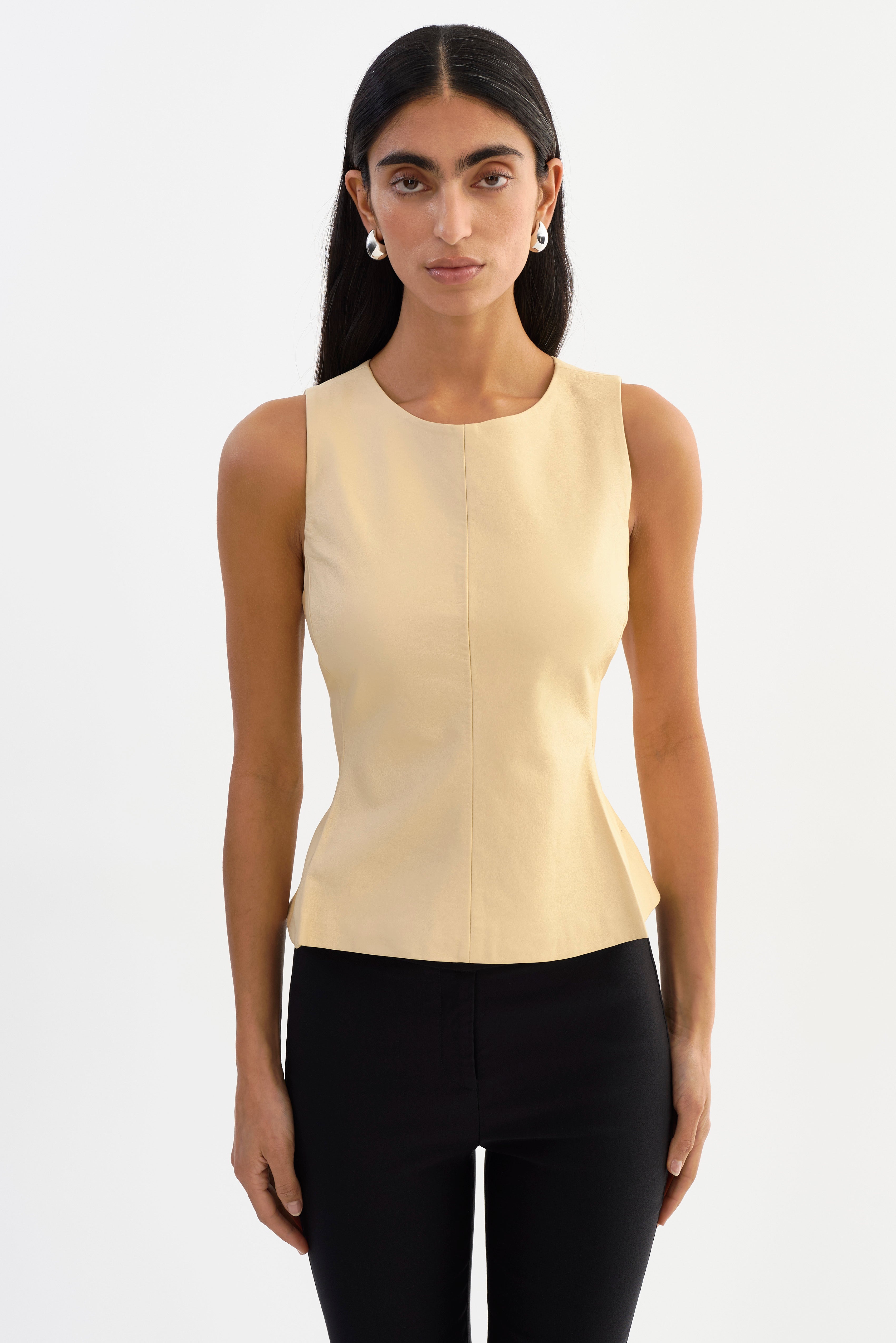 The BLAIR Leather Sleevless Peplum Top brings a refined, modern feel to leather dressing. Designed with a clean crew neckline and a softly flared peplum hem, it creates a flattering silhouette that feels polished without being overworked. Easy to style on its own or layered, it's a confident piece that transitions seamlessly from day to evening.