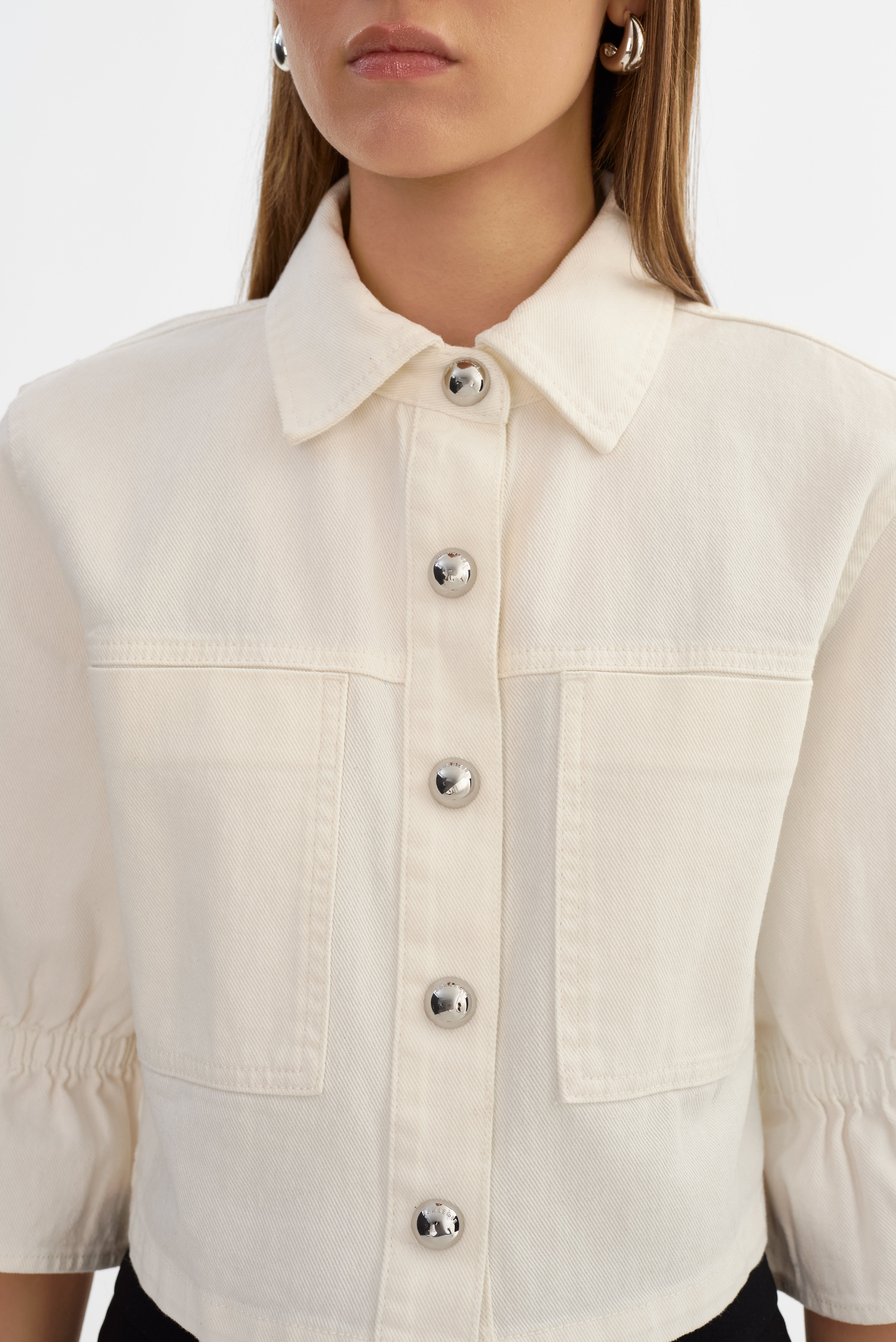The CAROLINA Denim Jacket is a feminine take on a classic. Designed with a relaxed fit, it features cropped ruffled sleeves, a snap-front closure, and oversized patch pockets for a modern utility feel. Unlined for effortless layering, it pairs perfectly with the SHANNON D Pants for a fresh interpretation of the Canadian tuxedo.