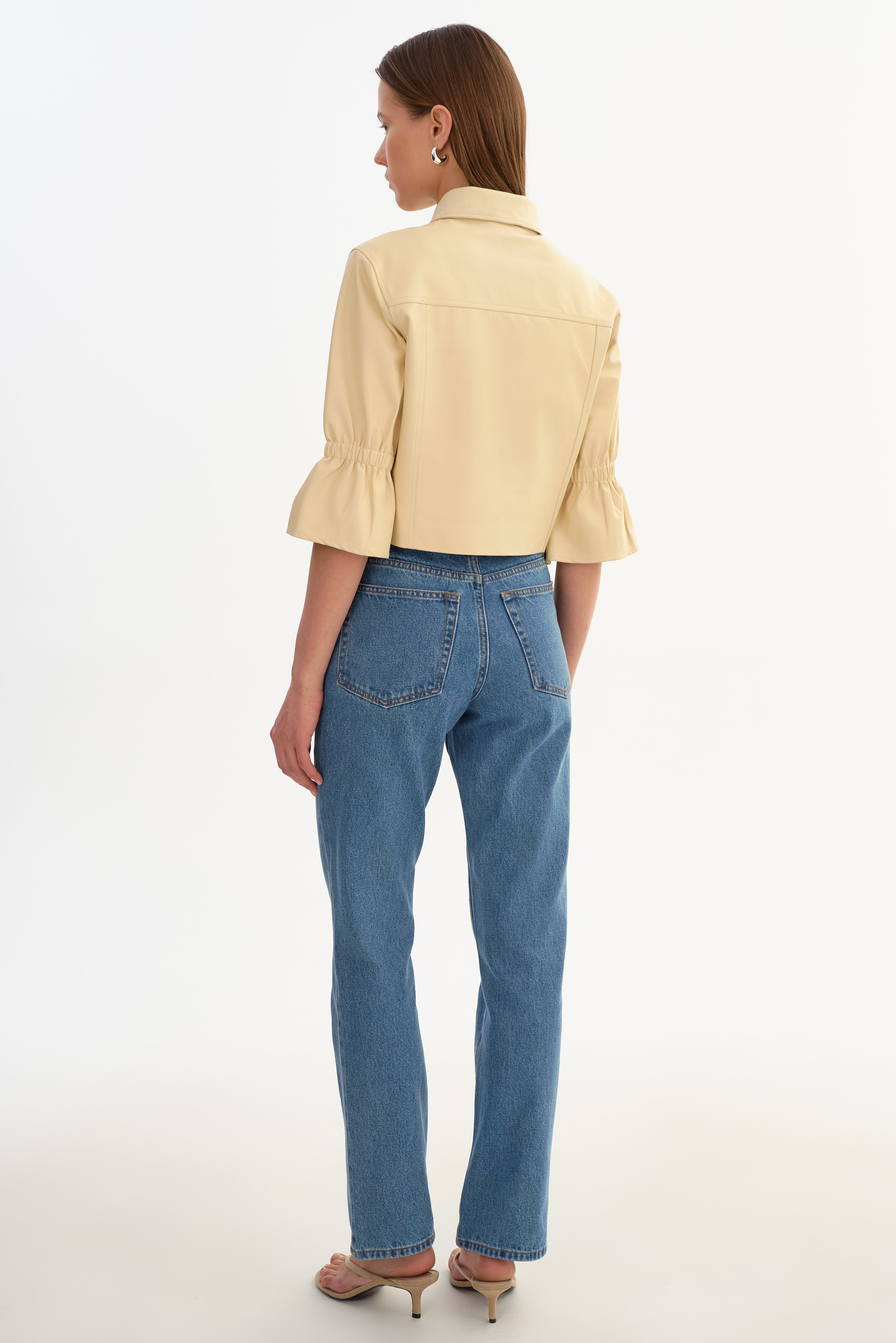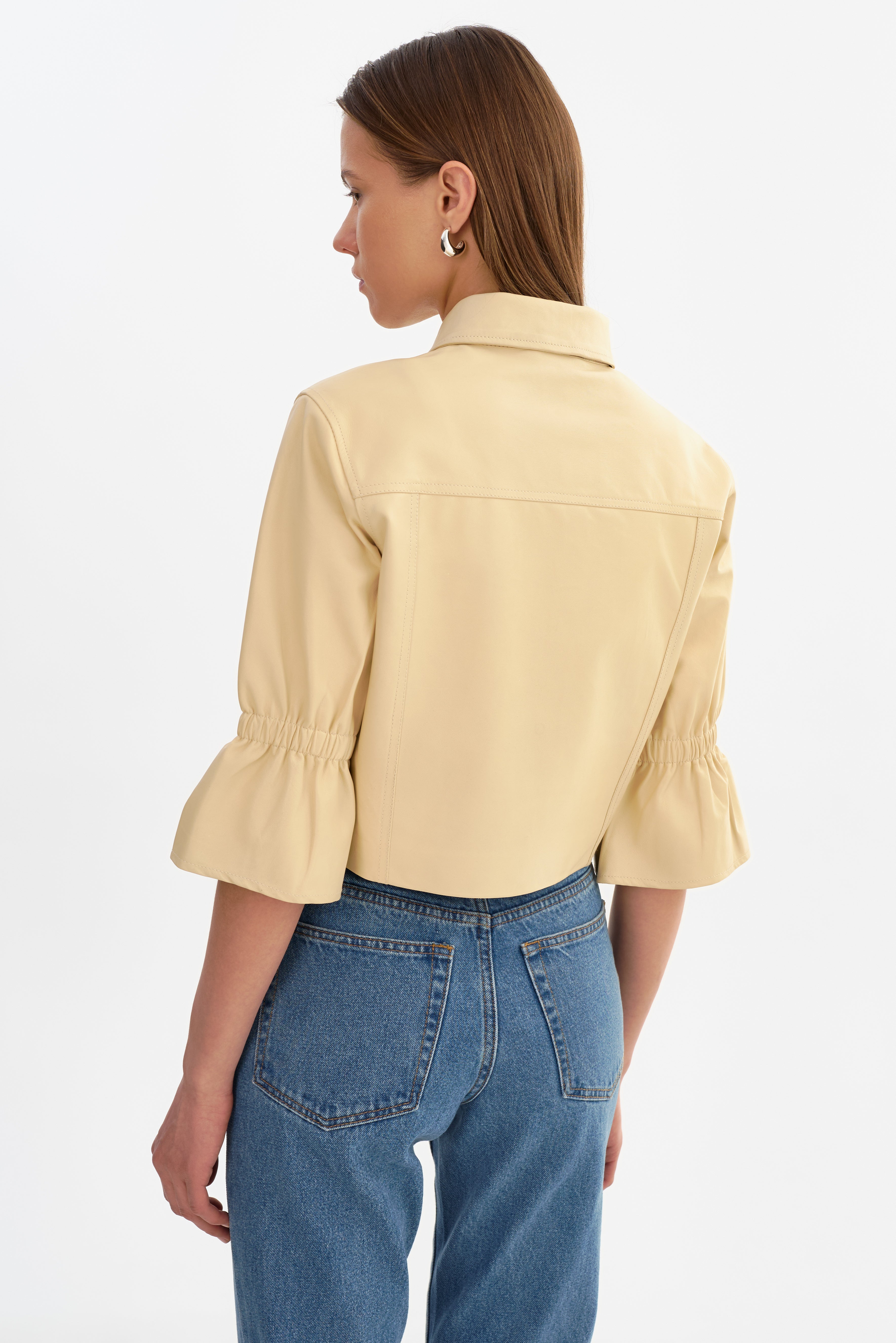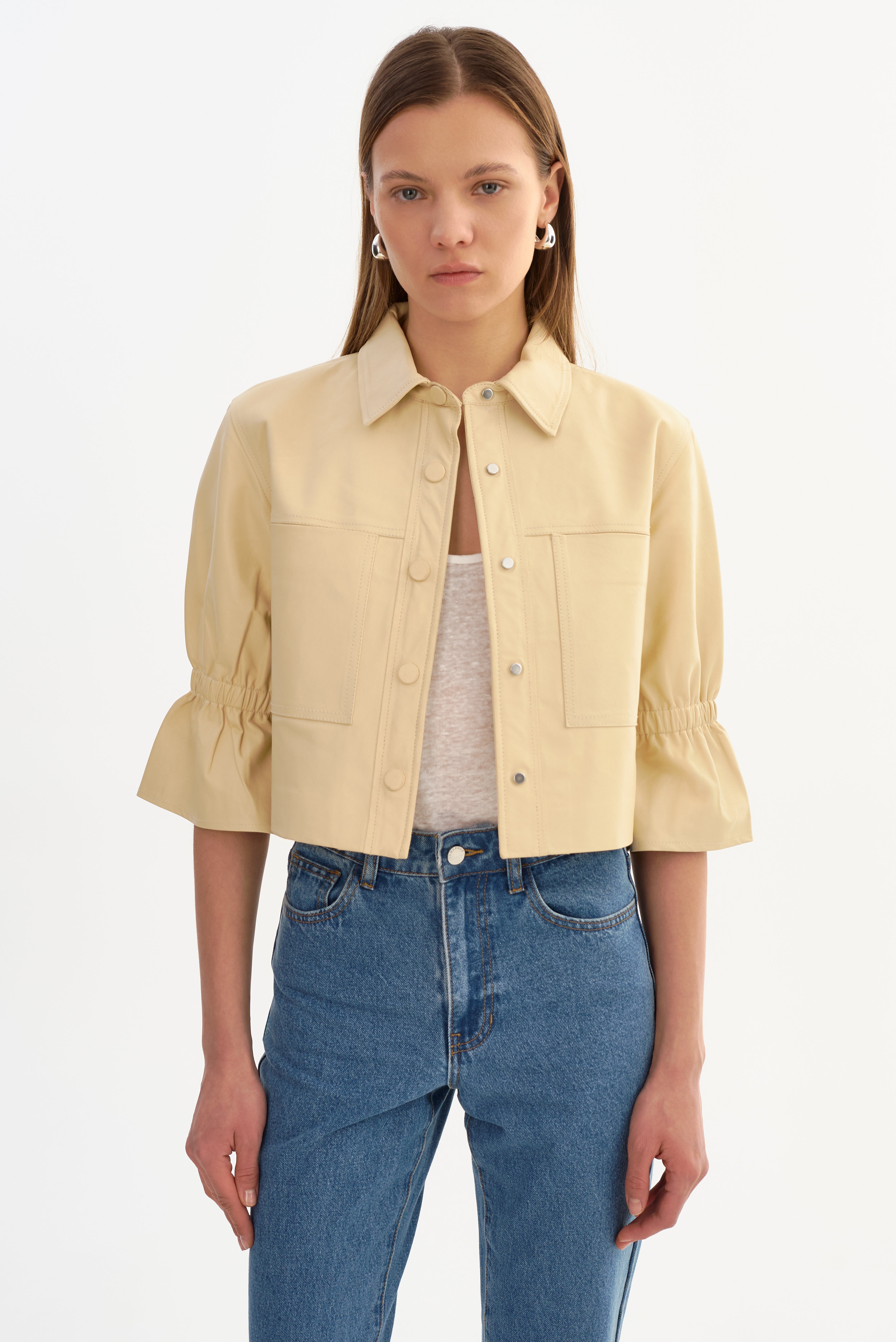 The CAROLINA Leather Ruffle Sleeve Jacket is a feminine twist on a classic shirt jacket. It features a cropped length and ruffled cropped sleeves for an unexpected playful silhouette. Pair it with jeans and a tee for a free-spirited off-duty look, or dress it up with the leather trousers and heels for a more sophisticated look.