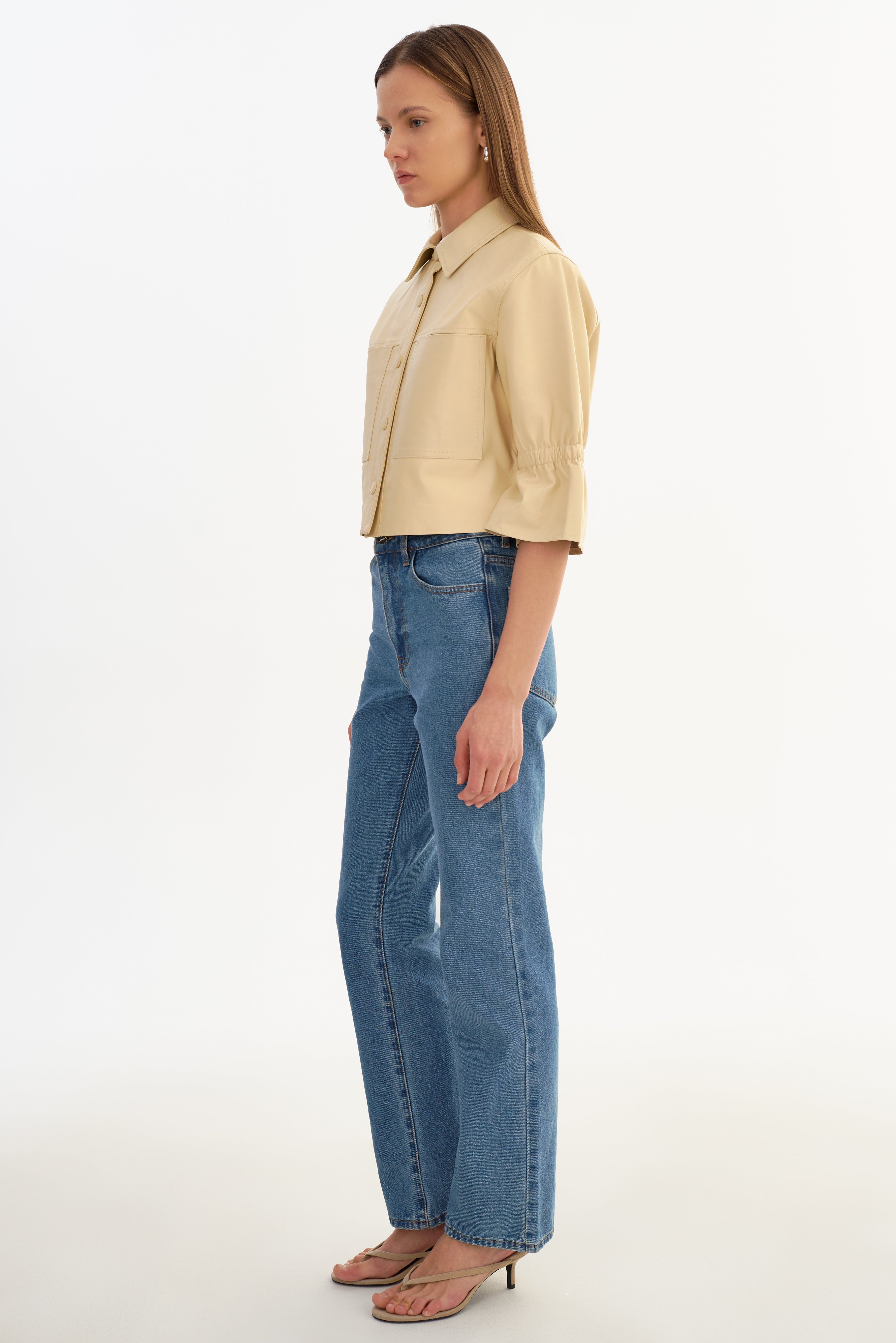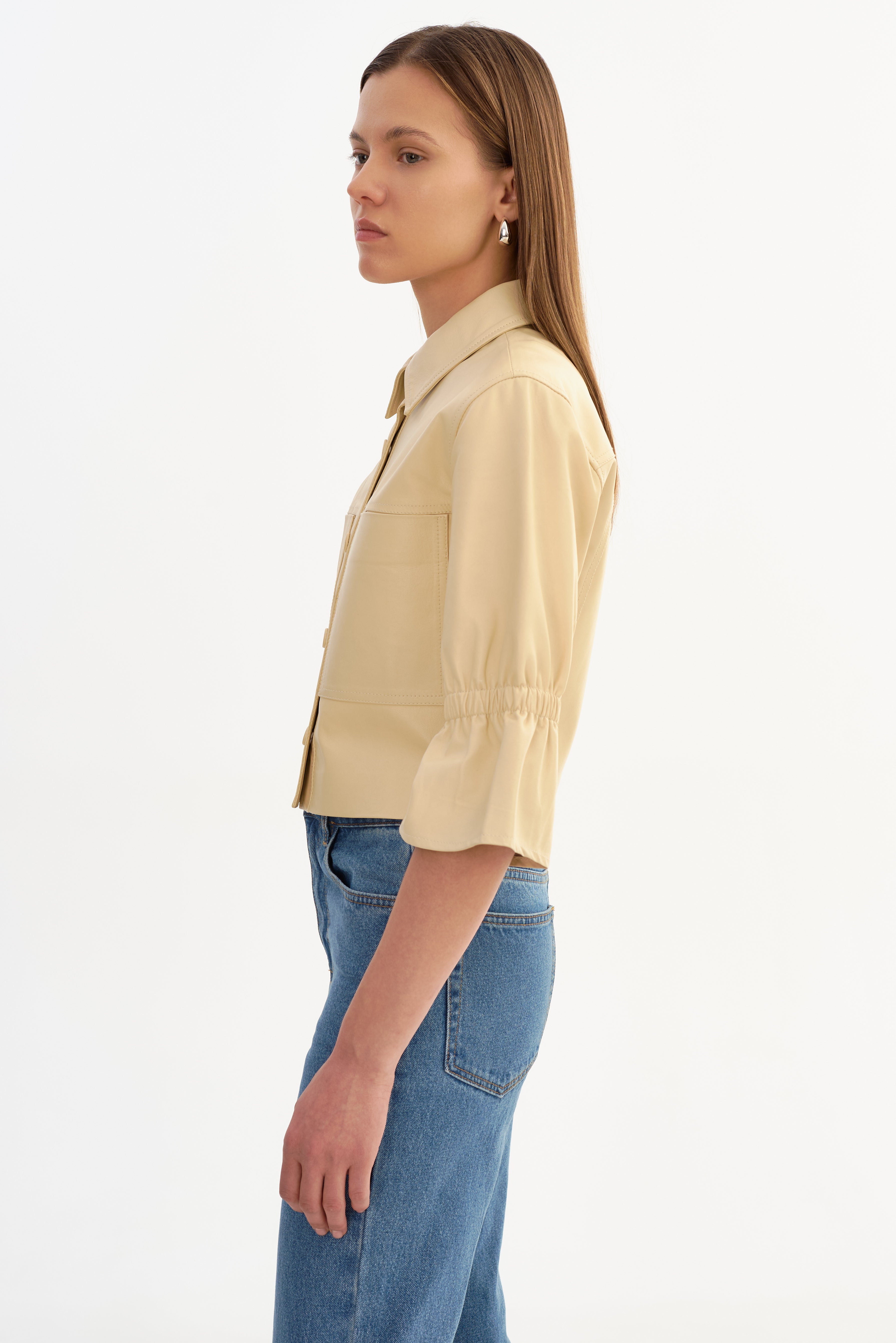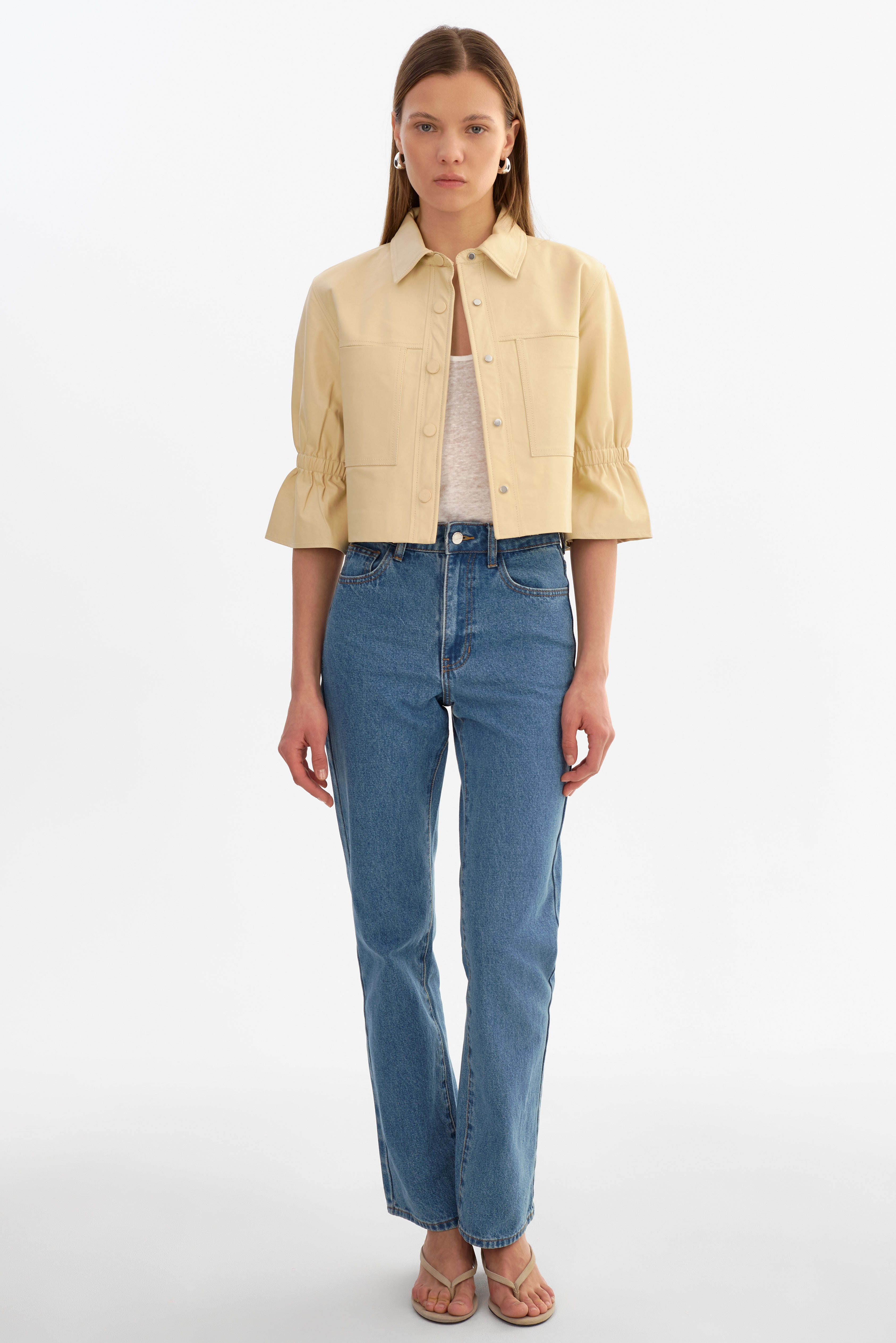 The CAROLINA Leather Ruffle Sleeve Jacket is a feminine twist on a classic shirt jacket. It features a cropped length and ruffled cropped sleeves for an unexpected playful silhouette. Pair it with jeans and a tee for a free-spirited off-duty look, or dress it up with the leather trousers and heels for a more sophisticated look.