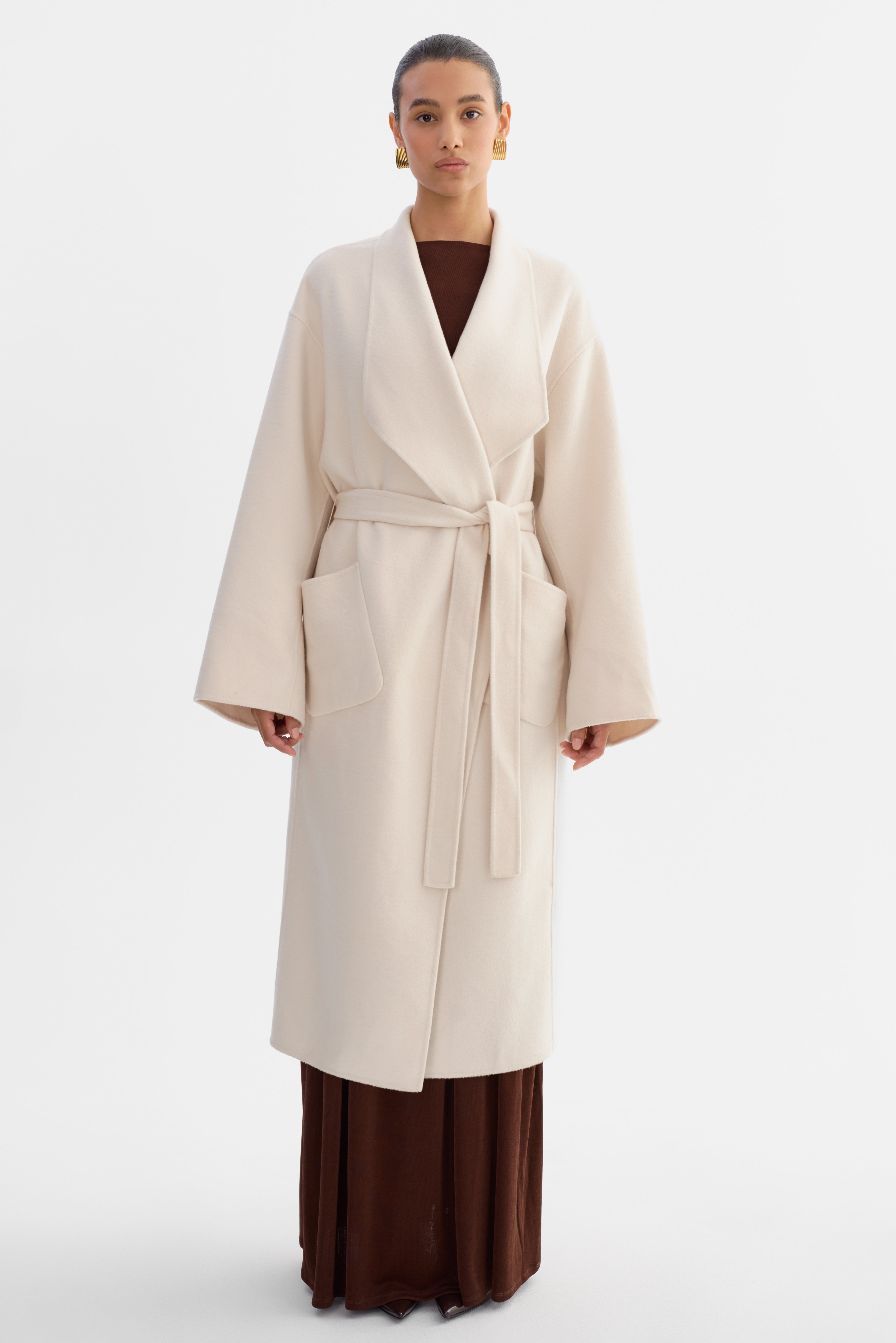 The COREEN Belted Wool Maxi Coat embodies refined ease with its relaxed wrap silhouette and cascading drape. Designed in double-face wool, it features wide sleeves, a self-tie belt, and slanted patch pockets for an effortless finish. The versatile shape makes it a polished layering piece for both day and evening.