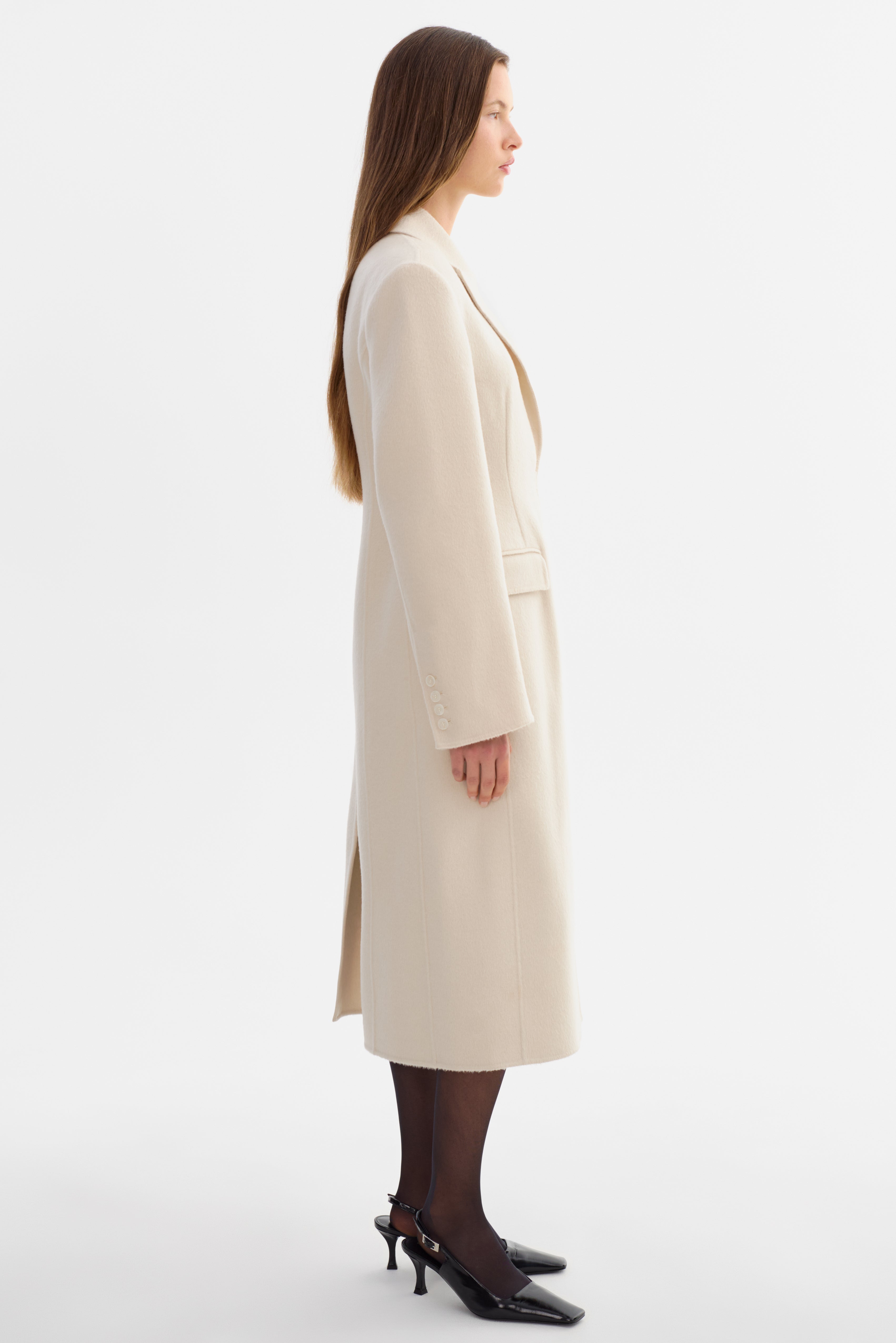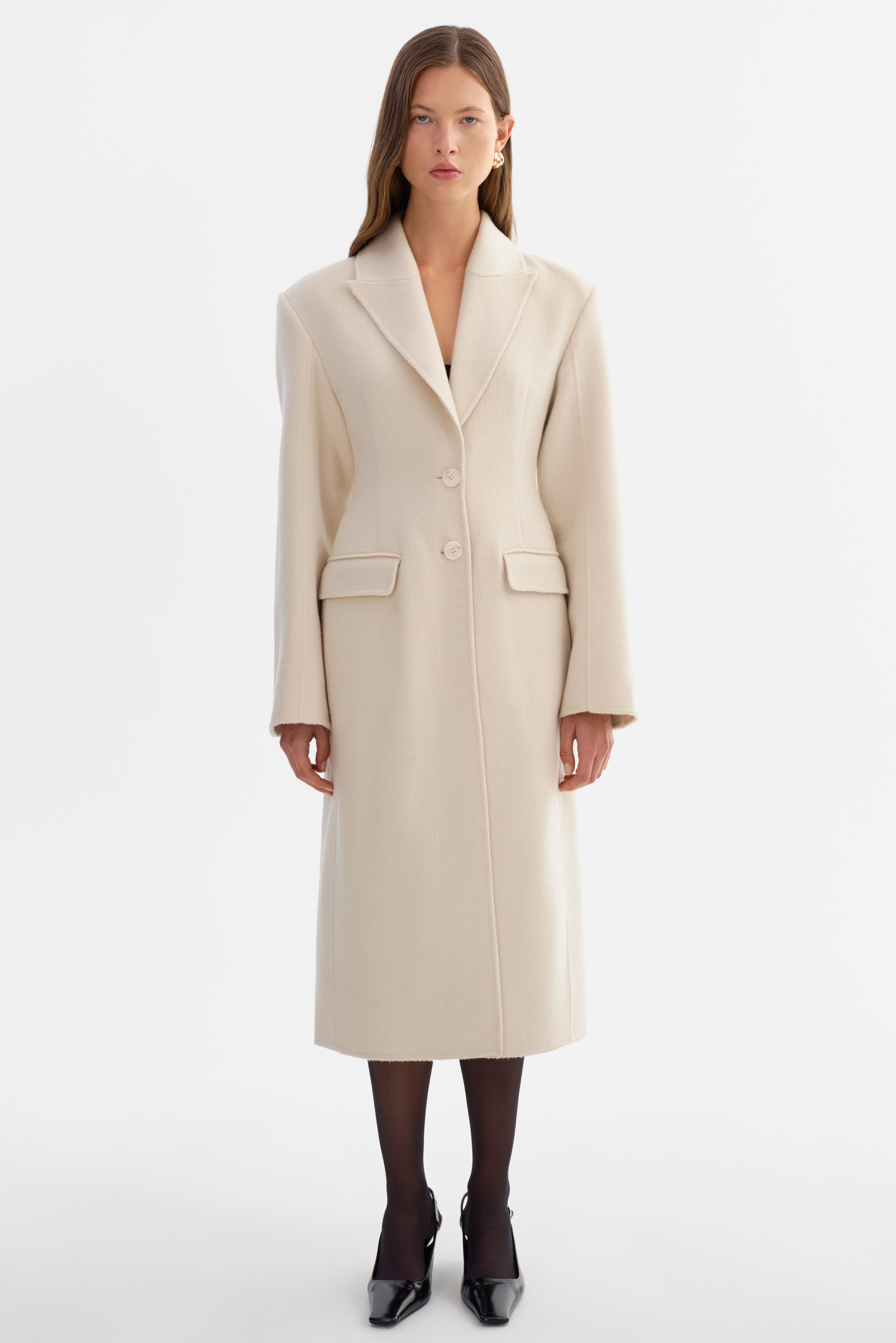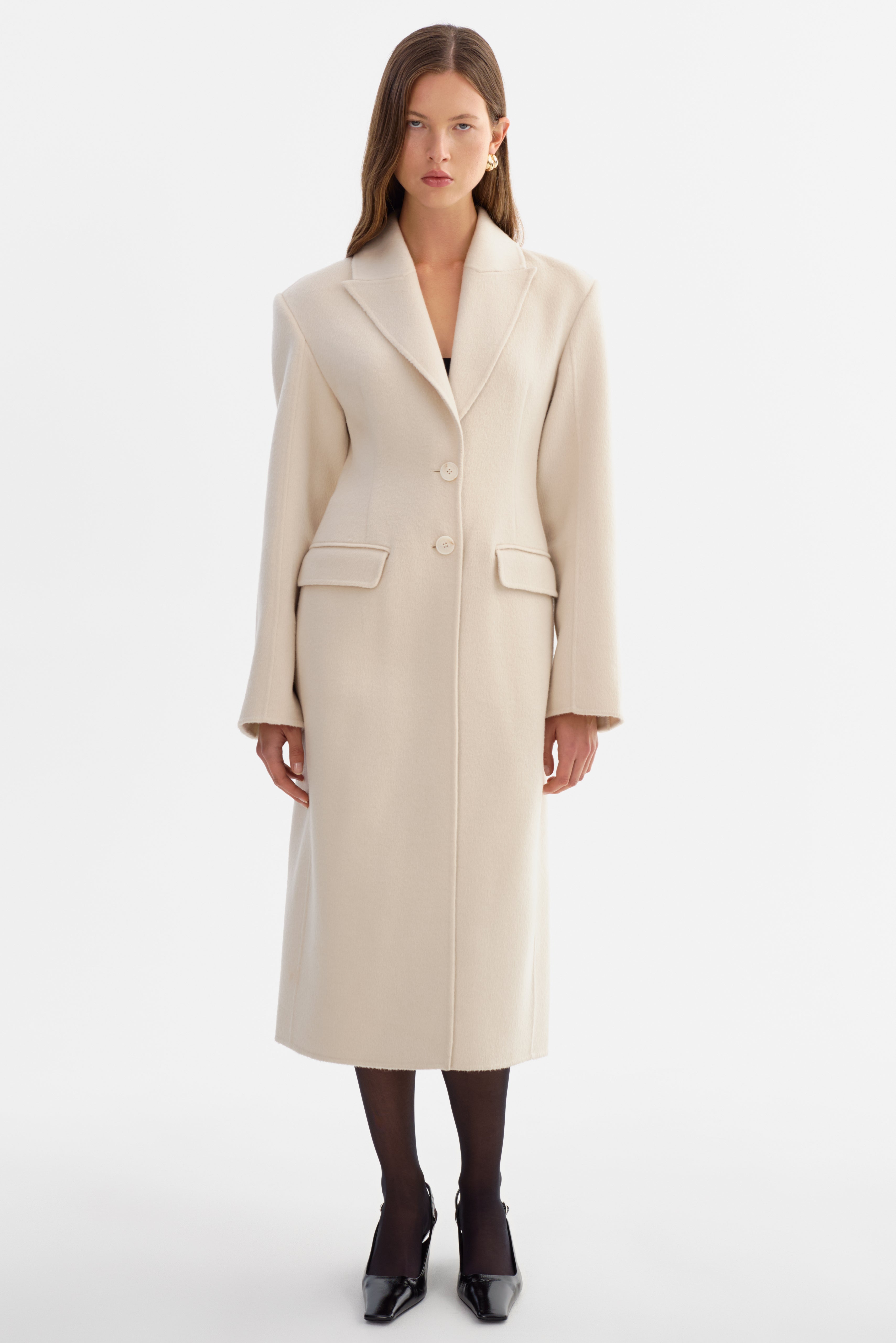 The CYNDA Long Wool Coat defines sophistication with its tailored hourglass silhouette. Crafted from double-face wool, it features a notched collar, padded shoulders, and a sharp two-button closure. Flap pockets and a back vent complete this refined statement piece. Layer it over sleek tailoring or eveningwear for a polished finish.