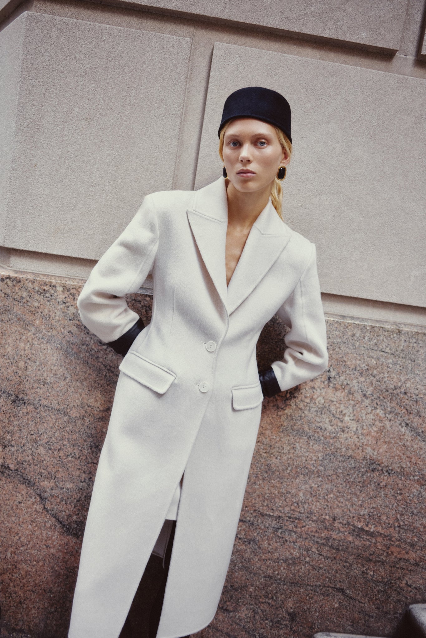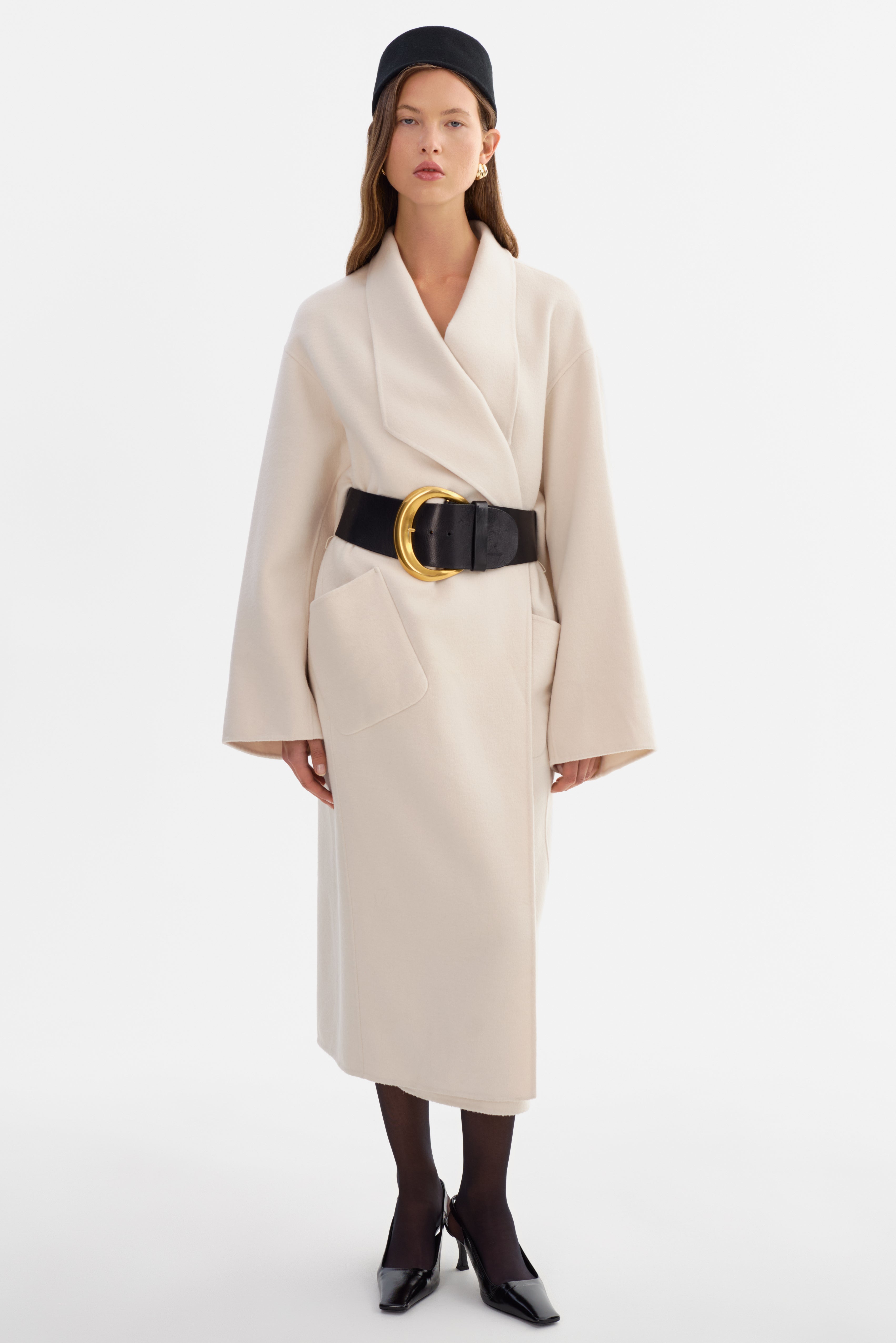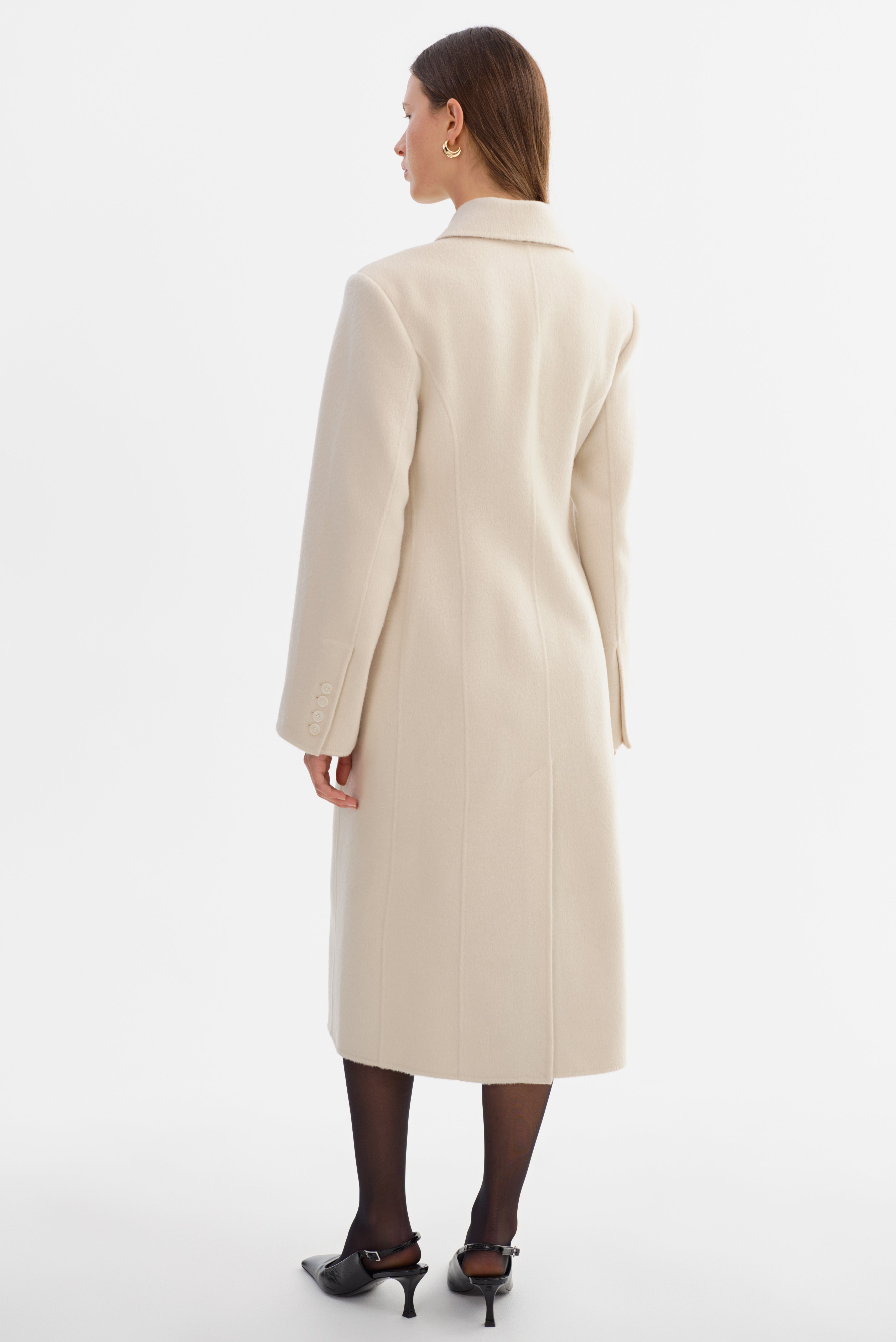 The CYNDA Long Wool Coat defines sophistication with its tailored hourglass silhouette. Crafted from double-face wool, it features a notched collar, padded shoulders, and a sharp two-button closure. Flap pockets and a back vent complete this refined statement piece. Layer it over sleek tailoring or eveningwear for a polished finish.