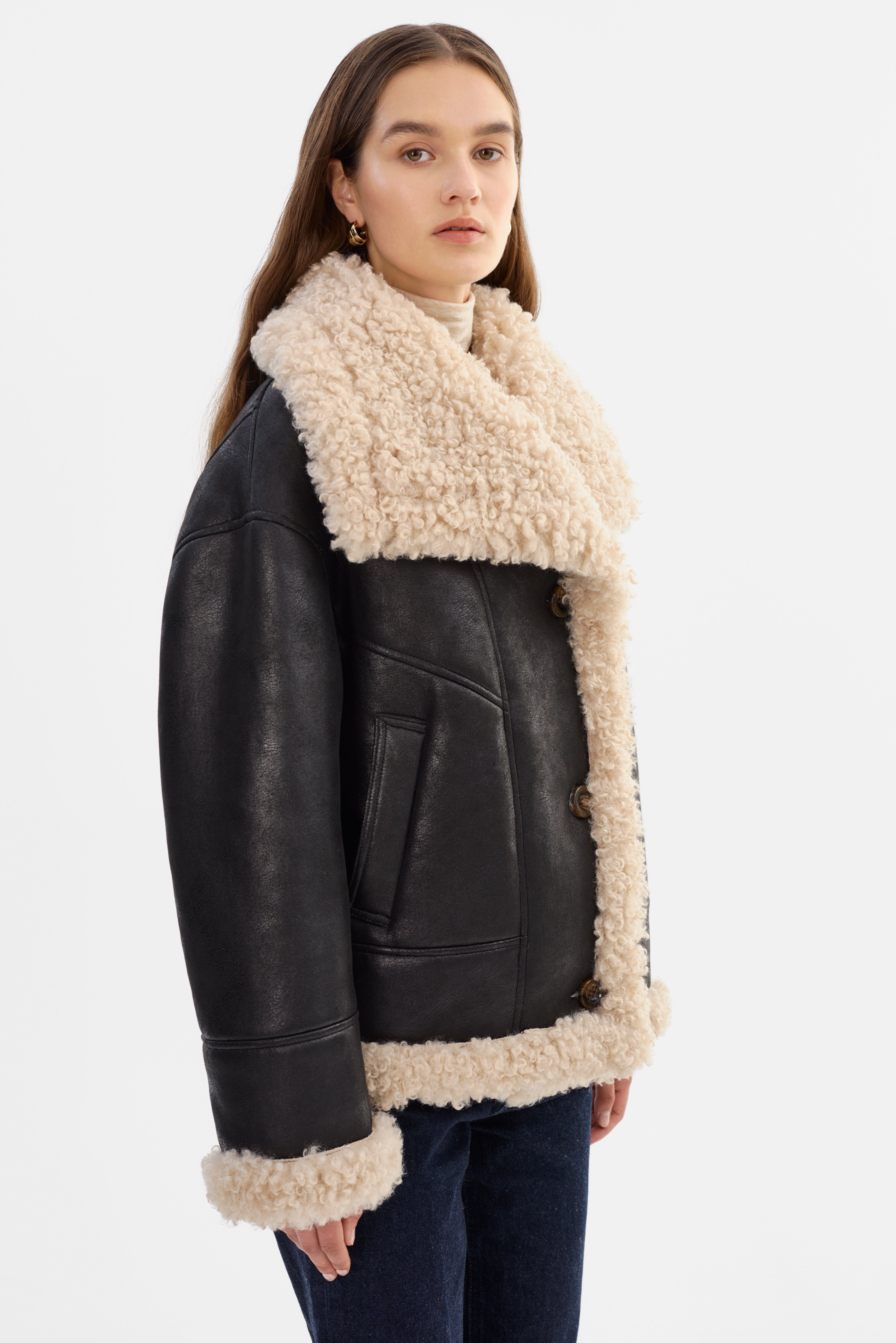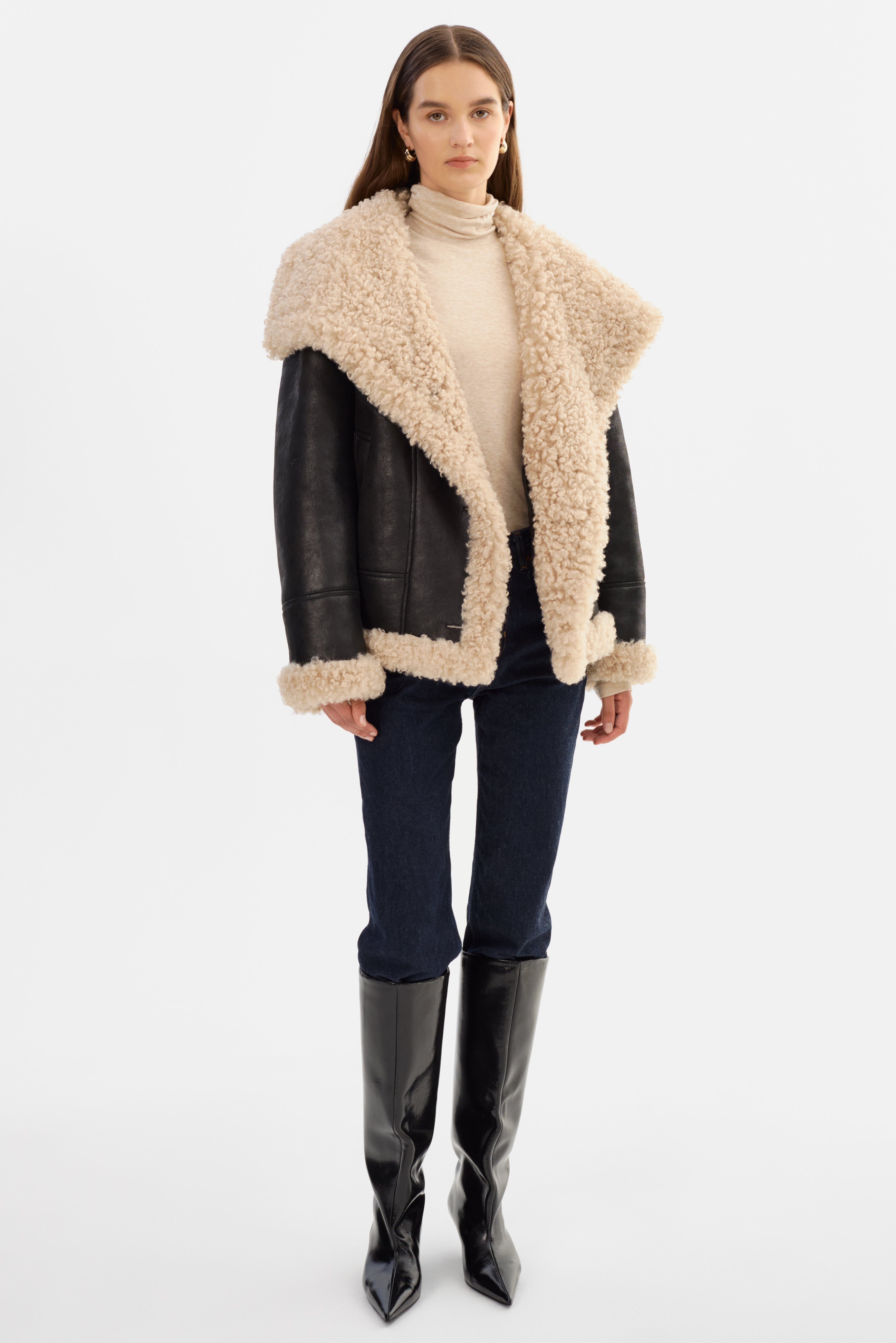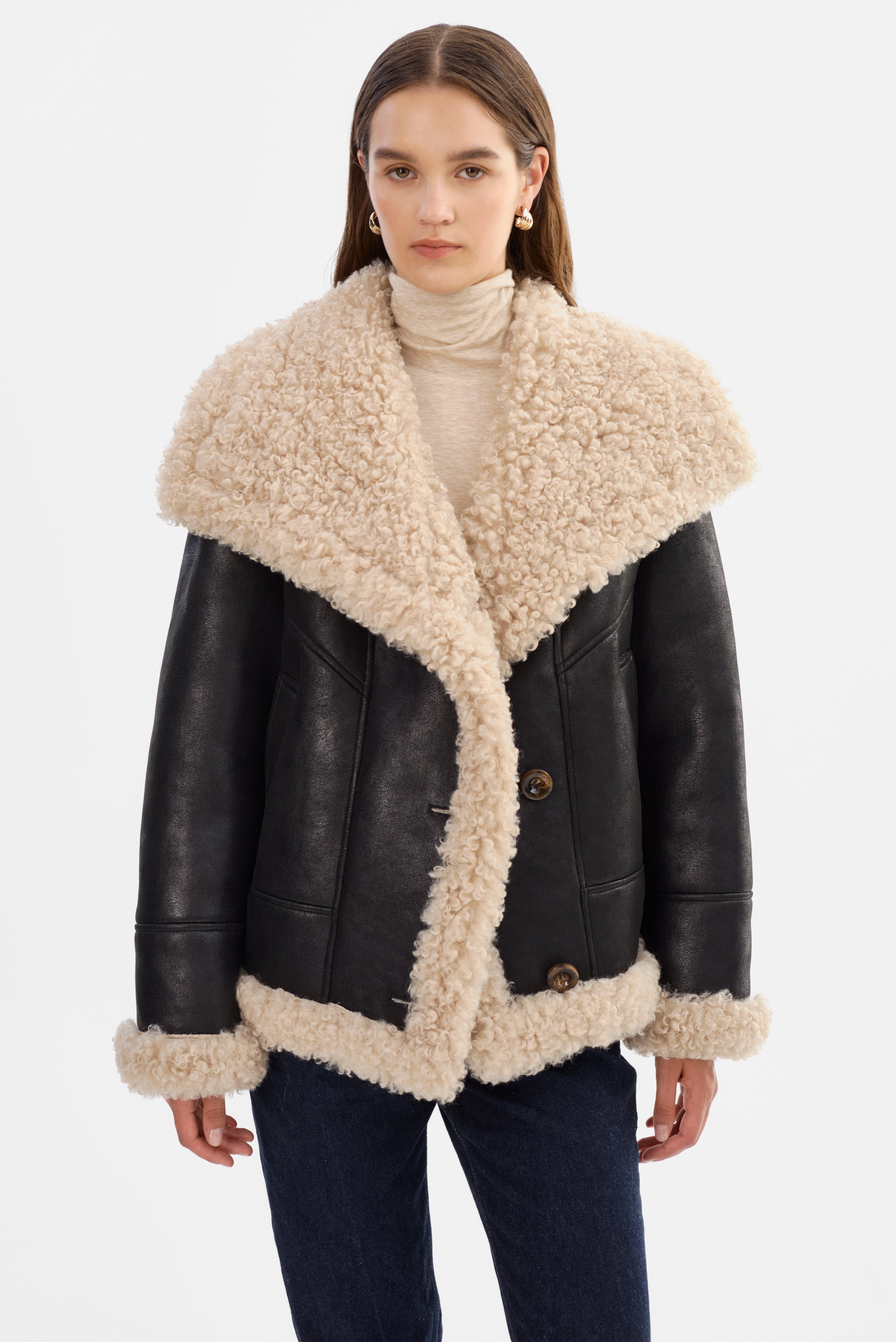 Soft and statement-making, the DEMI Faux Shearling Coat is crafted from soft faux suede leather with rich curly faux shearling trim. Designed with an oversized shawl collar, tonal button closure, and a straight, hip-length silhouette, it balances cozy volume with clean tailoring for an effortlessly elevated finish.