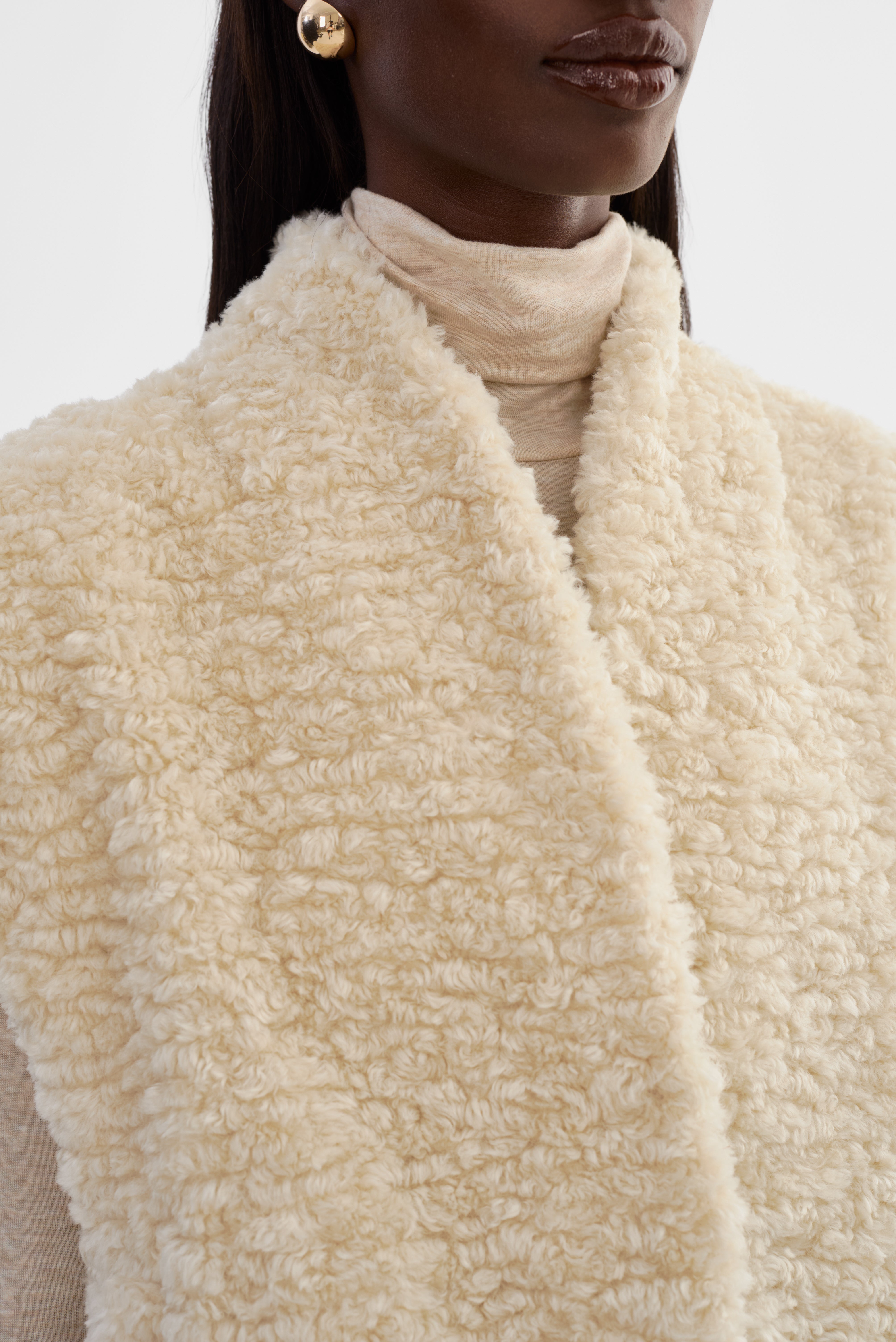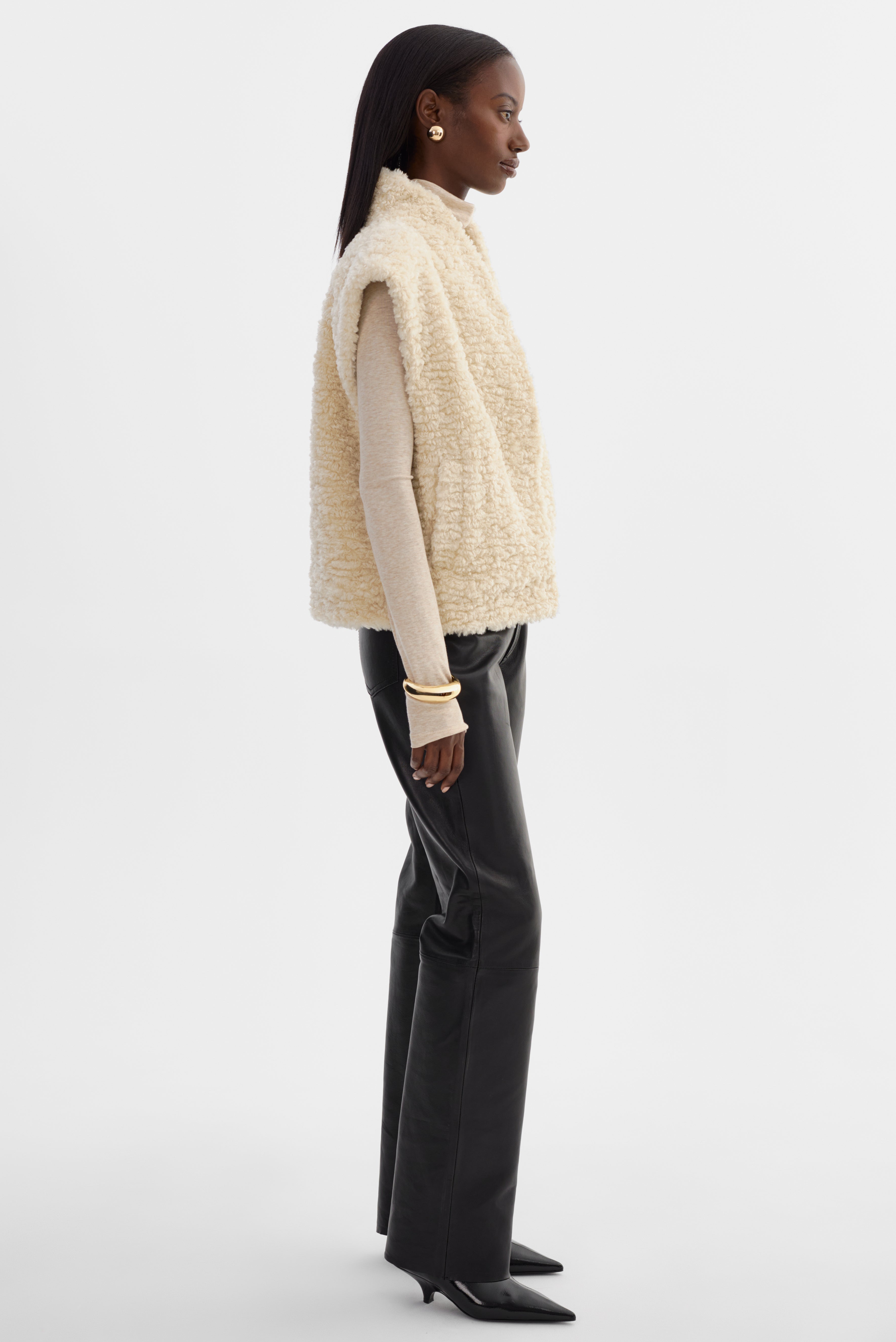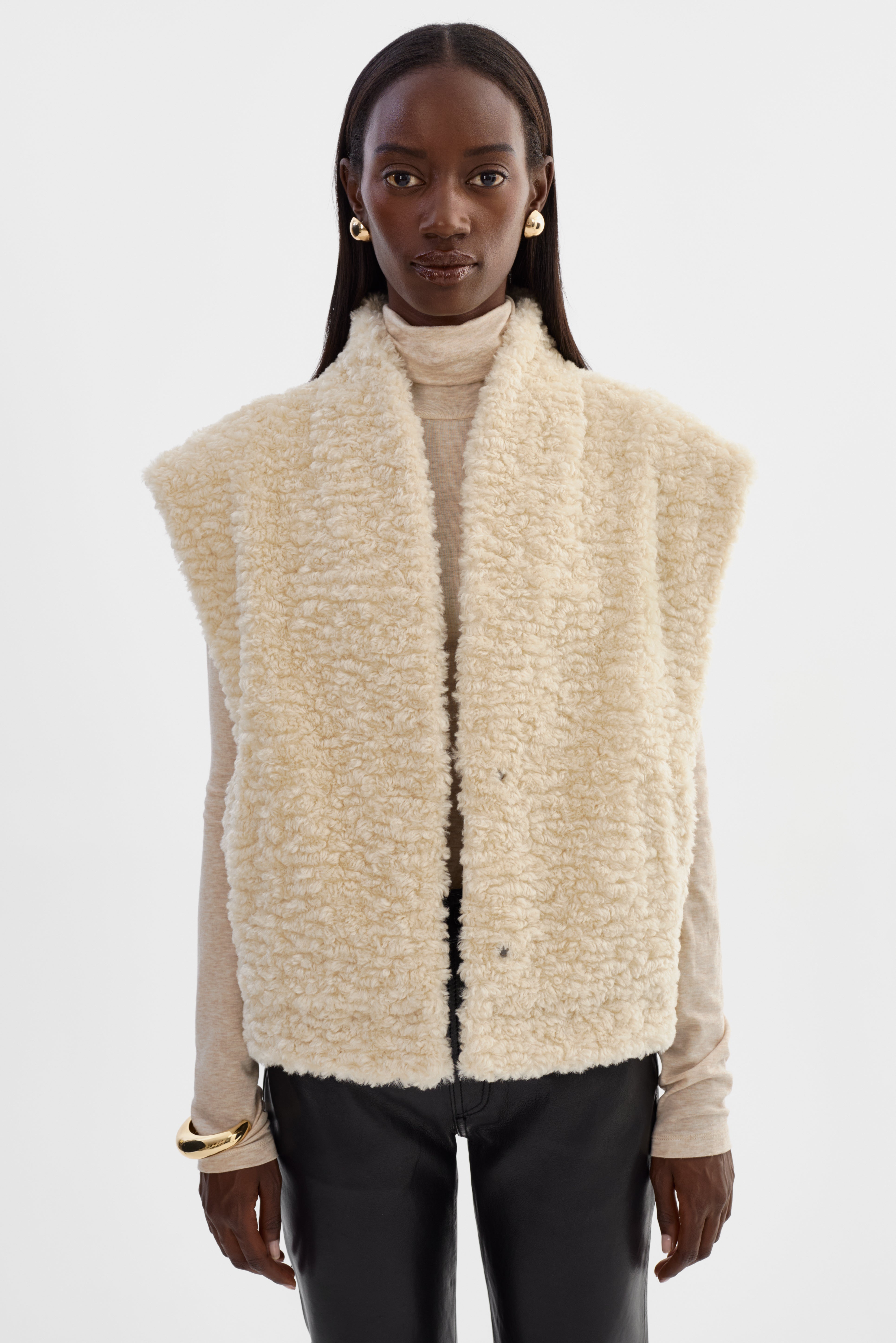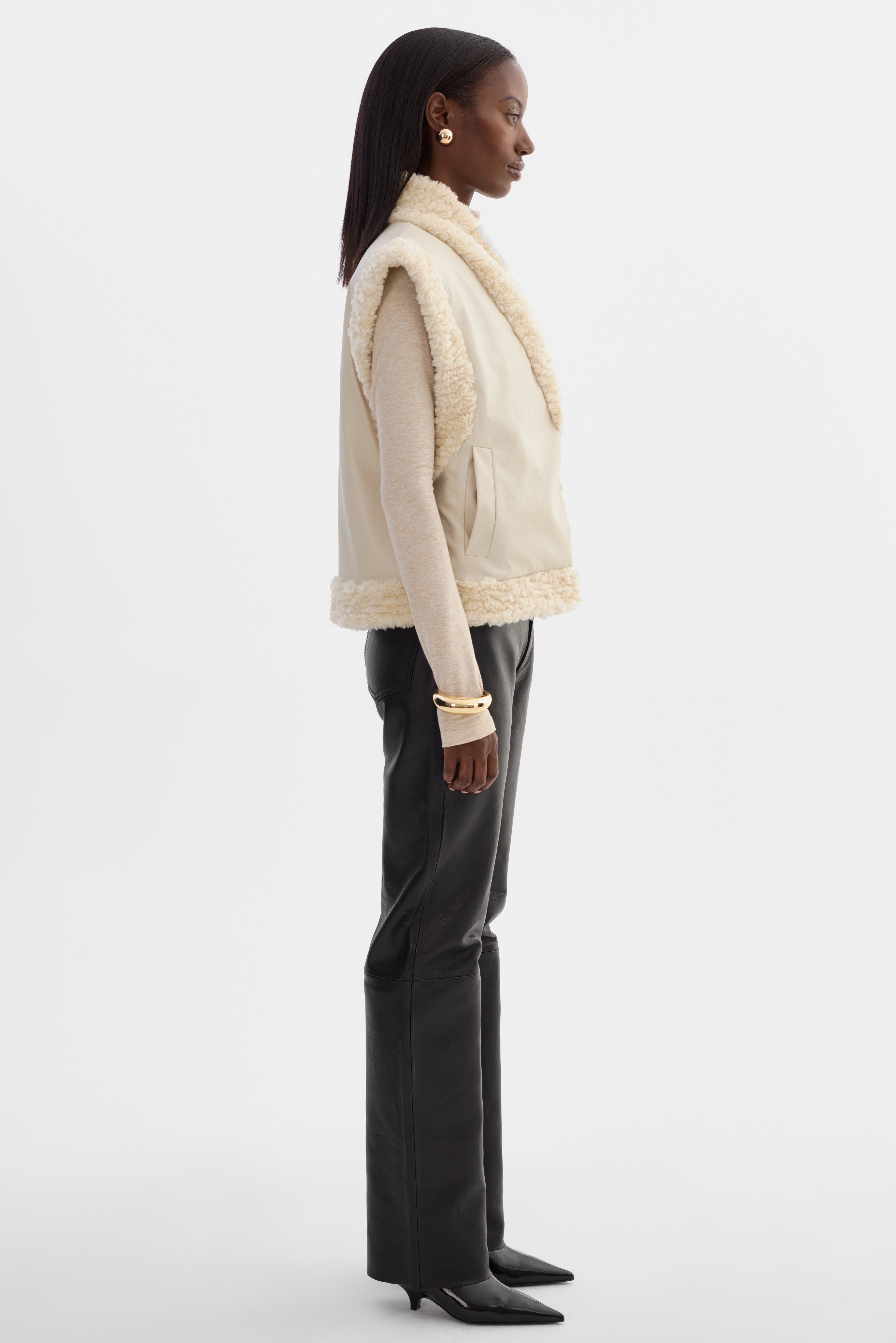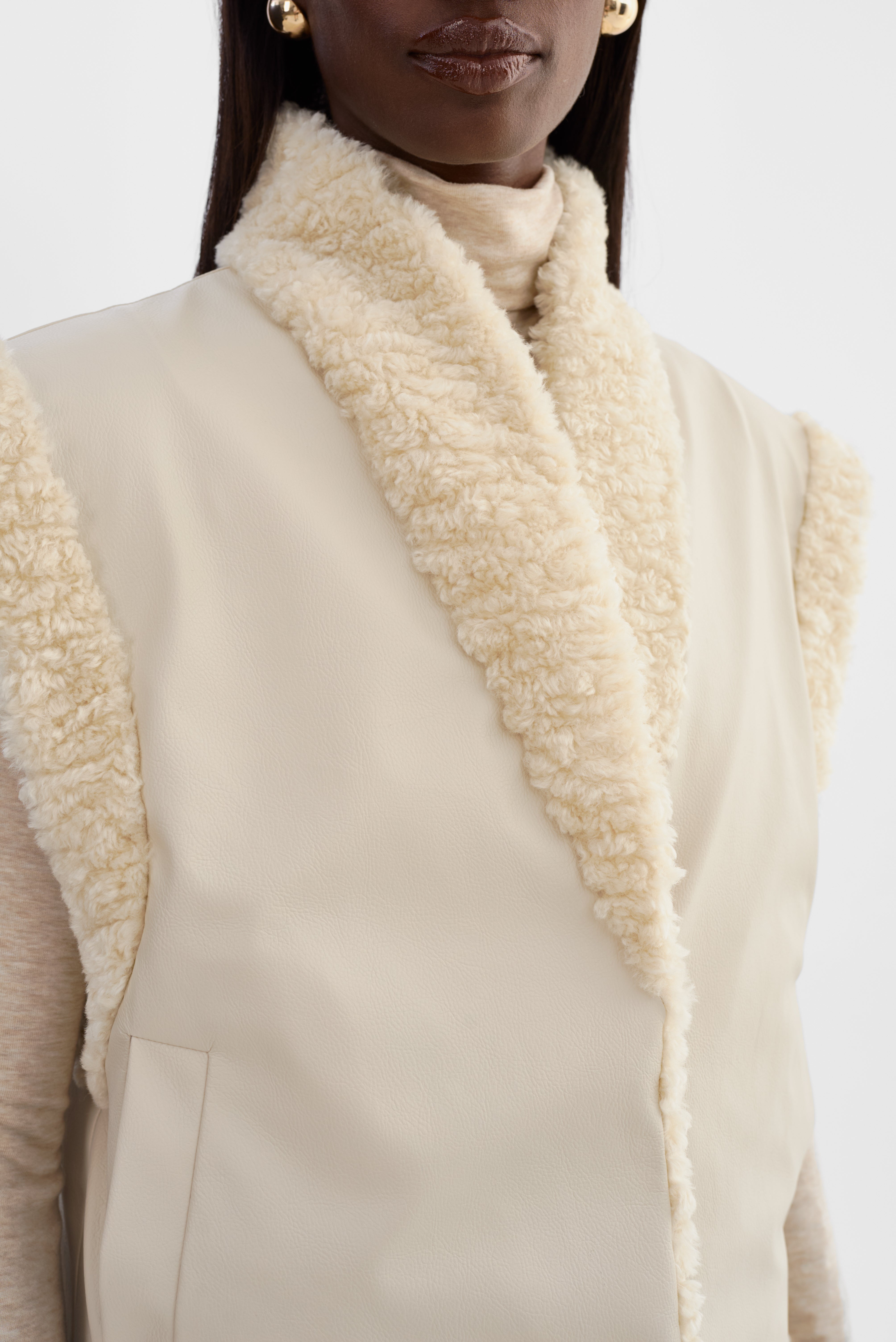Tactile and effortlessly cool, the DUA Reversible Sherpa Vest is crafted from plush curly sherpa on one side and sleek faux leather on the other, with a sculptural sleeveless silhouette. With wide shoulders and a clean open front, it adds rich texture and dimension to any layered look.
