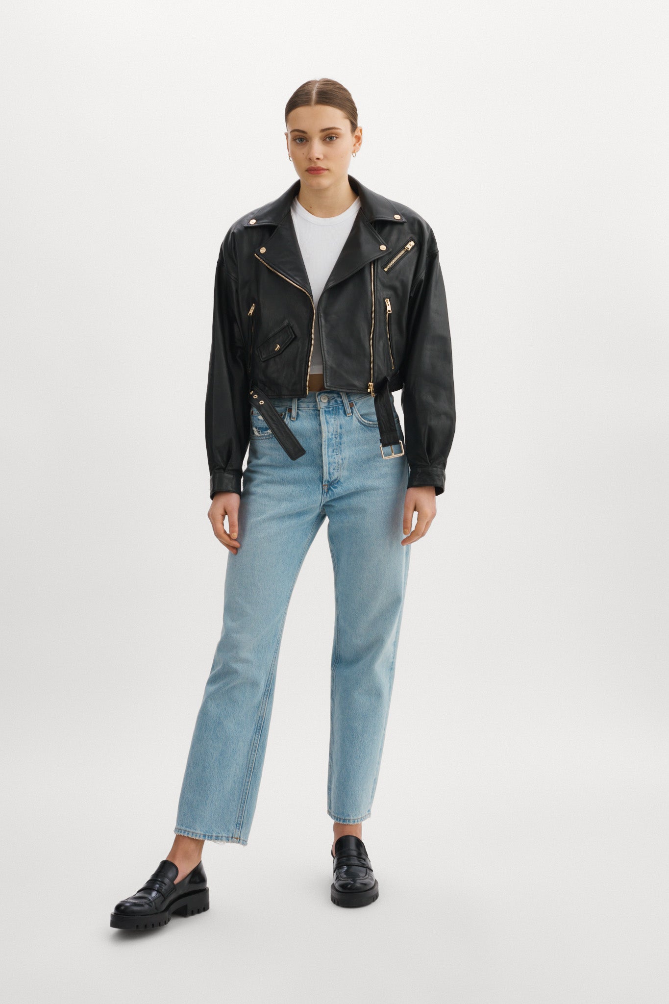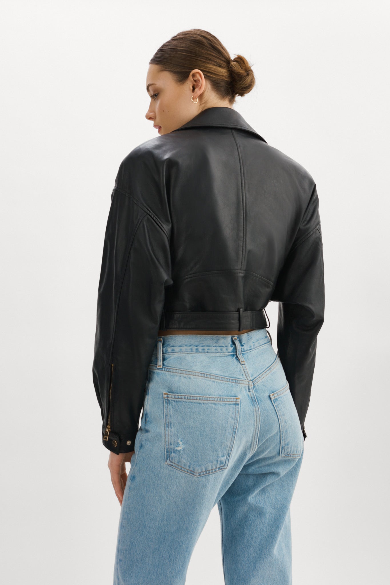 Sometimes, there's no better feeling than commanding the room. Bring back the best of the 80s with this vintage-inspired cropped leather jacket. Featuring classic biker elements and unexpected stand-outs like shoulder pads and balloon pleated sleeves, you'll stand out from the rest when you rock the Dylan. A coin flap pocket and a removable waist belt add unique touches to this lamb leather stunner. A true statement piece, this 80s leather jacket is an instant head-turner.