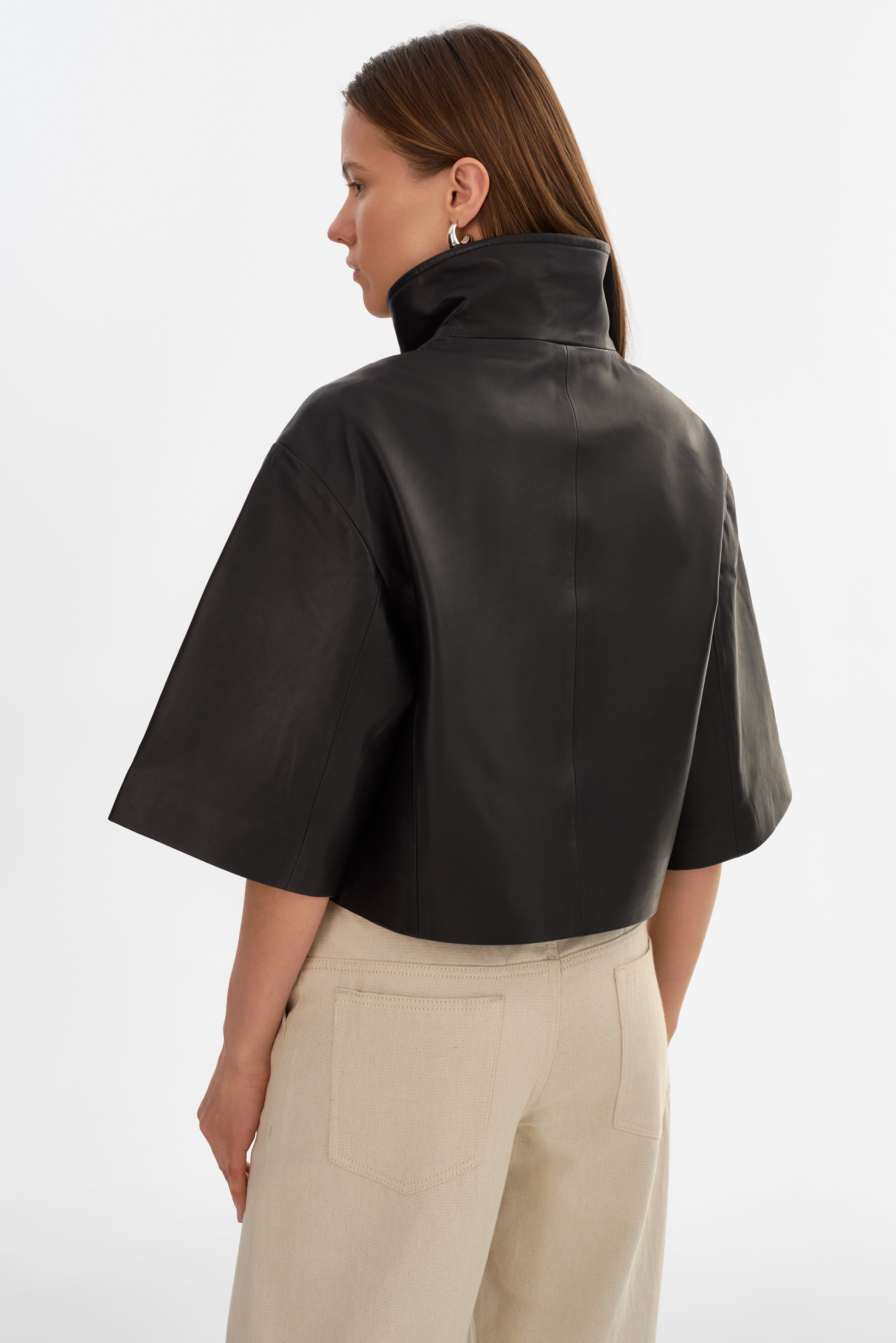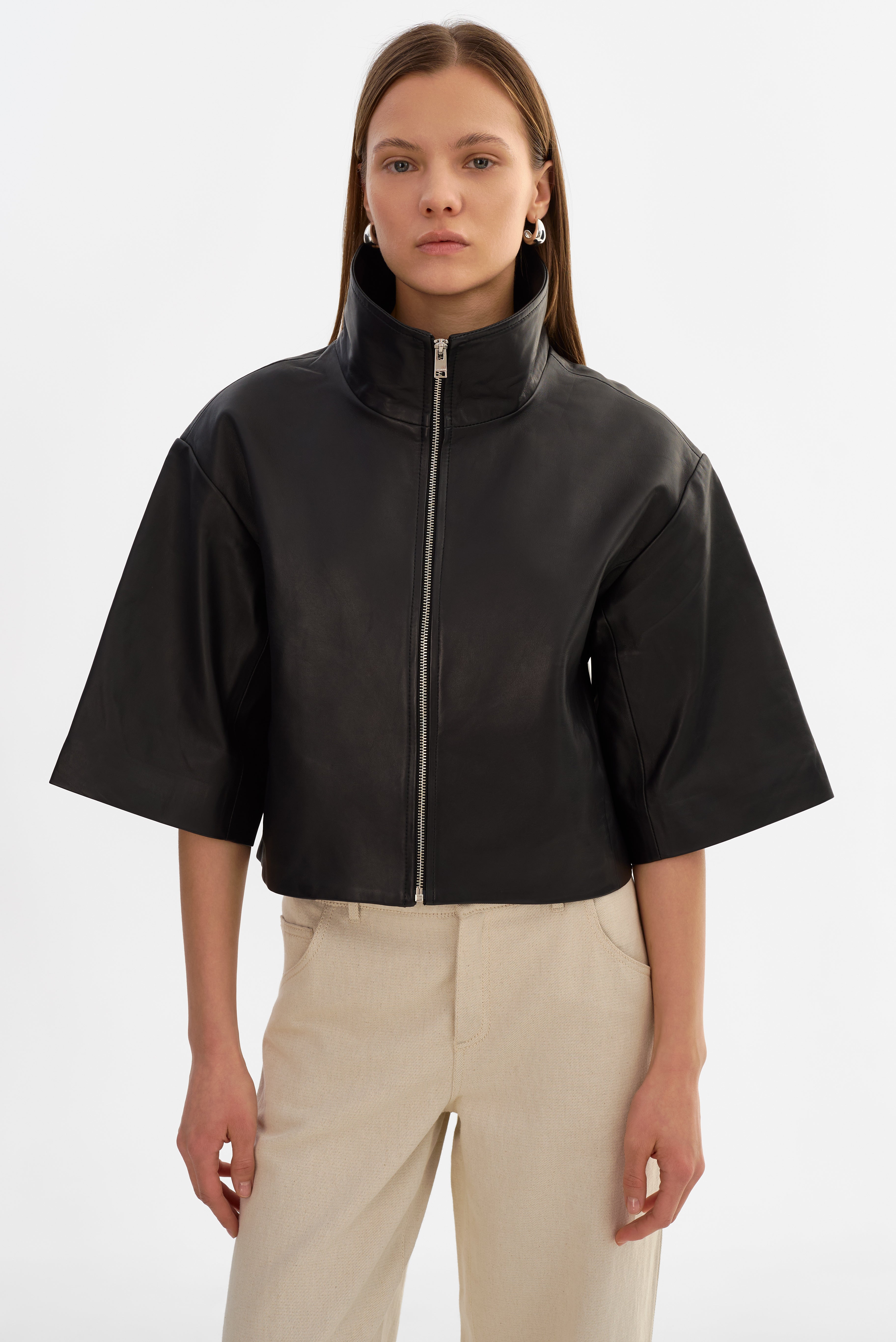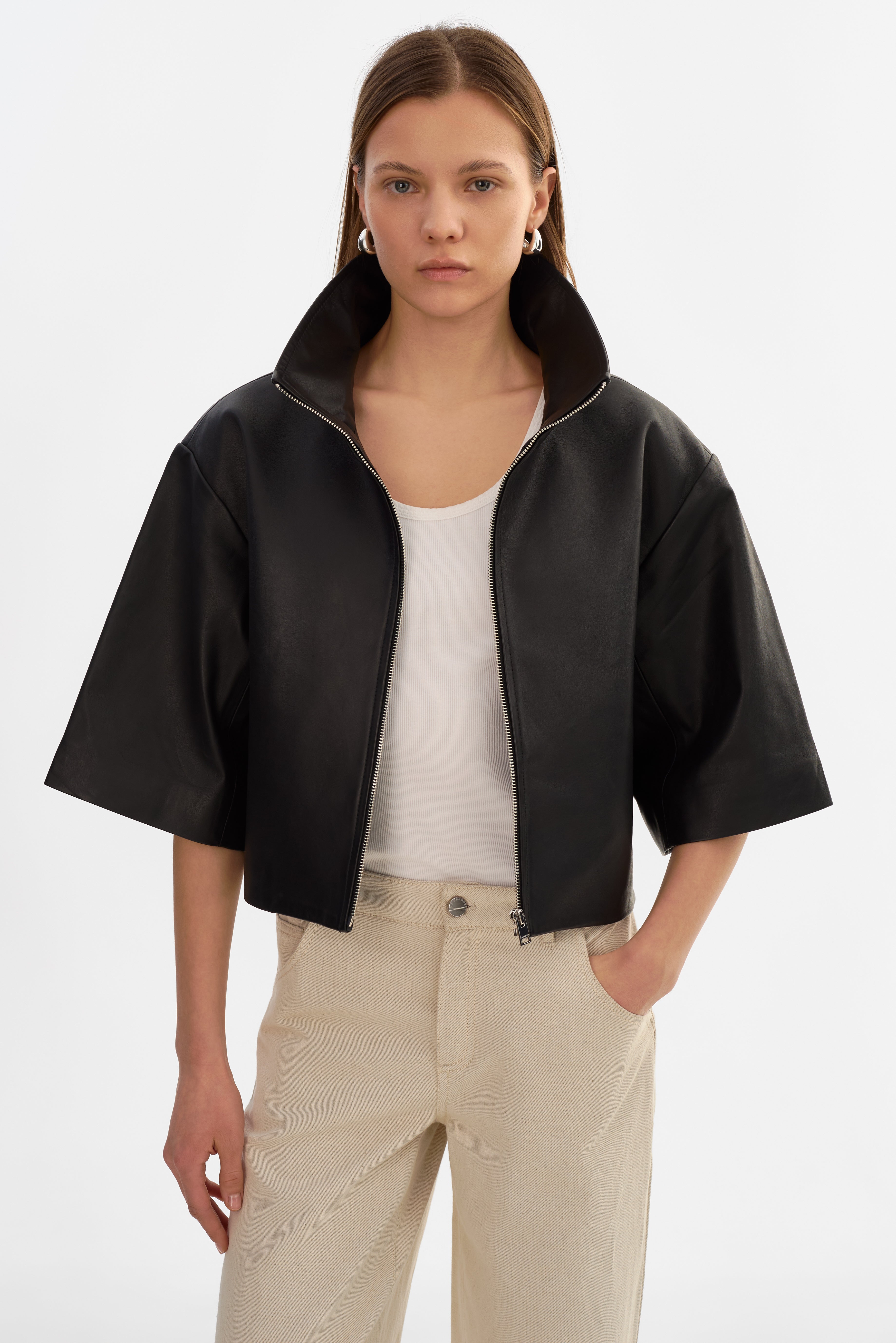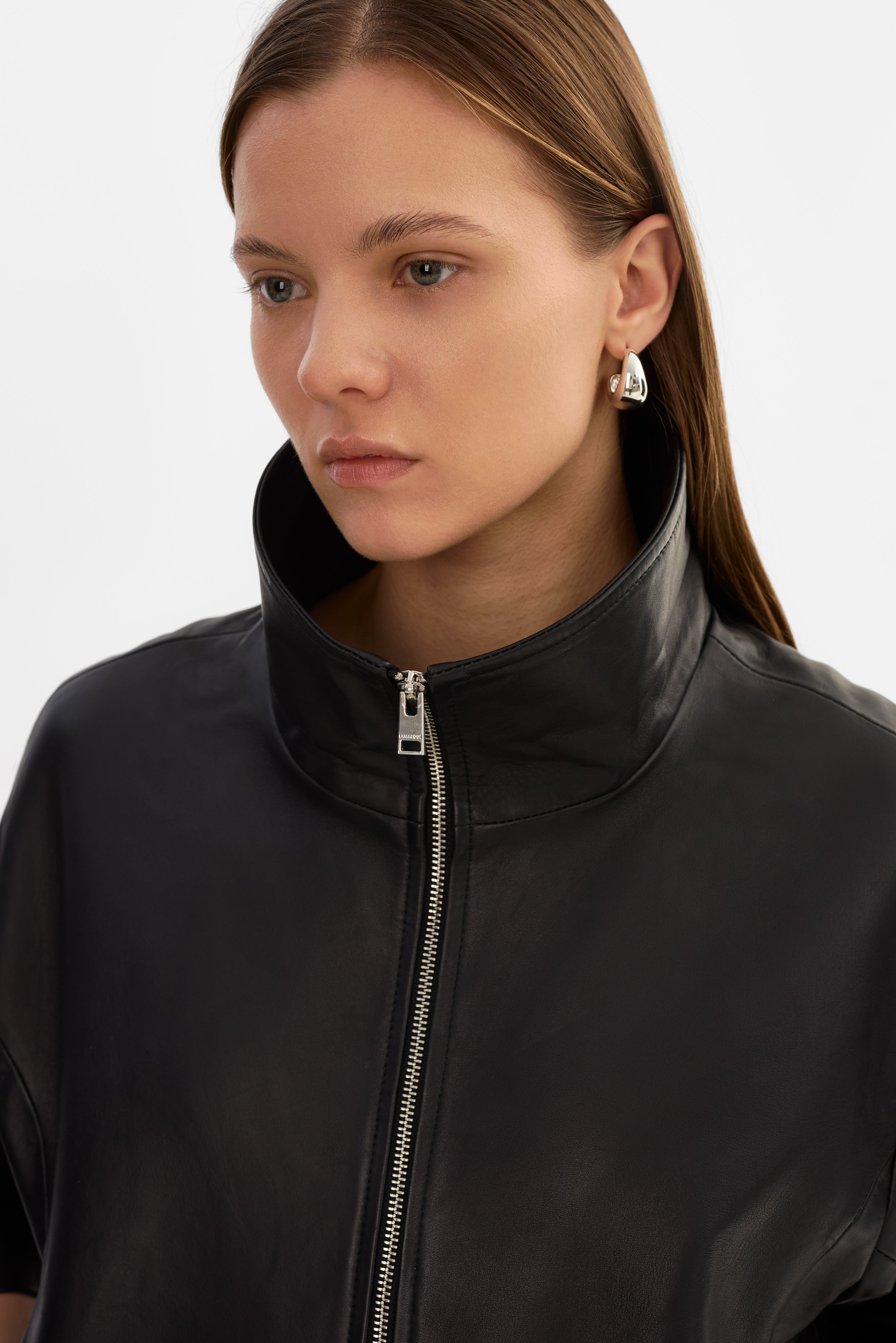 Relaxed with intention. The ELIN Leather Funnel Neck Jacket offers a modern approach to everyday outerwear, blending ease with a quietly confident feel. Wide cropped sleeves and dropped shoulders create an effortless silhouette, while the funnel neckline and clean zip front keep the look polished. An easy layer that feels modern, wearable, and naturally refined.