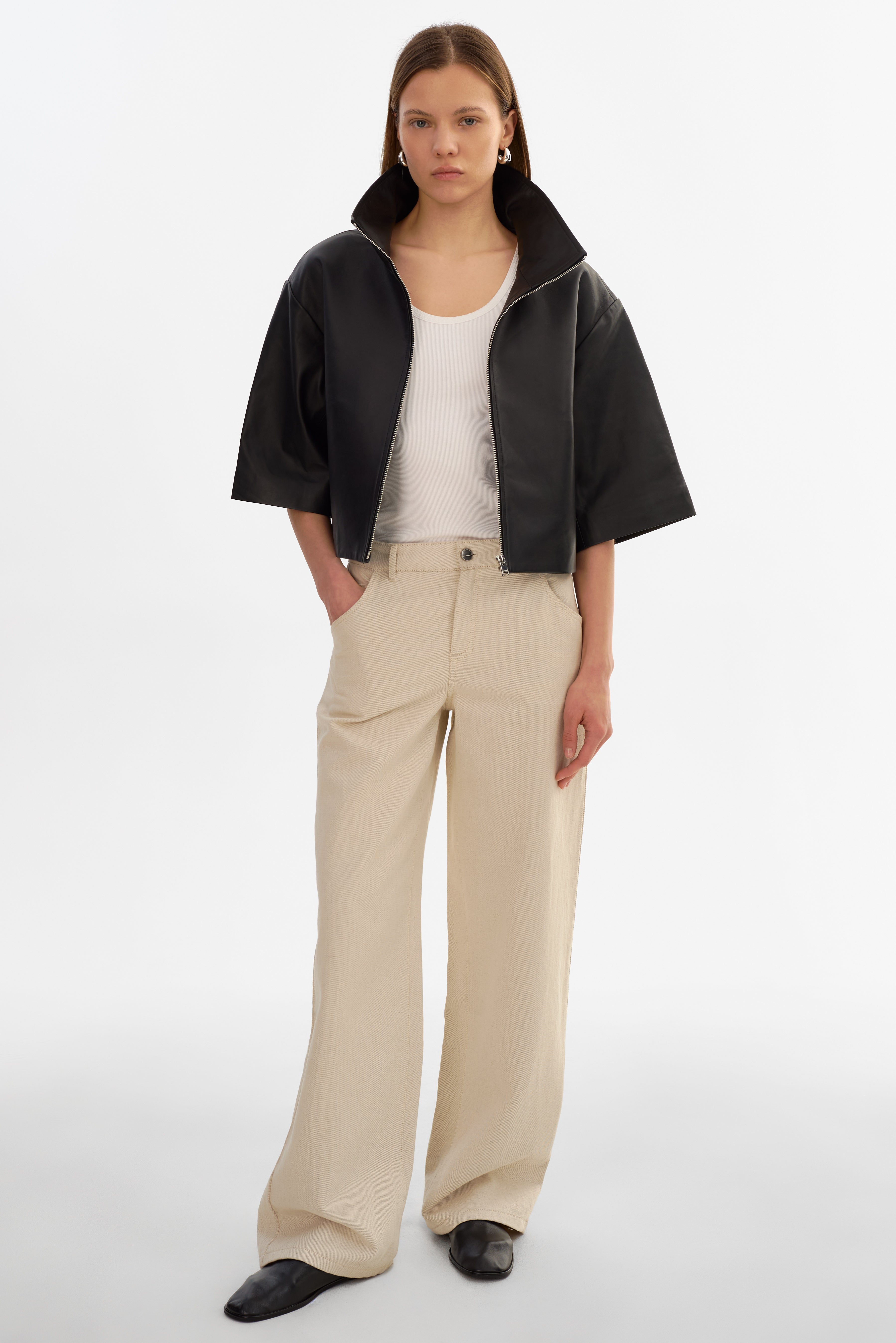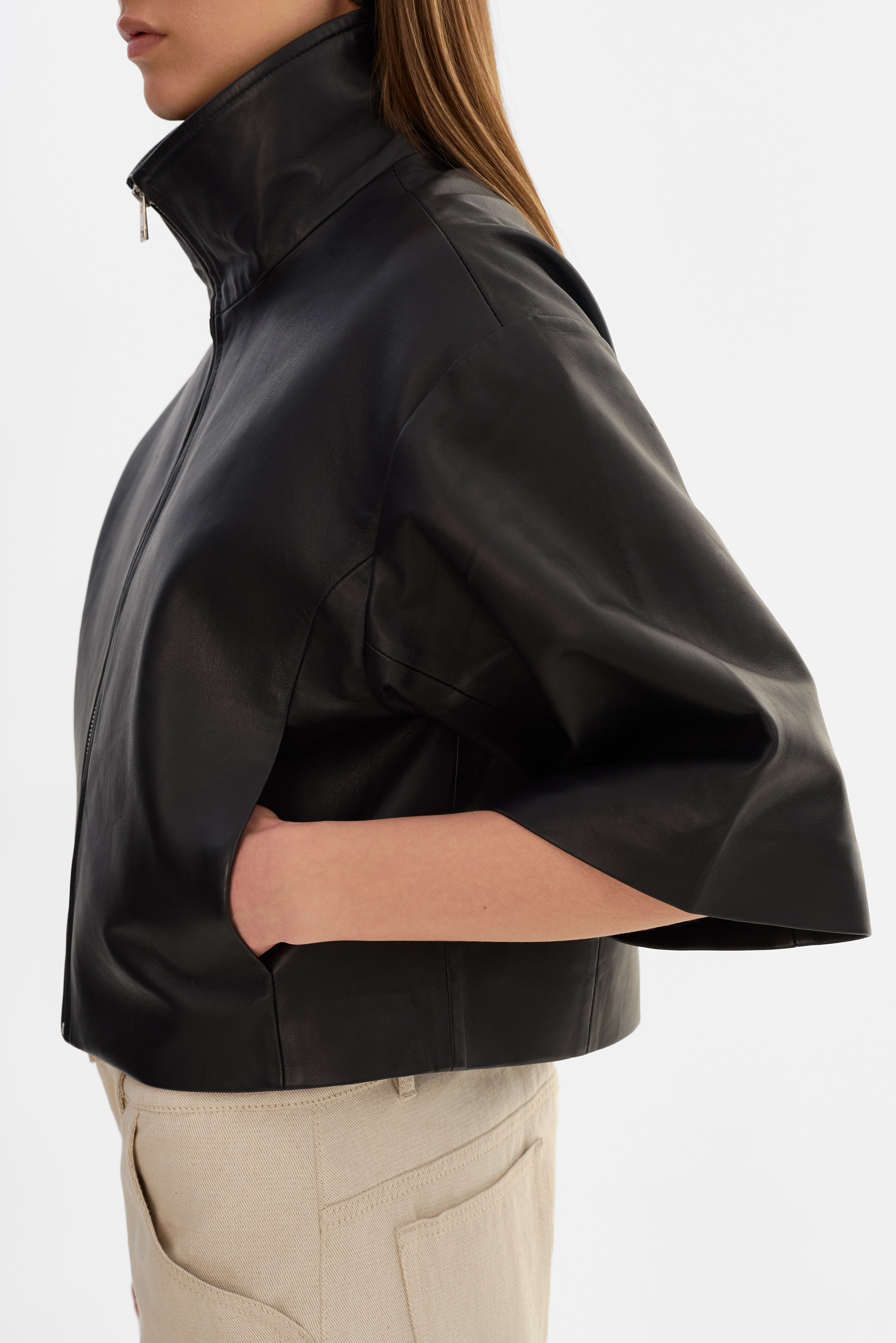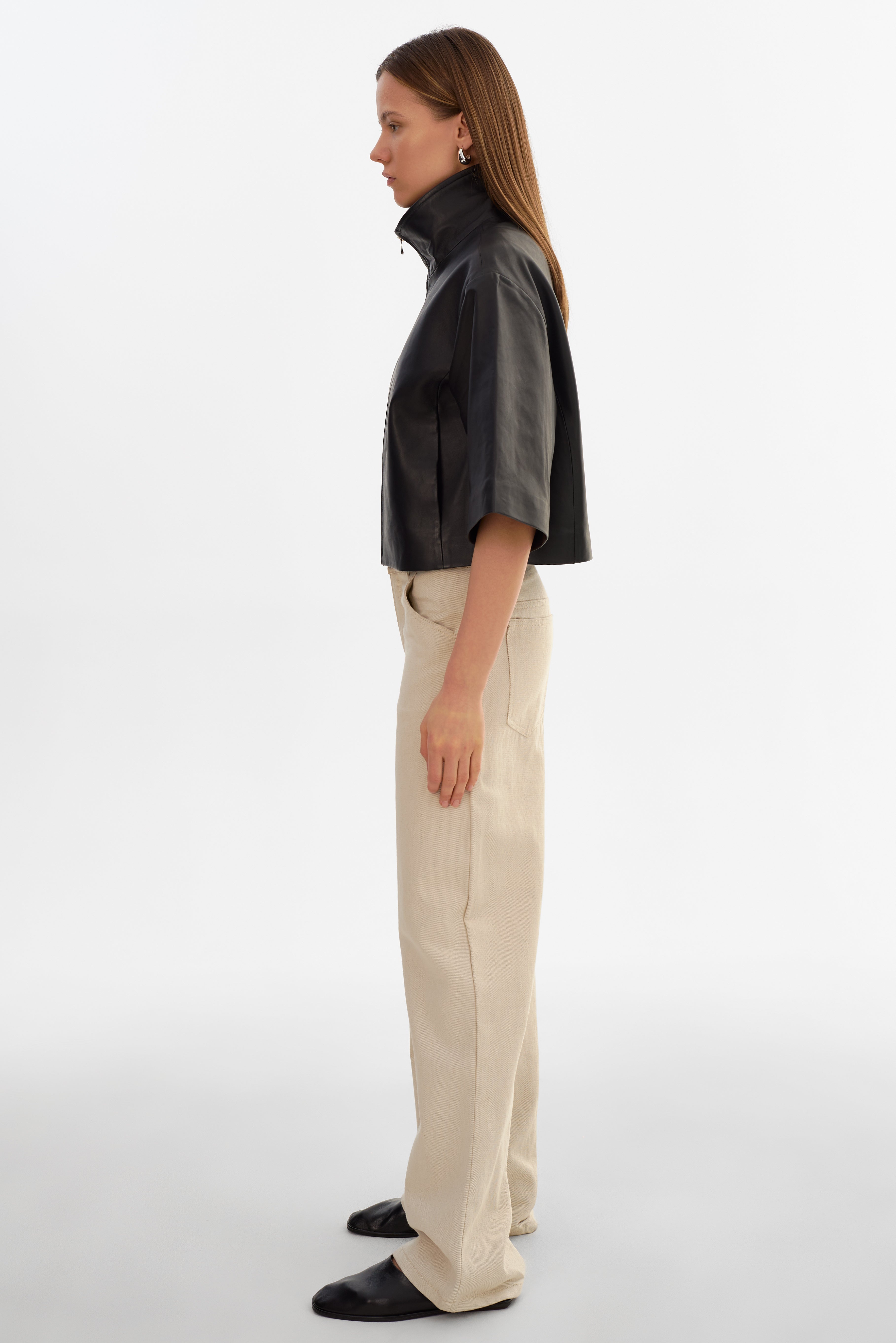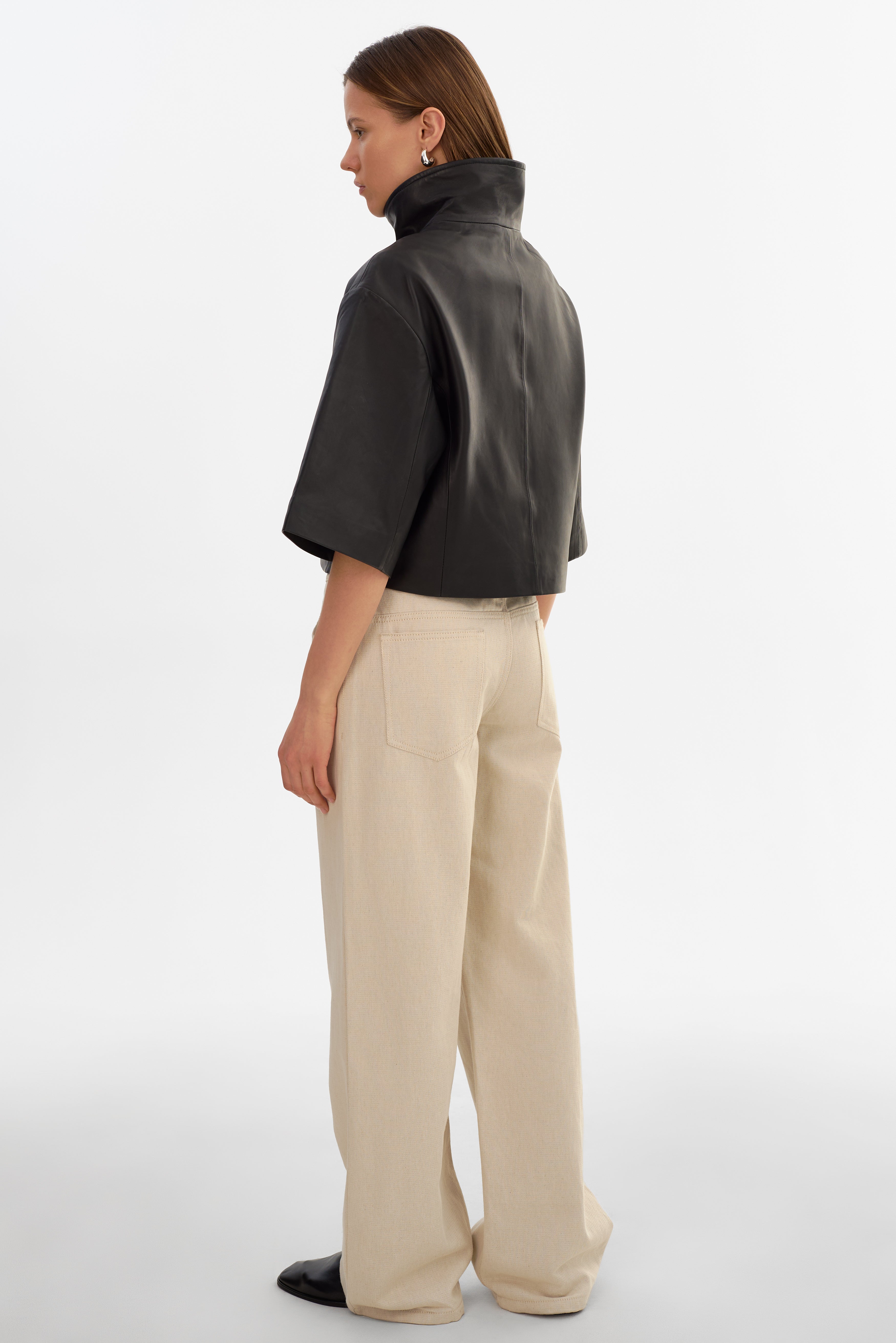 Relaxed with intention. The ELIN Leather Funnel Neck Jacket offers a modern approach to everyday outerwear, blending ease with a quietly confident feel. Wide cropped sleeves and dropped shoulders create an effortless silhouette, while the funnel neckline and clean zip front keep the look polished. An easy layer that feels modern, wearable, and naturally refined.