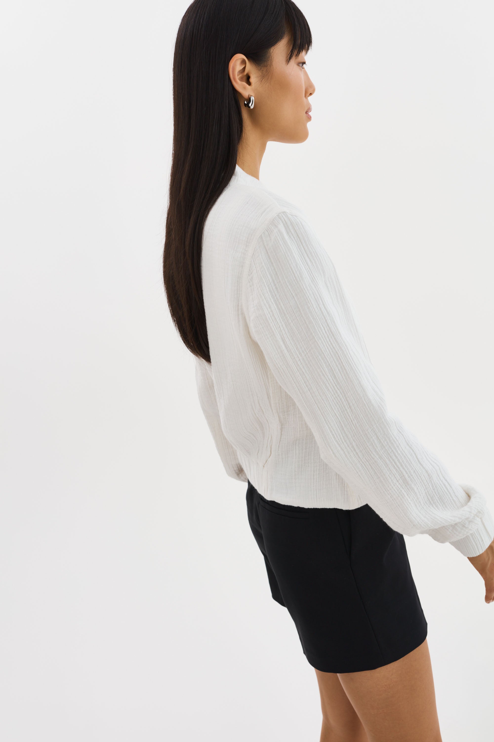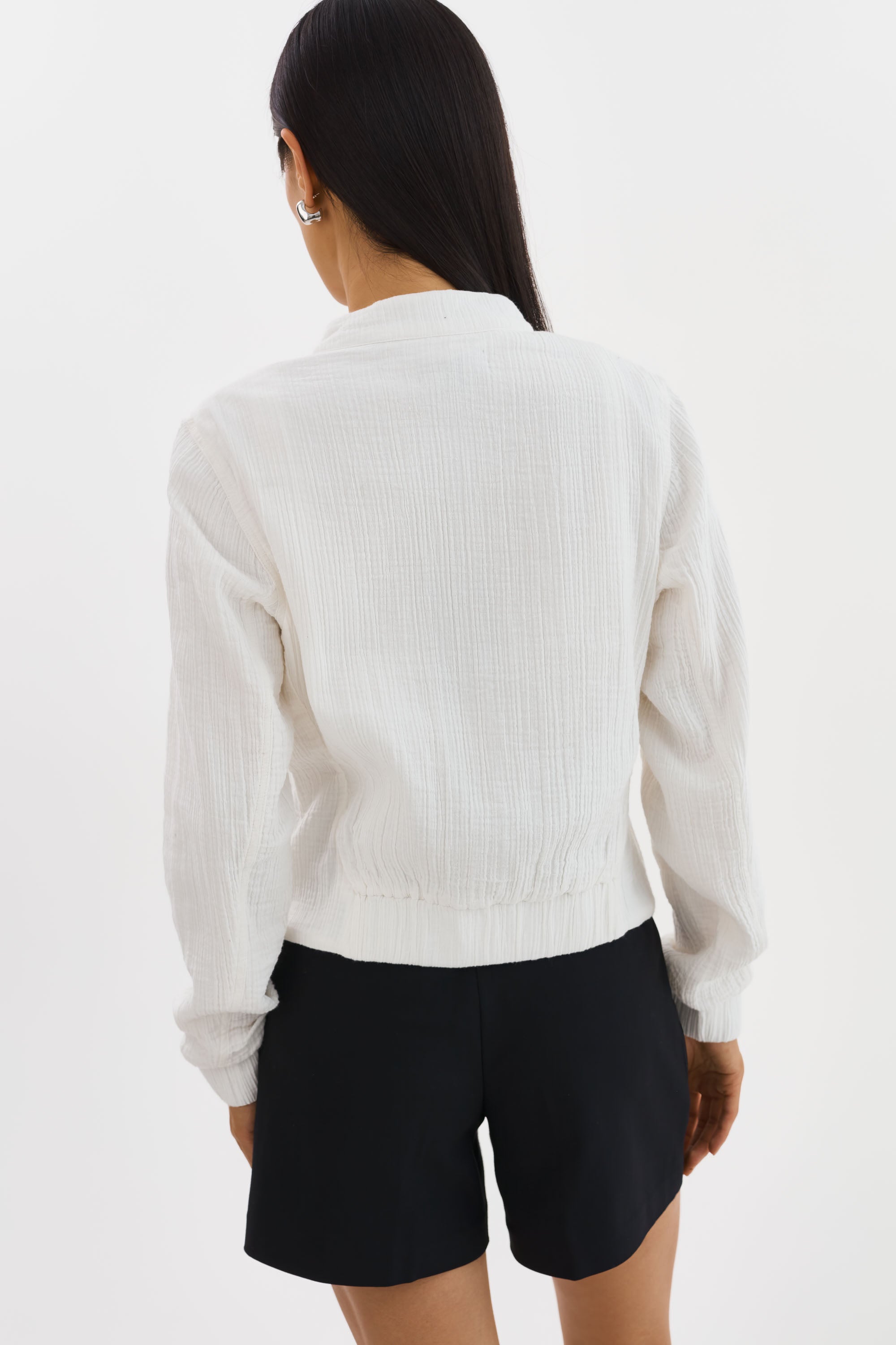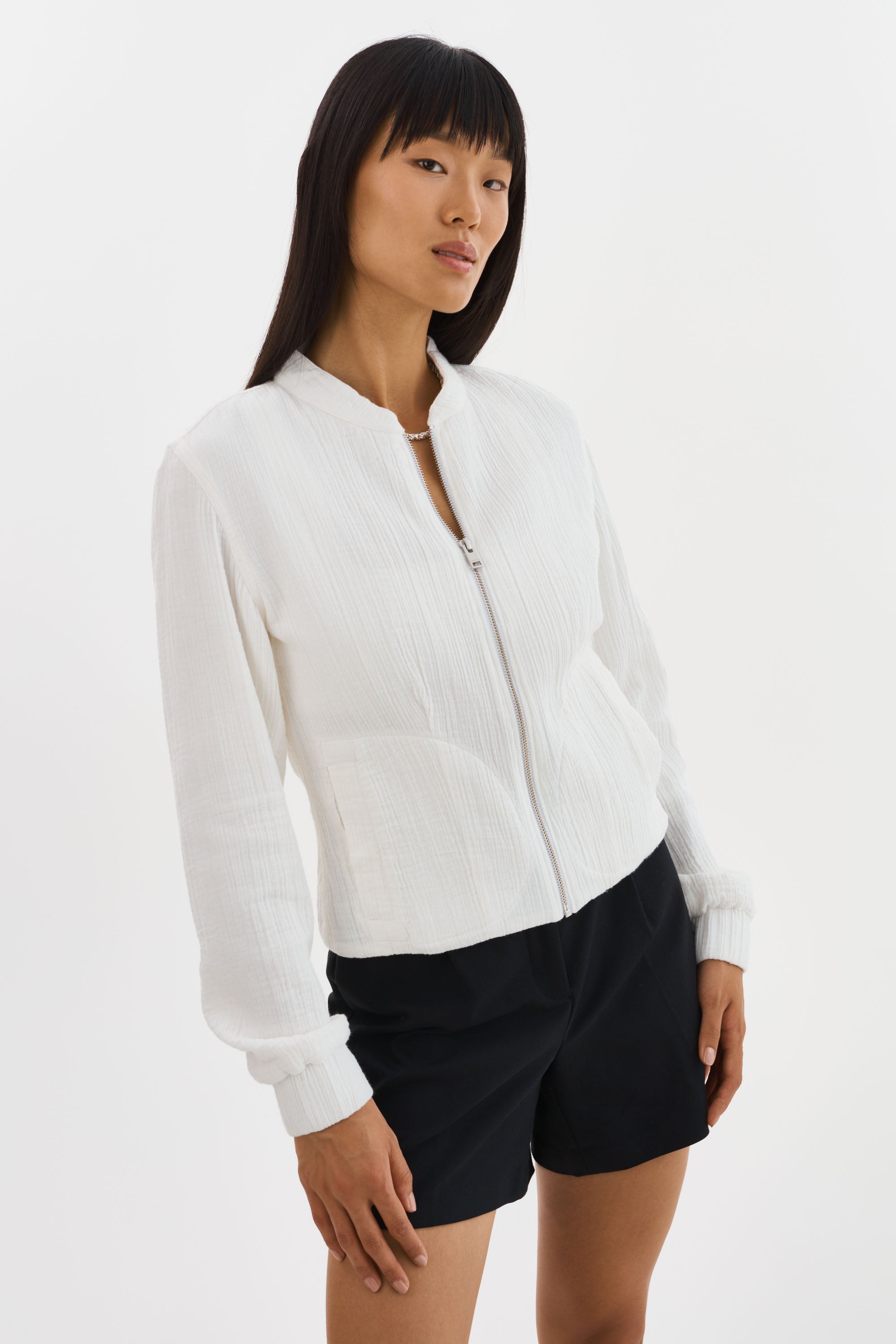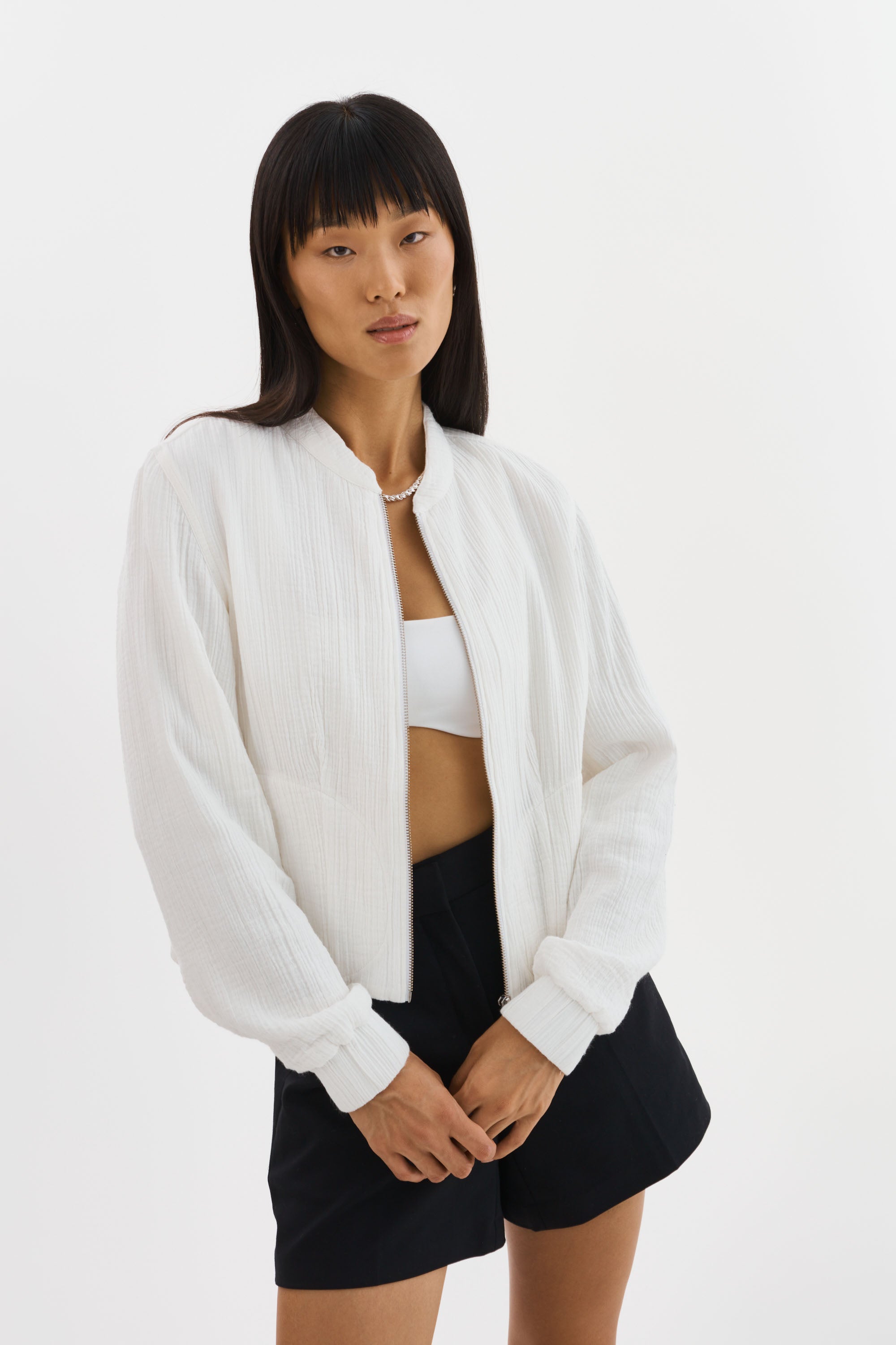 The ENRICA Cotton Bomber Jacket is a modern essential crafted for effortless style. With its sleek stand collar and elasticized cuffs, it offers a relaxed silhouette. Functional details such as the front zip closure and waist welt pocket provide versatility. Fully lined for comfort, it seamlessly transitions from day to night, making it the perfect choice during the warmer months.