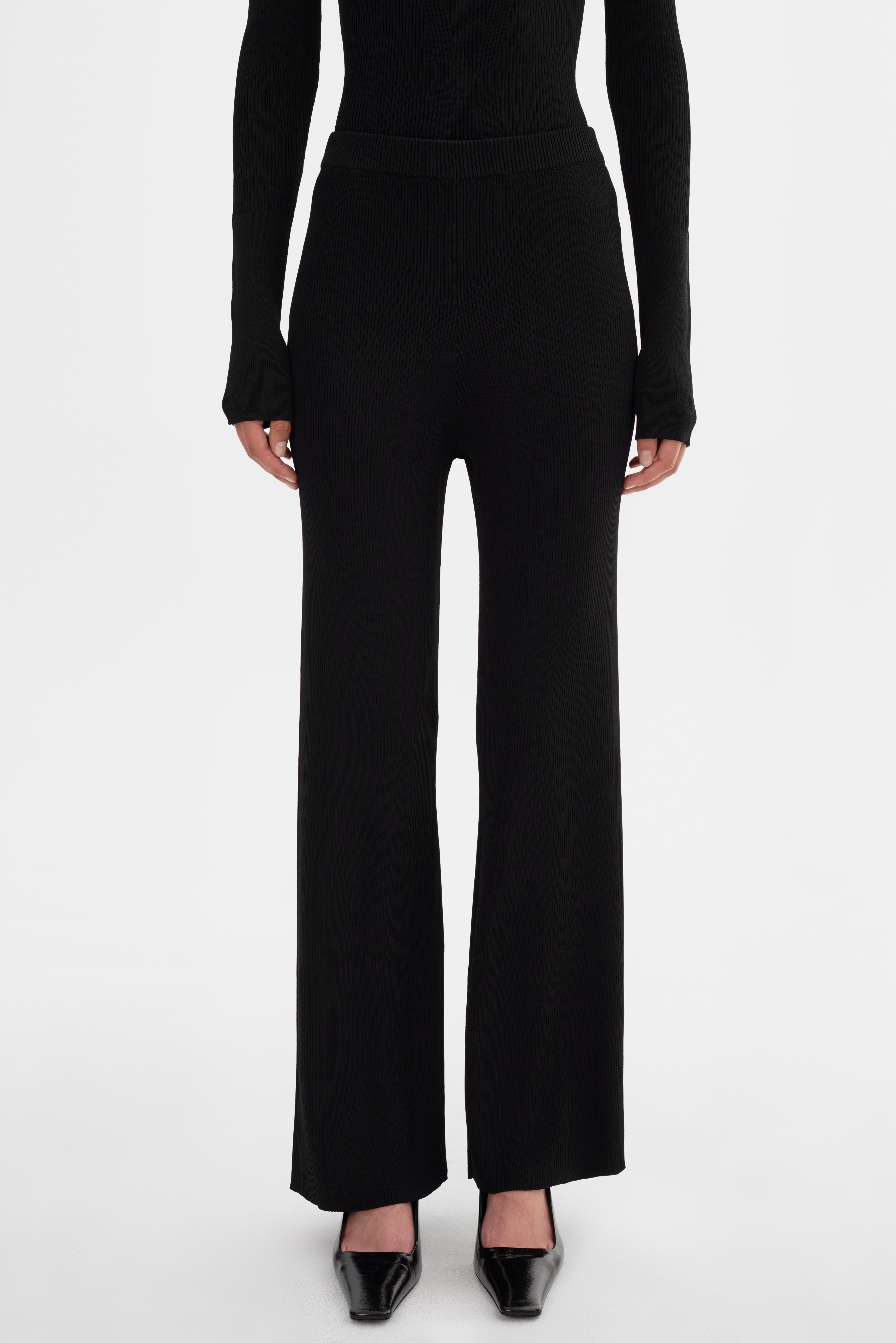 Effortlessly elevated. The ESMA Ribbed Knit Pants feature a fluid wide-leg silhouette crafted from a soft ribbed knit that moves with you. Designed with a comfortable elasticized waistband and minimal detailing, they offer a clean, elongating look perfect for styling up or down.