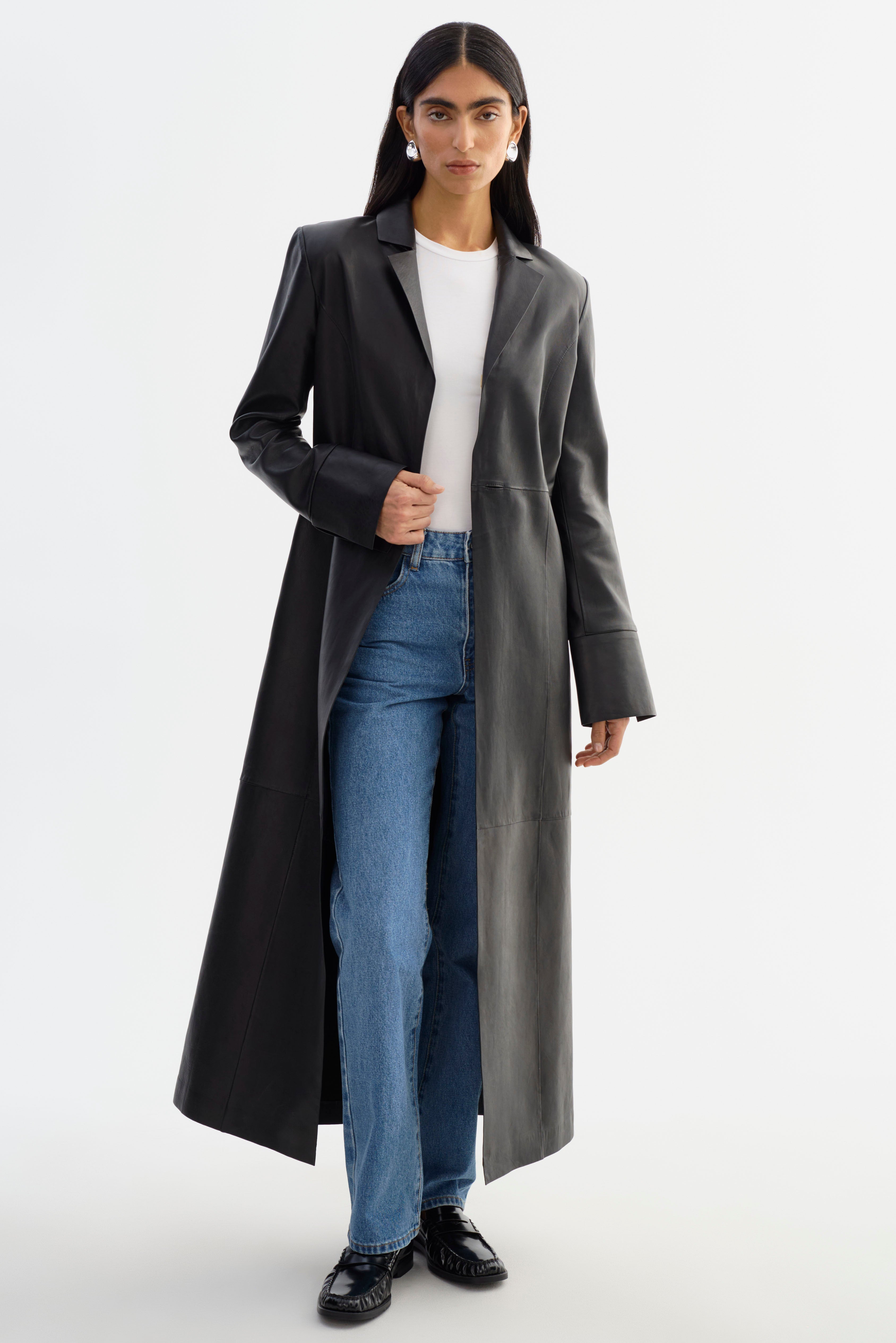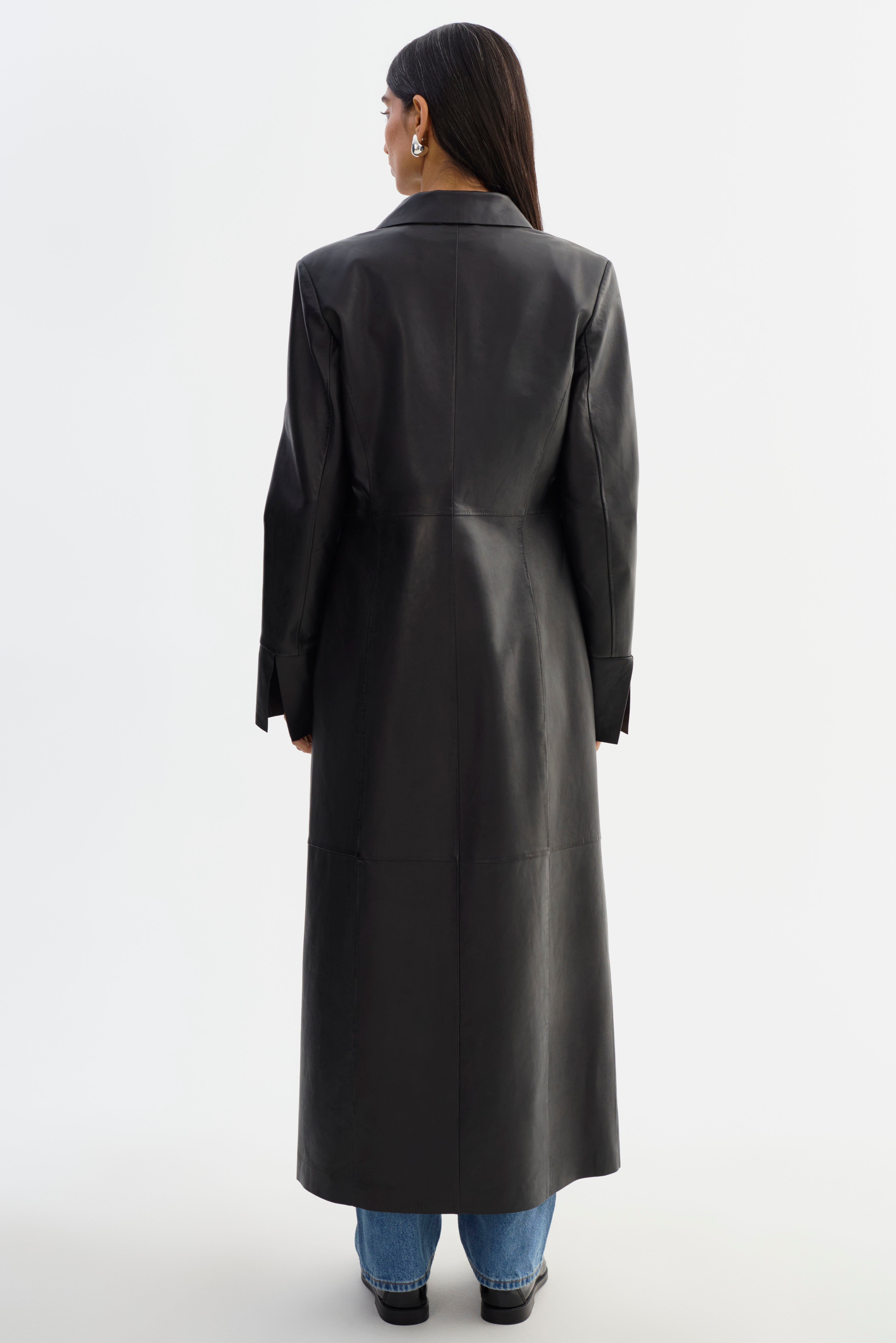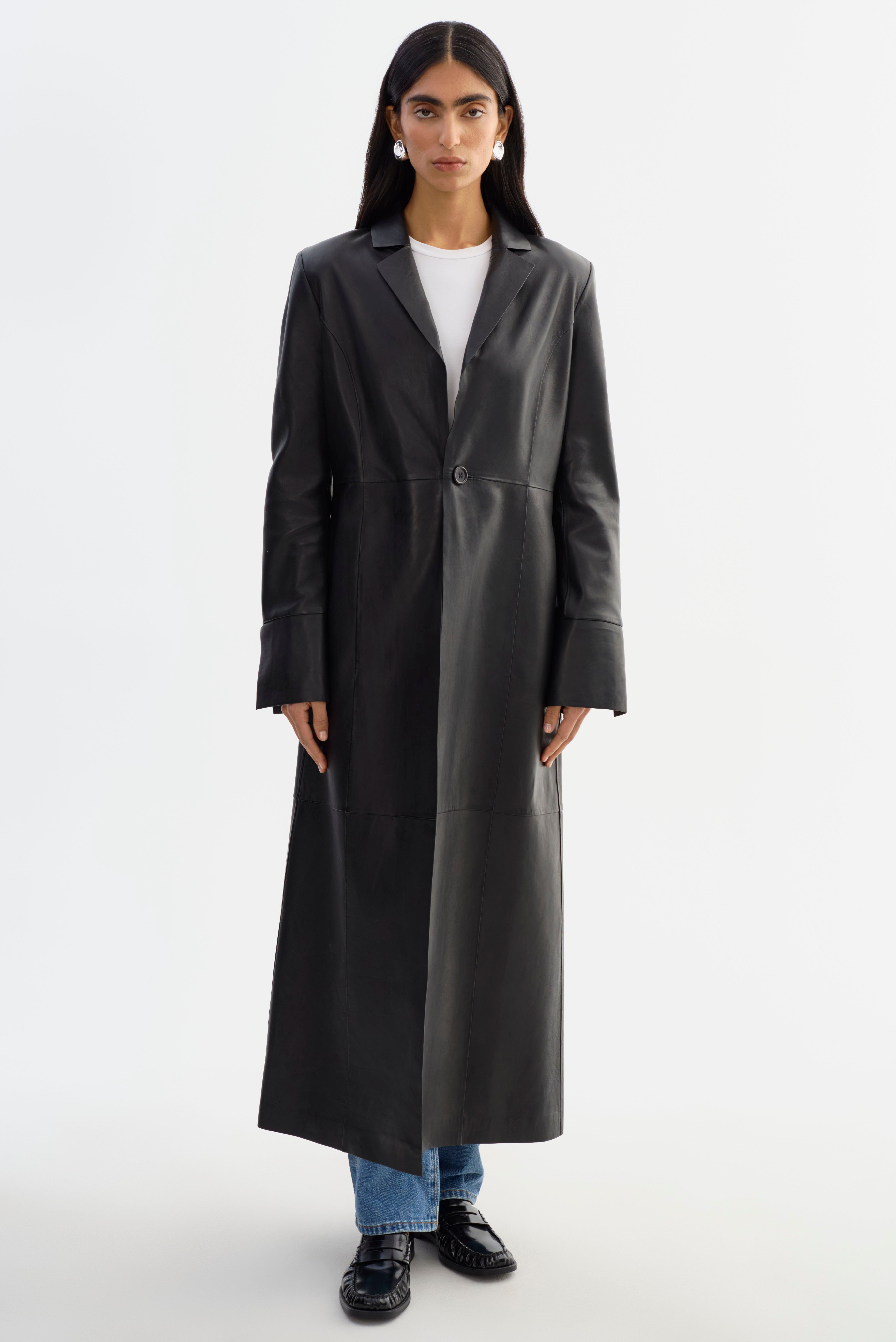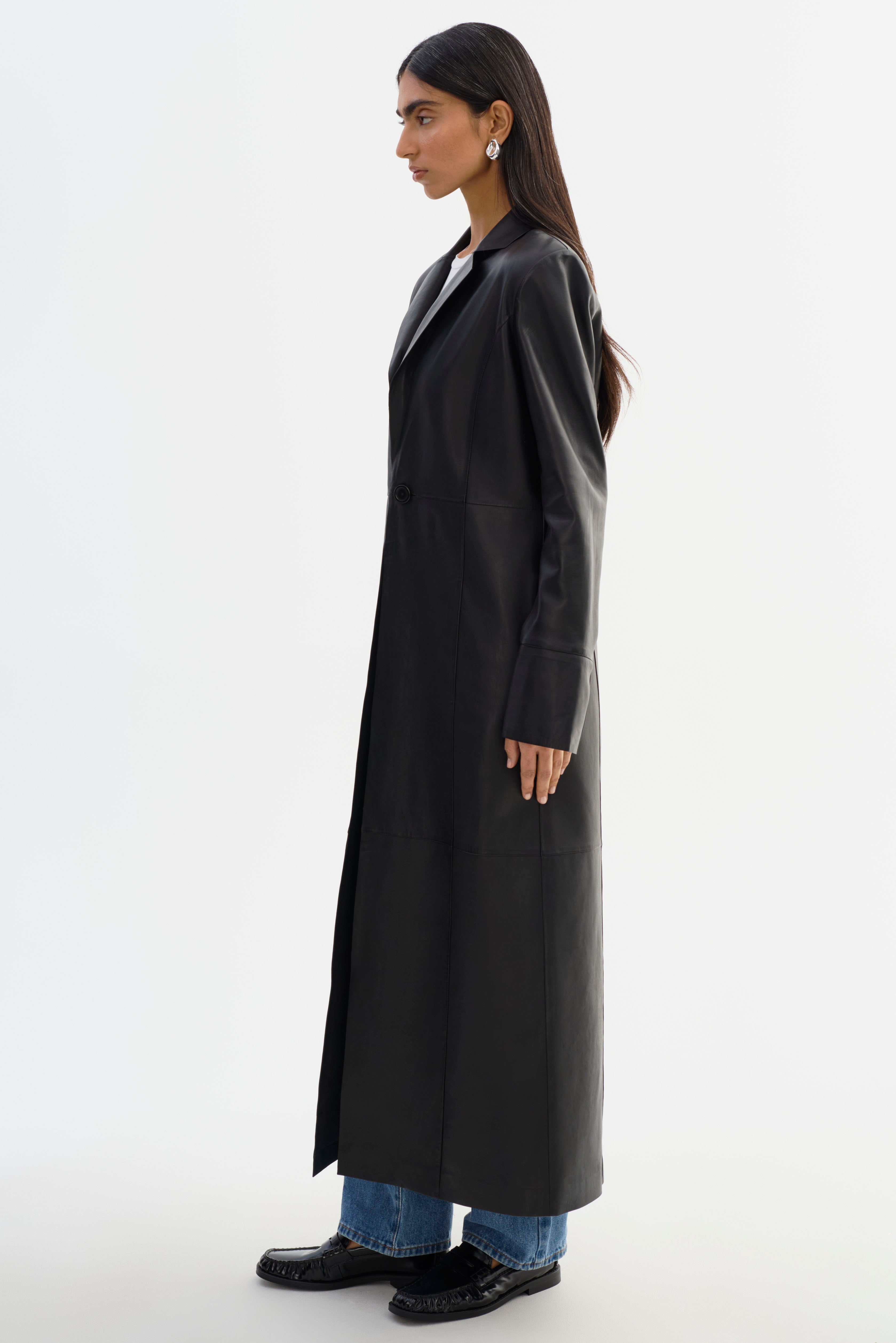 Step out in style with the Evanna Leather Maxi Coat. This single-breasted coat features lateral side slits, clean lines and minimalist details. Whether you're heading to a formal event or simply want to elevate your everyday look, the Evanna Leather Maxi Coat is the perfect choice.