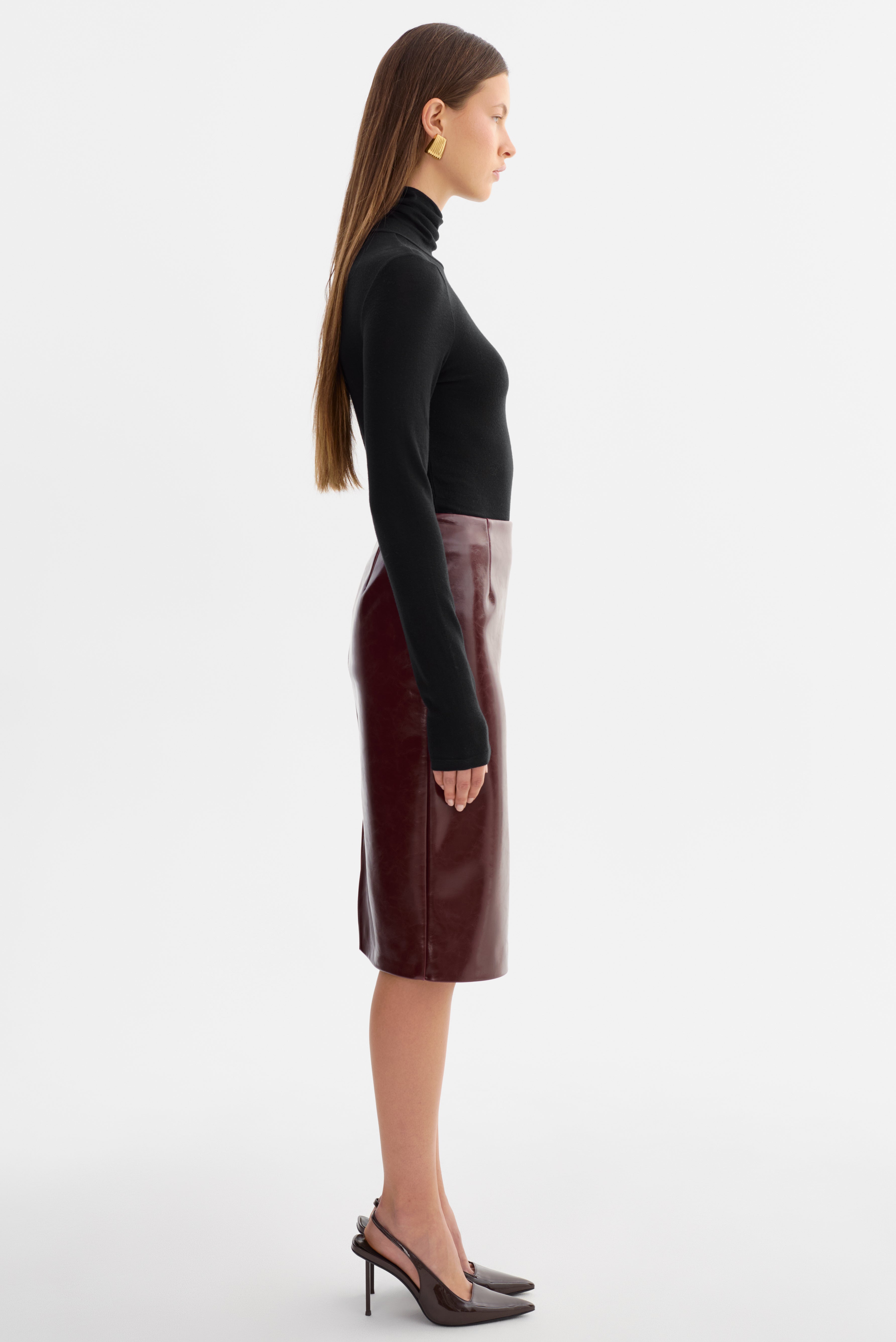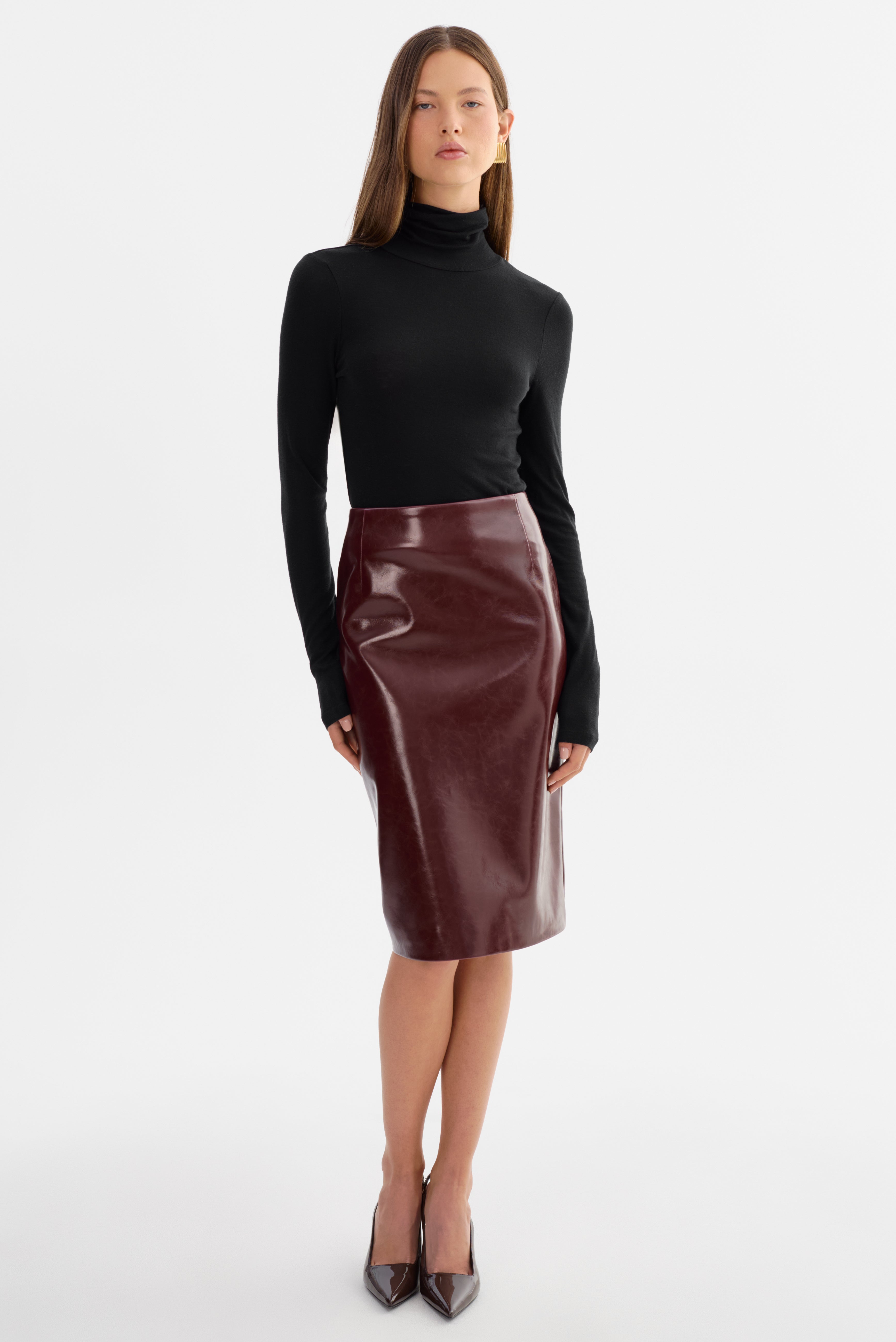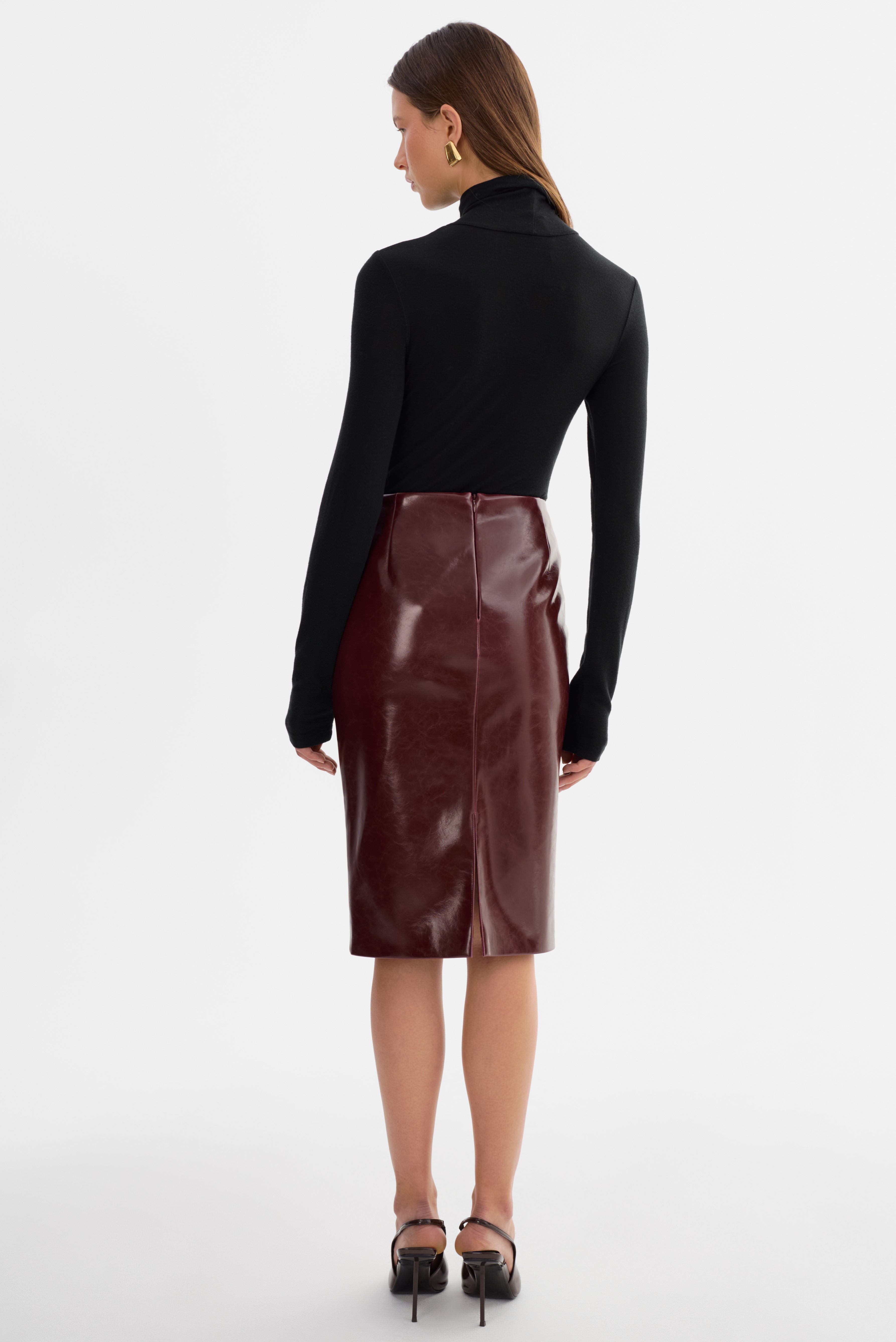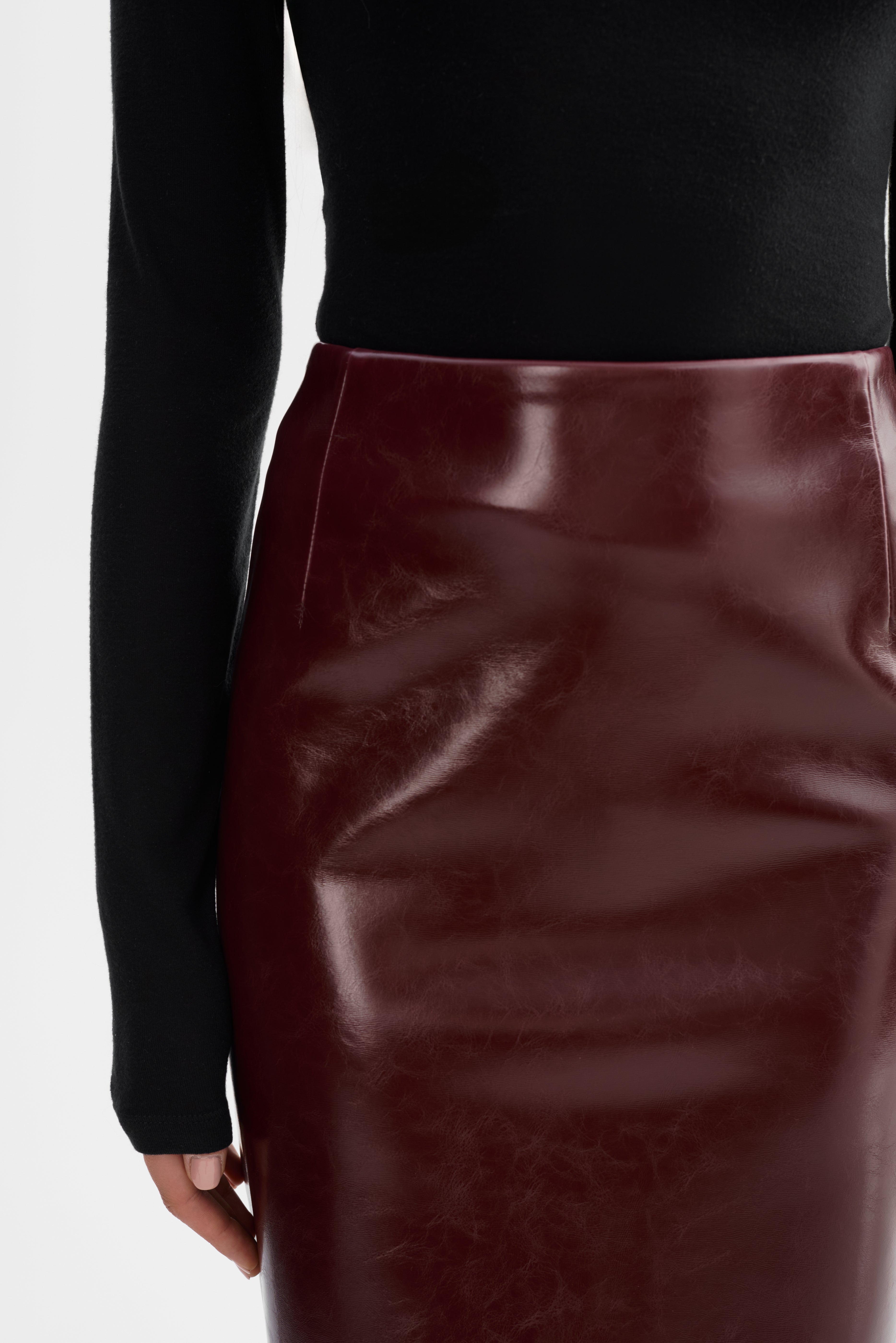 The GEORGIA Faux Patent Leather Pencil Skirt brings timeless sophistication with a modern edge. Designed in a fitted silhouette that falls below the knee, it's complete with a back slit and invisible zip closure for a refined finish. A versatile staple, it transitions seamlessly from office to evening styling.