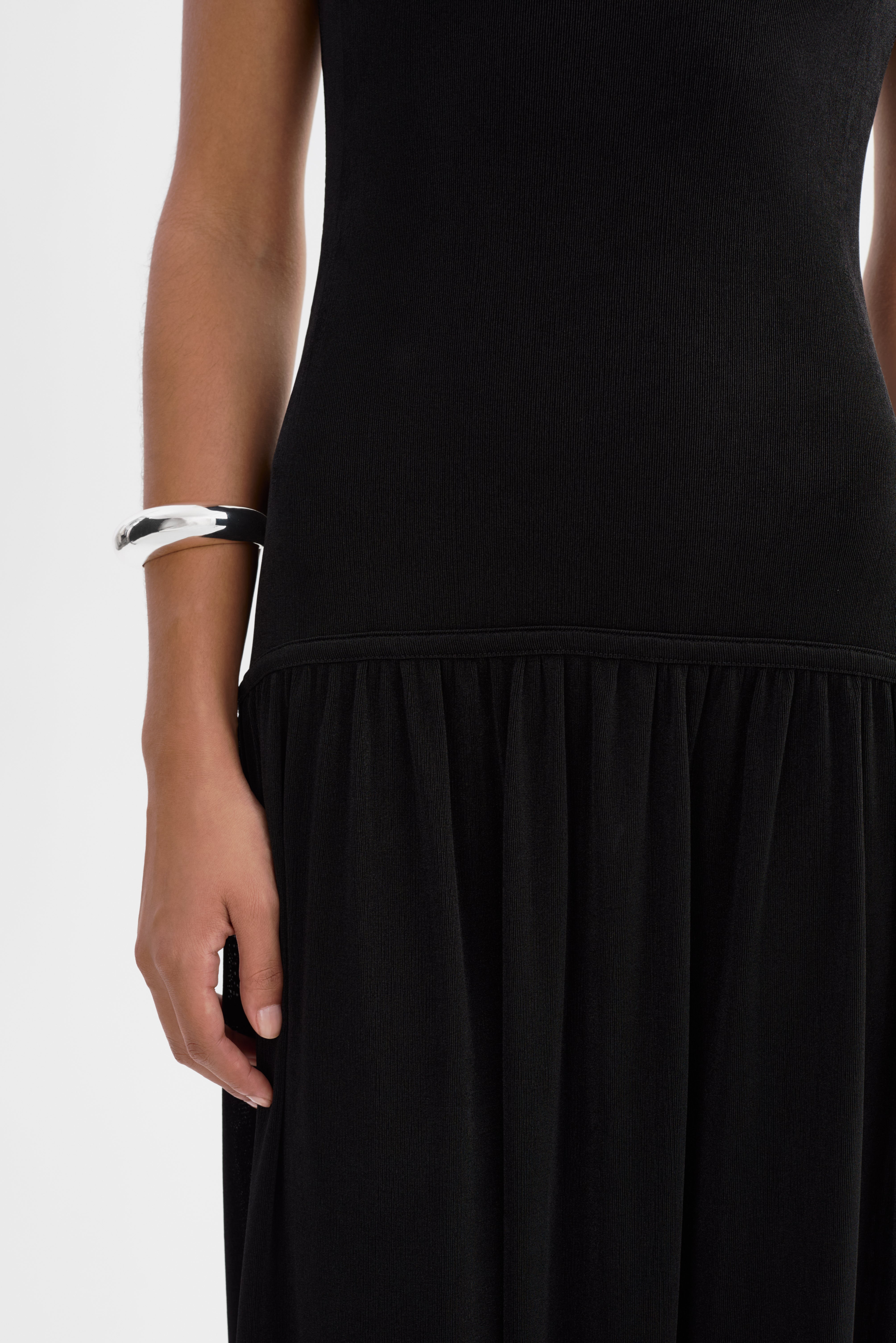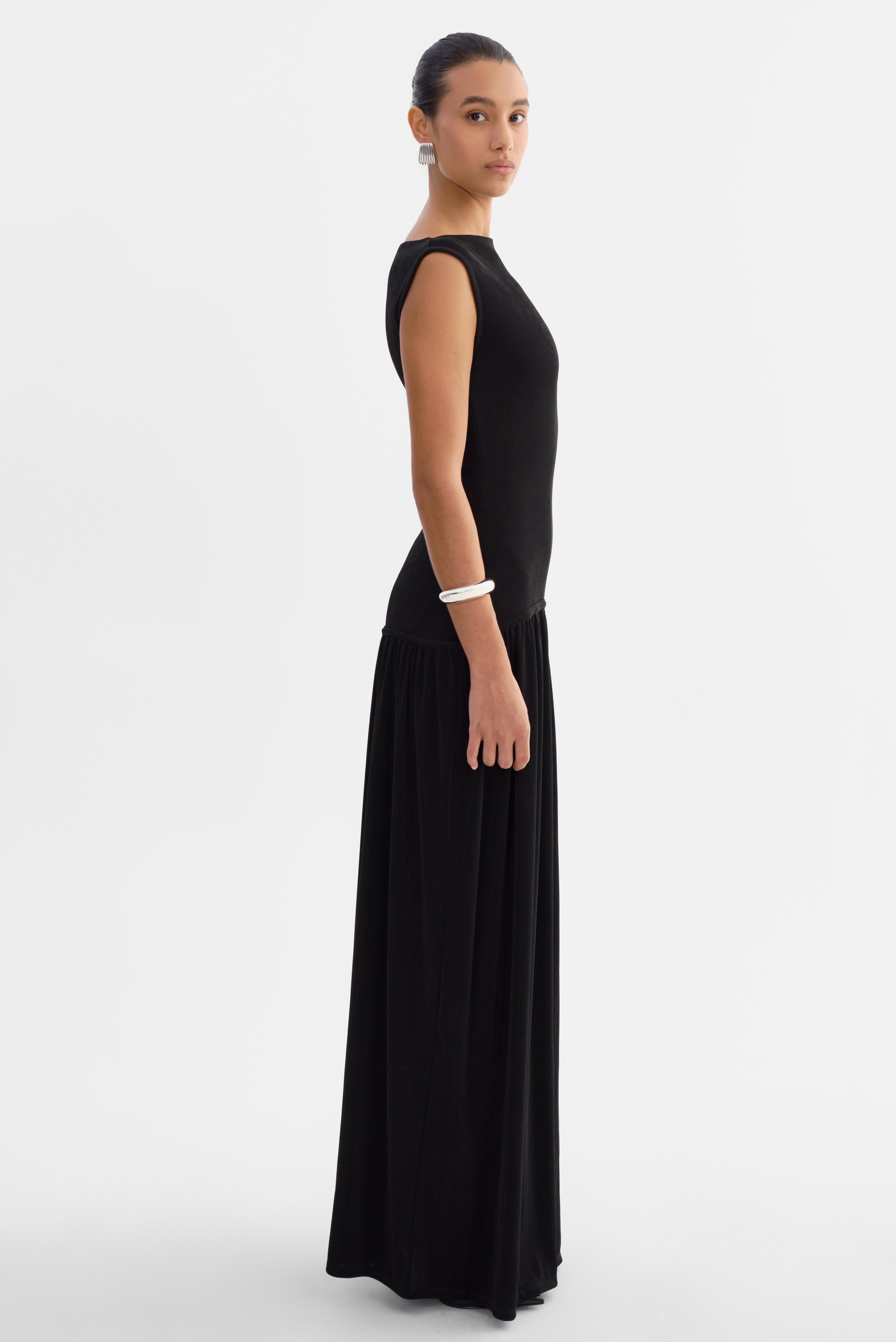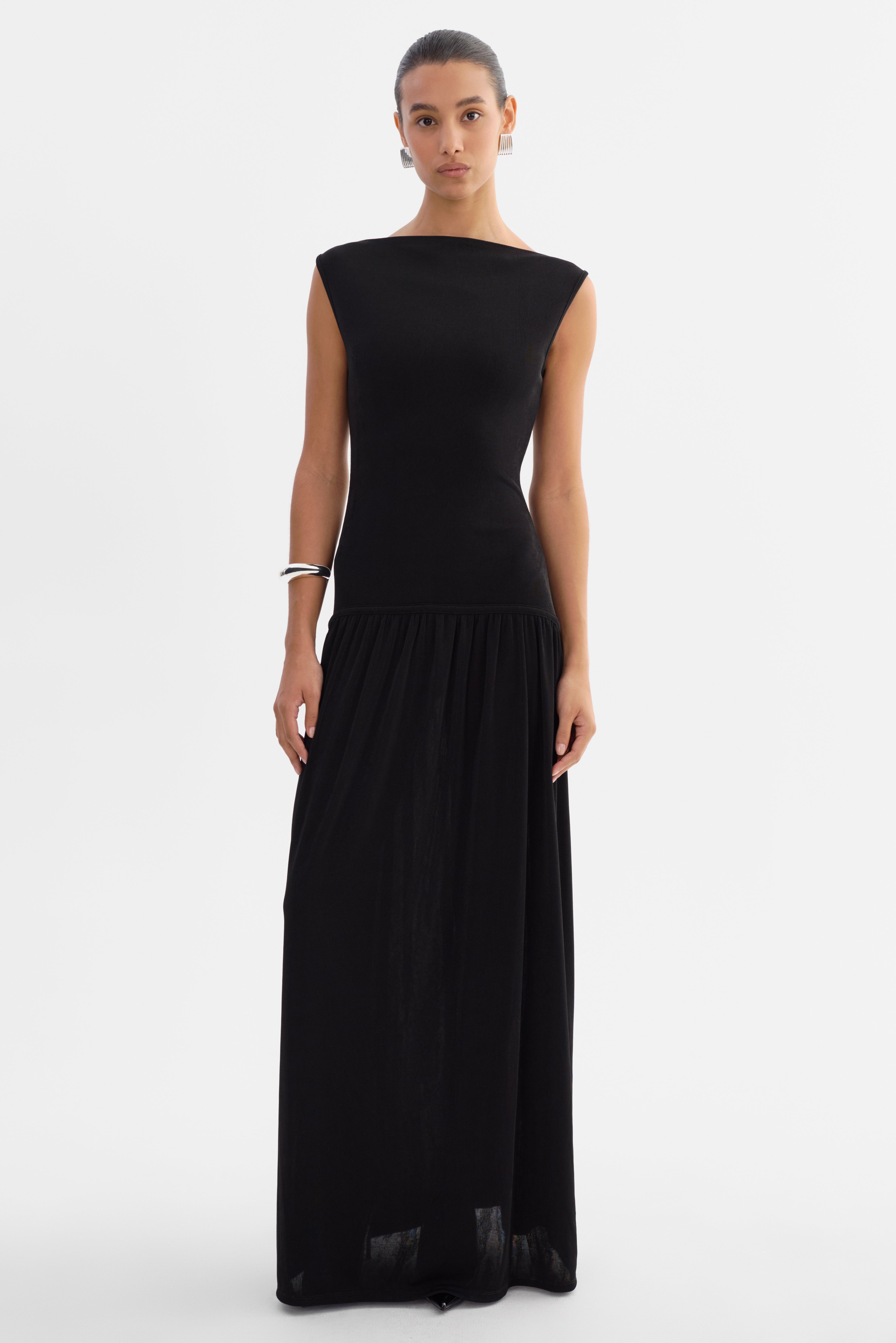The HANNA Knit Maxi Dress brings understated elegance with its fitted drop waist silhouette and fluid jersey drape. Designed with a sleeveless cut and boat neckline, it features delicate gathering at the hips for soft movement. Perfect for evening occasions, this style transitions seamlessly from dinner to after-hours.