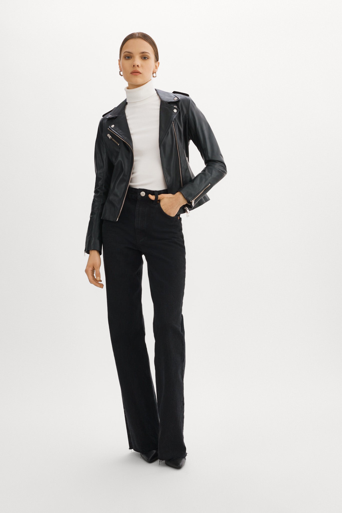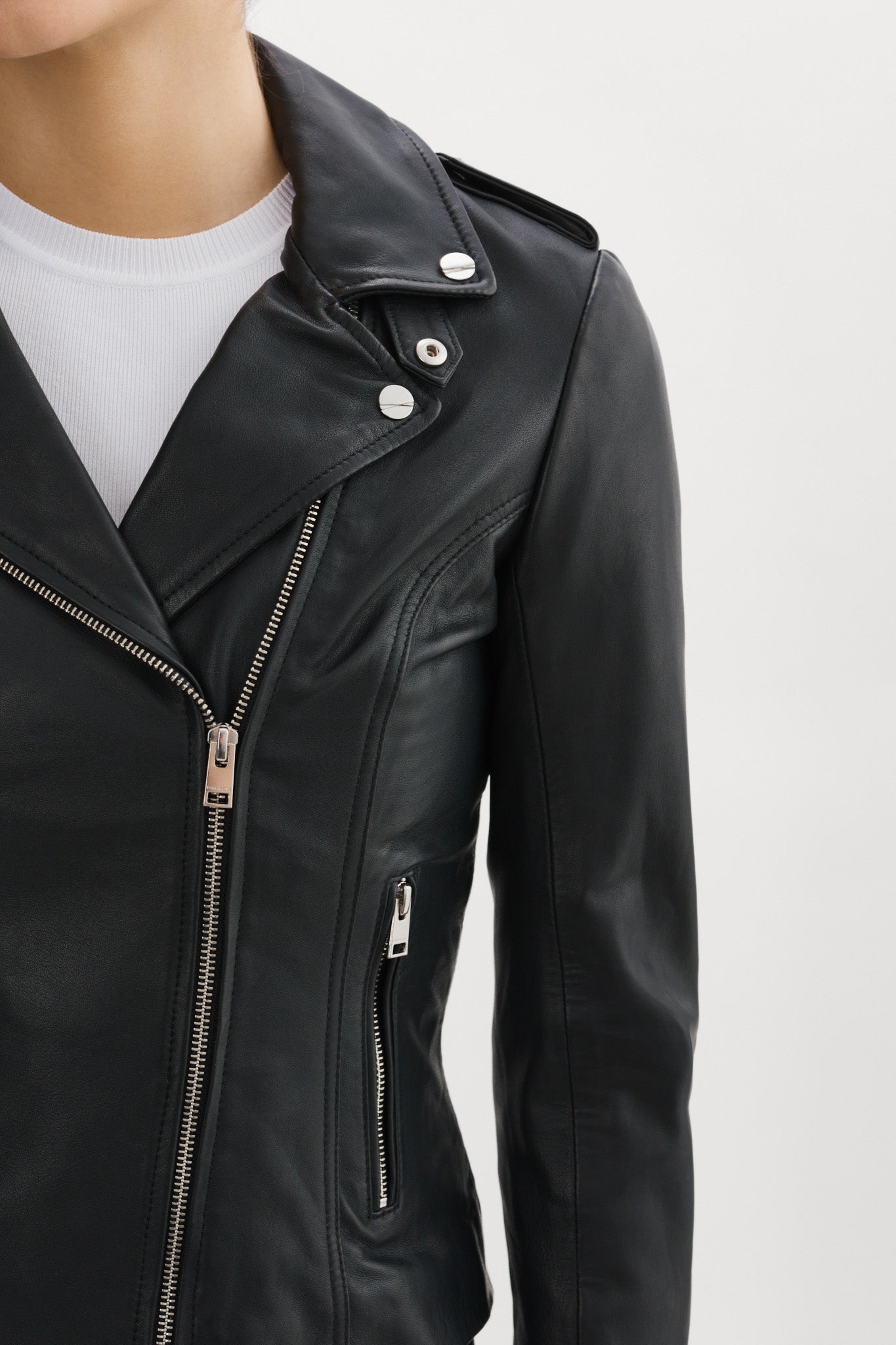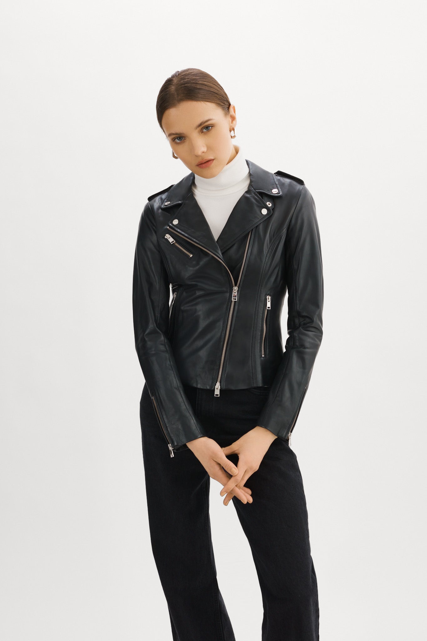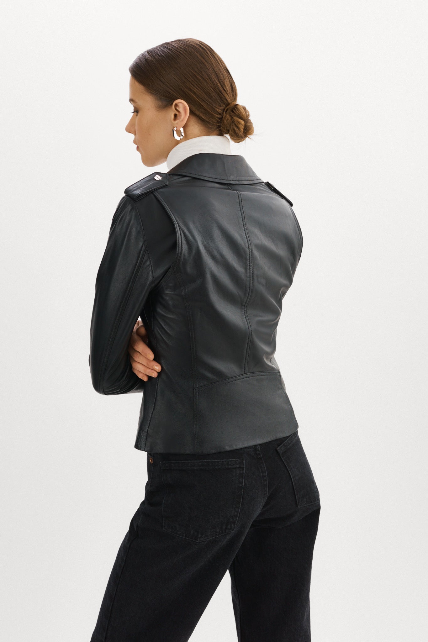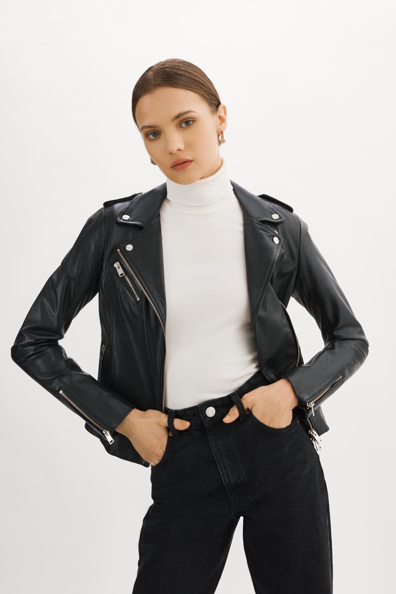 Walking the line between edgy and sophisticated, the Harper fitted leather biker jacket is the kind of top piece that looks like it was made for you. Coming in at the waist to create a flattering silhouette, its alluring fit is complemented by the classic elements of your favorite biker. Feature sleeve zippers, snap epaulets, and a diagonal closure, the Harper flawlessly borrows from the most sought-after styles. Make an entrance in this premium lamb’s leather stunner.