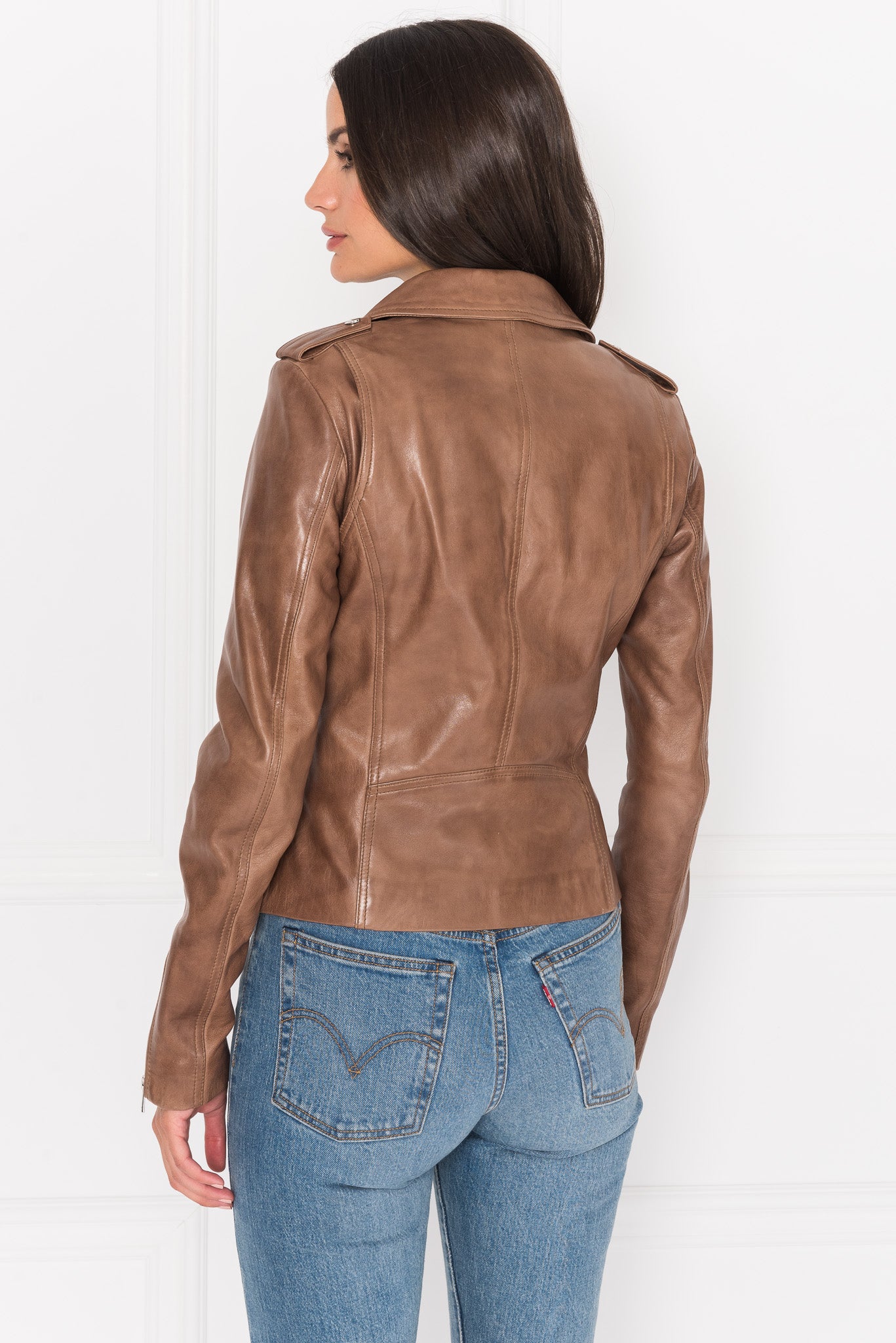Walking the line between edgy and sophisticated, the Harper fitted leather biker jacket is the kind of top piece that looks like it was made for you. Coming in at the waist to create a flattering silhouette, its alluring fit is complemented by the classic elements of your favorite biker. Feature sleeve zippers, snap epaulets, and a diagonal closure, the Harper flawlessly borrows from the most sought-after styles. Make an entrance in this premium lamb’s leather stunner.