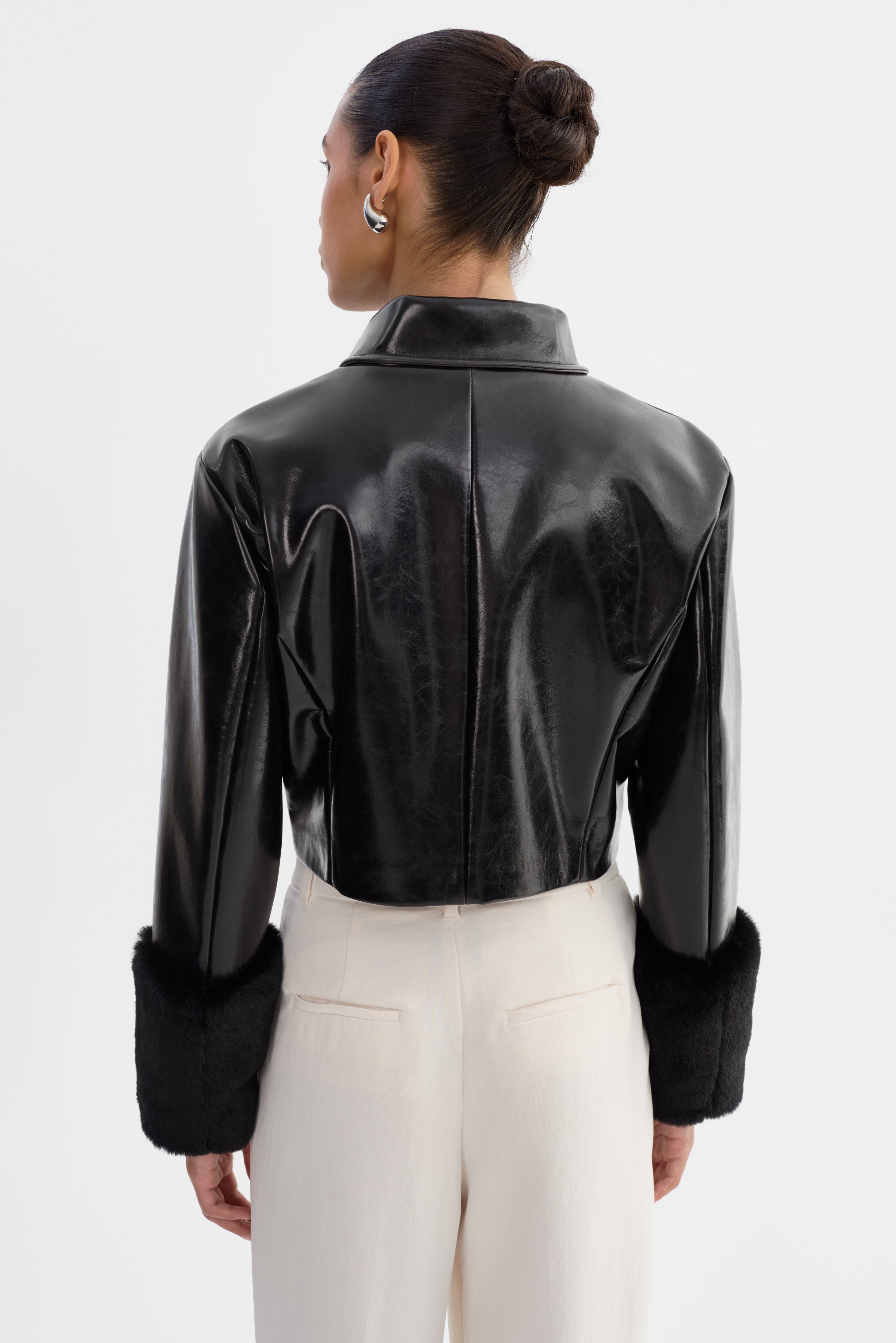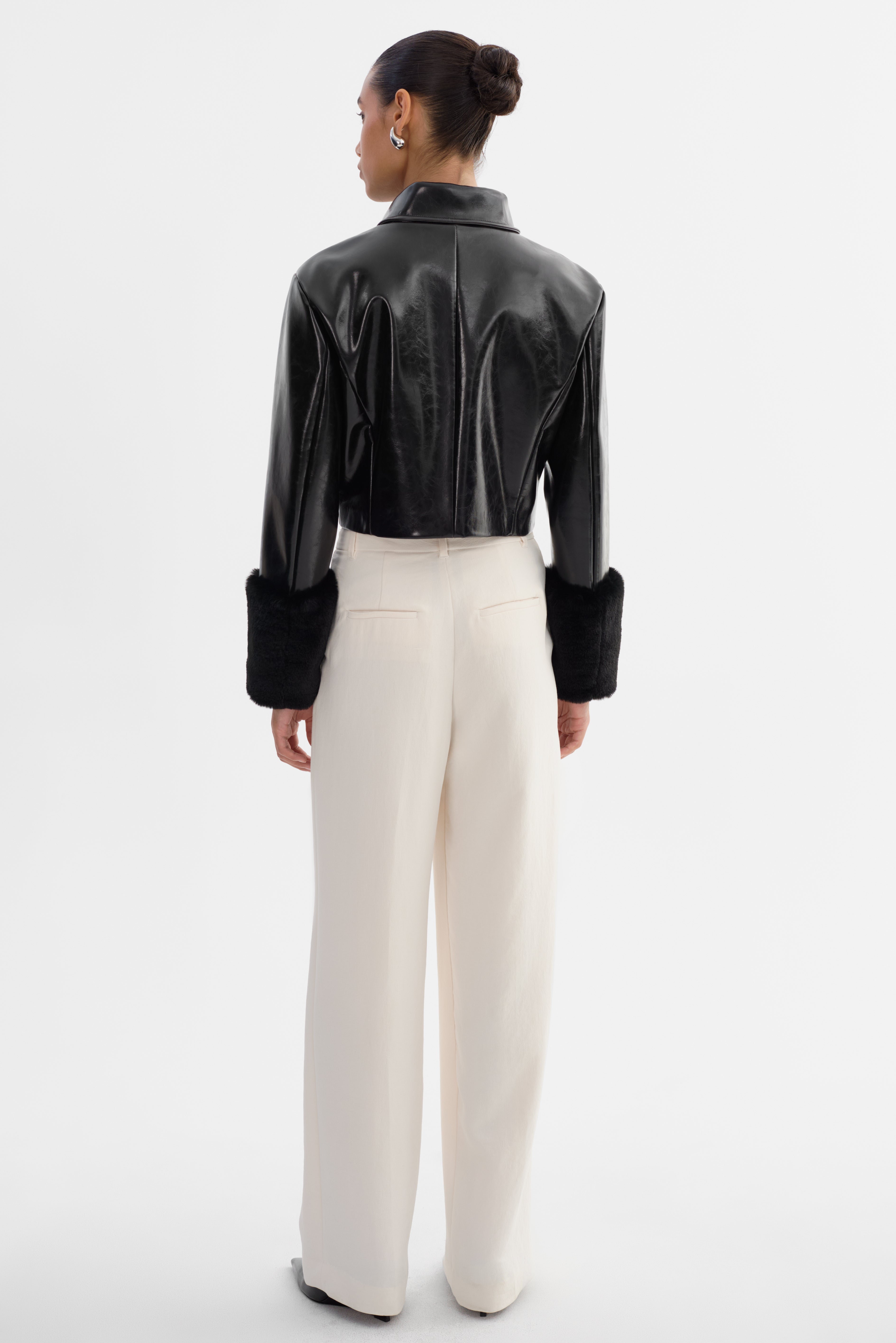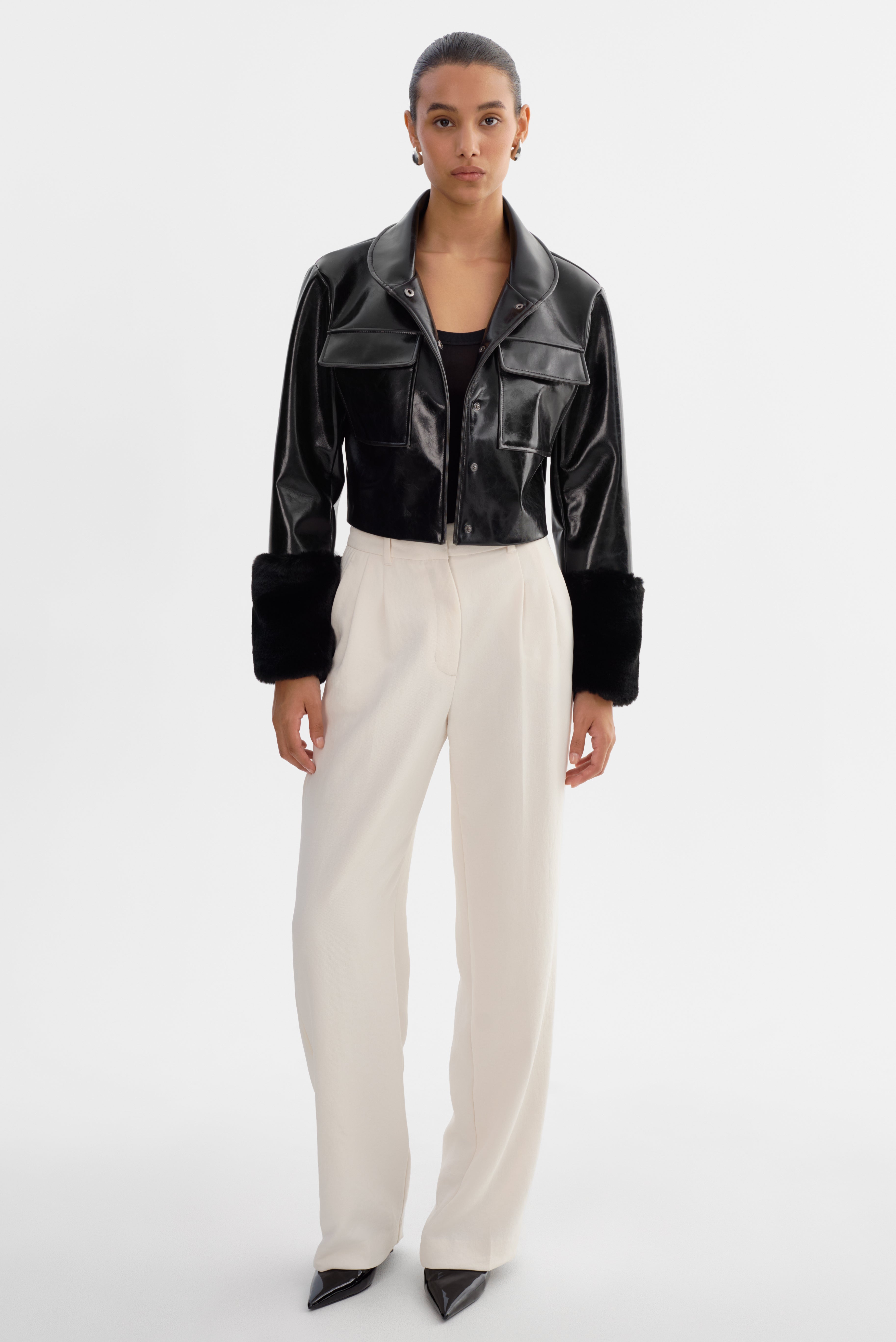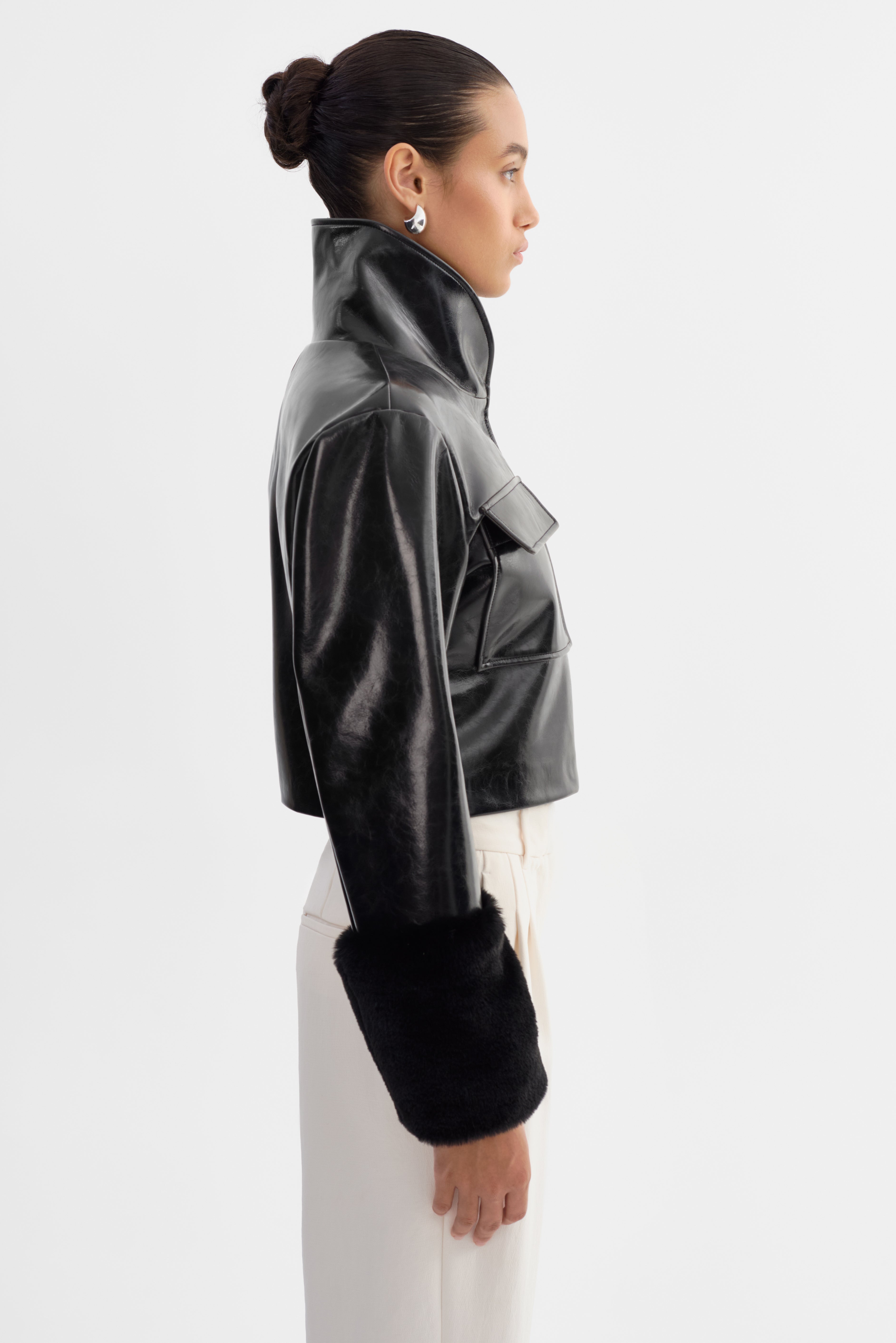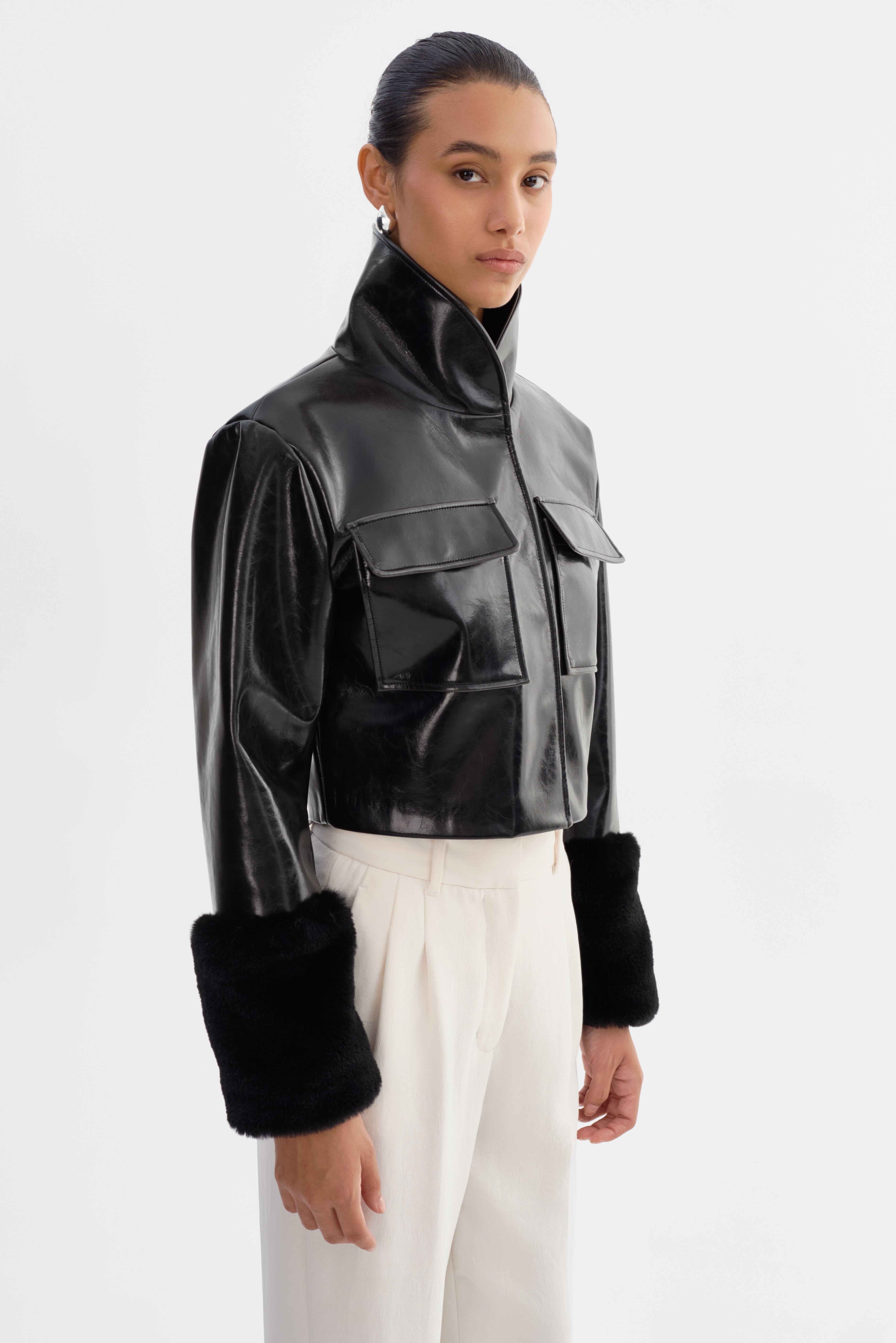 The HEDDA Cropped Leather Jacket plays with proportion through its cropped length and bold details. Designed with a high stand collar, oversized patch pockets, and plush faux fur cuffs, it balances sleek structure with soft volume. Pair it with high-rise trousers or a sleek skirt for a statement finish.