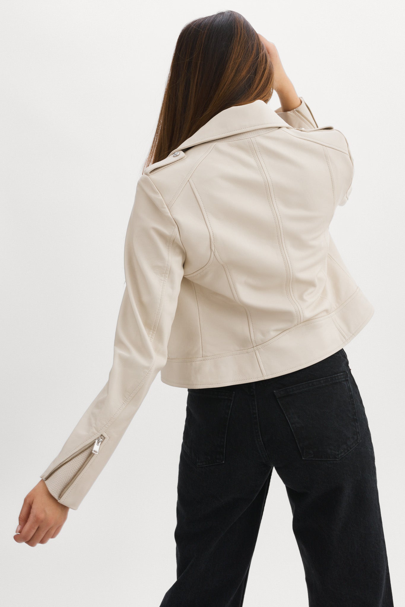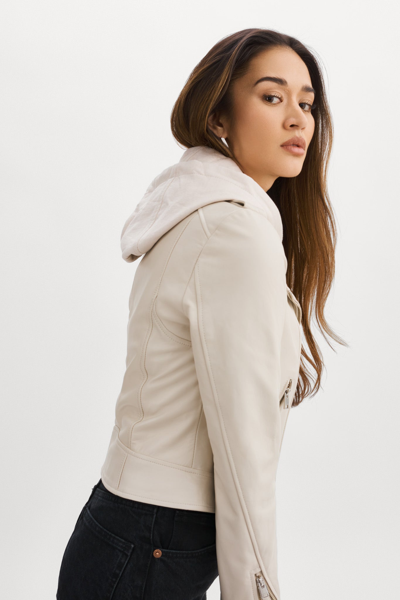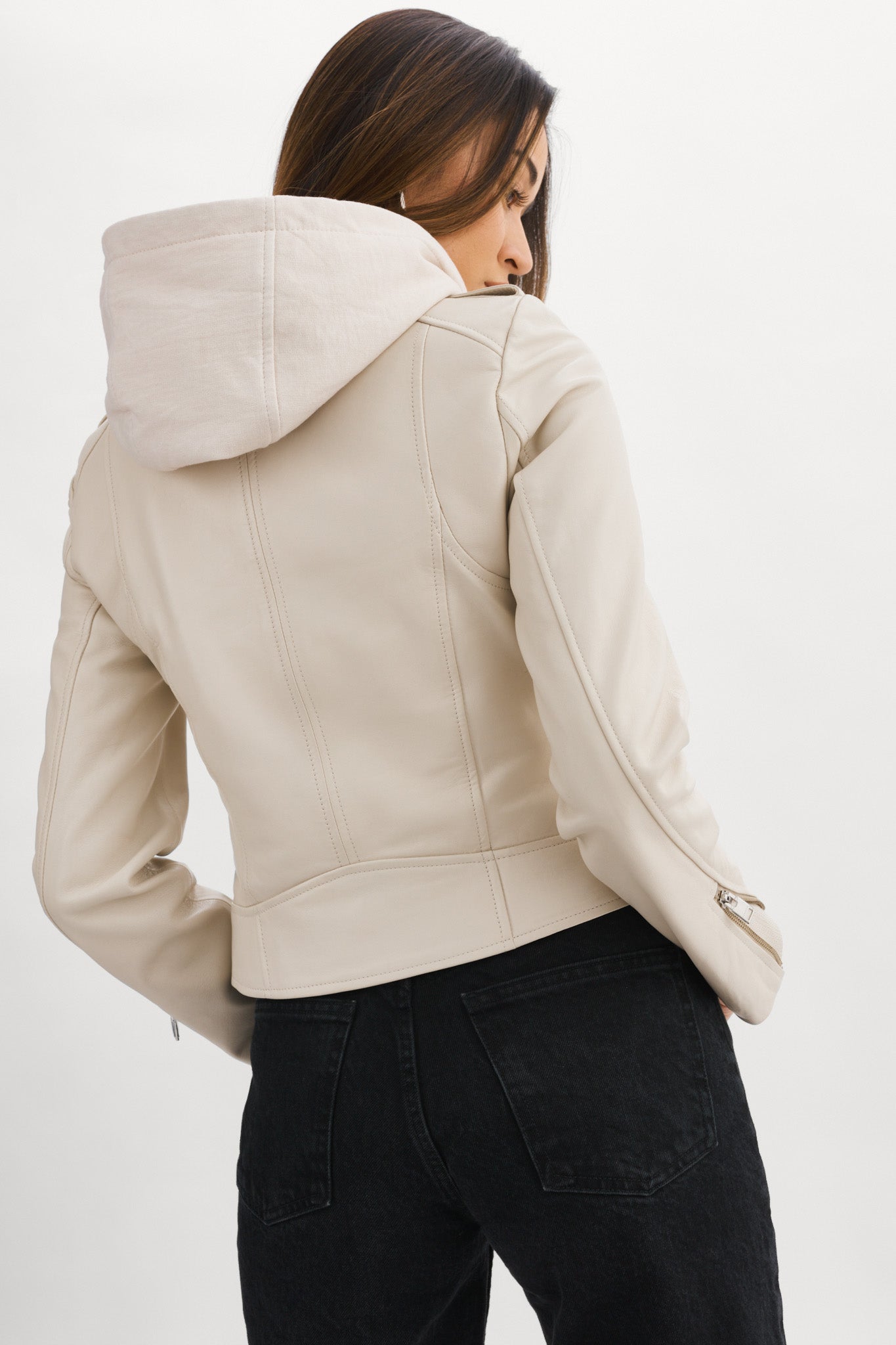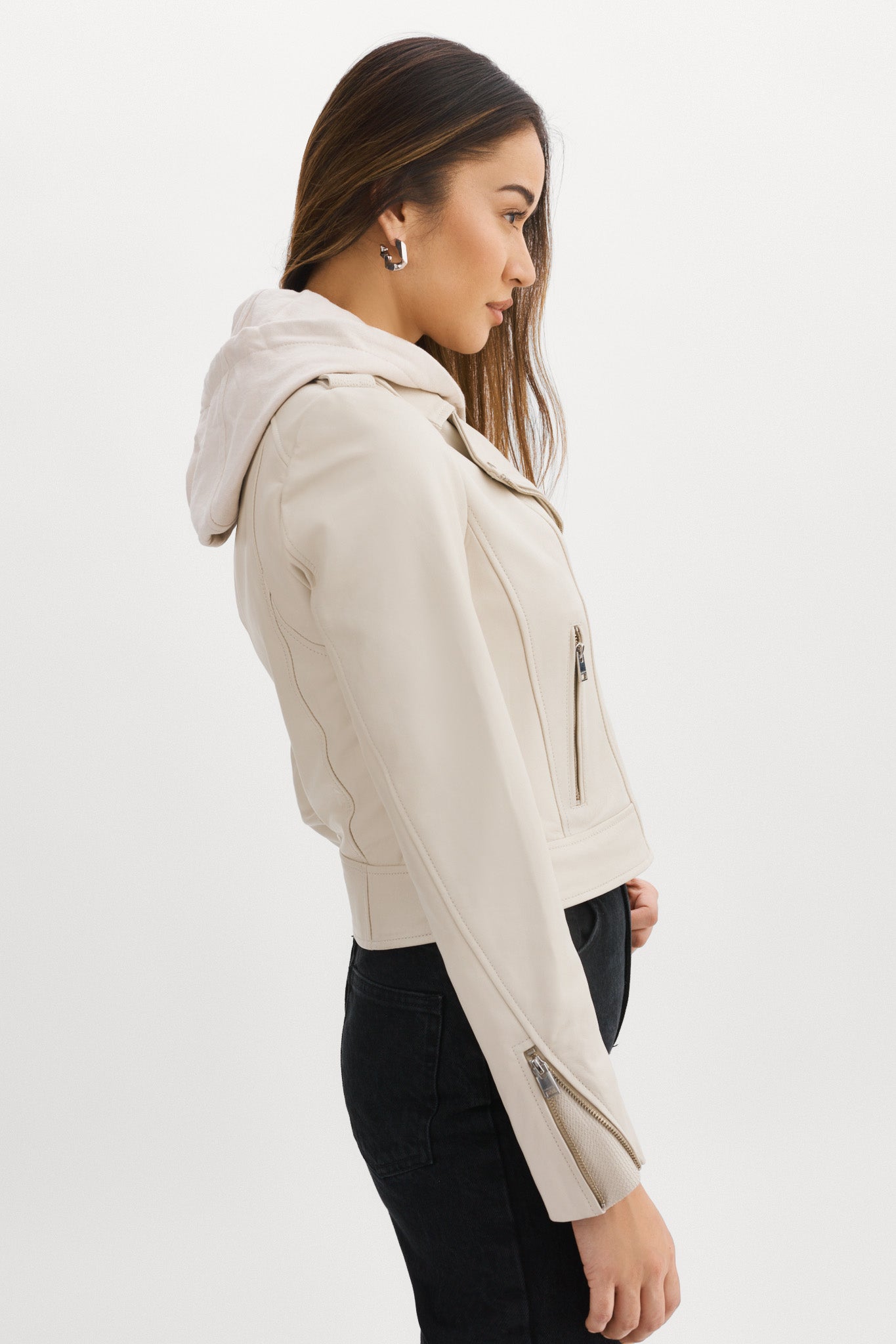 Step out in the iconic fit that refuses to go out of style. Complete with a fall-ready removable hood, the Holy leather jacket brings a feminine touch to the edgy biker aesthetic. Featuring an asymmetrical closure, a wide collar with crips silver snaps, and a buttery-soft lamb's leather body, this versatile stunner knows no limits. Opt for the gorgeously unique biker jacket that only gets more alluring over time.