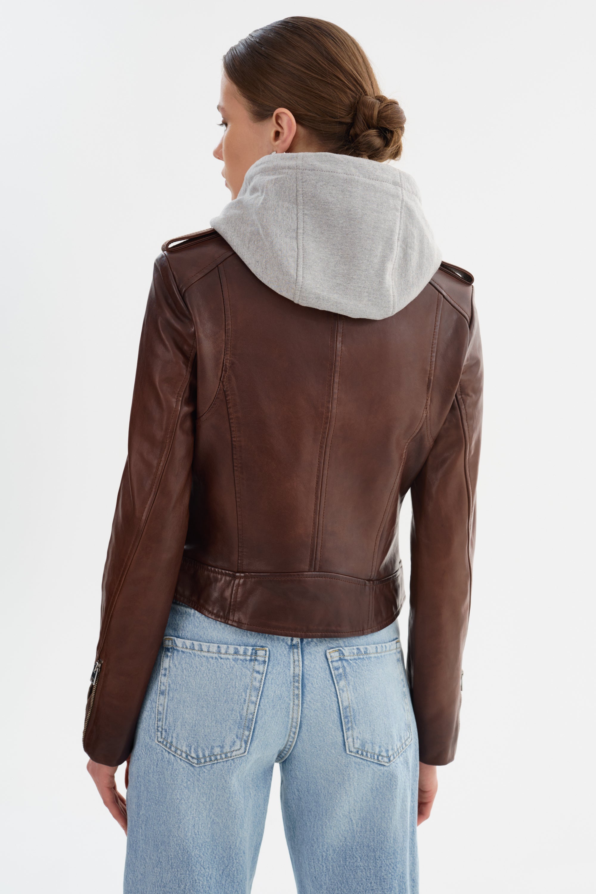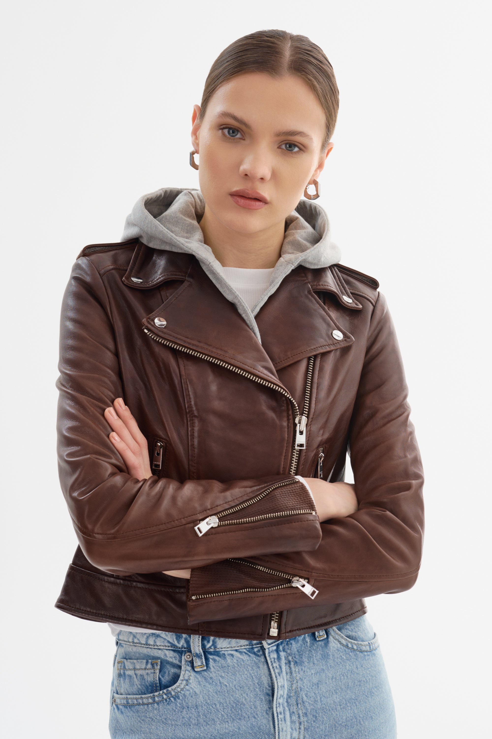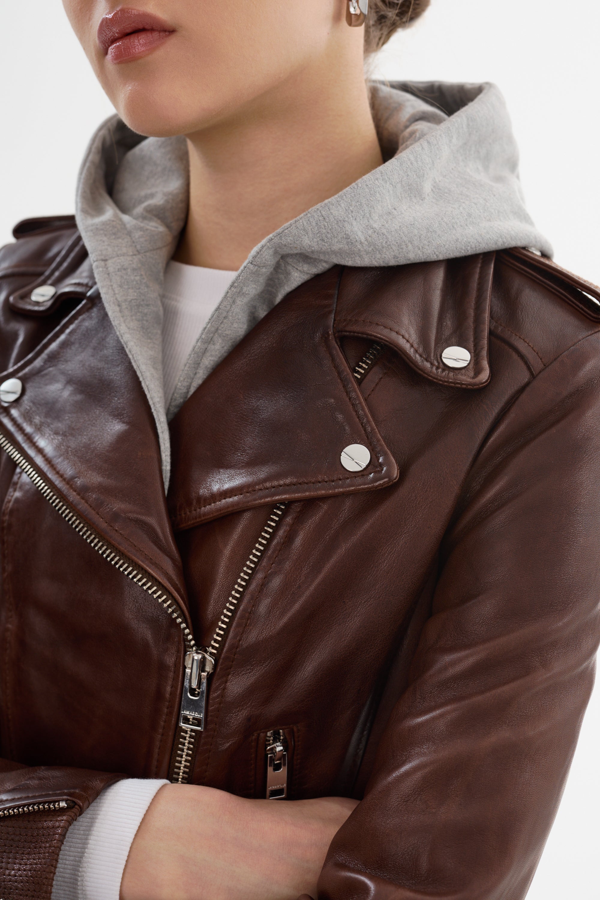 Step out in the iconic fit that refuses to go out of style. Complete with a fall-ready removable hood, the Holy leather jacket brings a feminine touch to the edgy biker aesthetic. Featuring an asymmetrical closure, a wide collar with crips silver snaps, and a buttery-soft lamb's leather body, this versatile stunner knows no limits. Opt for the gorgeously unique biker jacket that only gets more alluring over time.