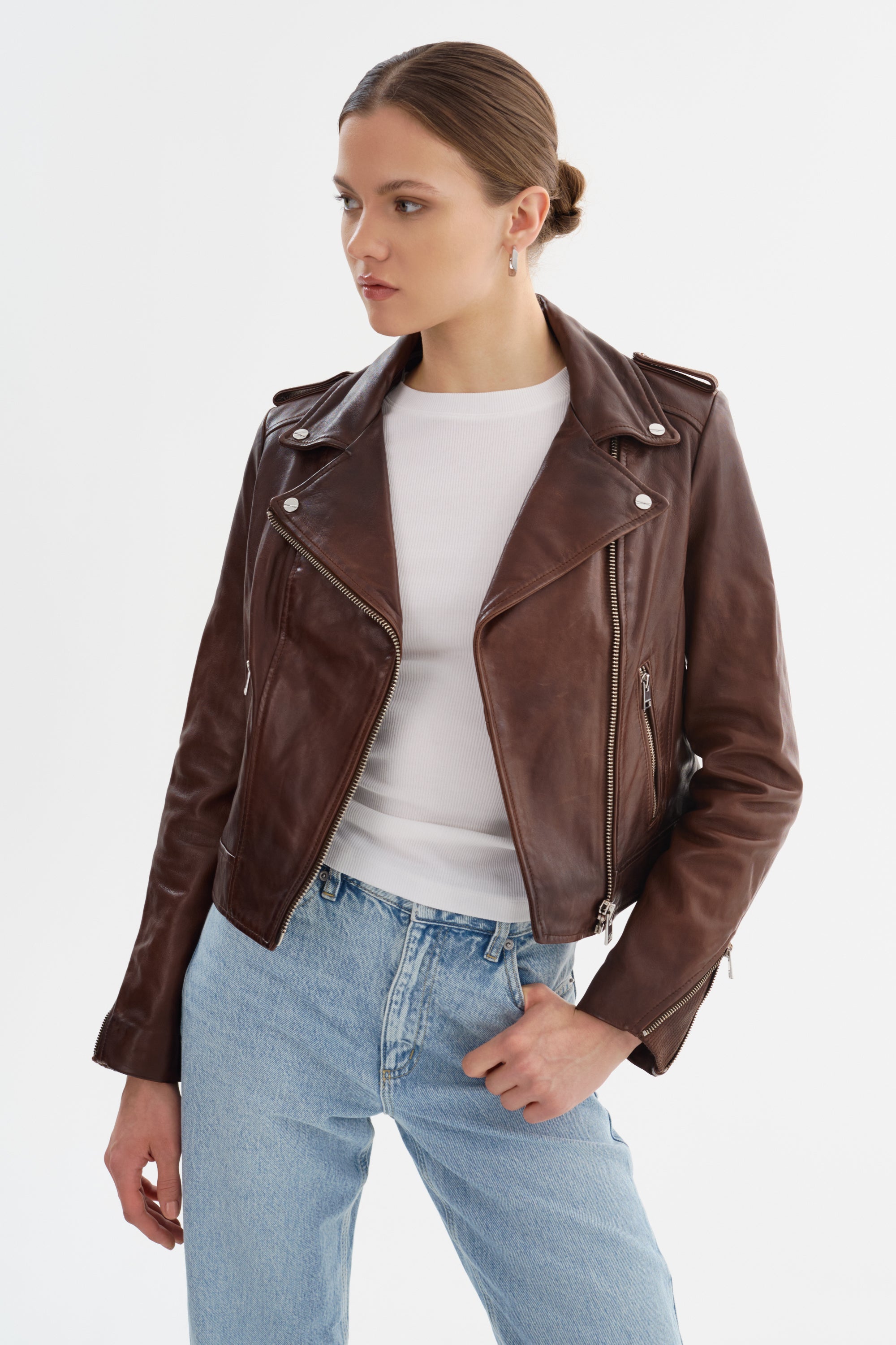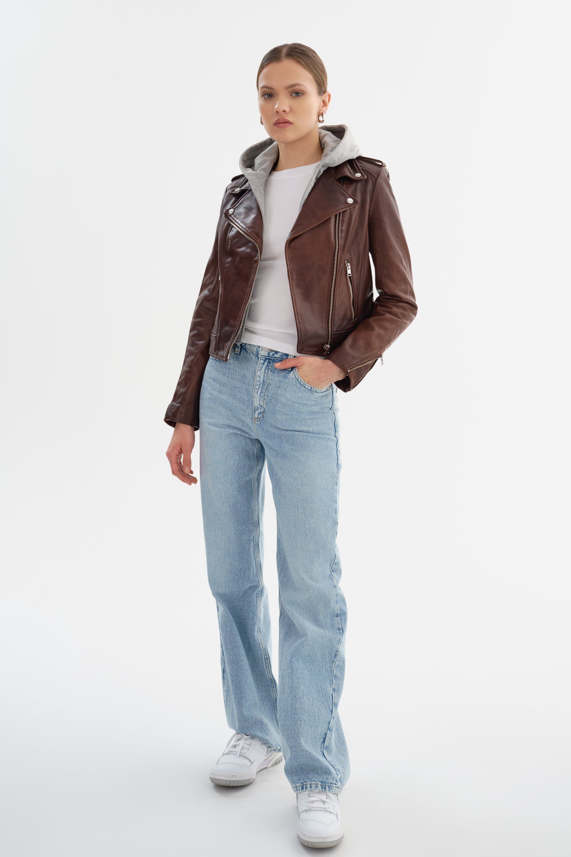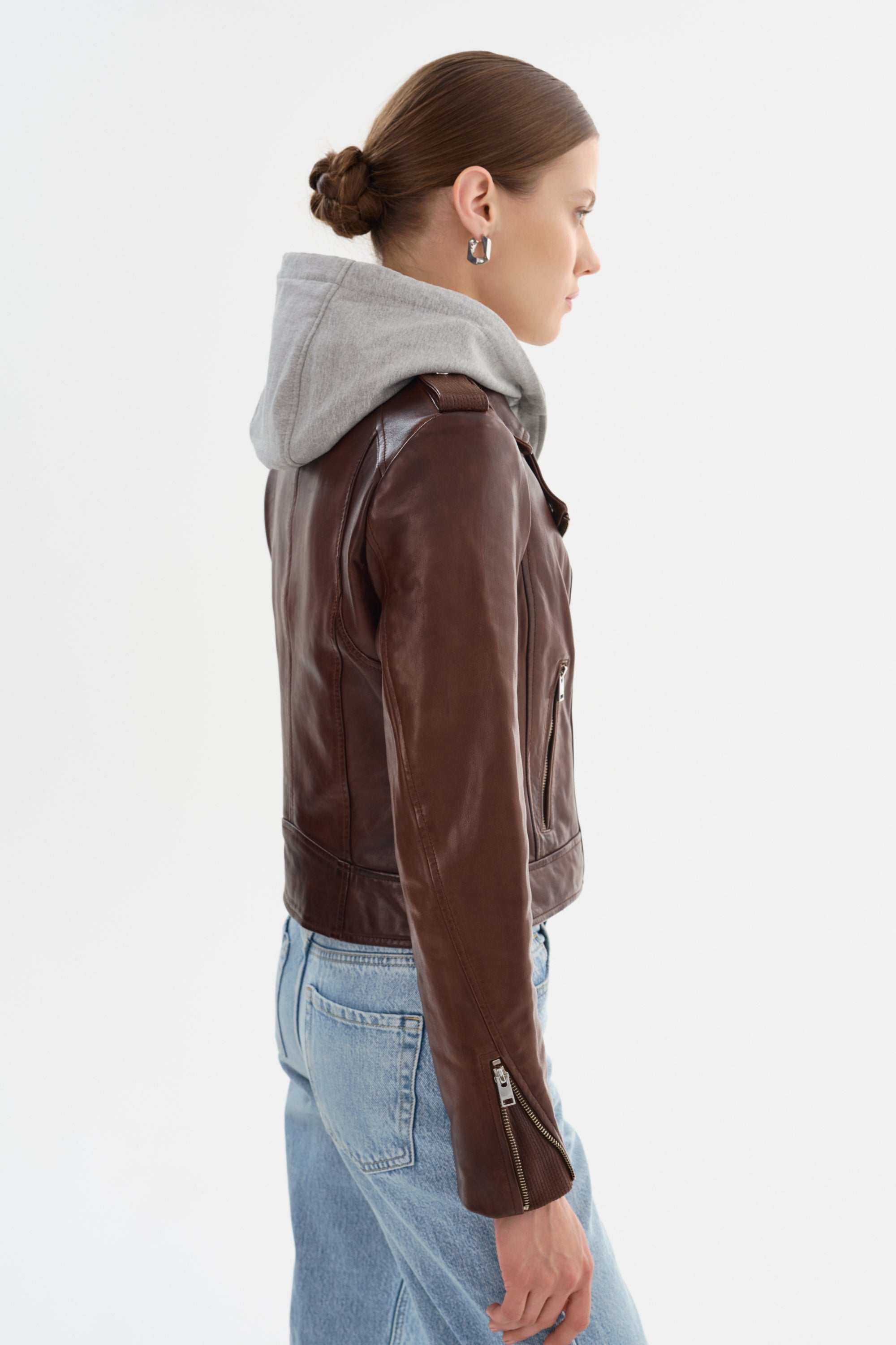 Step out in the iconic fit that refuses to go out of style. Complete with a fall-ready removable hood, the Holy leather jacket brings a feminine touch to the edgy biker aesthetic. Featuring an asymmetrical closure, a wide collar with crips silver snaps, and a buttery-soft lamb's leather body, this versatile stunner knows no limits. Opt for the gorgeously unique biker jacket that only gets more alluring over time.