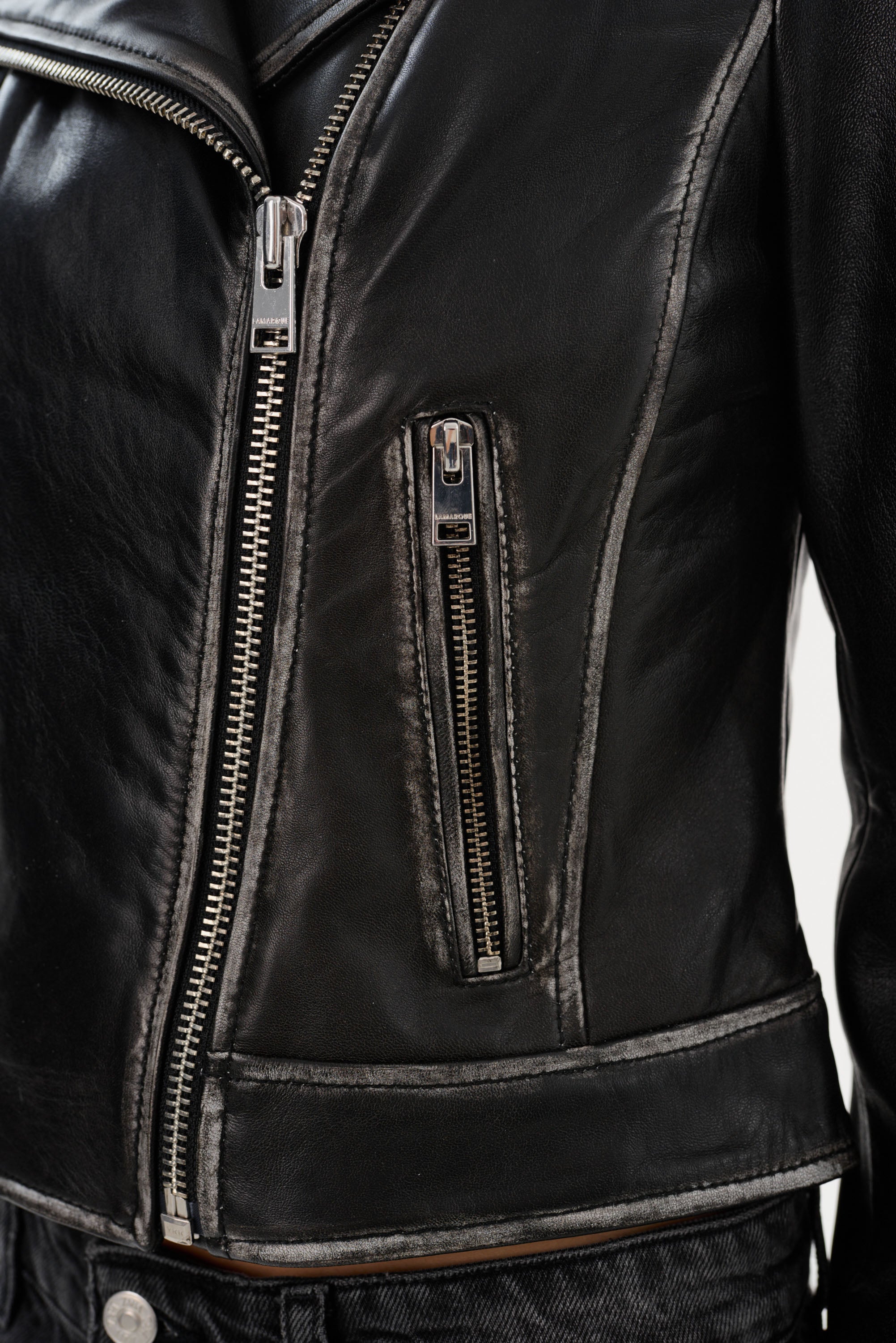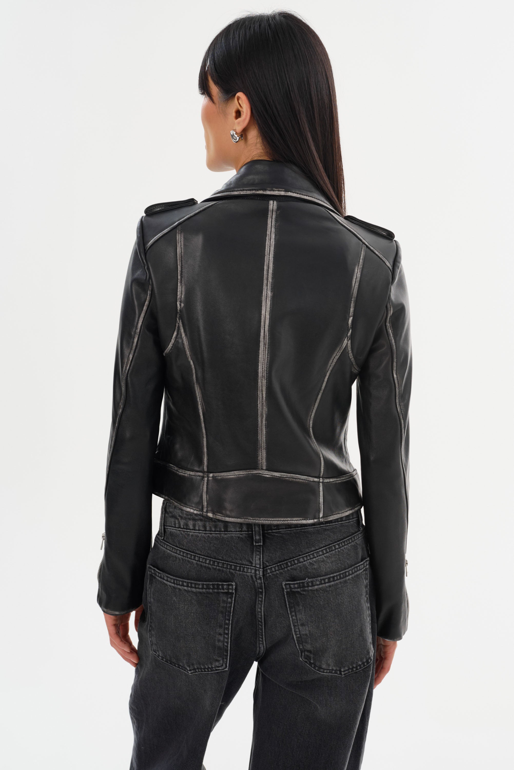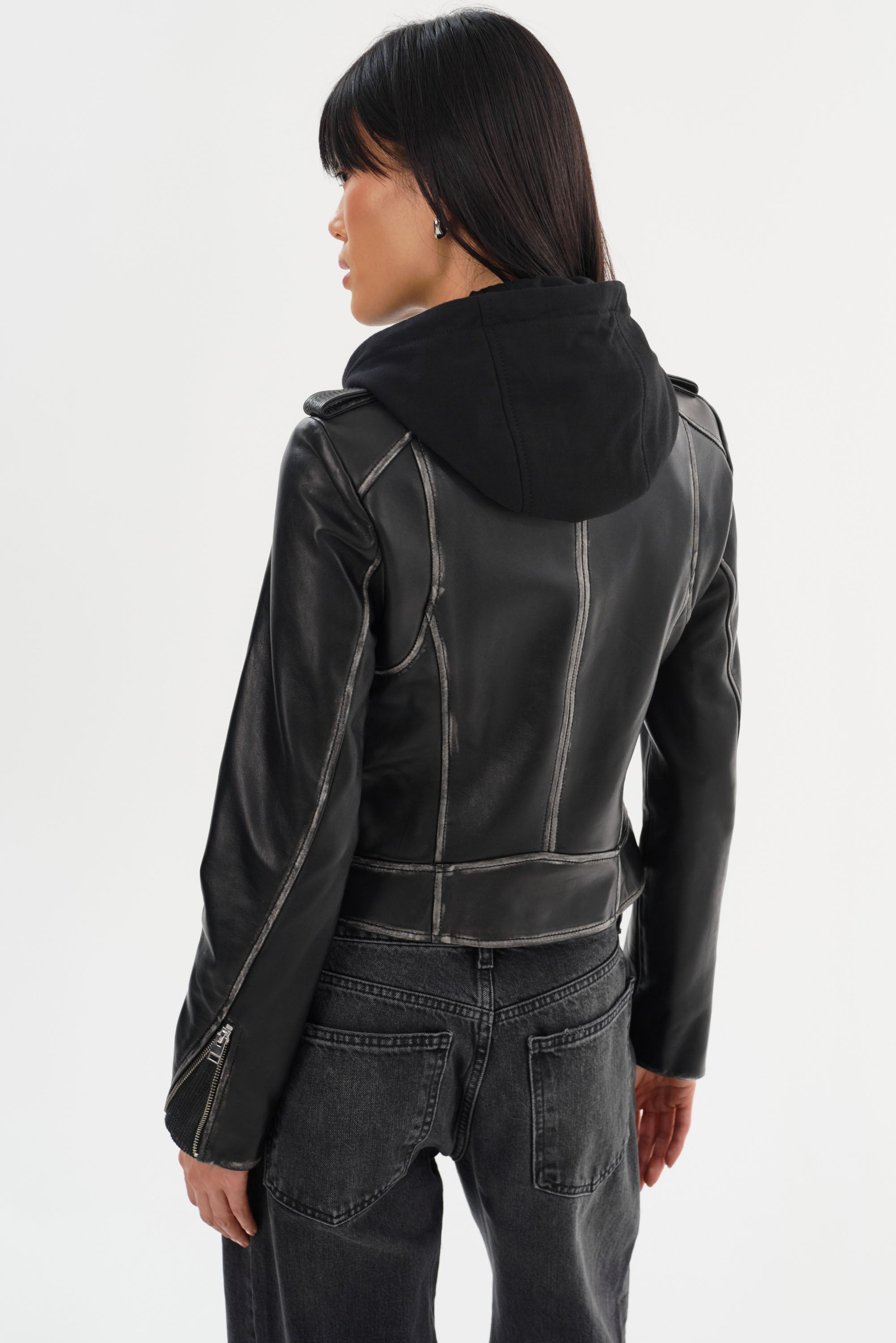 Step out in the iconic fit that refuses to go out of style. Complete with a fall-ready removable hood, the Holy leather jacket brings a feminine touch to the edgy biker aesthetic. Featuring an asymmetrical closure, a wide collar with crips silver snaps, and a buttery-soft lamb's leather body, this versatile stunner knows no limits. Opt for the gorgeously unique biker jacket that only gets more alluring over time.