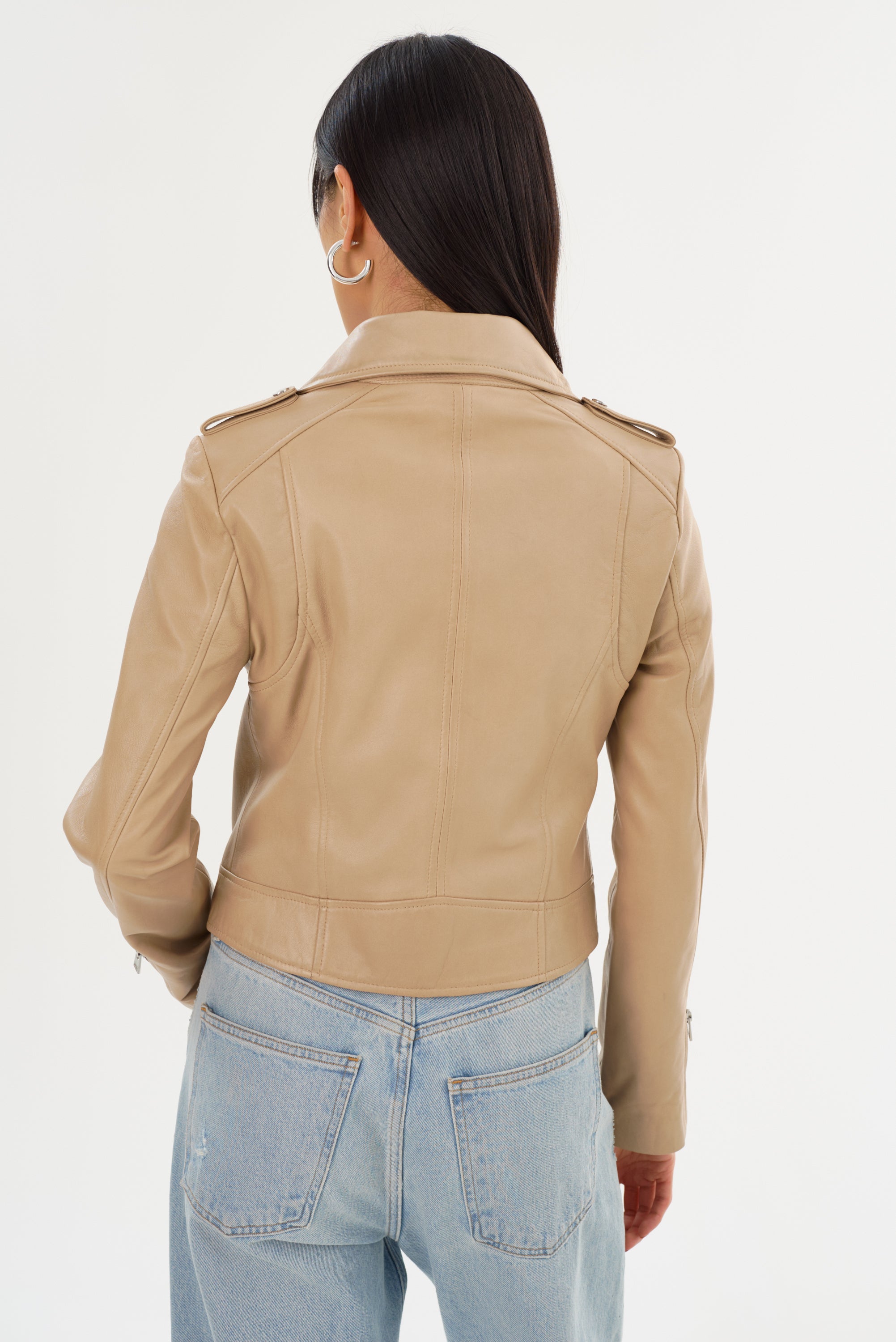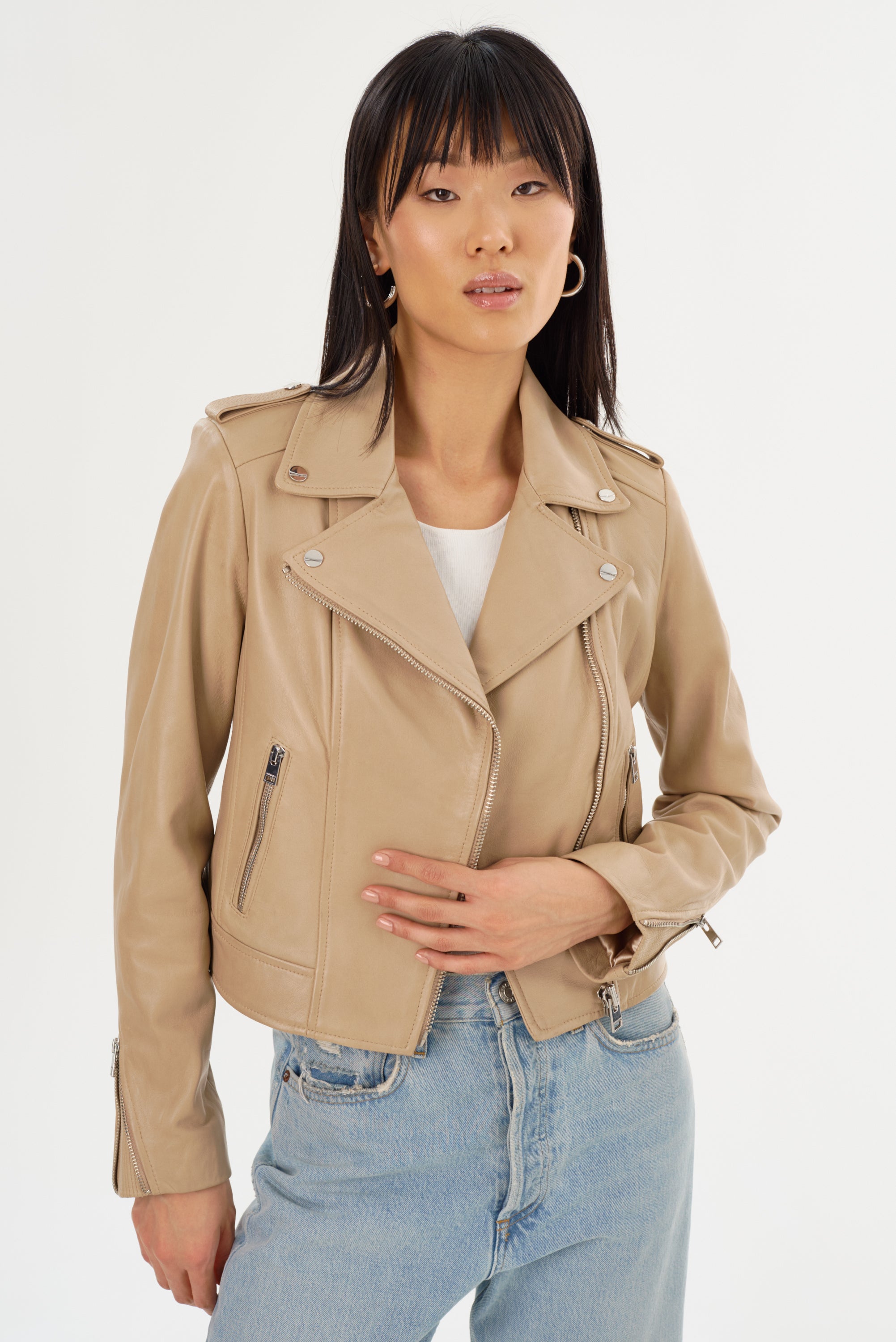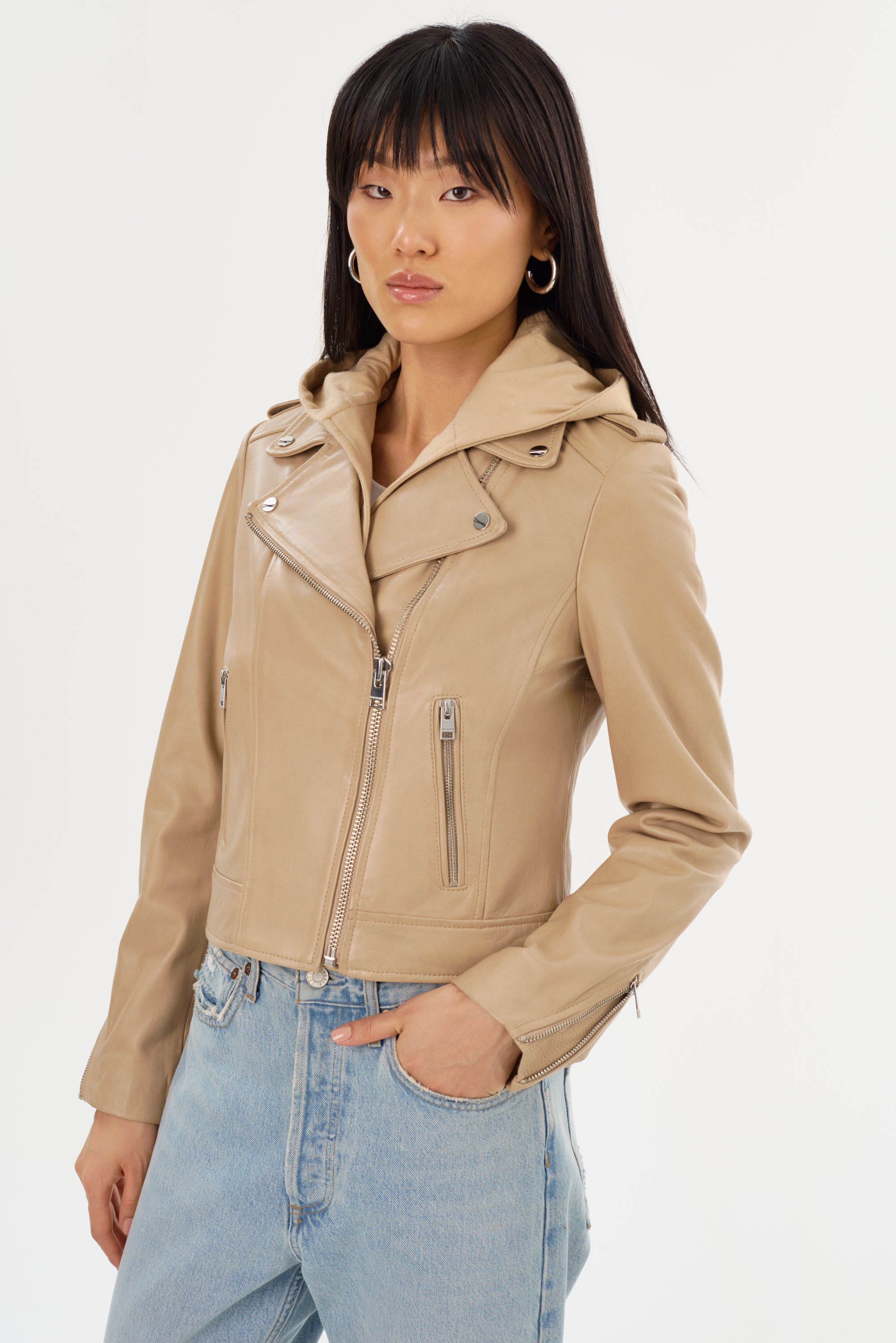 Step out in the iconic fit that refuses to go out of style. Complete with a fall-ready removable hood, the Holy leather jacket brings a feminine touch to the edgy biker aesthetic. Featuring an asymmetrical closure, a wide collar with crips silver snaps, and a buttery-soft lamb's leather body, this versatile stunner knows no limits. Opt for the gorgeously unique biker jacket that only gets more alluring over time.