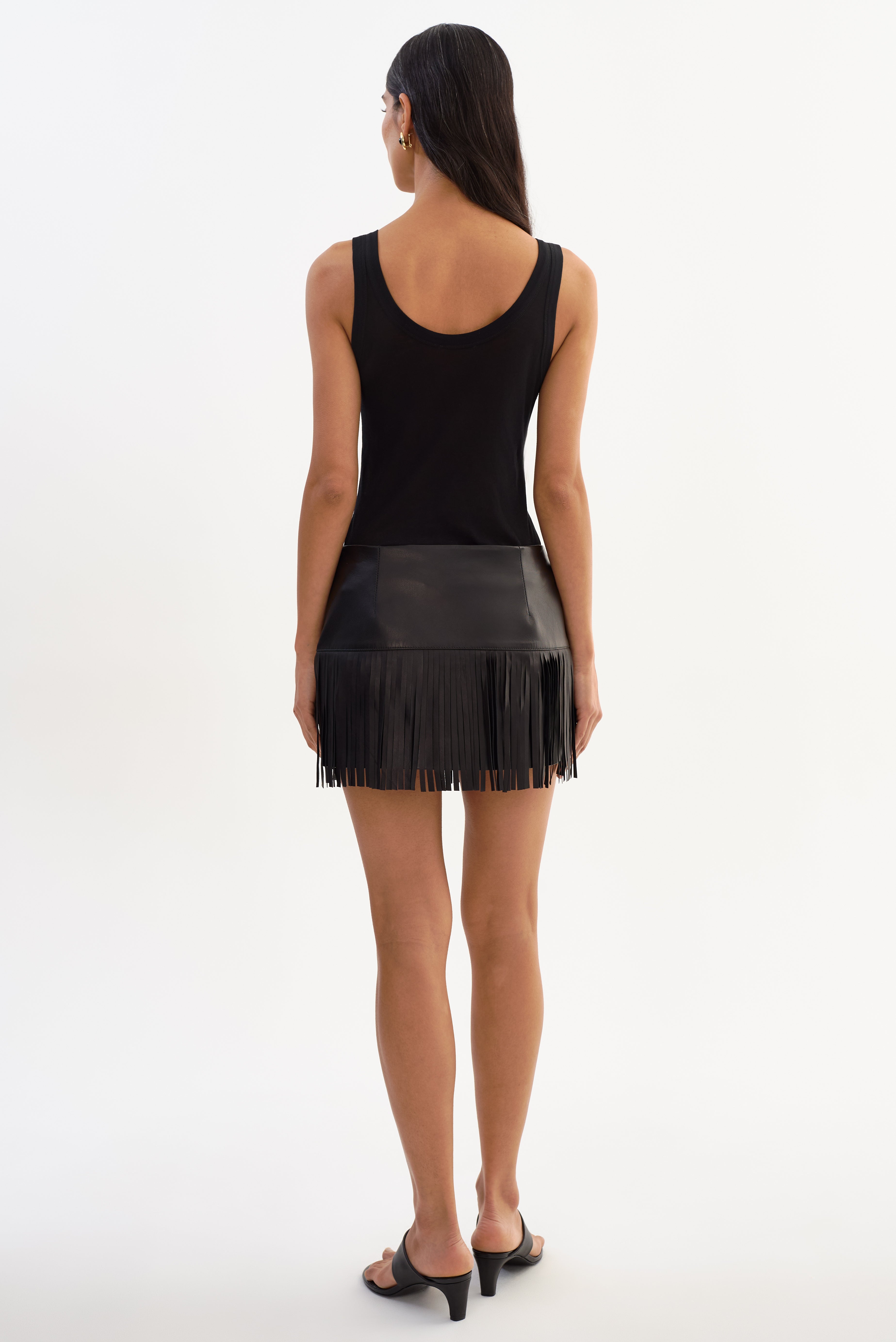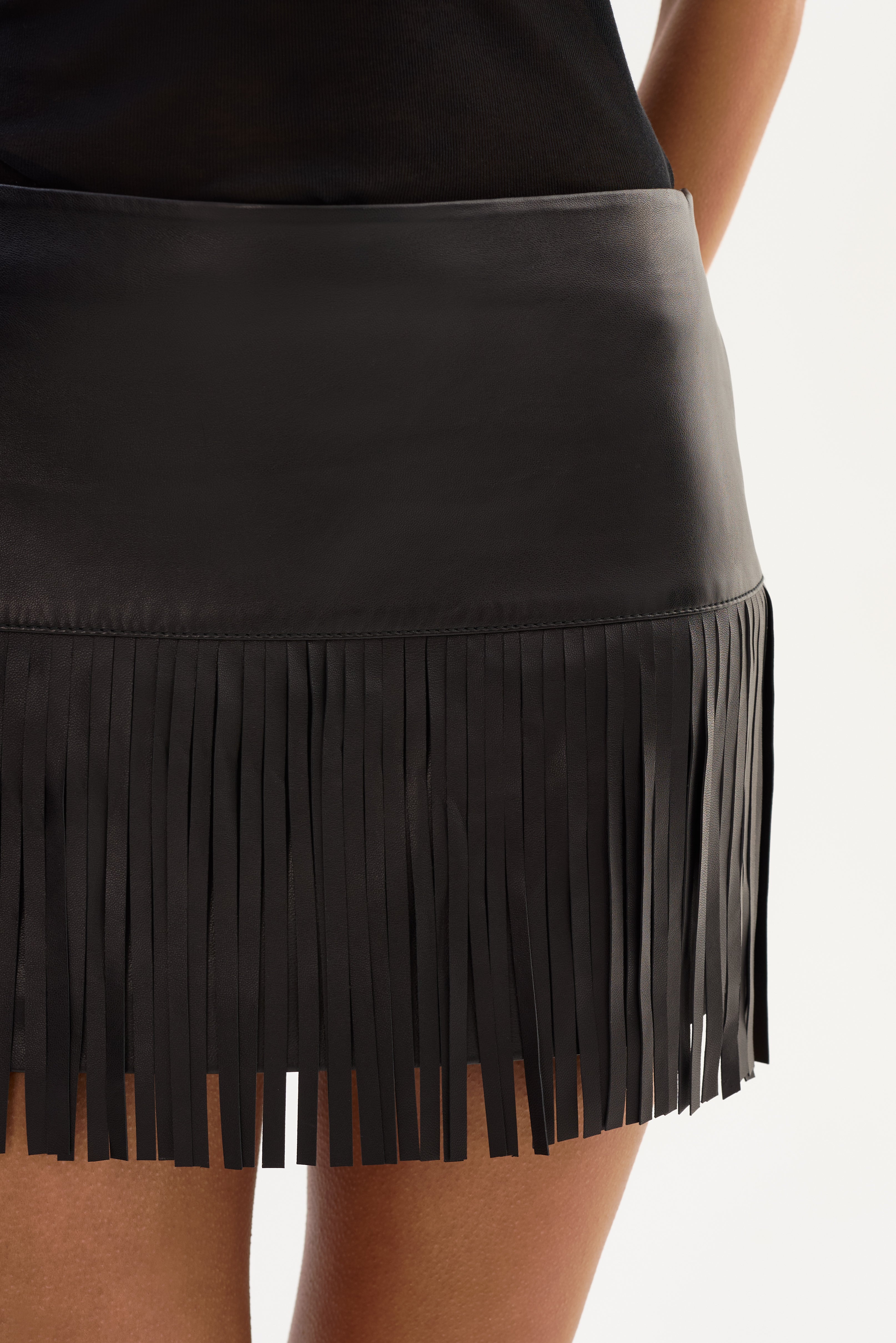 The HUNTER Leather Fringe Skirt brings movement and attitude to a sleek leather mini skirt. Designed to sit low on the waist, it features a smooth leather waistband with fringe detailing that adds texture and motion without overwhelming the look. An easy statement piece that feels confident, modern, and effortless from day to night.