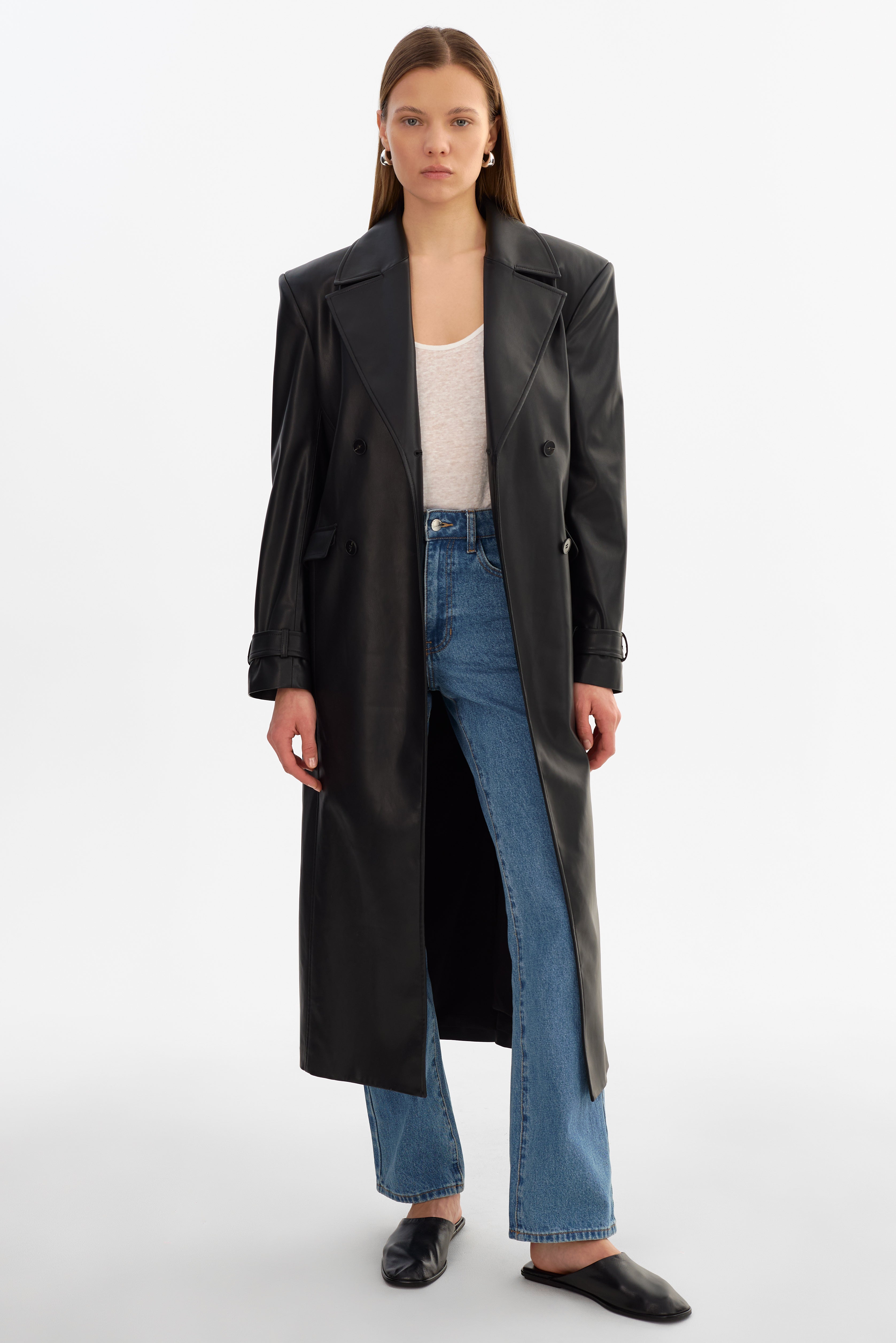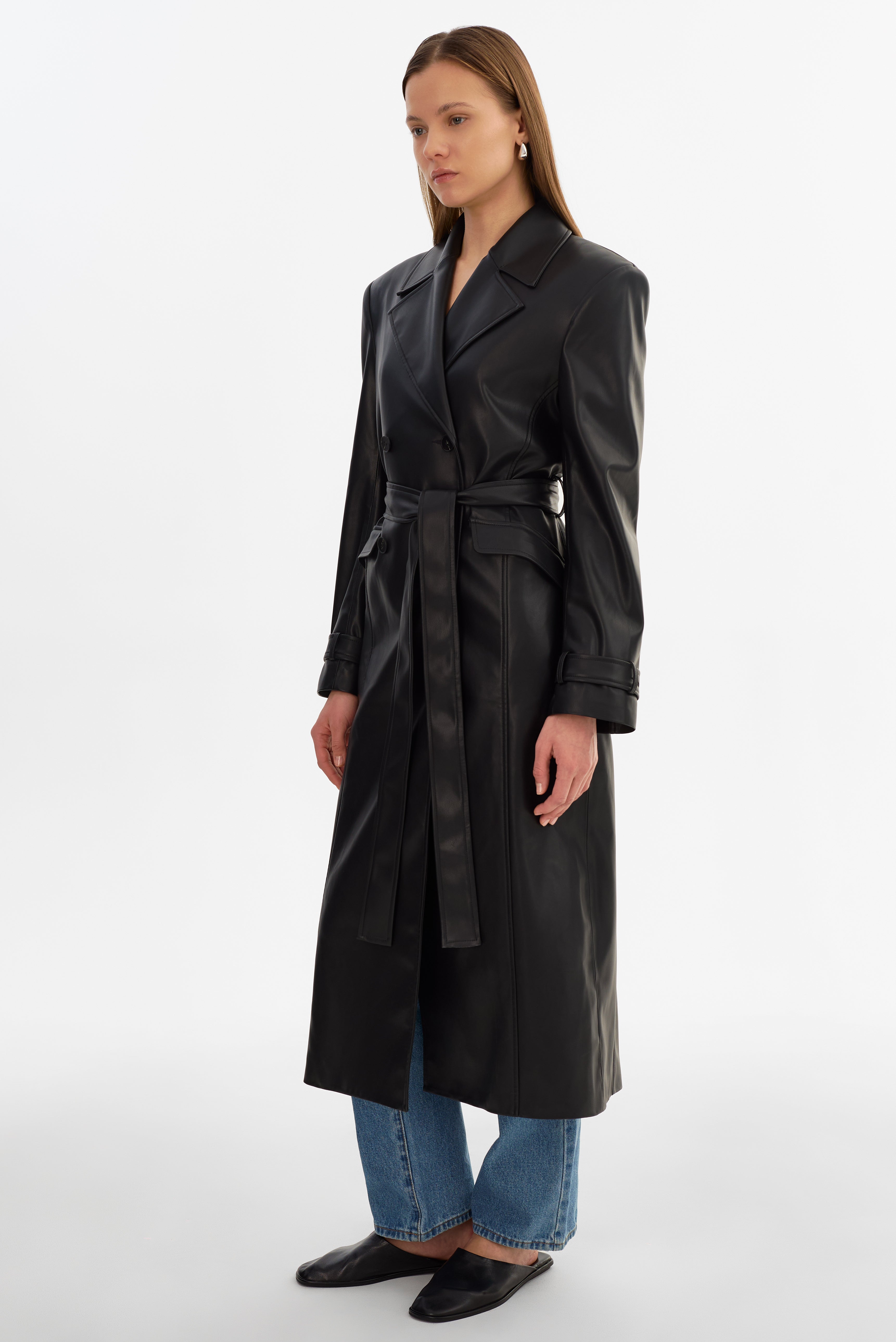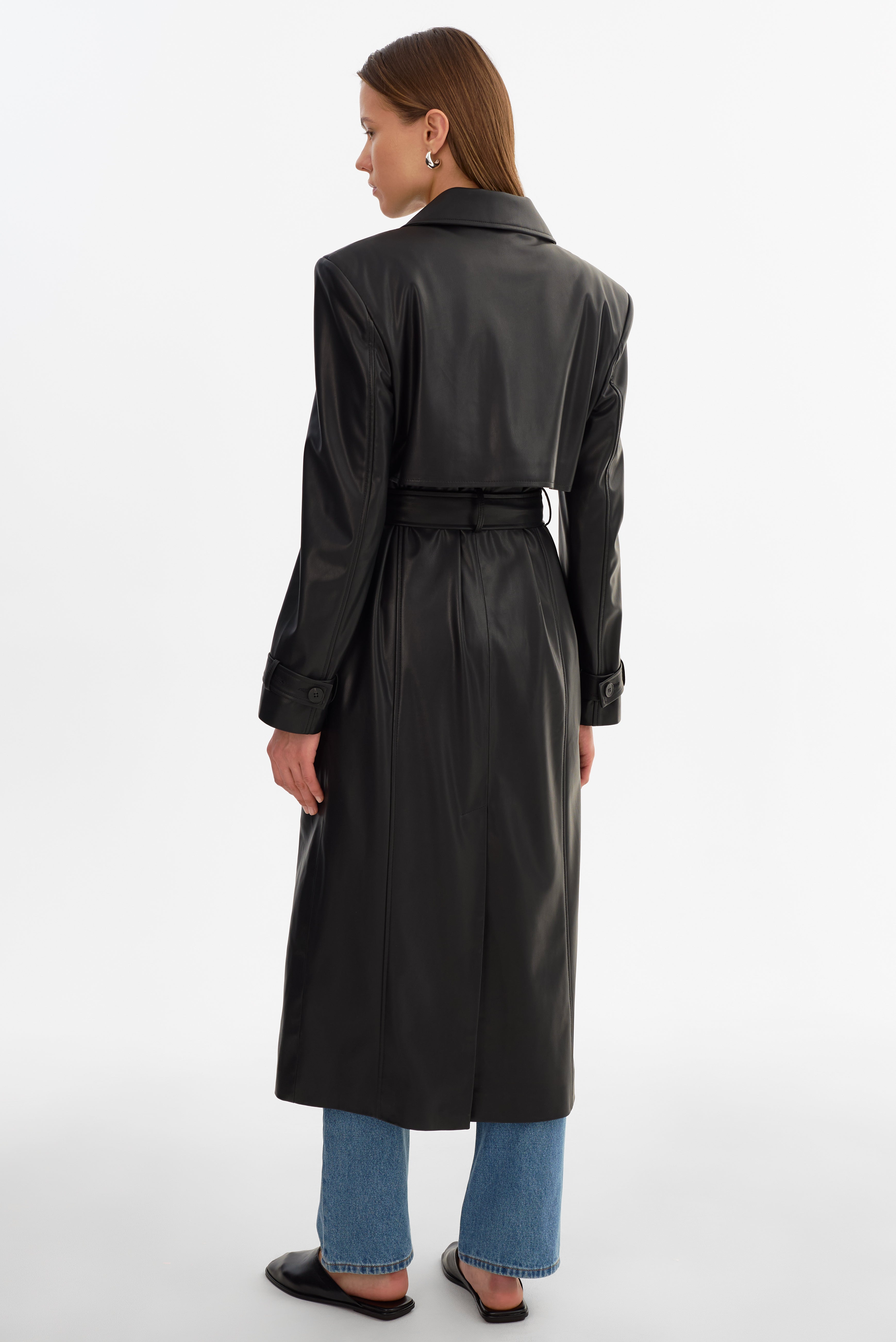 A modern take on a timeless outerwear staple. The IOLANTHE Faux Leather Trench Coat features a confident shape with a defined waist, balanced by an easy, wearable feel. Designed to layer effortlessly, it adds impact without feeling overdone.