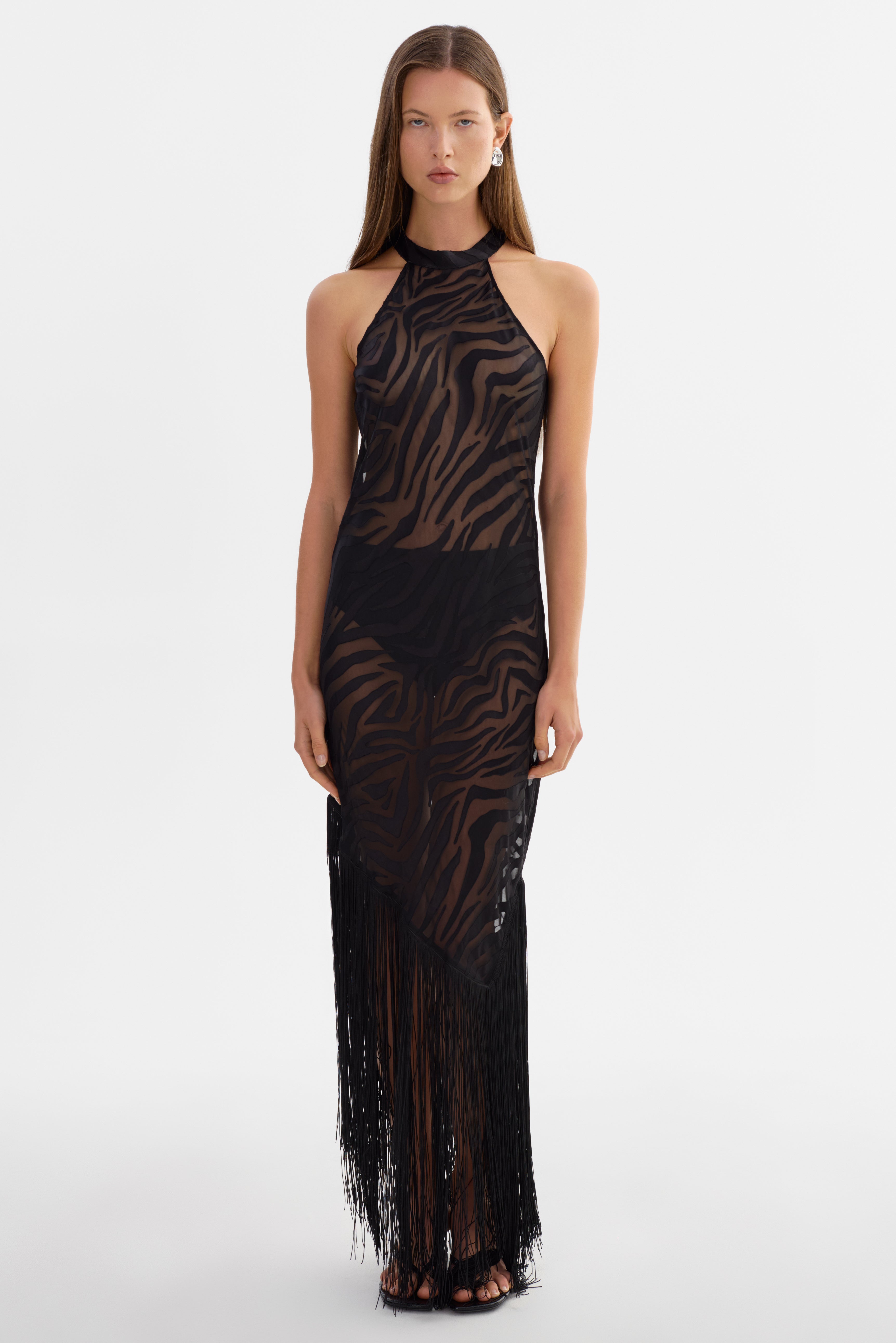 The JENNINE dress blends modern allure with effortless sophistication. Made from sheer zebra patterned fabric, it features a halterneck silhouette and an asymmetrical hemline with soft fringe detailing. Style it with a heels and minimal jewelry for a refined resort moment.