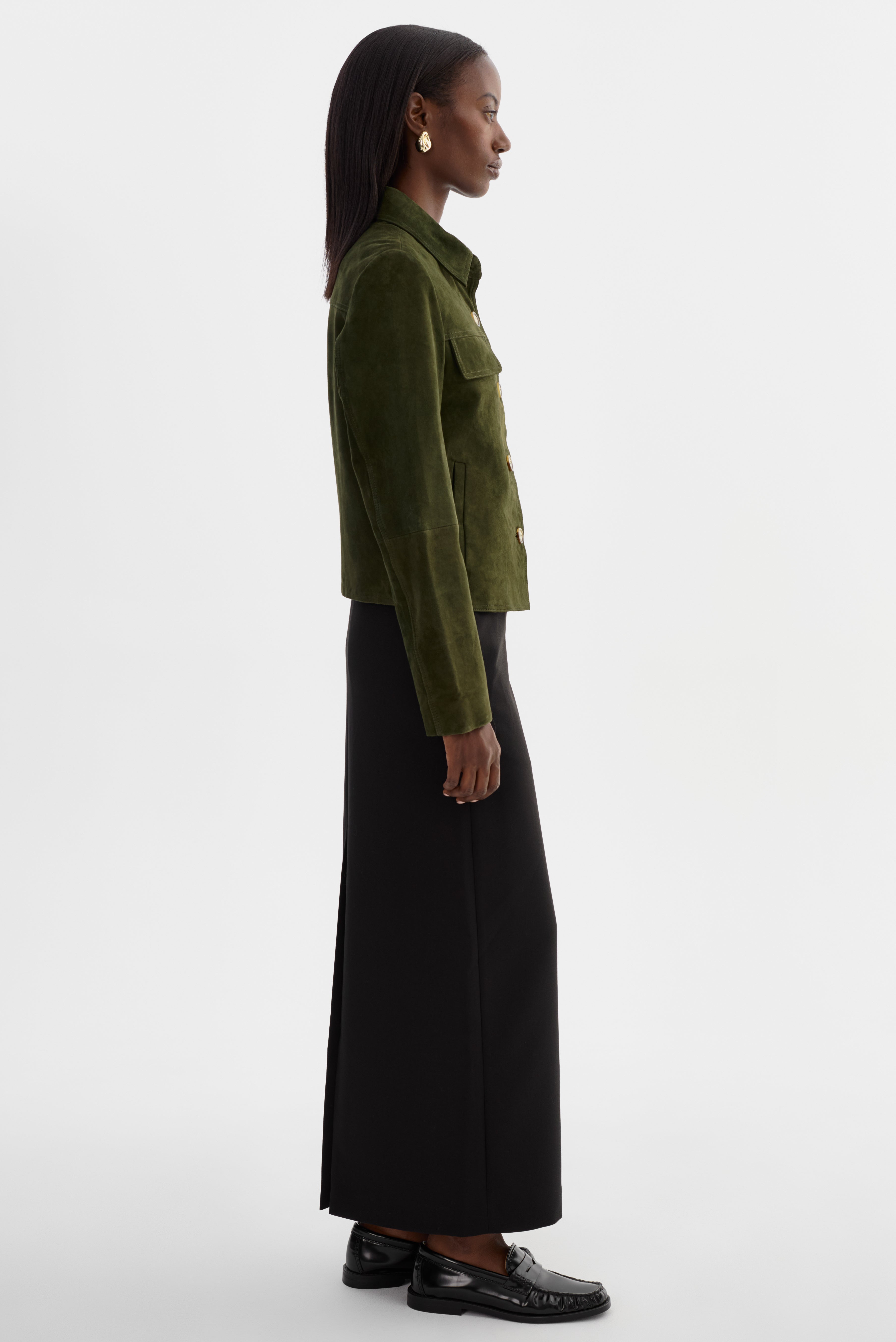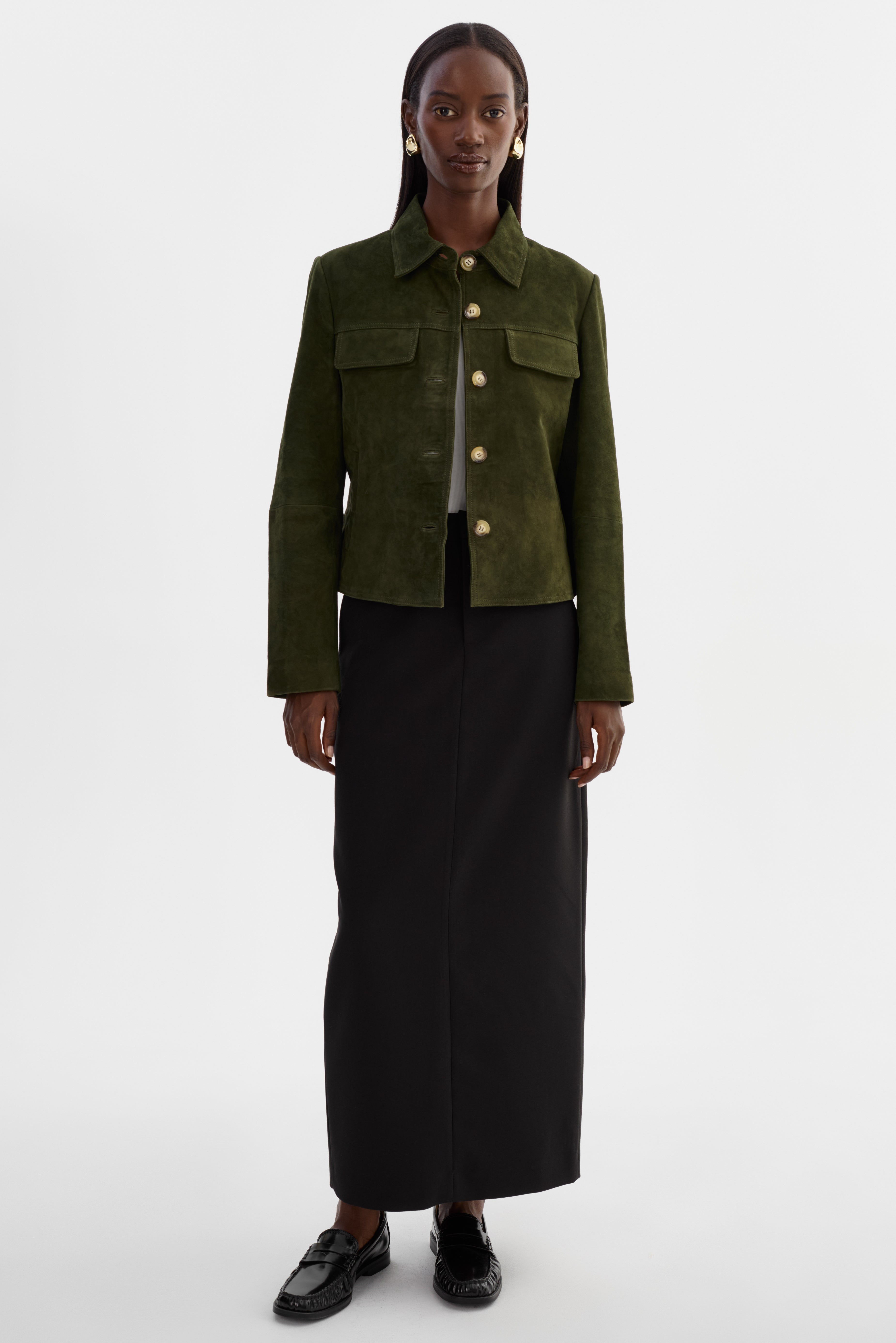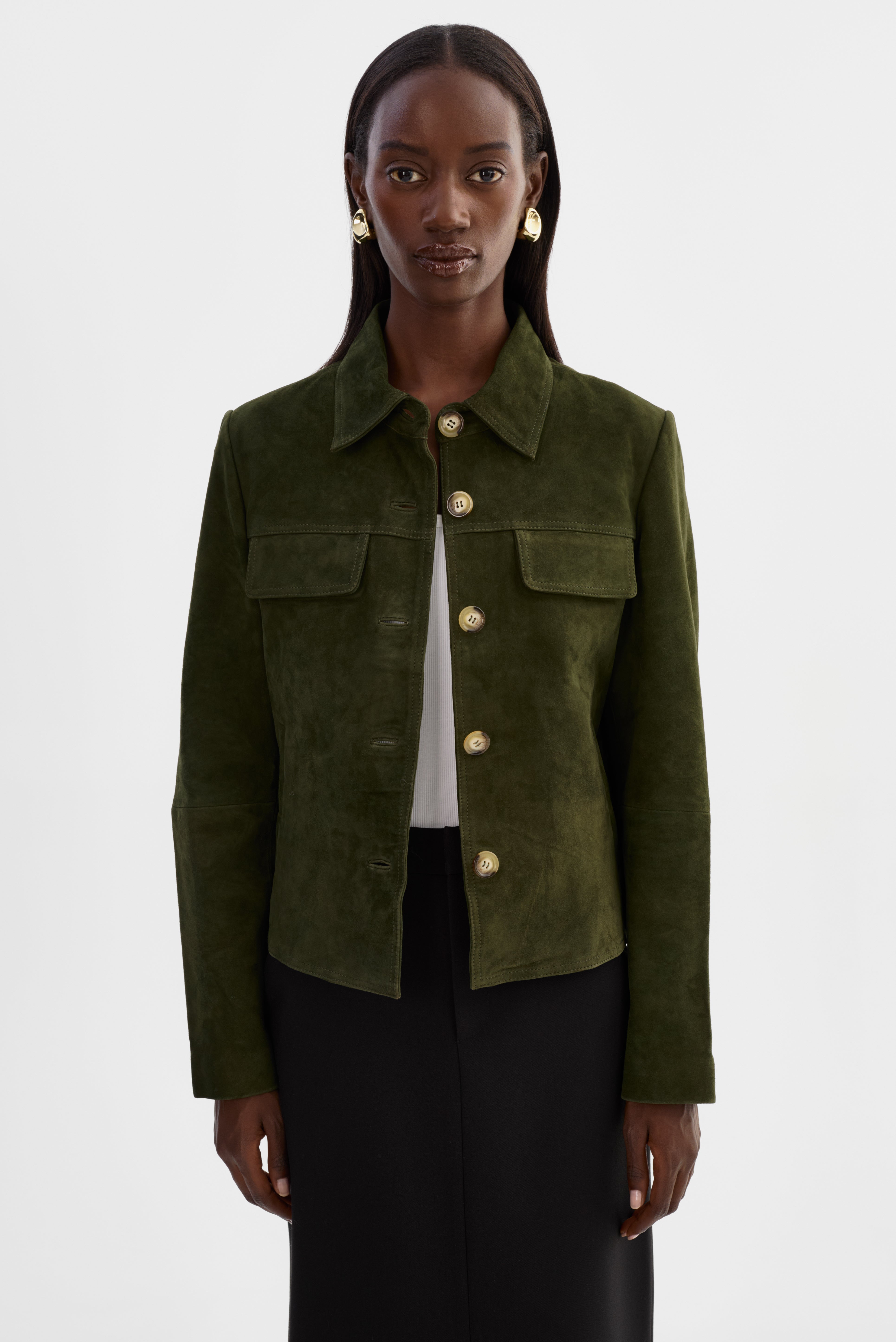 The JOLENE Jacket is where structure meets softness. Crafted from supple suede, it features a sharp collar, full button front, and flap chest pockets for a utility-inspired edge. A tailored silhouette gives it a refined finish, perfect for adding texture to elevated everyday looks.