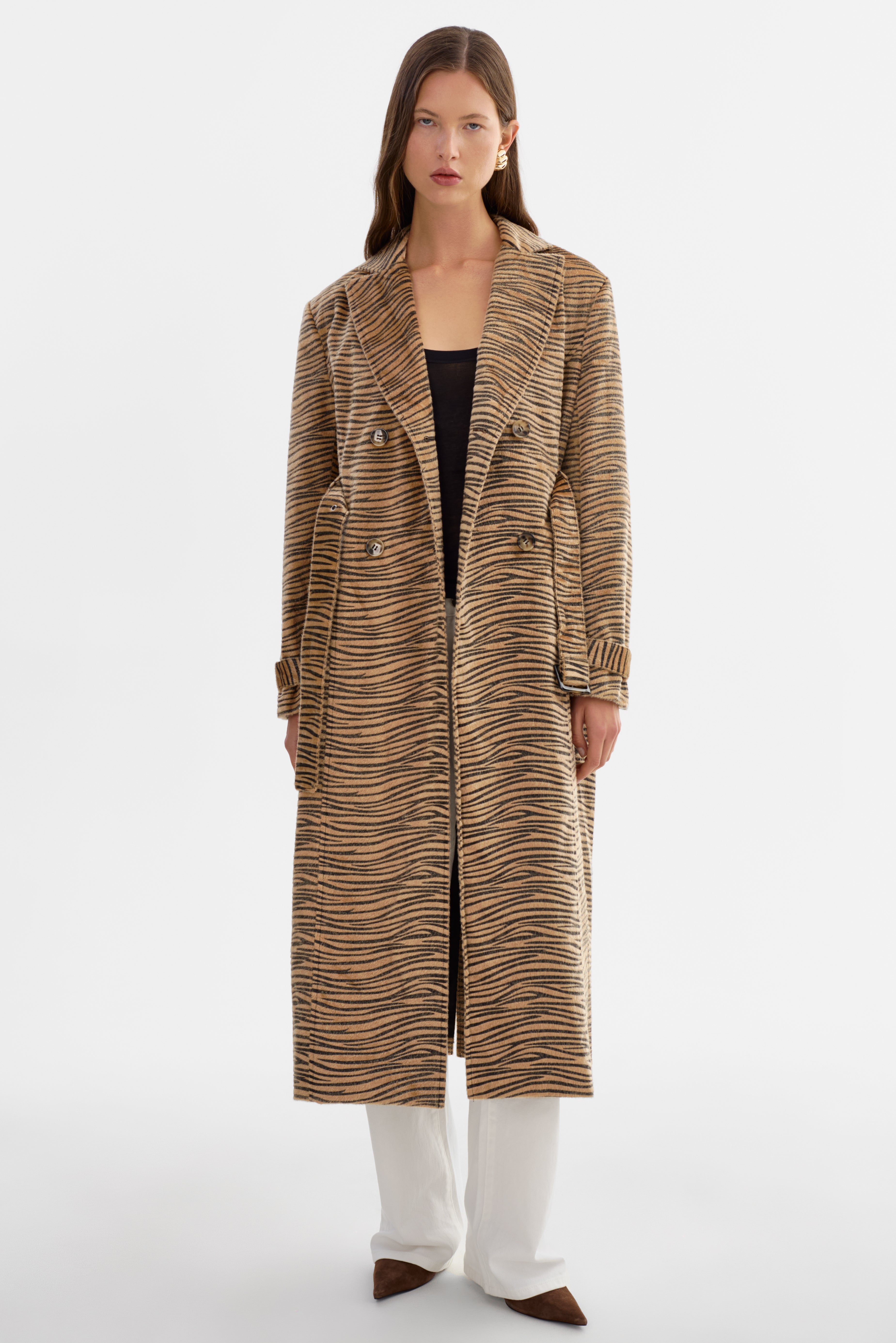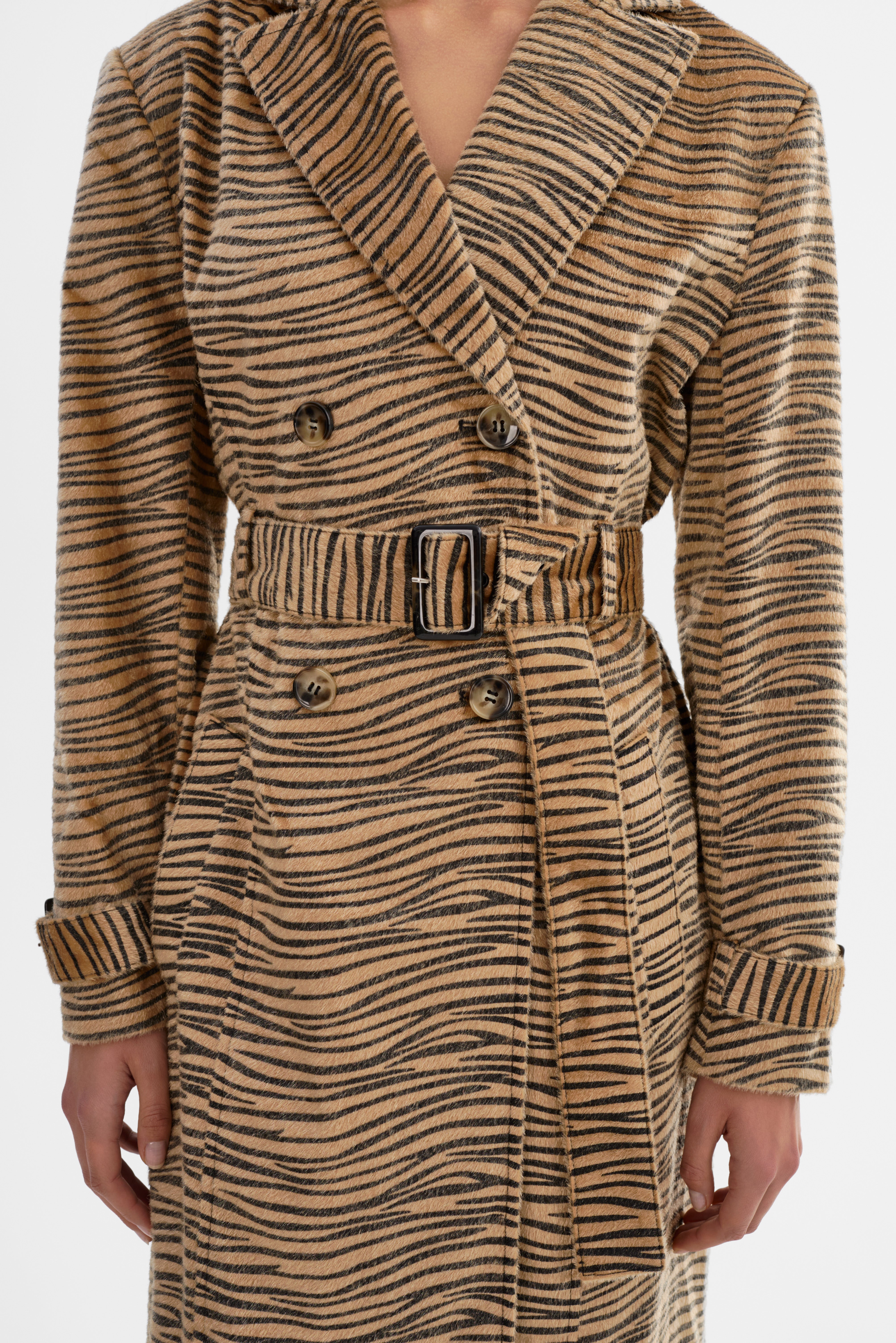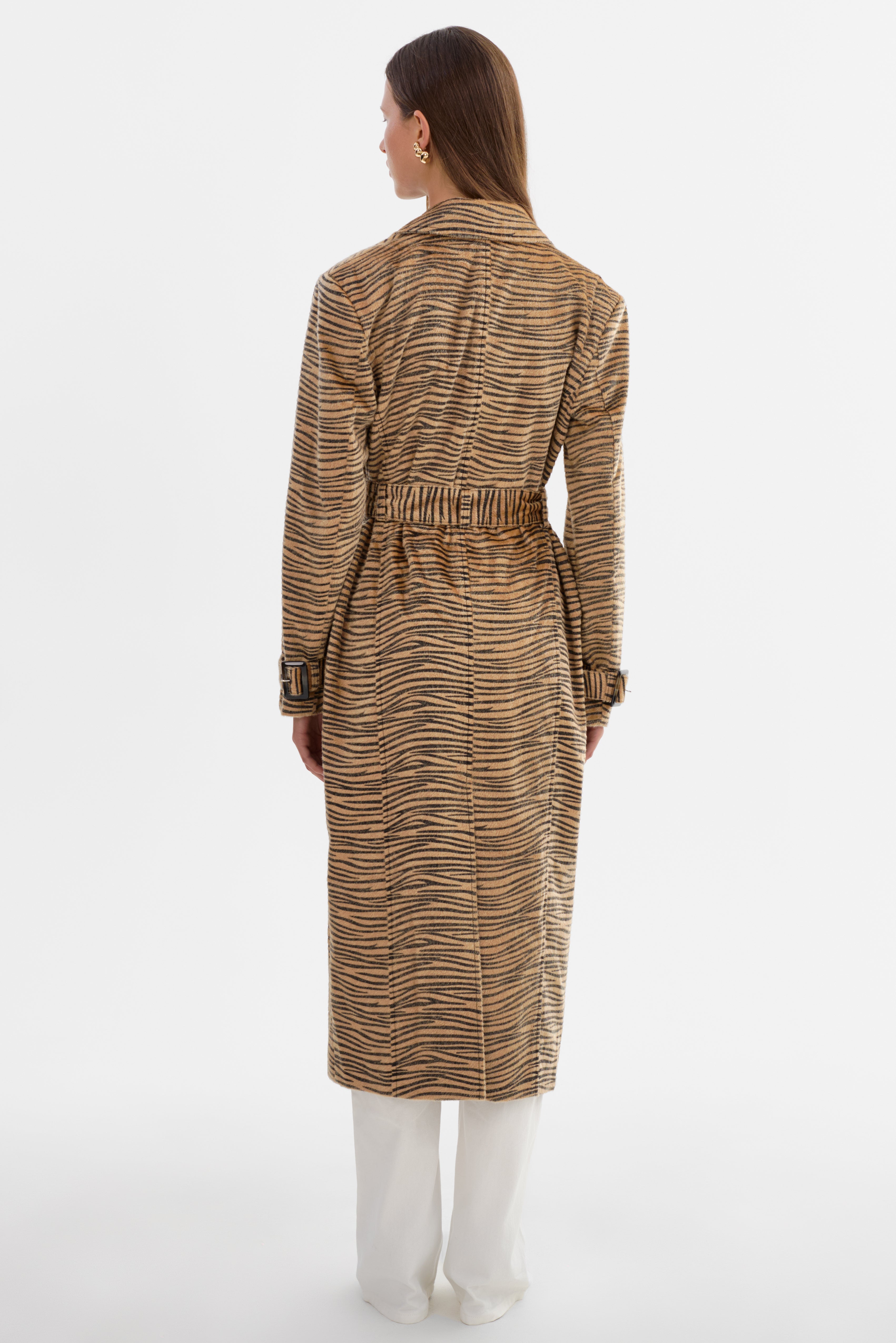 The LESLIE Trench Coat brings modern sophistication to a timeless silhouette. Made from a faux hair tiger print fabric, it features a notched collar, belted waist, and padded shoulders for a structured yet effortless look. Layer it for a refined edge that elevates any look.