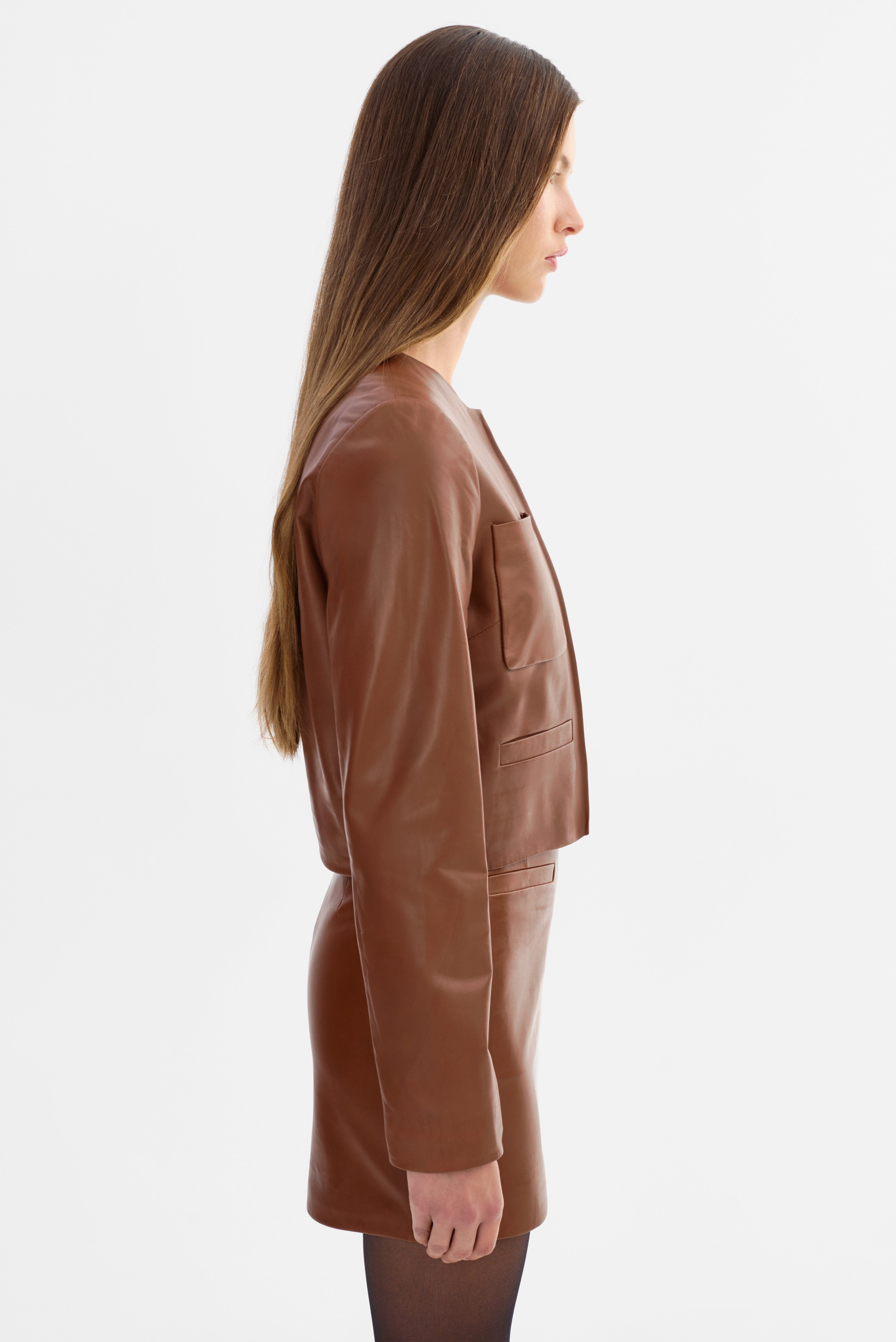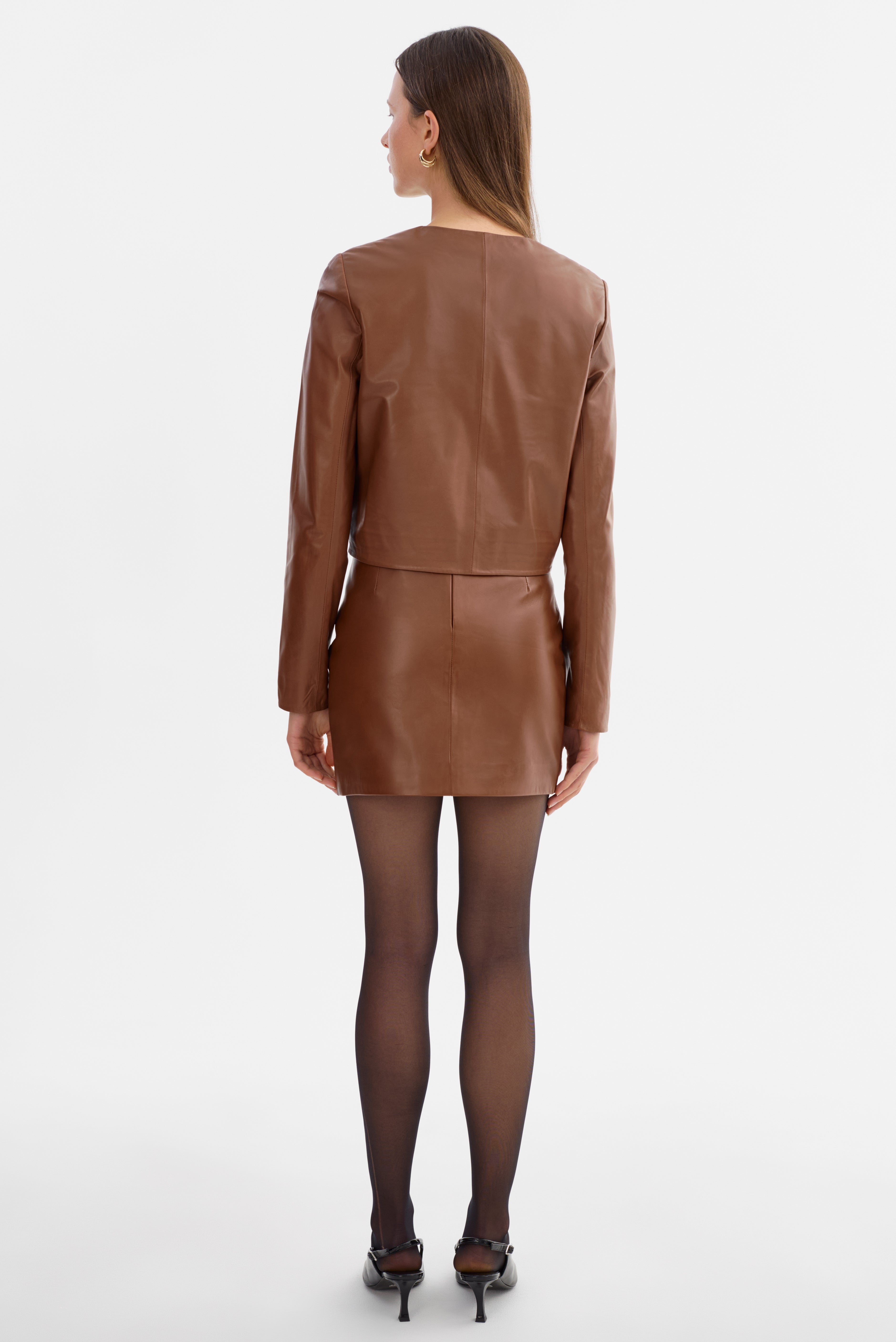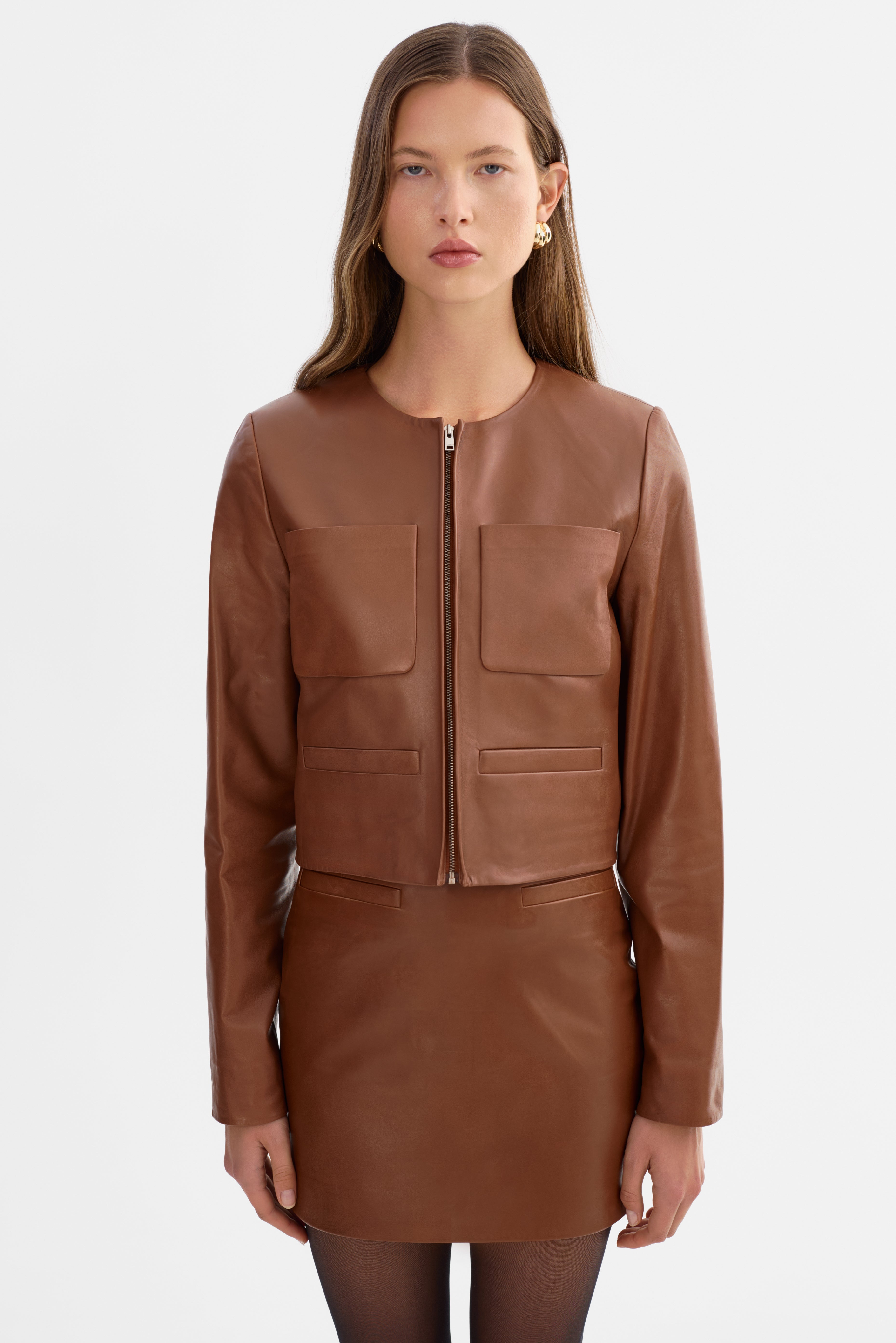A modern take on a classic silhouette, the LINETTE Leather Jacket is a timeless wardrobe essential. Crafted from premium lamb leather, it features a chic round collar, two front patch pockets, and a sleek, minimalist design. Pair it with the matching ROWAN Leather Skirt for a sophisticated take on leather suiting.