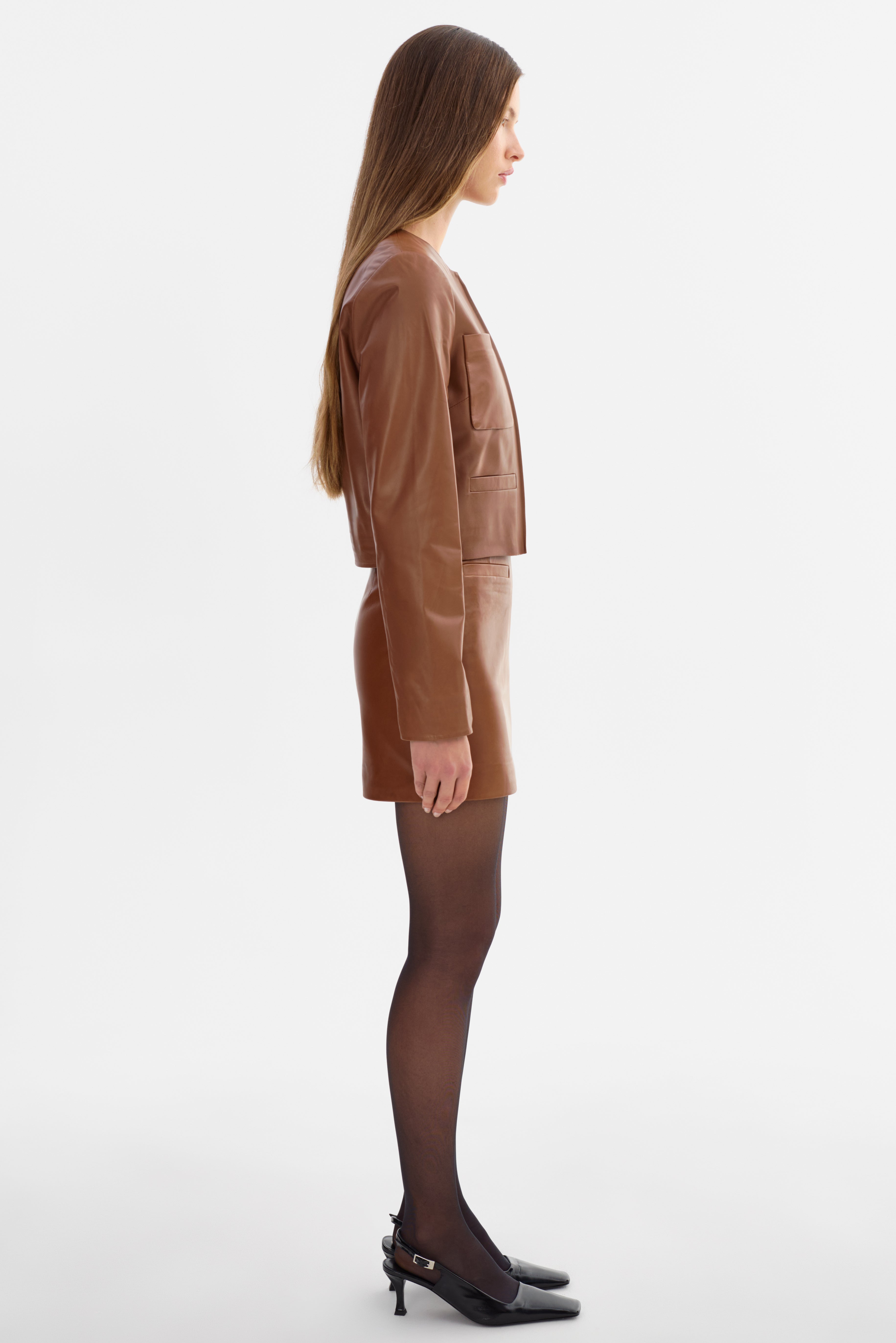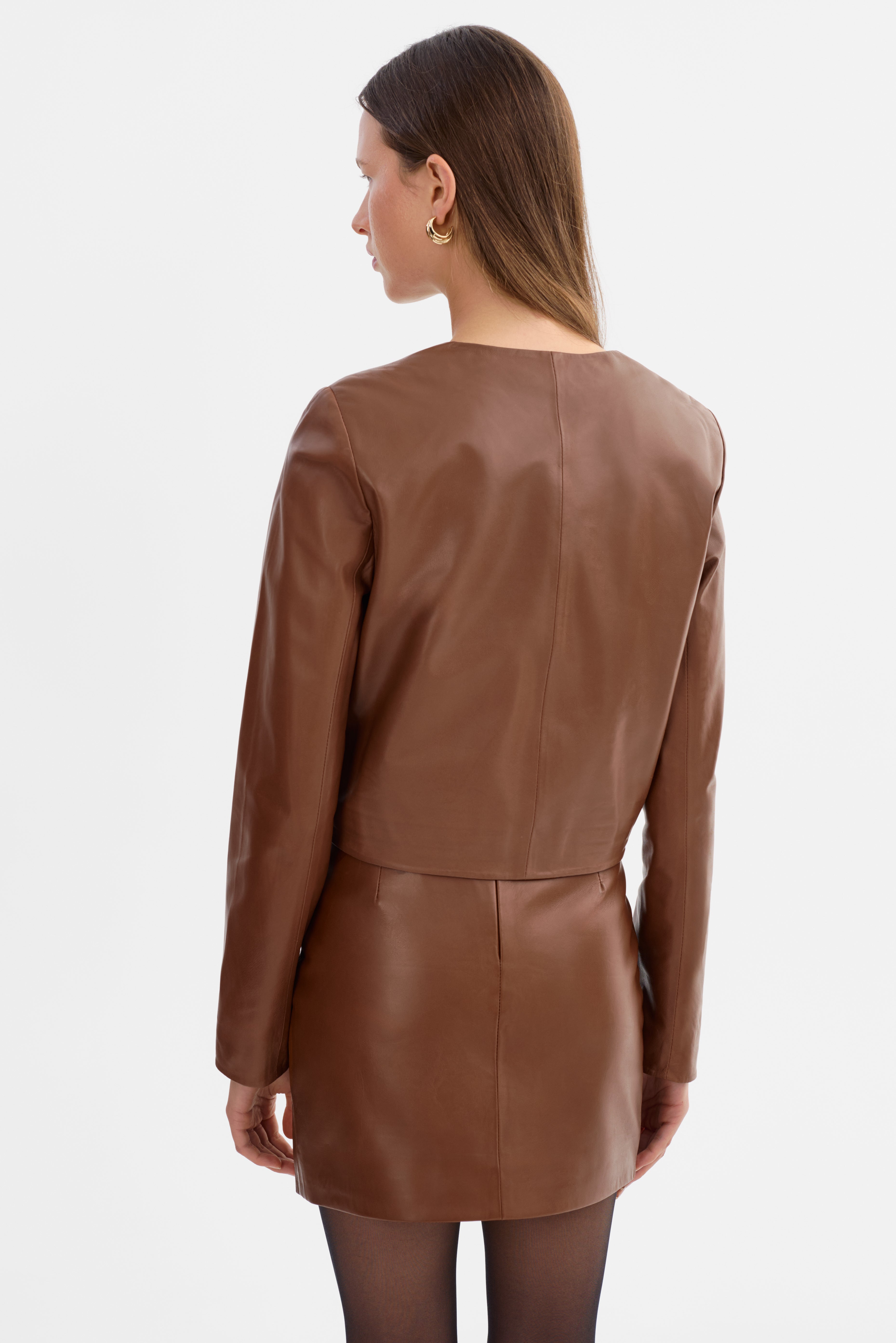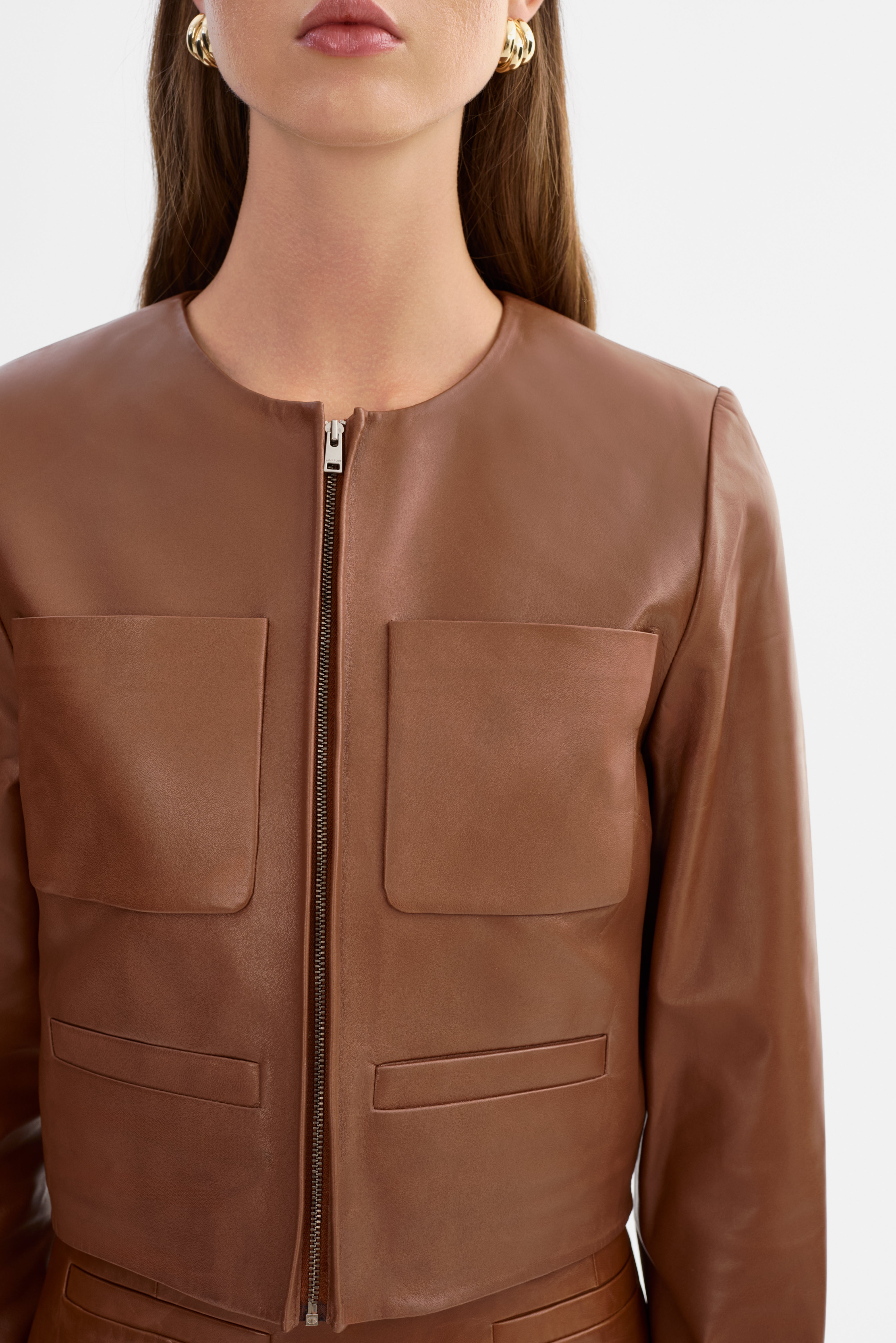 A modern take on a classic silhouette, the LINETTE Leather Jacket is a timeless wardrobe essential. Crafted from premium lamb leather, it features a chic round collar, two front patch pockets, and a sleek, minimalist design. Pair it with the matching ROWAN Leather Skirt for a sophisticated take on leather suiting.