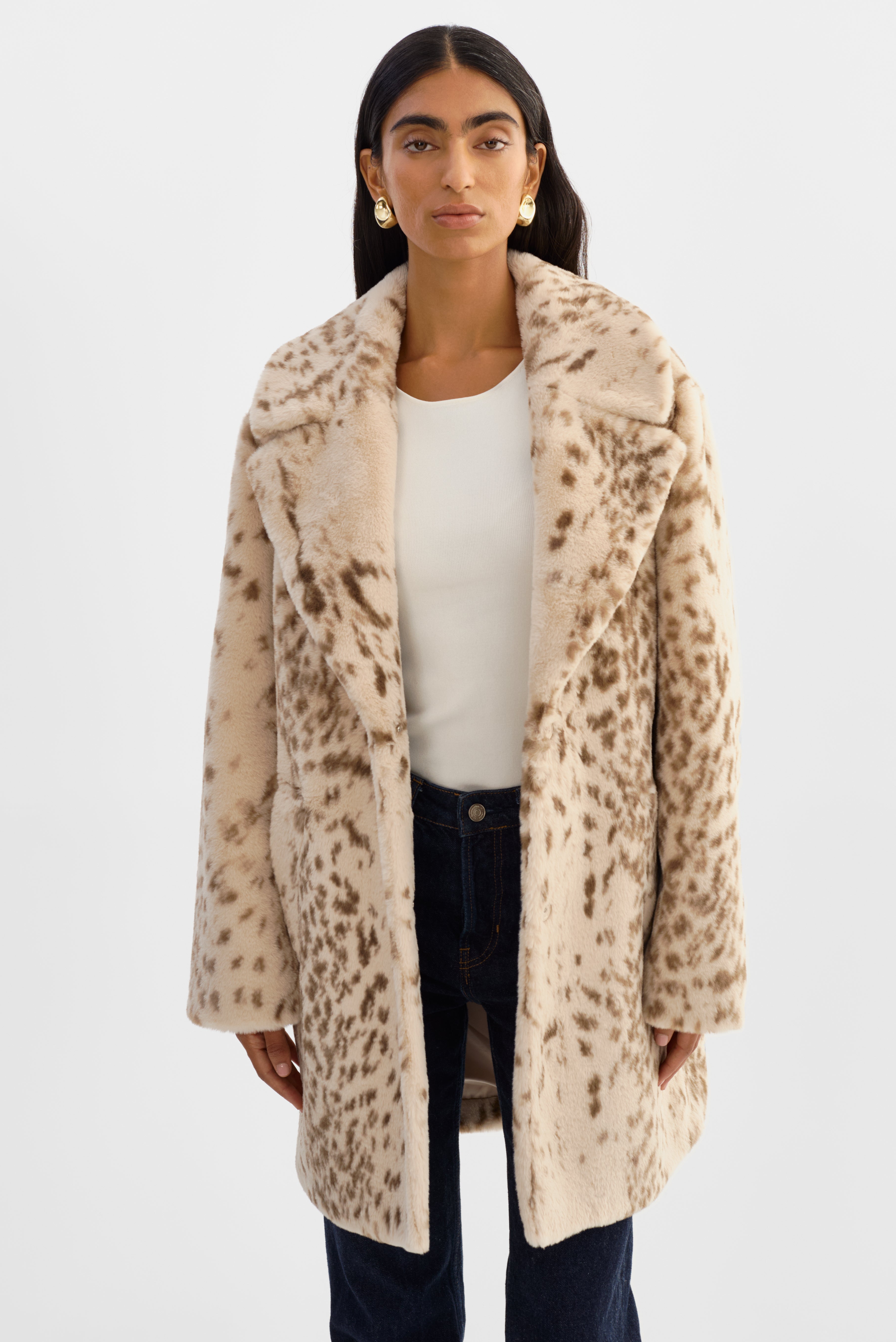 From the timeless silhouette to the updated details, the Linnea faux fur coat features a soft leo-inspired pattern that adds understated character. A notched collar with snap closure accents the neckline, while waist pockets offer a practical touch. Crafted from plush faux fur, the Linnea is both stylish and cozy, your perfect go-to when the temperature starts to drop.