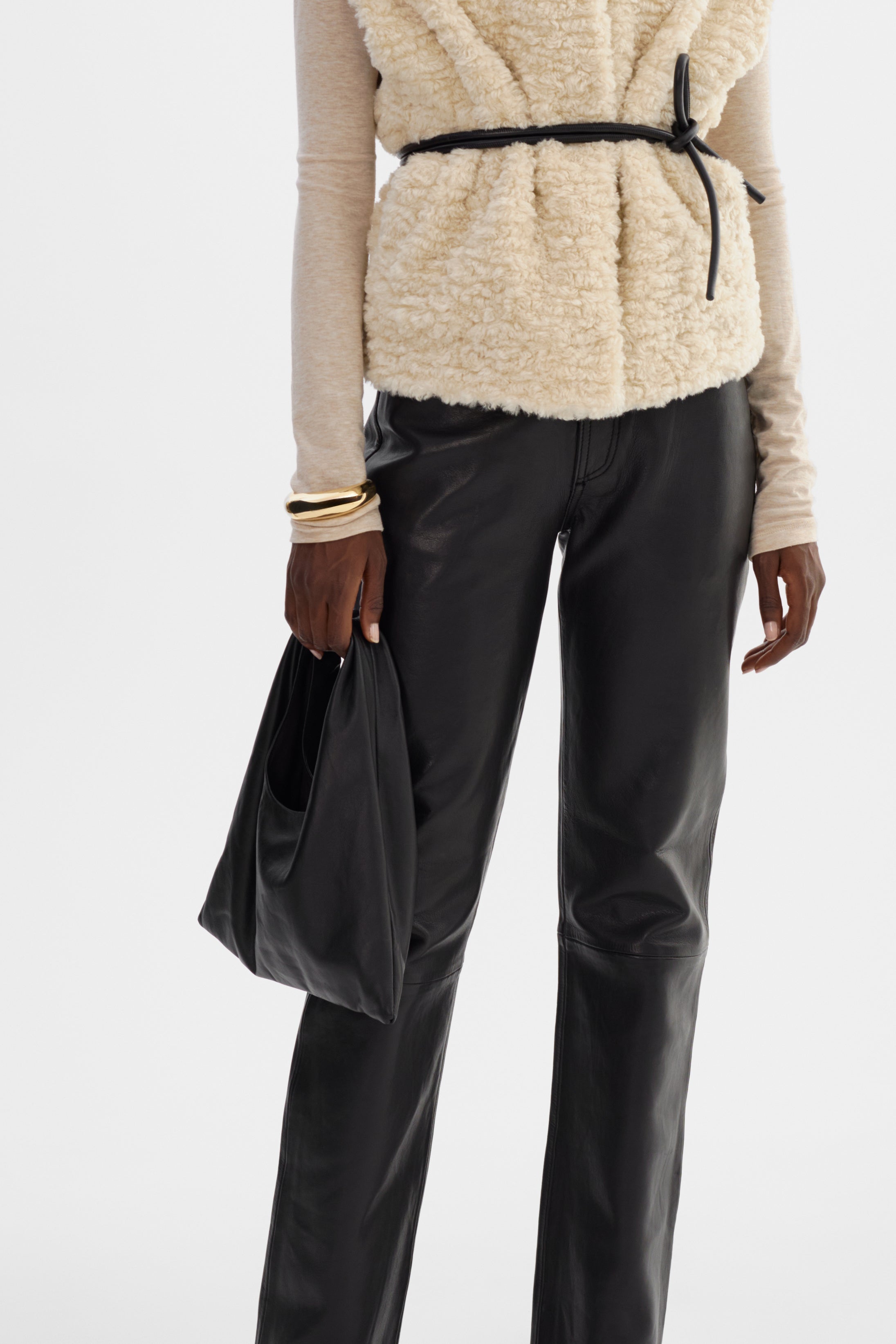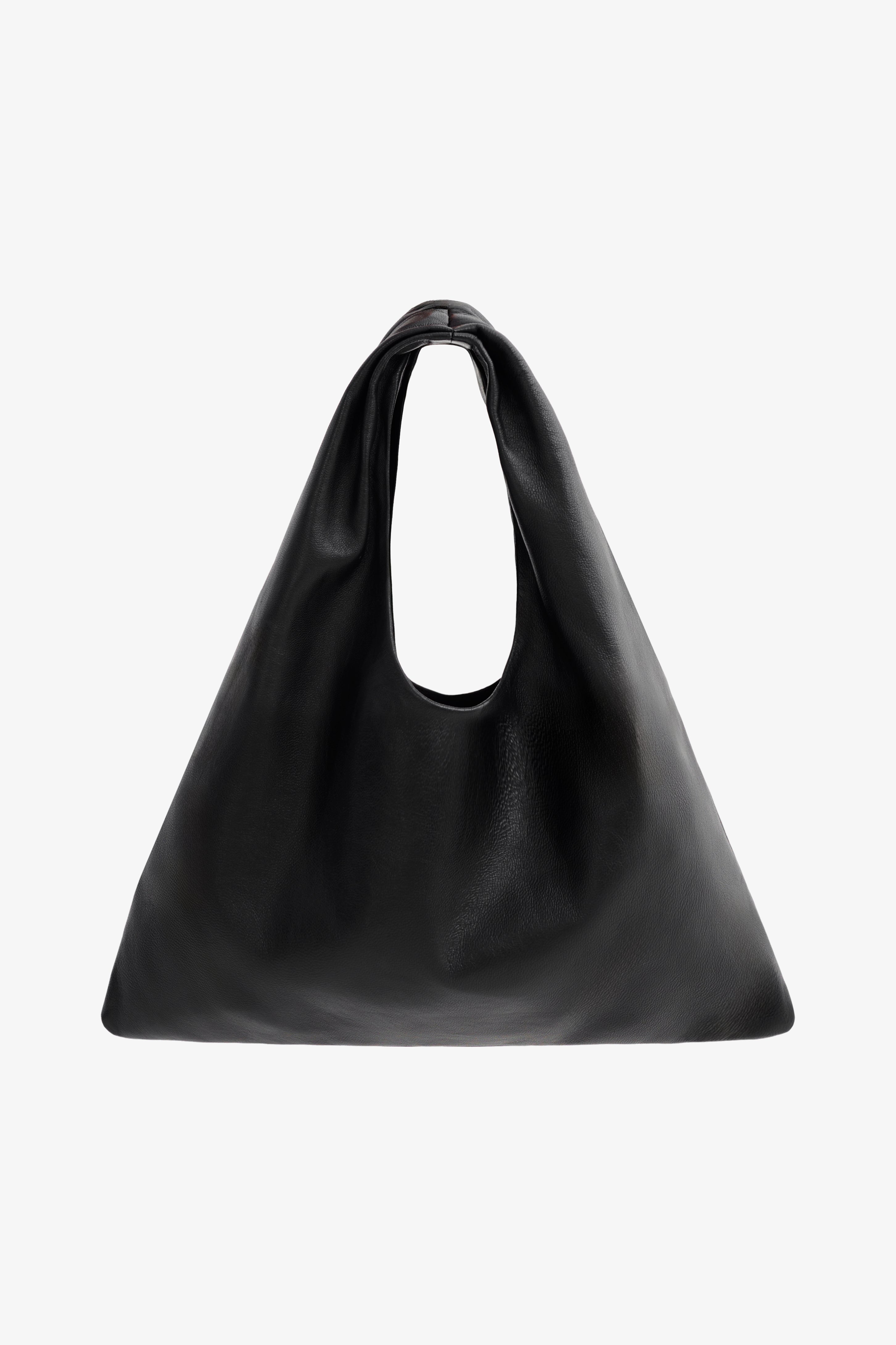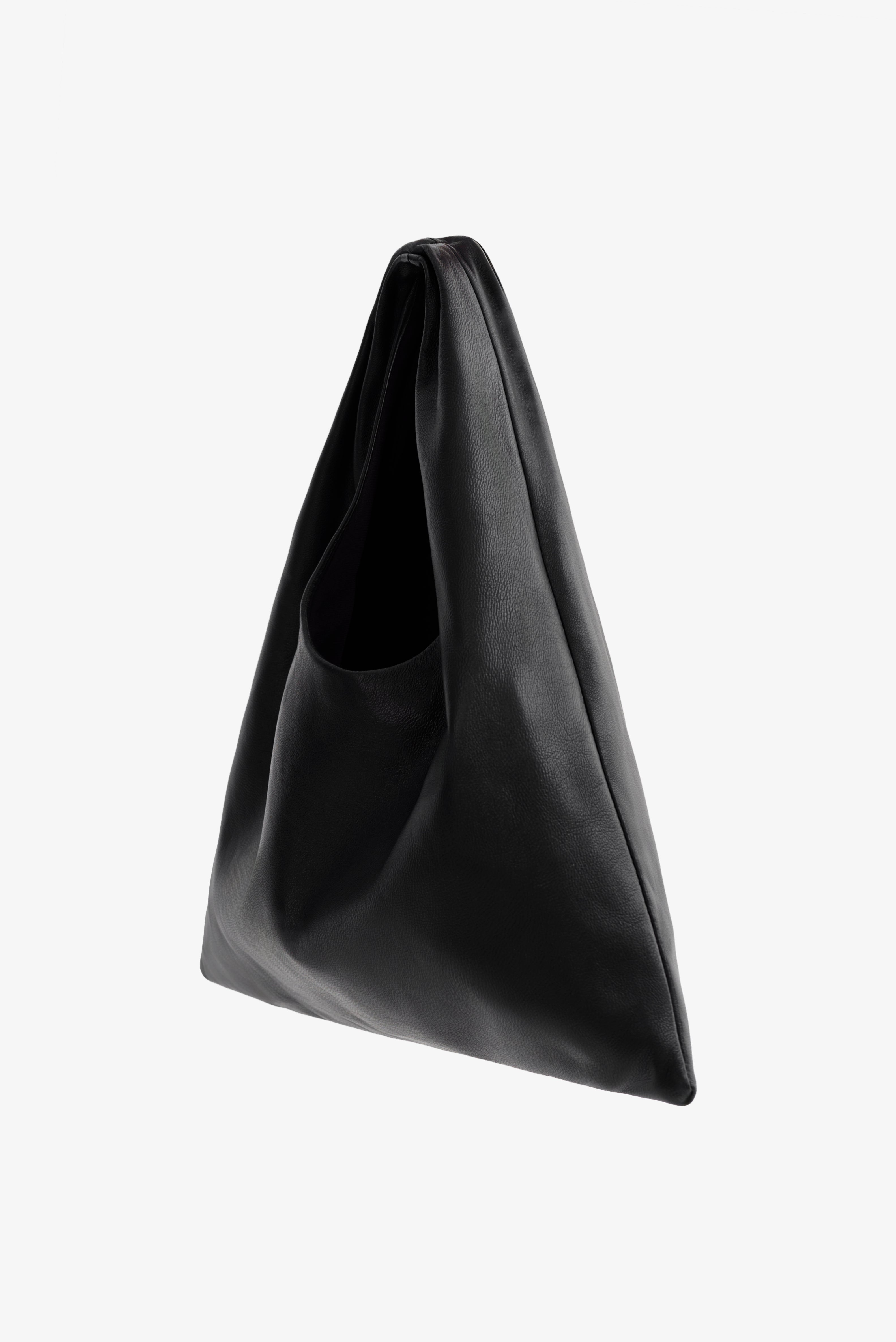 Sculptural ease defines this modern leather bag. Cut from buttery lamb leather, its soft triangular silhouette drapes naturally for an effortless look. The single handle slips comfortably over the arm, creating a fluid shape that moves with you. Spacious enough for daily essentials yet refined in its simplicity, it is the piece you reach for when you want understated impact. Perfect from weekday city moments to weekend plans, this style brings quiet luxury to every outfit.